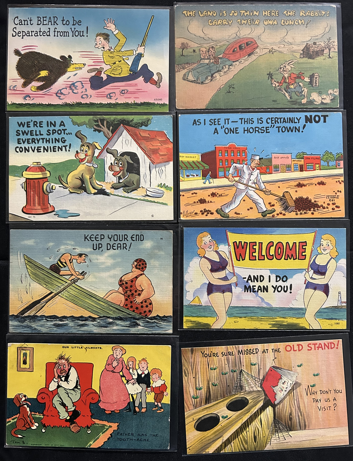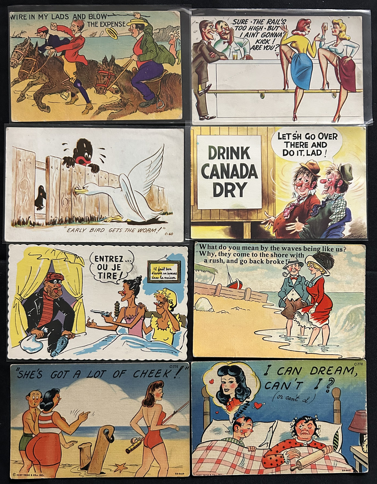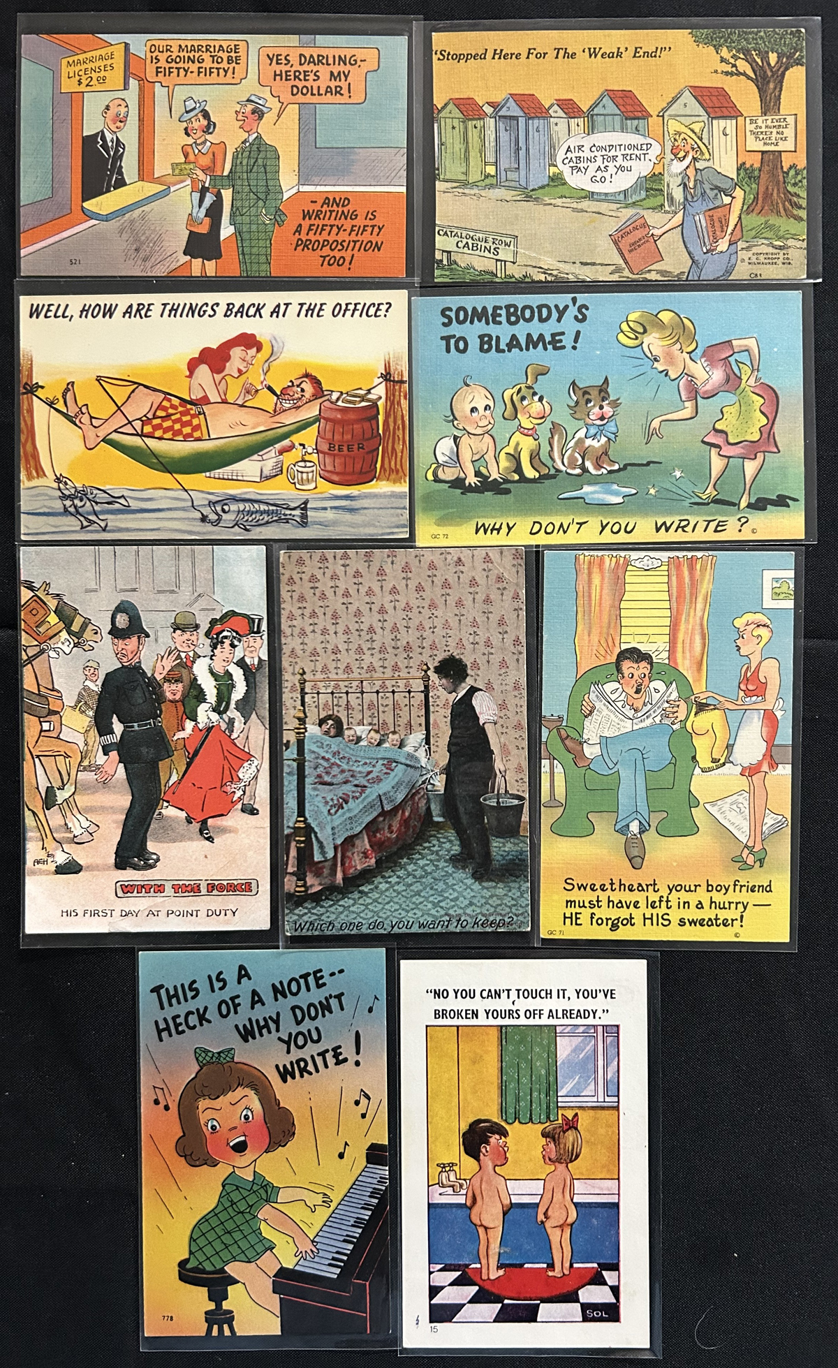 598 PC   imageGroup of About 75 Humourous Cartoon Postcards, majority are unused and appear to be from the 1930s to 1950s, with a few before or after that range. Good variety of subjects that were funny at the time, and many still today. Average condition, with most of the cards being sleeved. (Scan 1) (Scan 2) (Scan 3) (All Scans) (All Images)