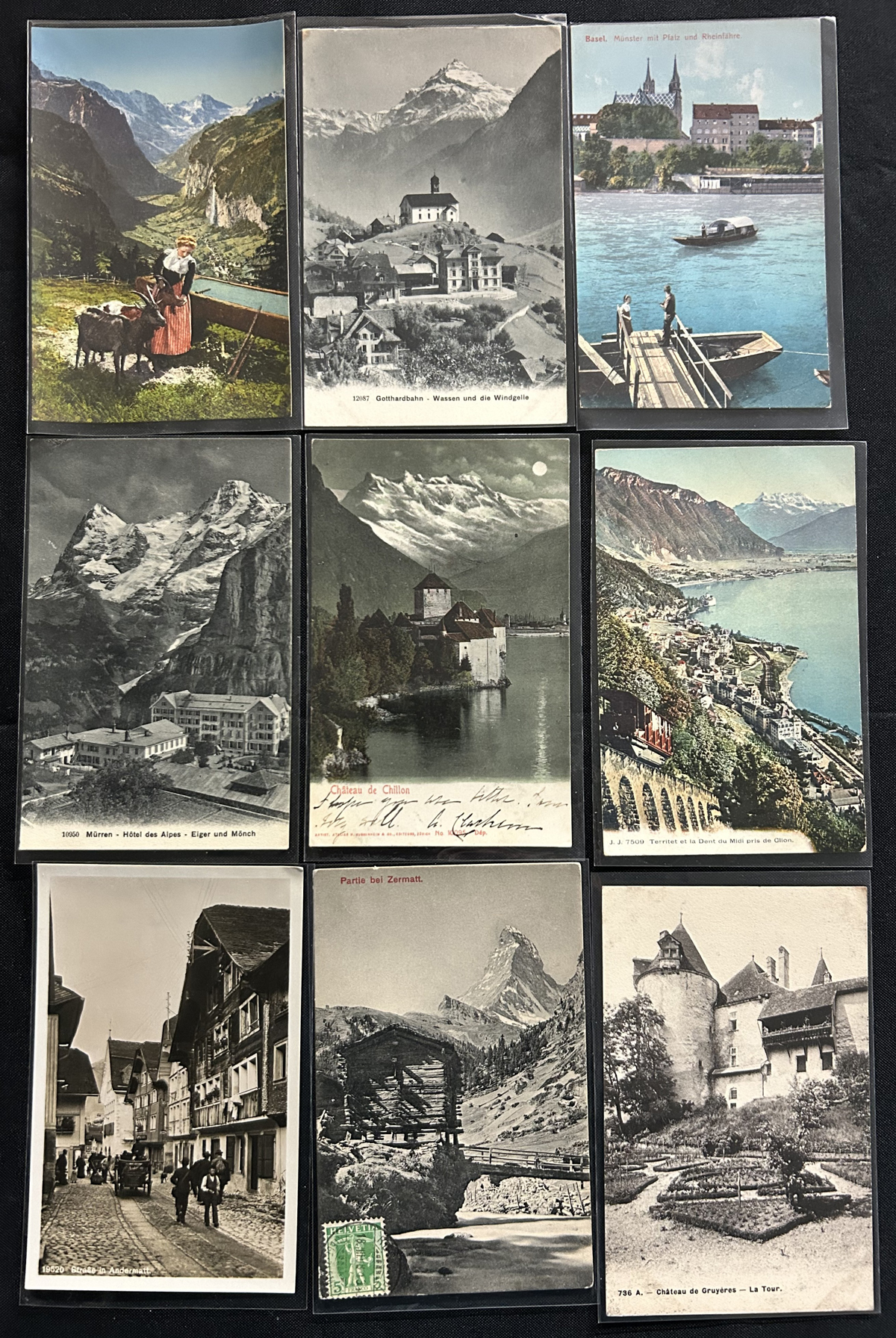 599 PC   imageGroup of Over 200 Early Picture Postcards from Switzerland, with a good variety of town and nature scenes, real photo cards, mountains and much more. We estimate that about a quarter of the cards were mailed, and date from the 1920s to about the 1960s. Quality is overall very nice (with the odd small fault, here and there) and most of the cards are individually sleeved. (Scan 1) (Scan 2) (Scan 3) (All Scans) (All Images)