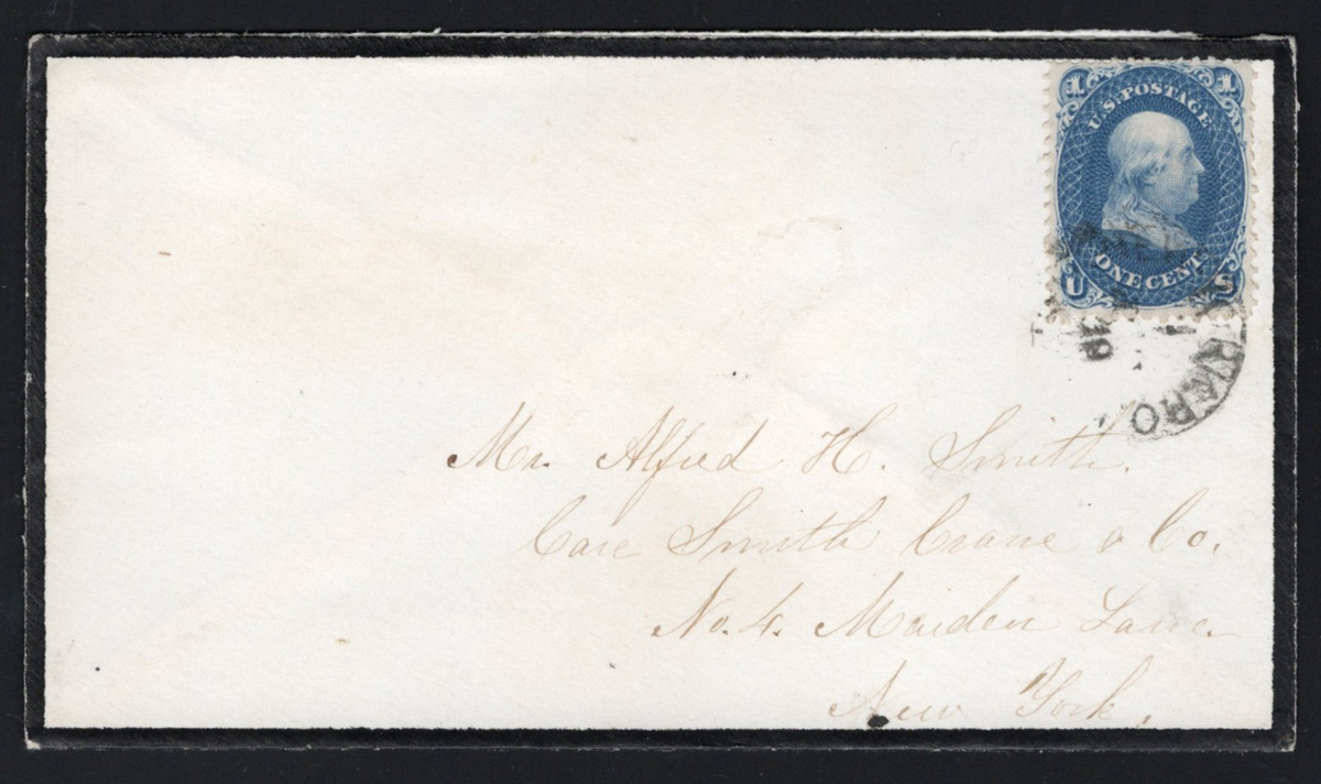583 CVR 63b image1861-62 1c Dark Blue Franklin on New York Mourning Drop Cover, a fine example of this scarce shade is tied by a postmark reading (in part) ”…ORK P.O.” on a lovely mourning cover addressed to New York. Small piece of backflap missing, else very fine. Ex Hitchings and ex Beauchamp. Scott catalogue value is U$900 for the used stamp only.