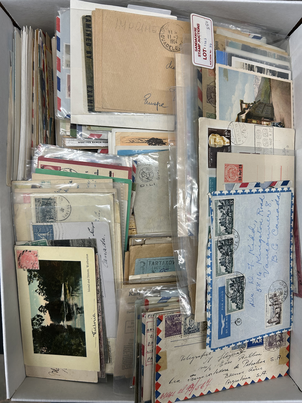 588 CVR/PC   imageBanker's Box Filled with Worldwide Covers and Cards, weighing in at 10.8kg (box included), this box is filled with a variety of material including covers, cards, postcards, first day covers, postmarks, frankings and much more, roughly from the 1900s to the modern period. A perfect box for the "Dollar Box" dealer. Faults are to be expected, still overall fine.