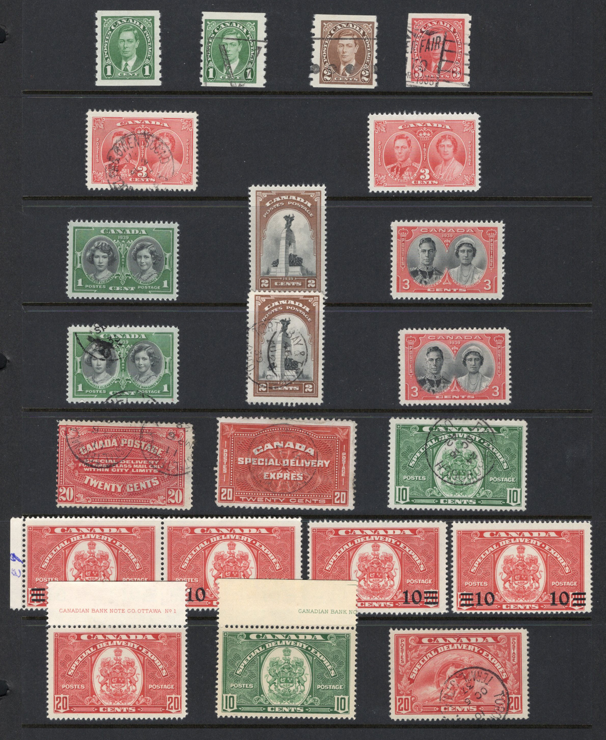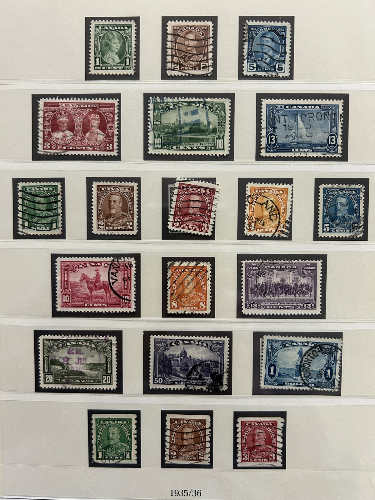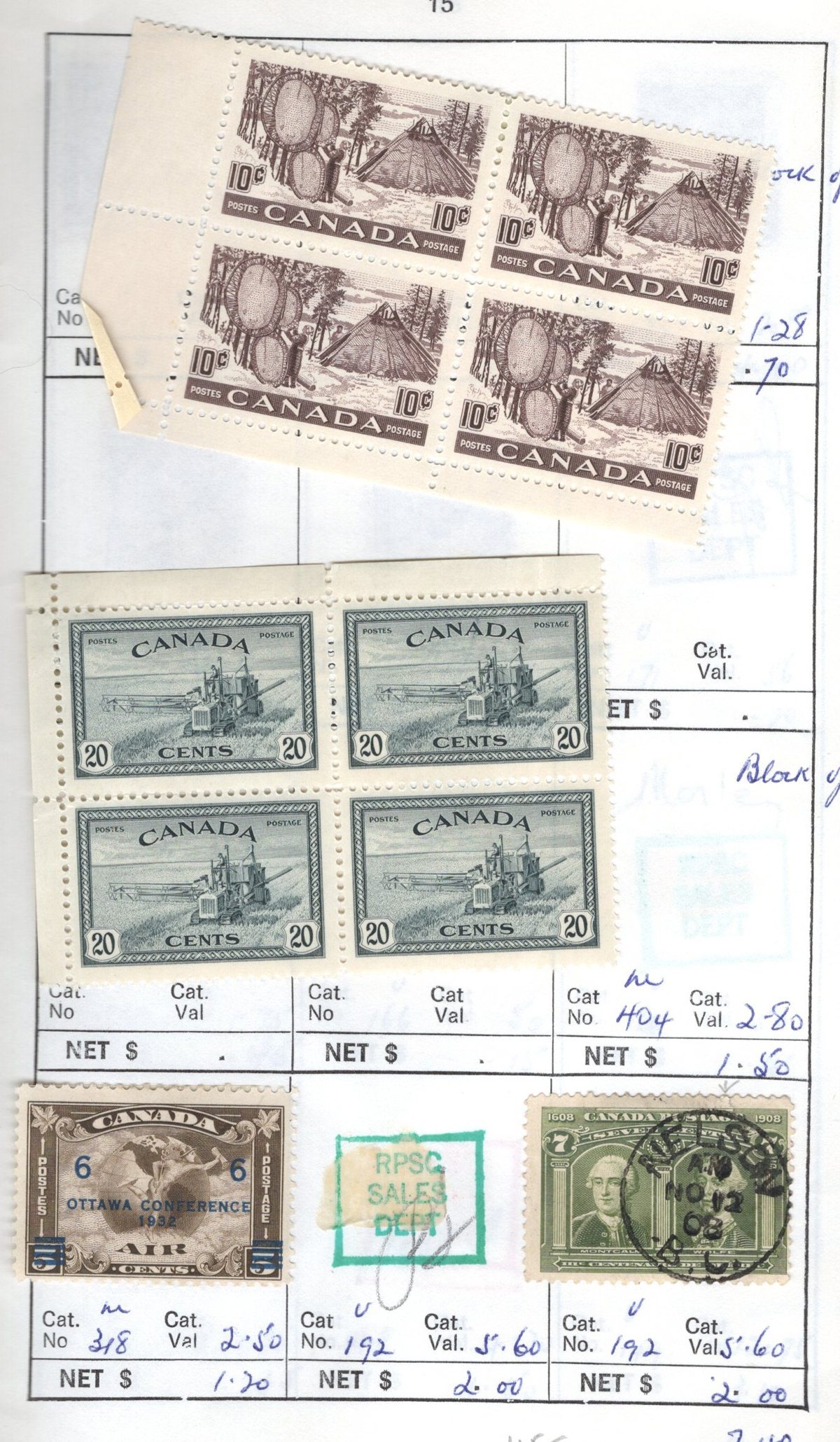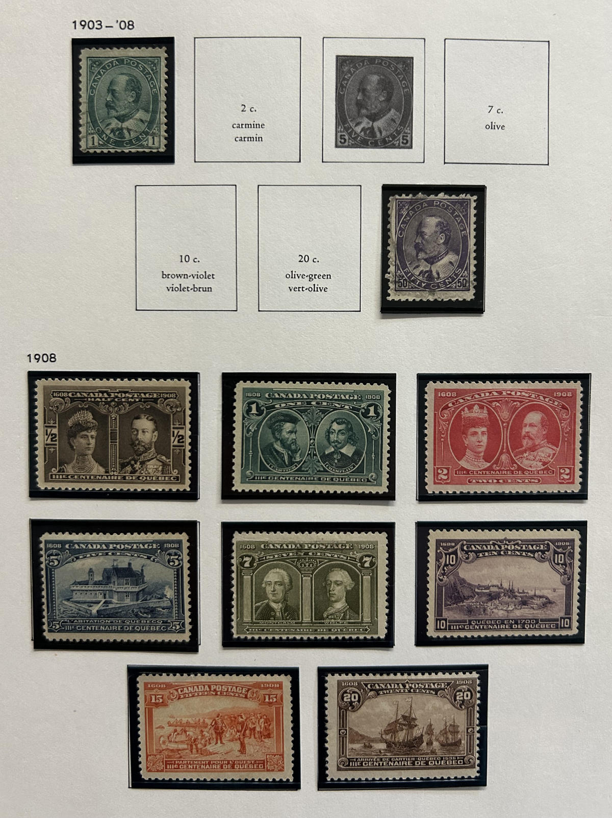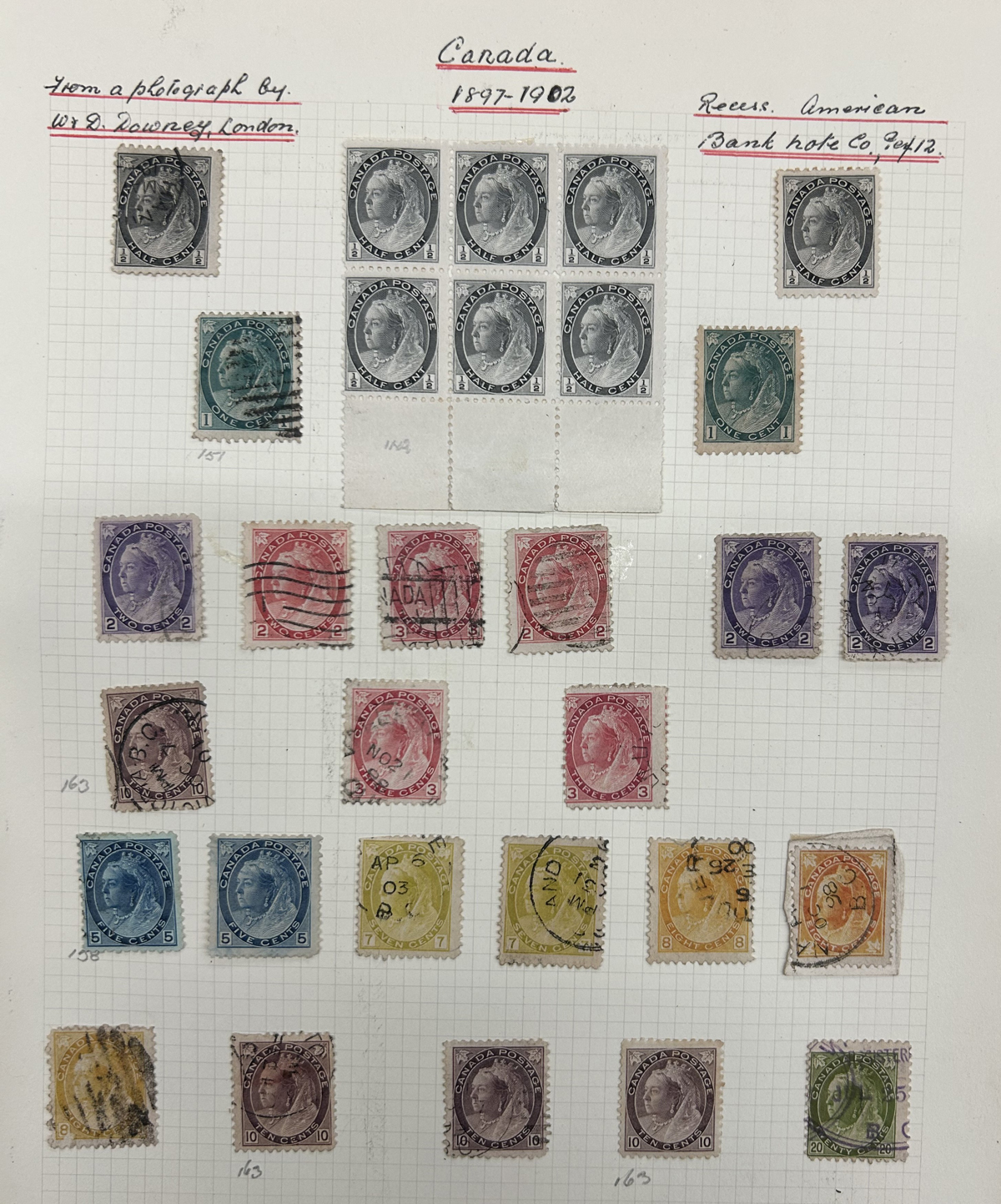 613 O/og 14/400 imageCollection of Mint and Used Canada, 1859-1962, an old-time collection mounted on quadrille pages in an album. The collection starts with a #14, a 3c, 6c and 8x 15c Large Queens, followed by Small Queens to the 50c (incl. 6x 10c, 2x 20c, 5x 50c), Jubilees to the 10c, complete Leafs and Numerals, Edwards to the 20c, Québecs to the 15c, good selection of Admirals to the $1 (plus War Tax), partial Scroll set (includes a 50c Bluenose), complete 1927 sets, and so on, with several incomplete sets, but the value is mostly before the 1930s. Most of the stamps are used, including several with town cancels (mostly from British Columbia) and mint stamps start appearing in the 1930s. Also starting in the 1930s are mint and used blocks and plate blocks of four. All in all a useful collection, with some faults in the earlier material, but mostly fine to very fine. See pictures for only some of the pages. (Scan 1) (Scan 2) (Scan 3) (Scan 4) (Scan 5) (Scan 6) (Scan 7) (Scan 8) (Scan 9) (Scan 10) (Scan 11) (Scan 12) (Scan 13) (Scan 14) (All Scans) (All Images)