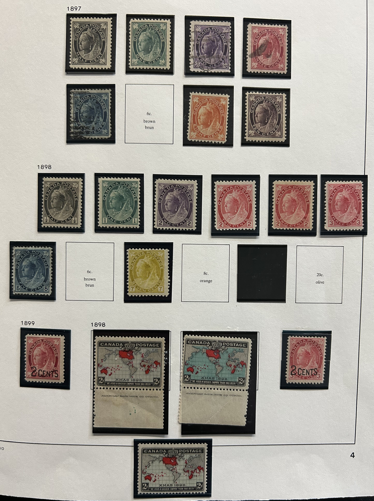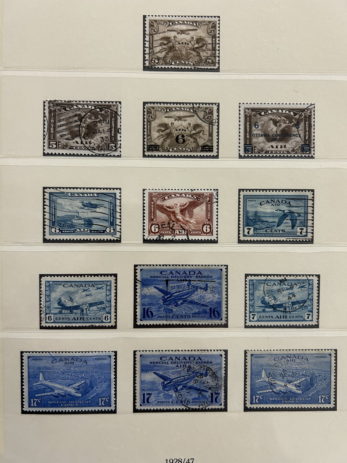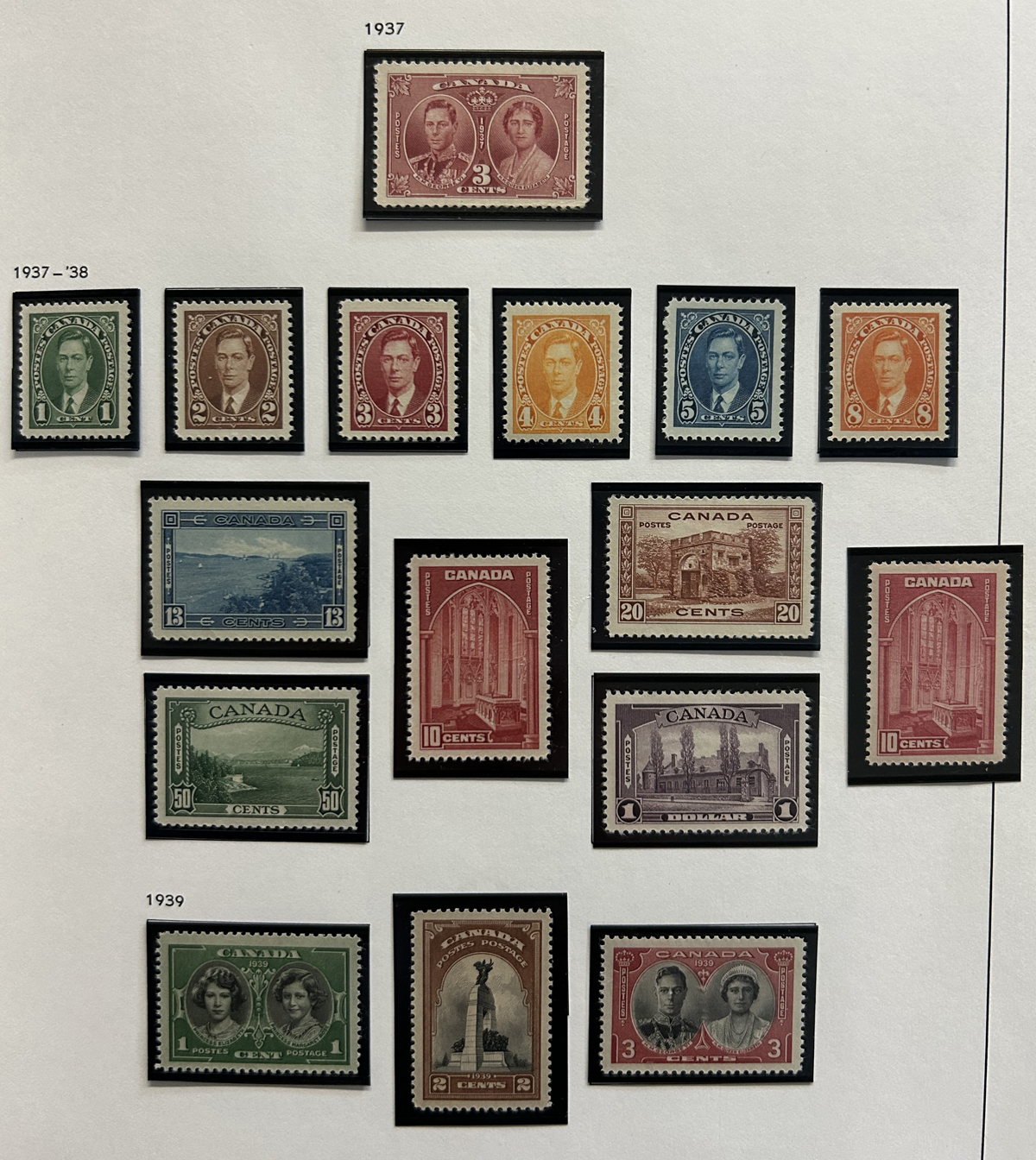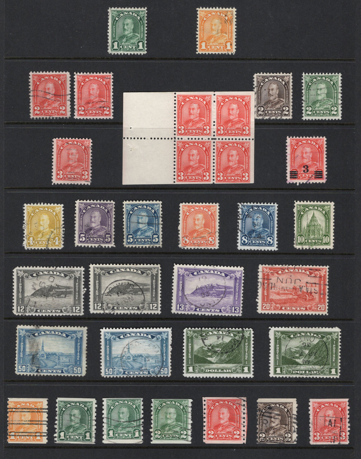 613 O/og 14/400 imageCollection of Mint and Used Canada, 1859-1962, an old-time collection mounted on quadrille pages in an album. The collection starts with a #14, a 3c, 6c and 8x 15c Large Queens, followed by Small Queens to the 50c (incl. 6x 10c, 2x 20c, 5x 50c), Jubilees to the 10c, complete Leafs and Numerals, Edwards to the 20c, Québecs to the 15c, good selection of Admirals to the $1 (plus War Tax), partial Scroll set (includes a 50c Bluenose), complete 1927 sets, and so on, with several incomplete sets, but the value is mostly before the 1930s. Most of the stamps are used, including several with town cancels (mostly from British Columbia) and mint stamps start appearing in the 1930s. Also starting in the 1930s are mint and used blocks and plate blocks of four. All in all a useful collection, with some faults in the earlier material, but mostly fine to very fine. See pictures for only some of the pages. (Scan 1) (Scan 2) (Scan 3) (Scan 4) (Scan 5) (Scan 6) (Scan 7) (Scan 8) (Scan 9) (Scan 10) (Scan 11) (Scan 12) (Scan 13) (Scan 14) (All Scans) (All Images)