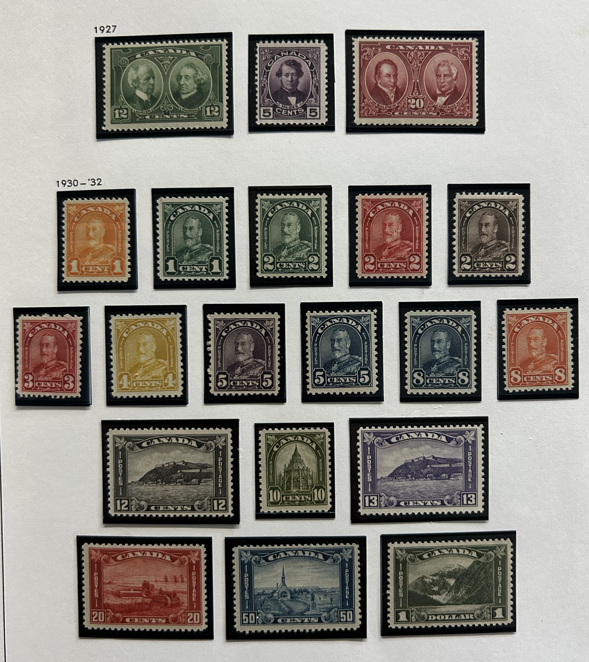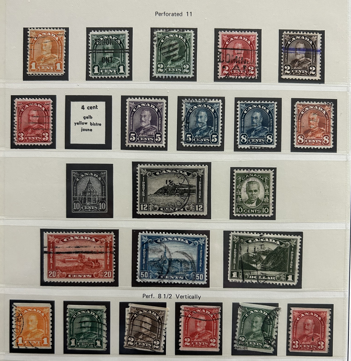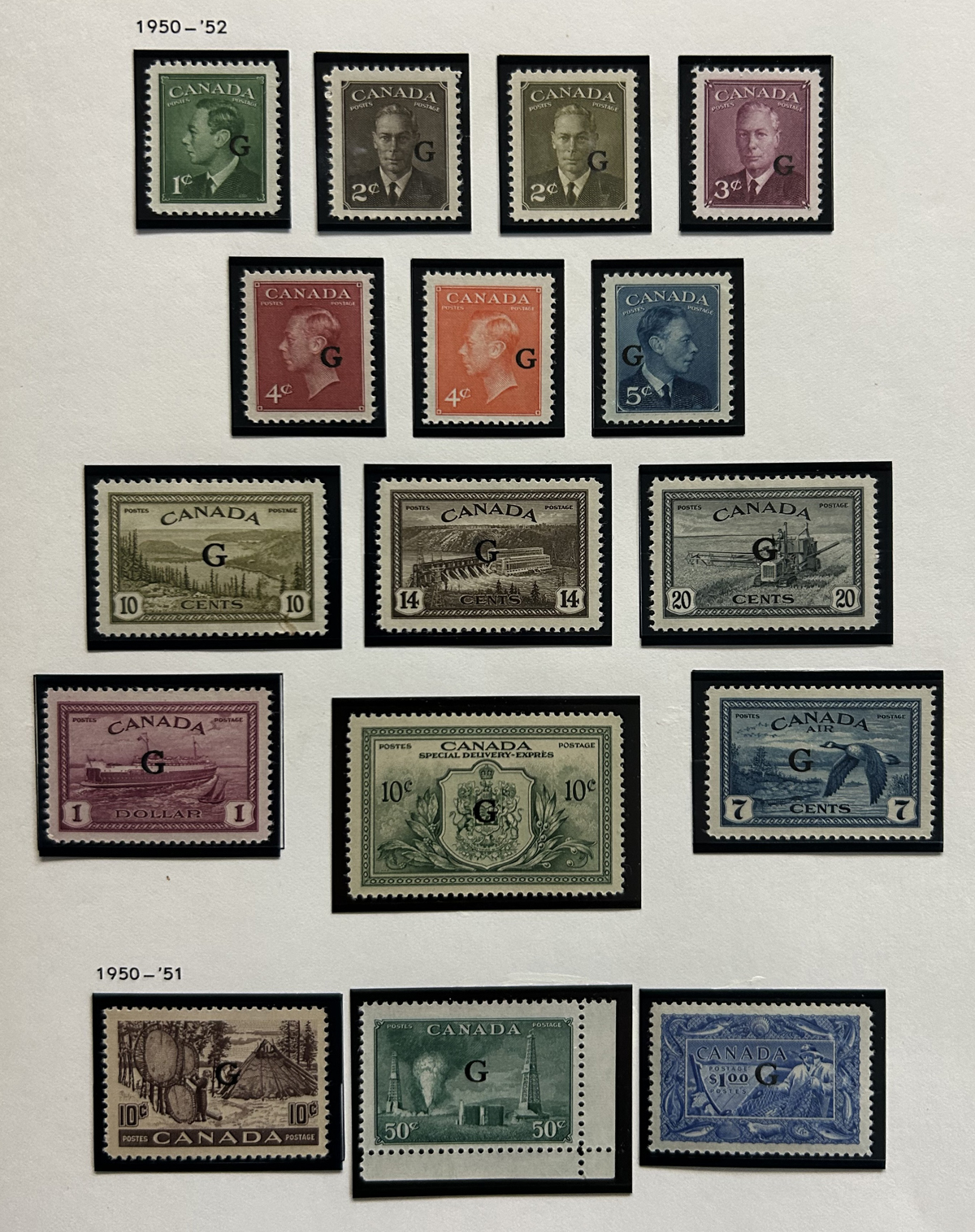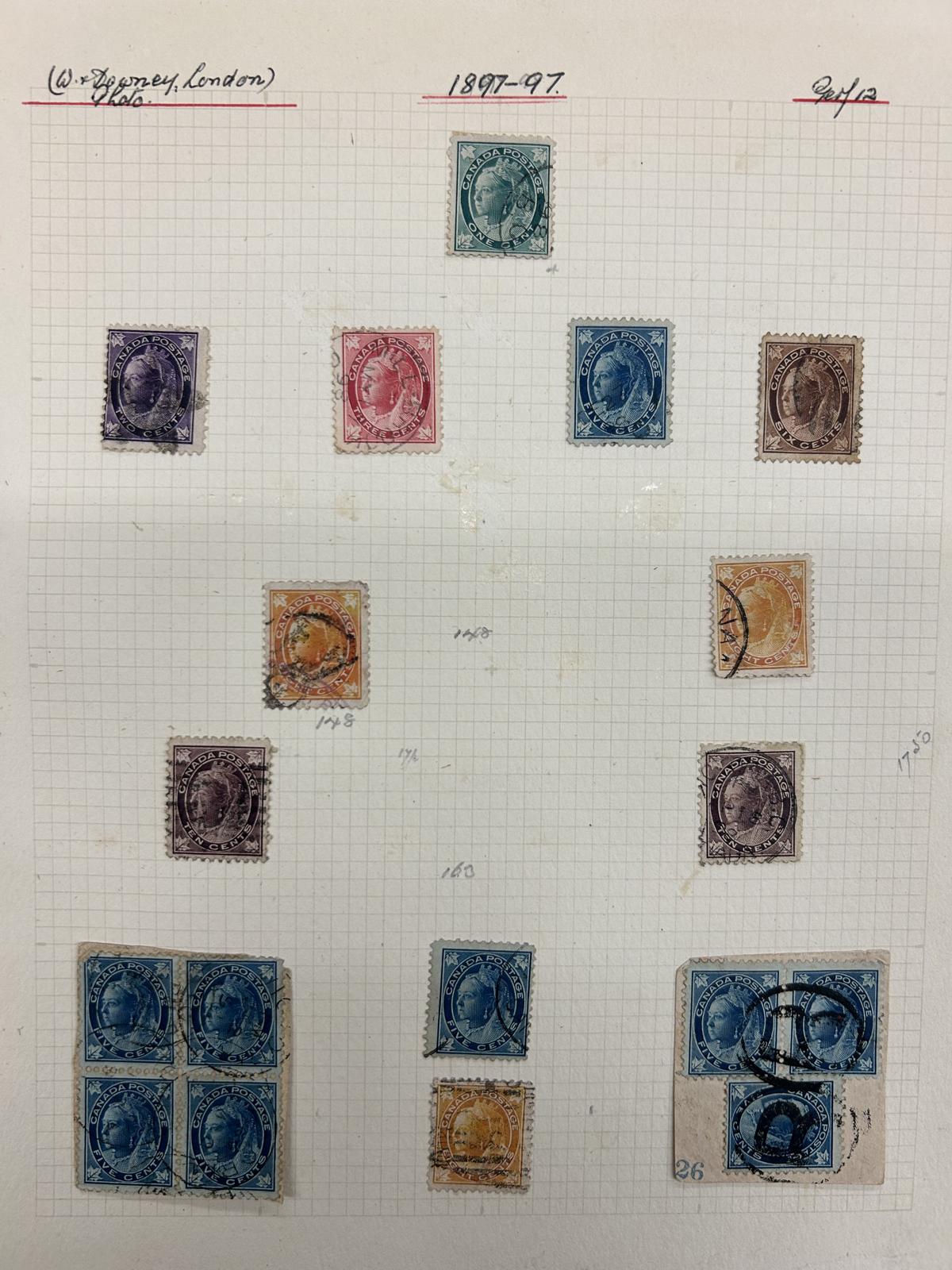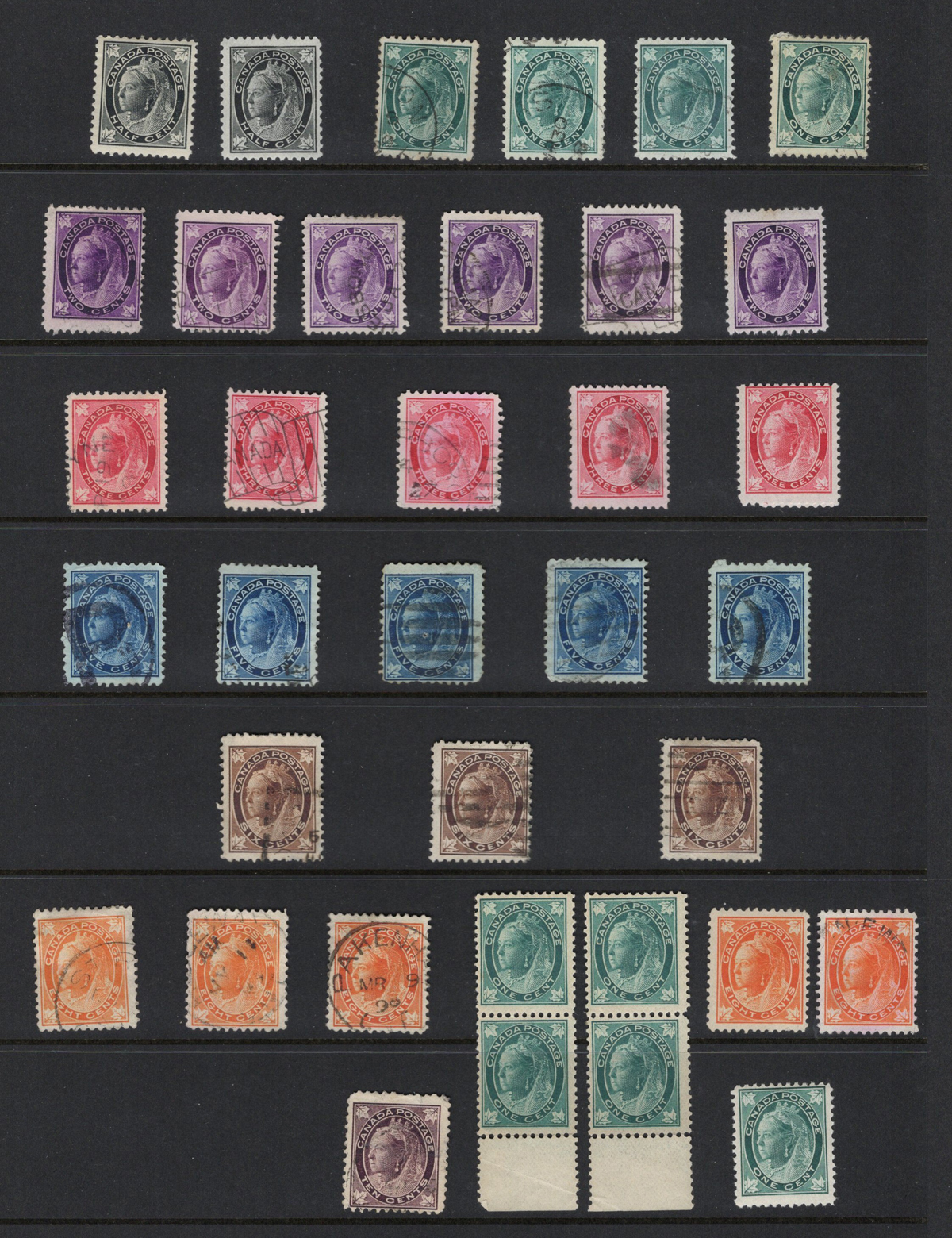613 O/og 14/400 imageCollection of Mint and Used Canada, 1859-1962, an old-time collection mounted on quadrille pages in an album. The collection starts with a #14, a 3c, 6c and 8x 15c Large Queens, followed by Small Queens to the 50c (incl. 6x 10c, 2x 20c, 5x 50c), Jubilees to the 10c, complete Leafs and Numerals, Edwards to the 20c, Québecs to the 15c, good selection of Admirals to the $1 (plus War Tax), partial Scroll set (includes a 50c Bluenose), complete 1927 sets, and so on, with several incomplete sets, but the value is mostly before the 1930s. Most of the stamps are used, including several with town cancels (mostly from British Columbia) and mint stamps start appearing in the 1930s. Also starting in the 1930s are mint and used blocks and plate blocks of four. All in all a useful collection, with some faults in the earlier material, but mostly fine to very fine. See pictures for only some of the pages. (Scan 1) (Scan 2) (Scan 3) (Scan 4) (Scan 5) (Scan 6) (Scan 7) (Scan 8) (Scan 9) (Scan 10) (Scan 11) (Scan 12) (Scan 13) (Scan 14) (All Scans) (All Images)