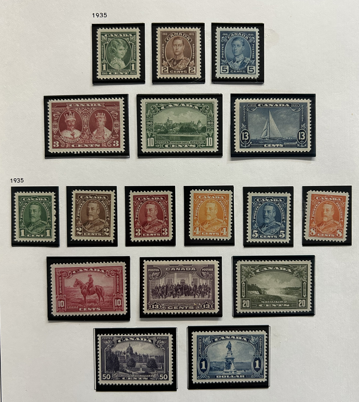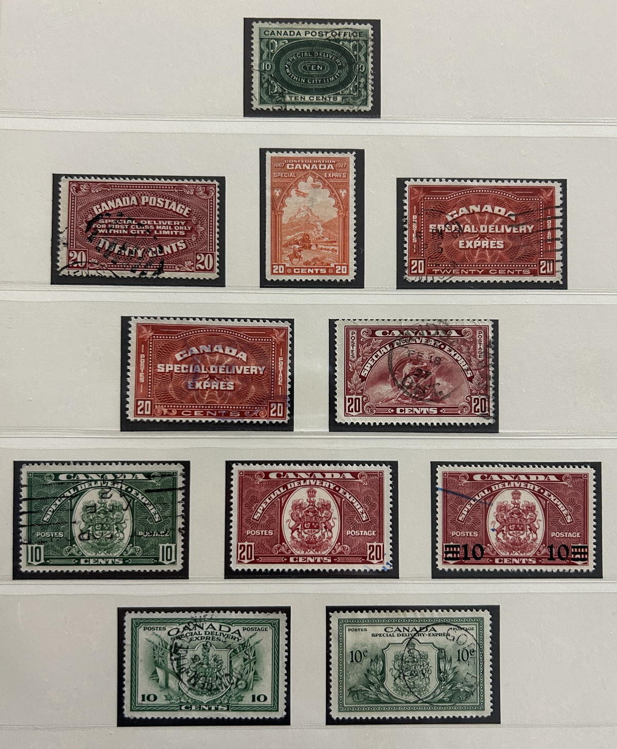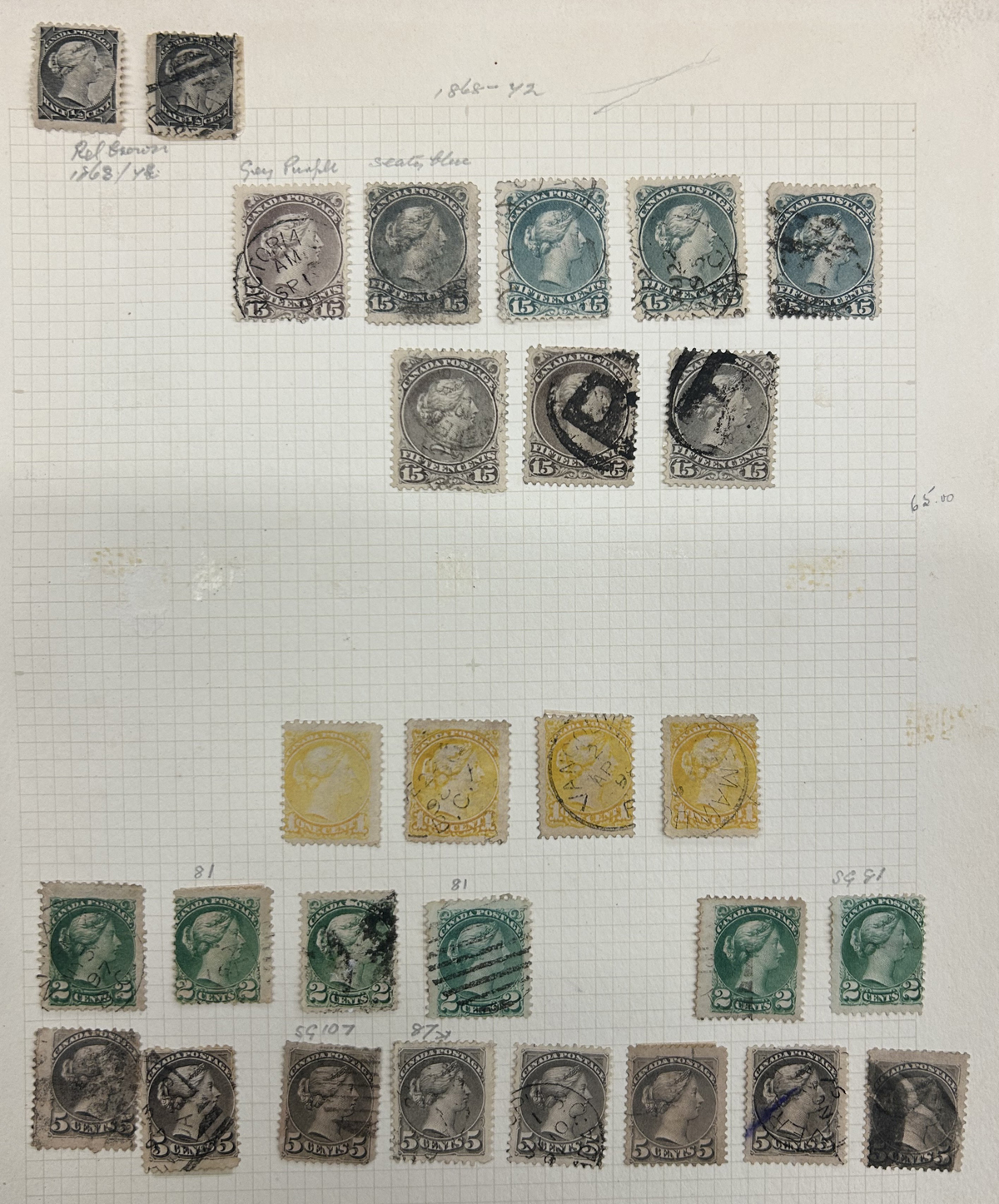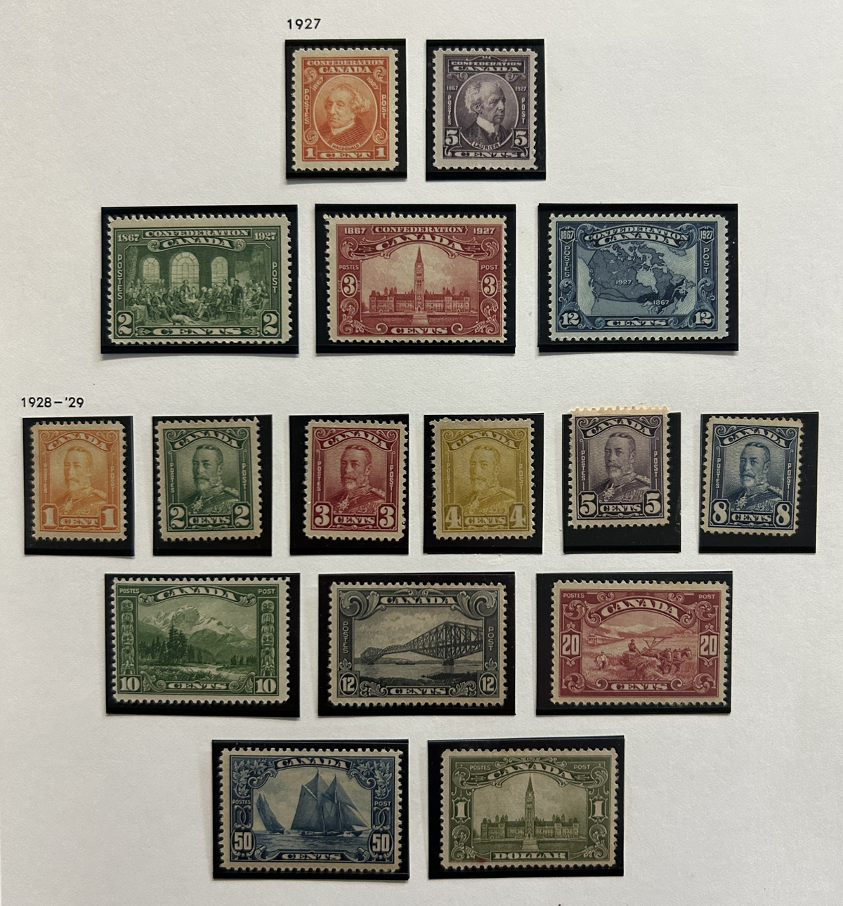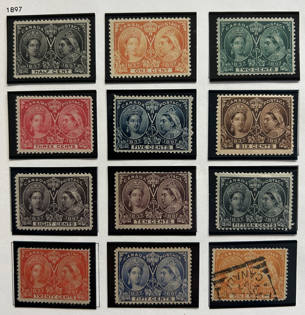 613 O/og 14/400 imageCollection of Mint and Used Canada, 1859-1962, an old-time collection mounted on quadrille pages in an album. The collection starts with a #14, a 3c, 6c and 8x 15c Large Queens, followed by Small Queens to the 50c (incl. 6x 10c, 2x 20c, 5x 50c), Jubilees to the 10c, complete Leafs and Numerals, Edwards to the 20c, Québecs to the 15c, good selection of Admirals to the $1 (plus War Tax), partial Scroll set (includes a 50c Bluenose), complete 1927 sets, and so on, with several incomplete sets, but the value is mostly before the 1930s. Most of the stamps are used, including several with town cancels (mostly from British Columbia) and mint stamps start appearing in the 1930s. Also starting in the 1930s are mint and used blocks and plate blocks of four. All in all a useful collection, with some faults in the earlier material, but mostly fine to very fine. See pictures for only some of the pages. (Scan 1) (Scan 2) (Scan 3) (Scan 4) (Scan 5) (Scan 6) (Scan 7) (Scan 8) (Scan 9) (Scan 10) (Scan 11) (Scan 12) (Scan 13) (Scan 14) (All Scans) (All Images)