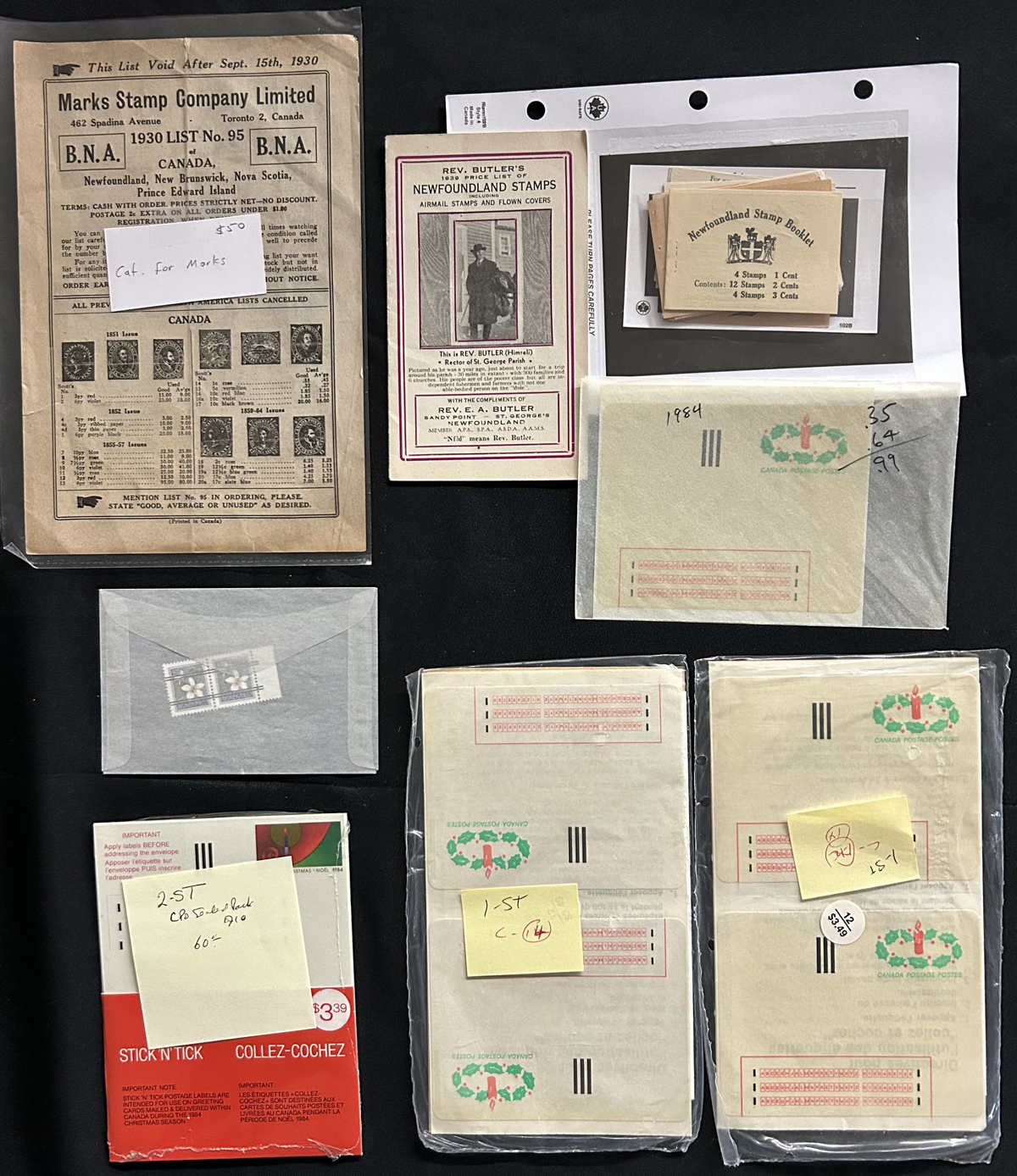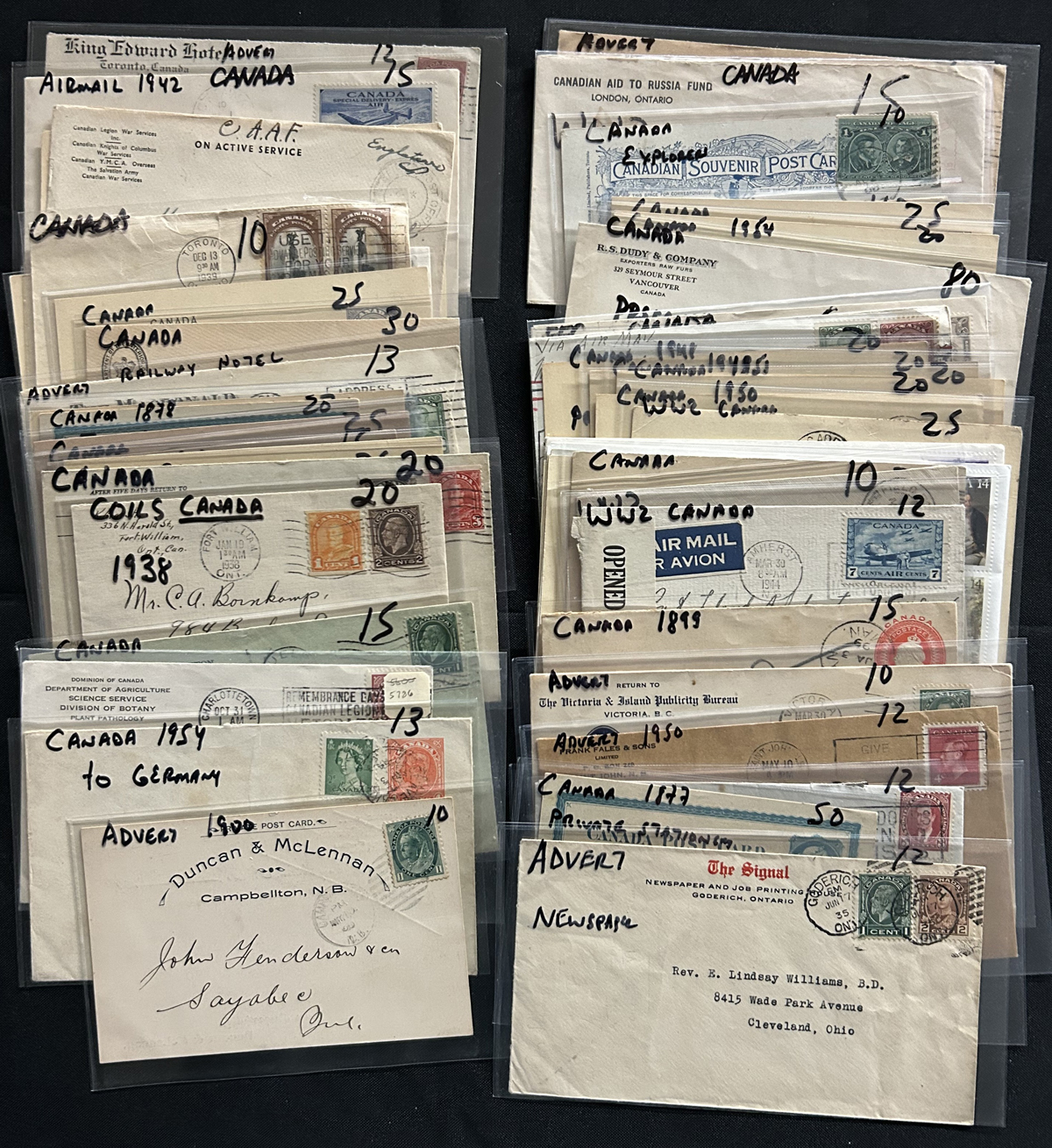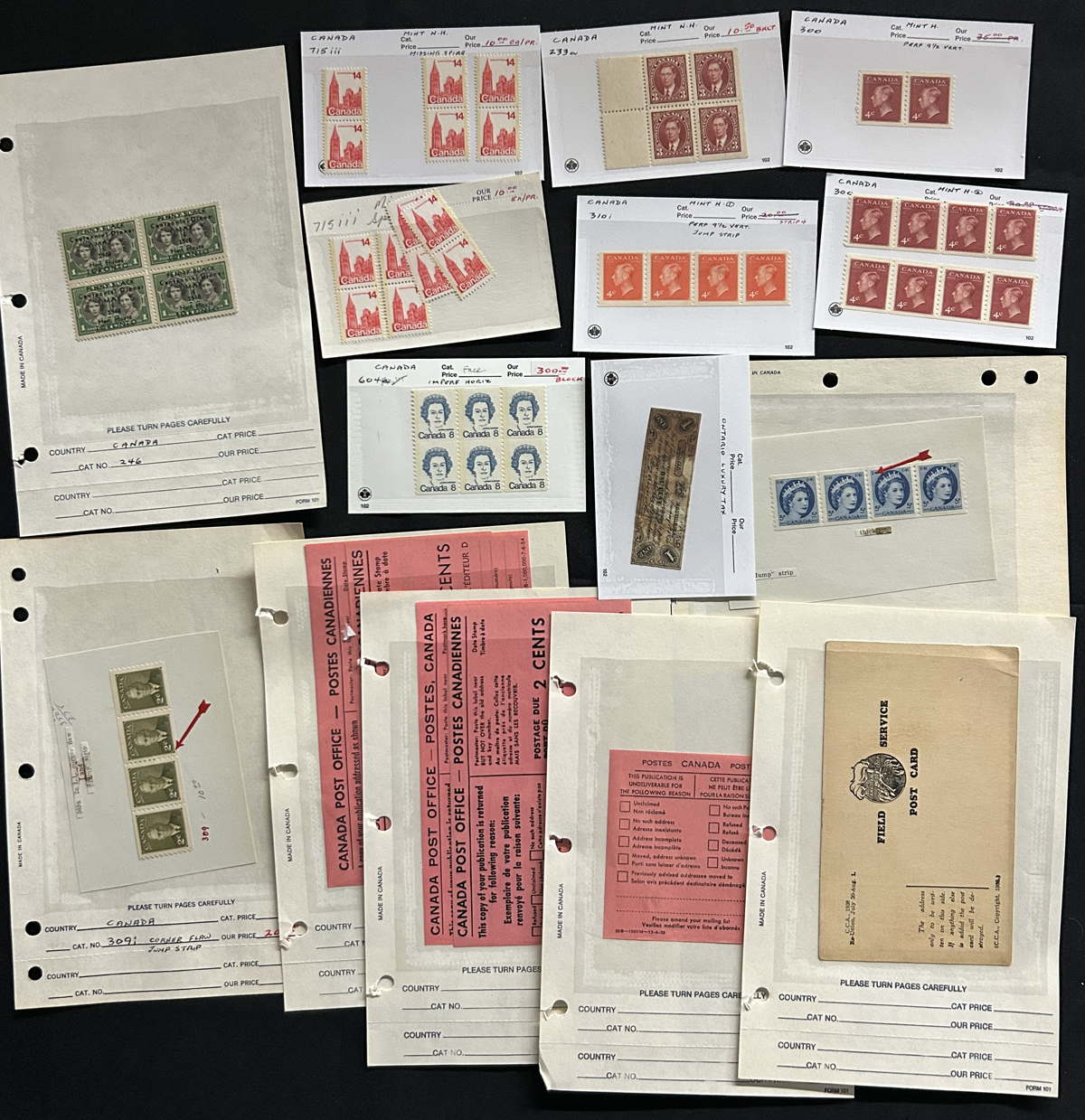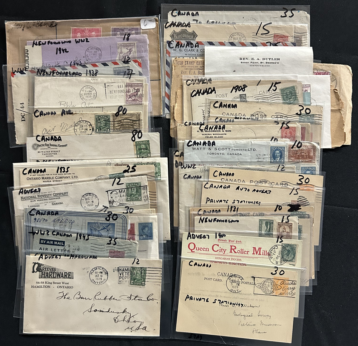 611 CVR/O/og   imageBanker's Box of Stamp and Cover Treasures, a useful offering with a good variety of mostly Canadian and Newfoundland material (stamps and covers), plus a few worldwide items. It is impossible to list everything in here, but saw a stack of about 120 Canada and Newfoundland covers and cards (saw used stationery, airmail, military, postmarks, precancels and much more, from Small Queens to about the 1950s), Canada $4 Bighorn Sheep FDC, a collection of Admiral booklet panes (the covers and inter-leaving, with no stamps) written-up on on about a dozen pages along with an original Post Office announcement for the issue of stamps dated FEB.17.1926 and another letter dated SEP.1925 announcing the sale of postage stamps from QV to Admirals. A stack of about 55 dealer cards containing complete, or semi-complete plate block matched sets (Sc. 269-598), two binders contain about 130 cancelled cheques from 1918 to the 1930s, each with KGV or revenue stamps (incl. War Tax issues), a dozen or so mint souvenir sheets with a face value over $50, a small stack of Newfoundland booklet covers and inter-leavings, some Christmas Stick-N-Tick packs, a small box of mint Canada low values, a small box full of used Newfoundland stamps, a stack of 10 WWII ration books (gasoline, etc.), a binder of mint and Used various Canada, a dealer card with several mint Newfoundland Customs Duty stamps, a stockbook of mint and used BG (saw some mint KGV issues, etc.), a nice USA mint and used collection (1929 to 1960, with B.O.B.) and more. Our 17 pictures show an overview only, and we recommend in-person viewing. A fun box lots of potential, ideal for the vest-pocket, club, or online dealer. (Scan 1) (Scan 2) (Scan 3) (Scan 4) (Scan 5) (Scan 6) (Scan 7) (Scan 8) (Scan 9) (Scan 10) (Scan 11) (Scan 12) (Scan 13) (Scan 14) (Scan 15) (Scan 16) (Scan 17) (All Scans) (All Images)