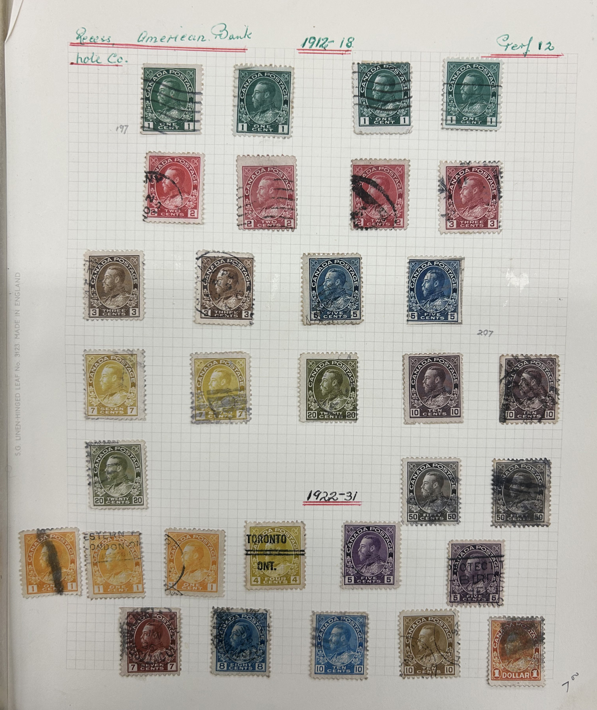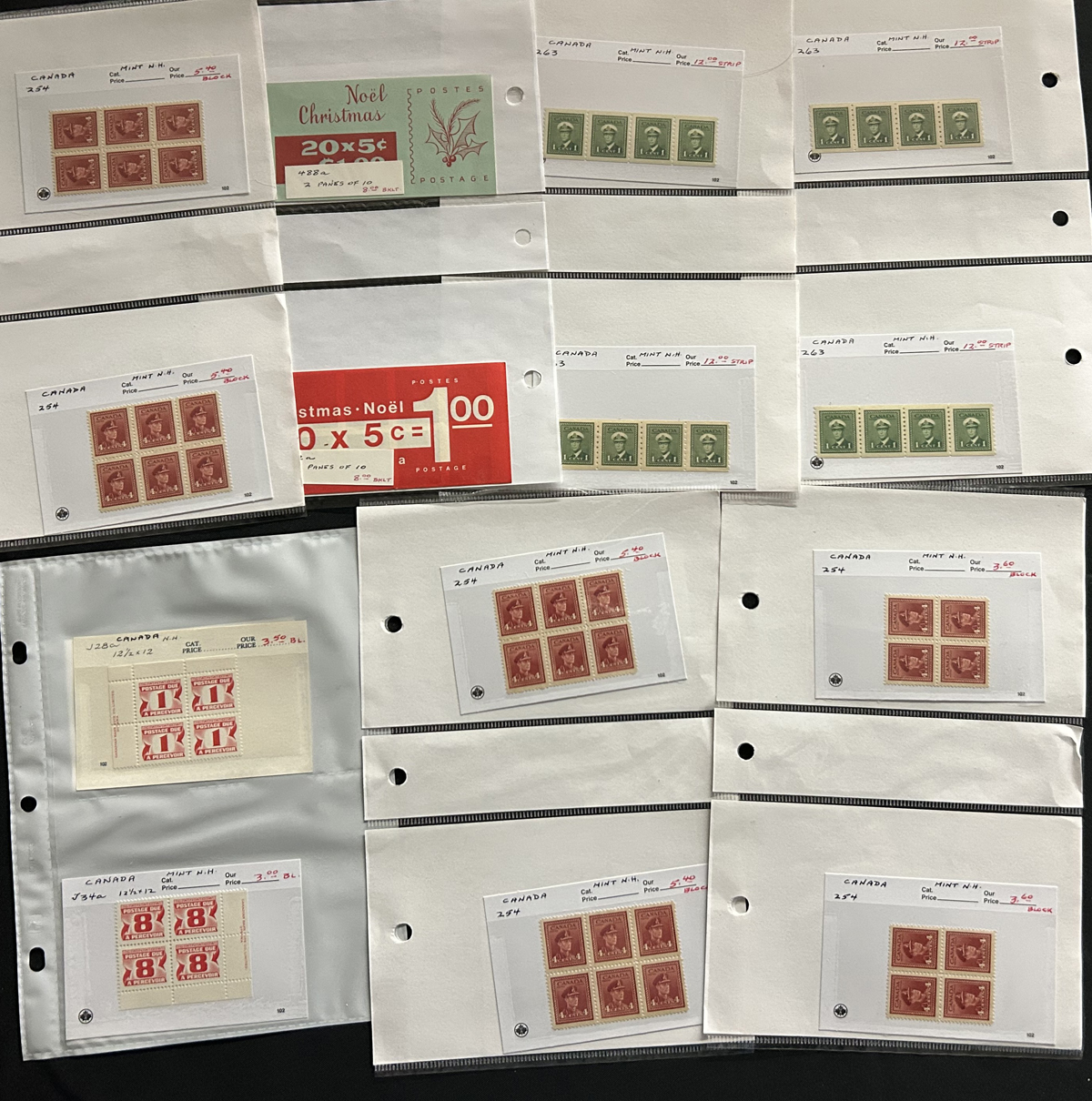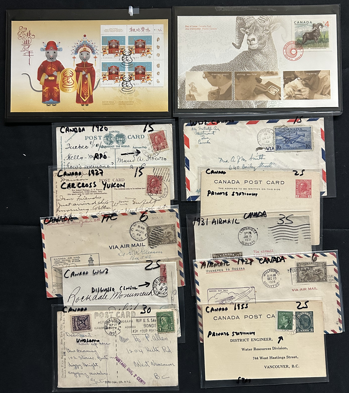 611 CVR/O/og   imageBanker's Box of Stamp and Cover Treasures, a useful offering with a good variety of mostly Canadian and Newfoundland material (stamps and covers), plus a few worldwide items. It is impossible to list everything in here, but saw a stack of about 120 Canada and Newfoundland covers and cards (saw used stationery, airmail, military, postmarks, precancels and much more, from Small Queens to about the 1950s), Canada $4 Bighorn Sheep FDC, a collection of Admiral booklet panes (the covers and inter-leaving, with no stamps) written-up on on about a dozen pages along with an original Post Office announcement for the issue of stamps dated FEB.17.1926 and another letter dated SEP.1925 announcing the sale of postage stamps from QV to Admirals. A stack of about 55 dealer cards containing complete, or semi-complete plate block matched sets (Sc. 269-598), two binders contain about 130 cancelled cheques from 1918 to the 1930s, each with KGV or revenue stamps (incl. War Tax issues), a dozen or so mint souvenir sheets with a face value over $50, a small stack of Newfoundland booklet covers and inter-leavings, some Christmas Stick-N-Tick packs, a small box of mint Canada low values, a small box full of used Newfoundland stamps, a stack of 10 WWII ration books (gasoline, etc.), a binder of mint and Used various Canada, a dealer card with several mint Newfoundland Customs Duty stamps, a stockbook of mint and used BG (saw some mint KGV issues, etc.), a nice USA mint and used collection (1929 to 1960, with B.O.B.) and more. Our 17 pictures show an overview only, and we recommend in-person viewing. A fun box lots of potential, ideal for the vest-pocket, club, or online dealer. (Scan 1) (Scan 2) (Scan 3) (Scan 4) (Scan 5) (Scan 6) (Scan 7) (Scan 8) (Scan 9) (Scan 10) (Scan 11) (Scan 12) (Scan 13) (Scan 14) (Scan 15) (Scan 16) (Scan 17) (All Scans) (All Images)