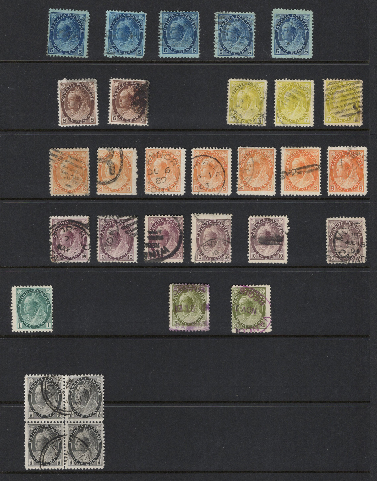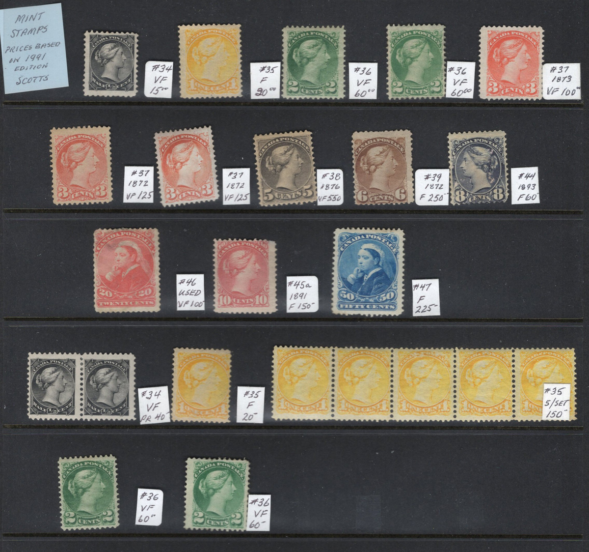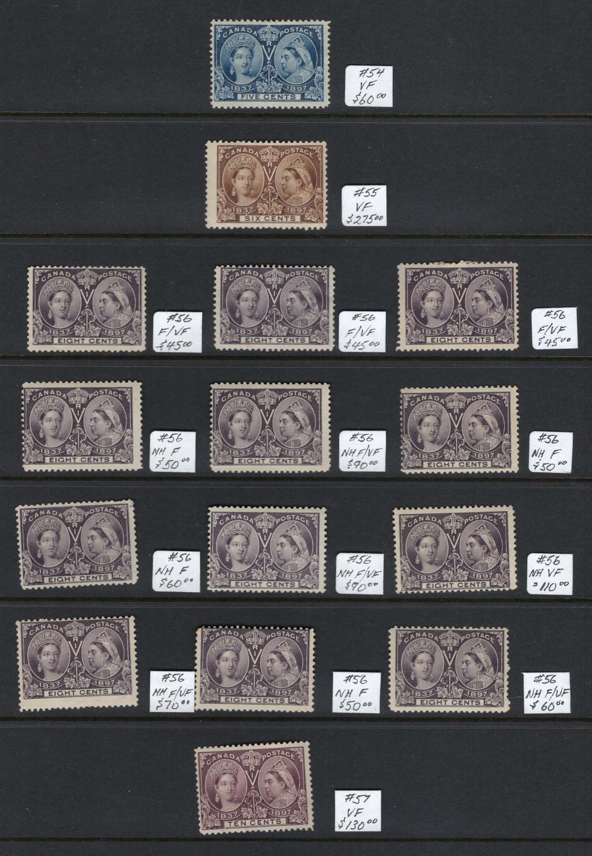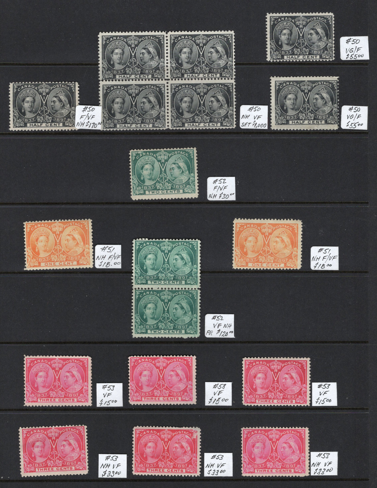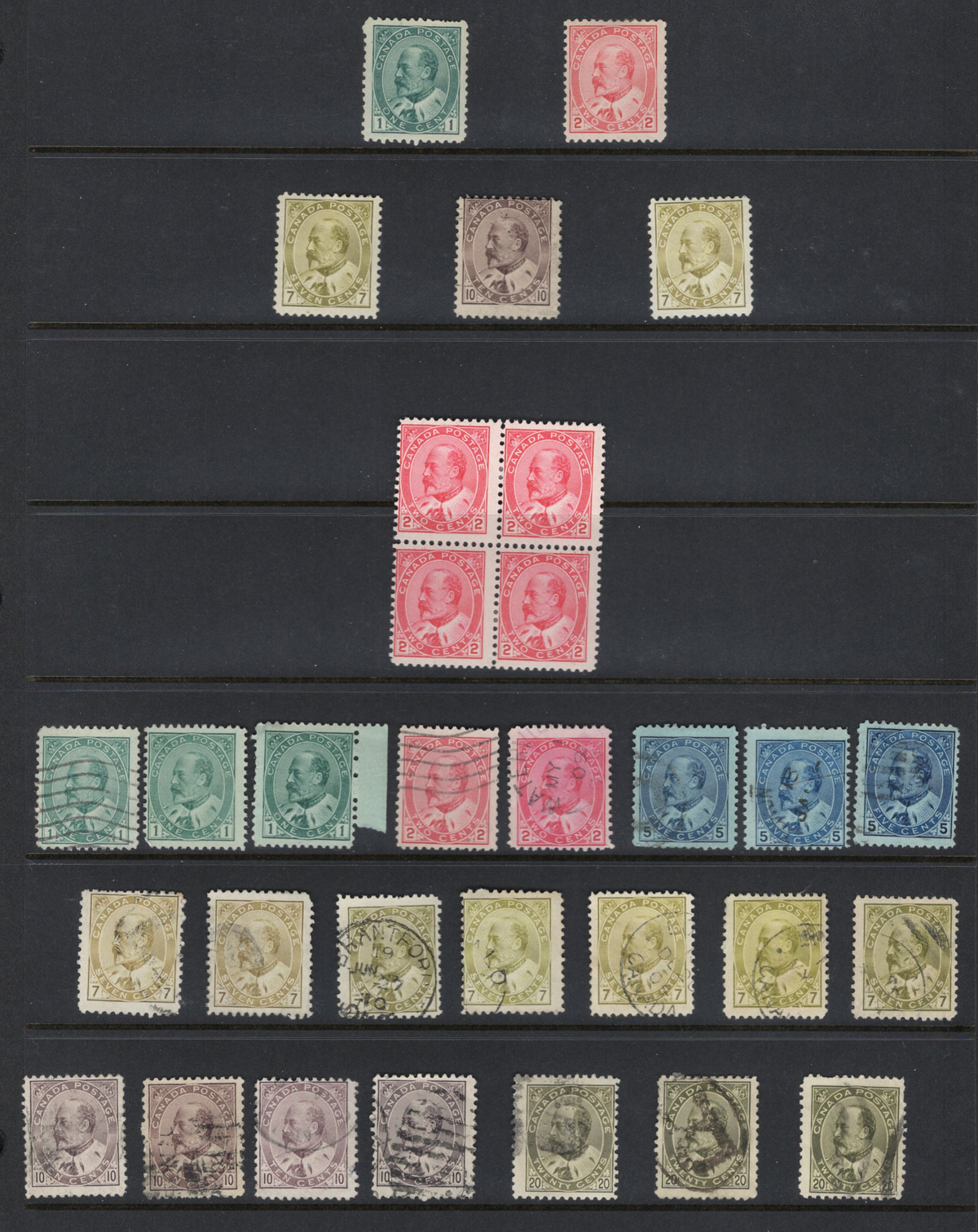 614 O/og/nh 34/726 imageCollection / Stock of Mint and Used Canada, 1880s to 1950s, displayed on 27 Hagner stock pages, with a mix of mint and used, and quite often with one of each. Starts with a page of (mostly mint) Small Queens, followed by 4 pages of mint and used Jubilees (to the 50c), noting twelve mint 8c values and much more. This followed by Maps, Leafs and Numerals, Edwards, Admirals, and so on to the end, including back of the book placed with regular issues. One of the pages that stood out contains twenty used $1 Fisherman issue. Many of the used stamps have nice c.d.s. cancels, the mint stamps range from no gum, to hinged to never hinged, and we noted some faults (especially towards the beginning), still an overall fine to very fine offering, with a huge catalogue value. Our online photos should give a good indication of the value within, and do not show the entire contents. (Scan 1) (Scan 2) (Scan 3) (Scan 4) (Scan 5) (Scan 6) (Scan 7) (Scan 8) (Scan 9) (Scan 10) (Scan 11) (Scan 12) (Scan 13) (Scan 14) (Scan 15) (Scan 16) (Scan 17) (Scan 18) (All Scans) (All Images)