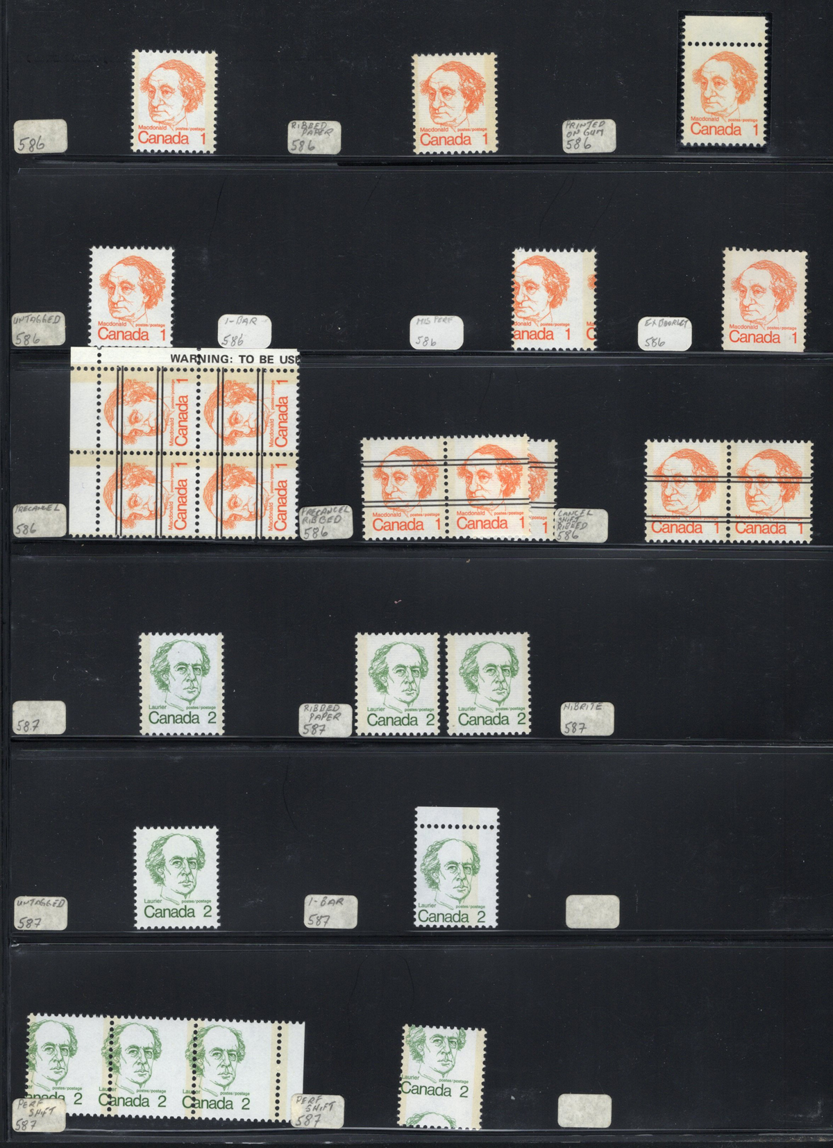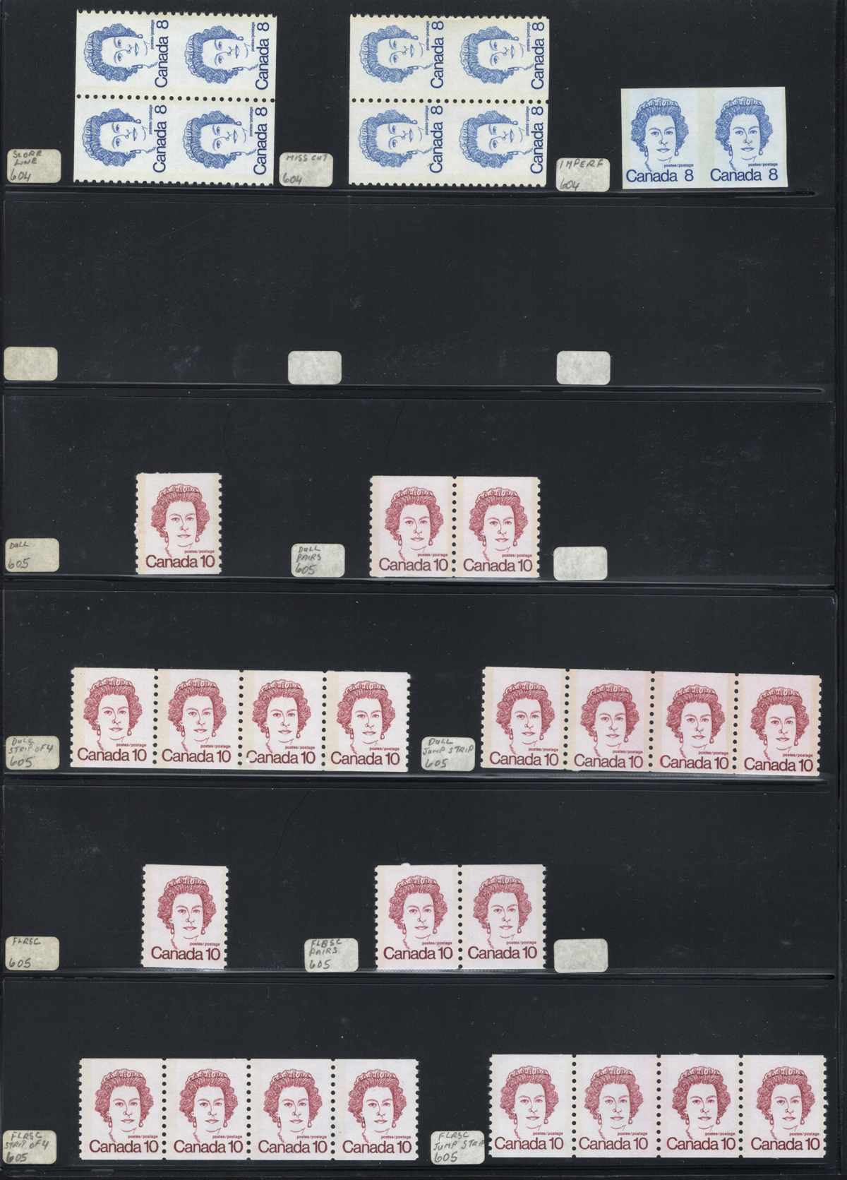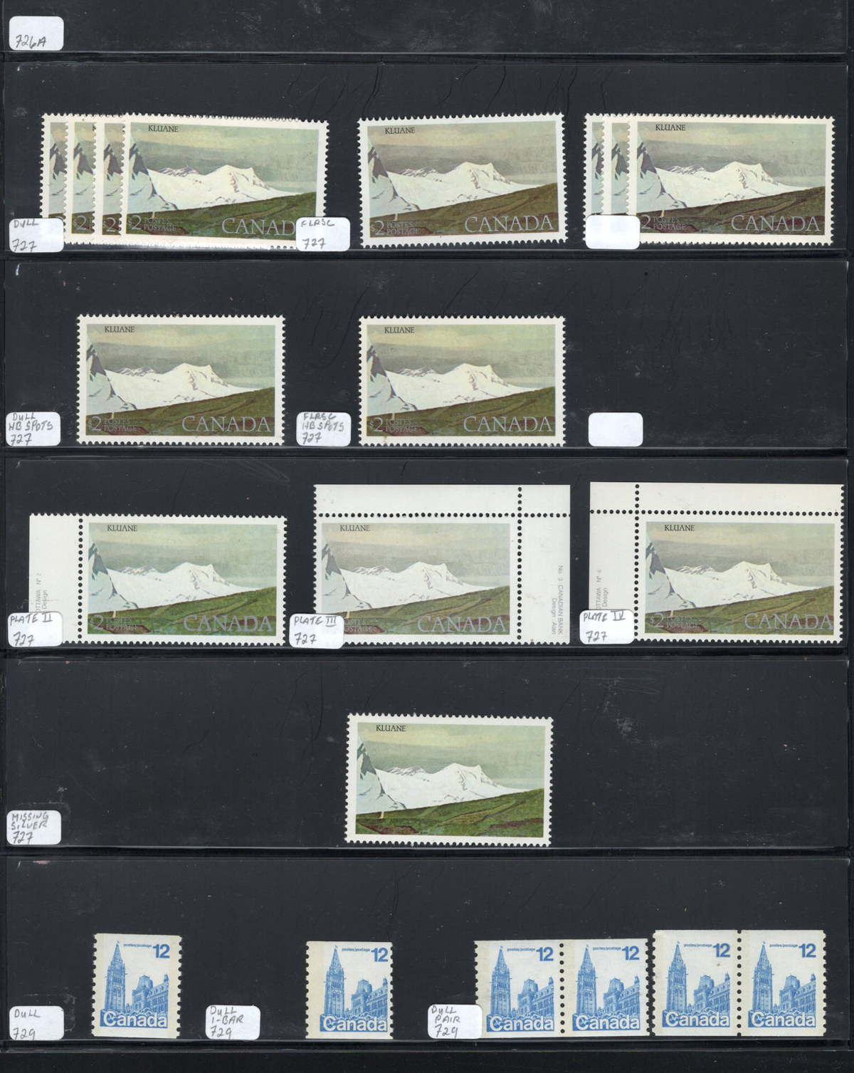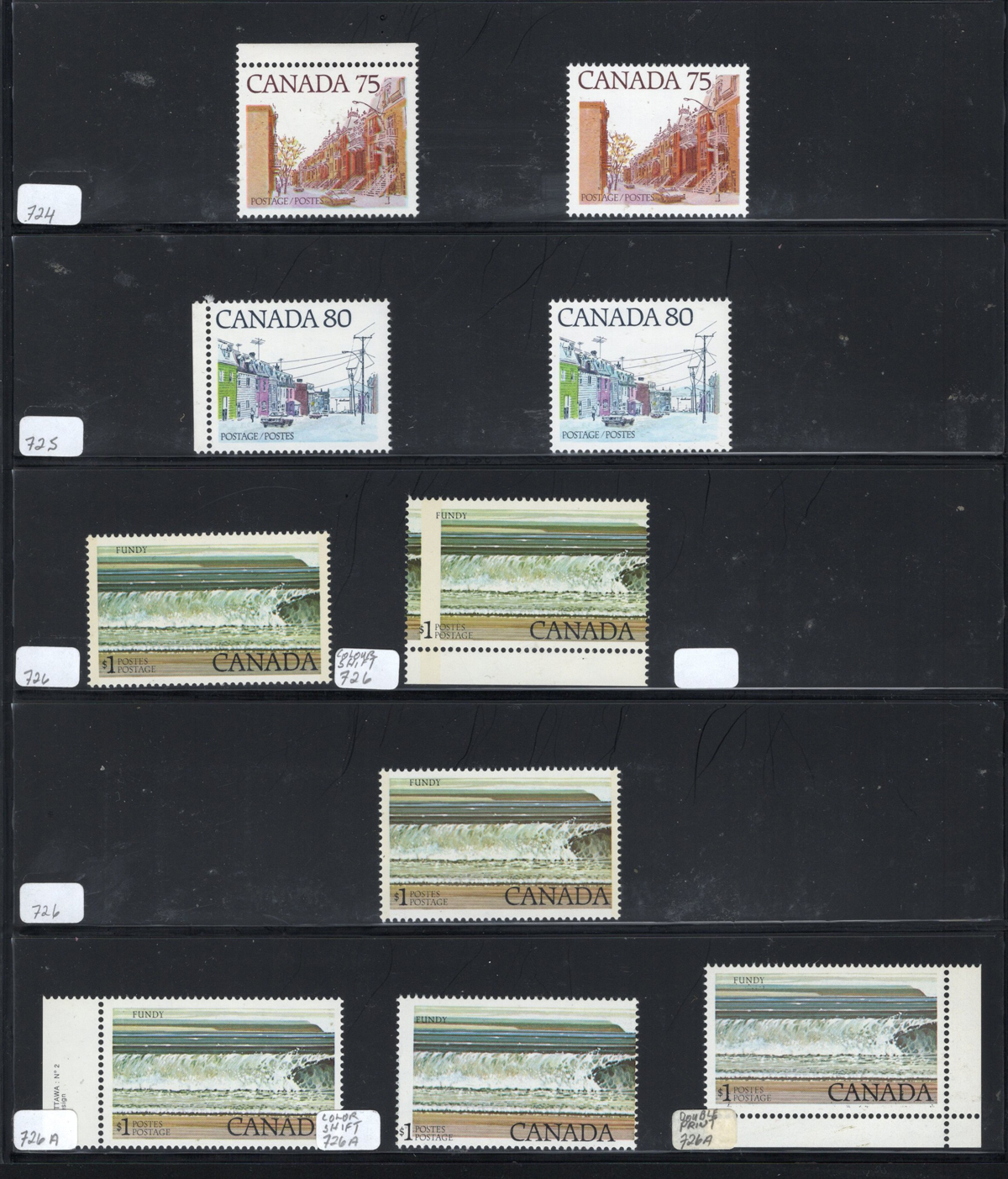 617 nh 347/1172 imageModern Mint Collection, with Many Varieties, 1954-1985, all mounted on 37 double-sided Vario stock sheets. The main collection consists of mint never hinged regular issues, which are complemented by coils, booklets and especially printing varieties. We note many tagging varieties including untagged, bar varieties, etc., as well as many misperforated stamps, some quite drastically-so, plus some misprints, paper varieties, missing ink, etc. Some of the stamps that stood out include #536 with missing inscriptions (sold as is, would require a certificate), a good selection of Caricature issue varieties, many 17c green Parliament varieties, untagged pair of #570-71 (Unitrade $200) and many more. A useful collection that would benefit from being viewed in person, we have selected a number of pages to try and represent the flair of the collection. Should be a useful one for varieties enthusiasts, collectors wishing to add variety to their collection, or online resellers. (Scan 1) (Scan 2) (Scan 3) (Scan 4) (Scan 5) (Scan 6) (Scan 7) (Scan 8) (Scan 9) (Scan 10) (Scan 11) (Scan 12) (Scan 13) (Scan 14) (Scan 15) (Scan 16) (All Scans) (All Images)