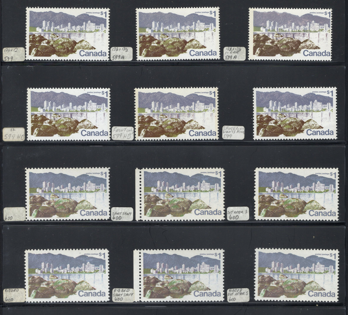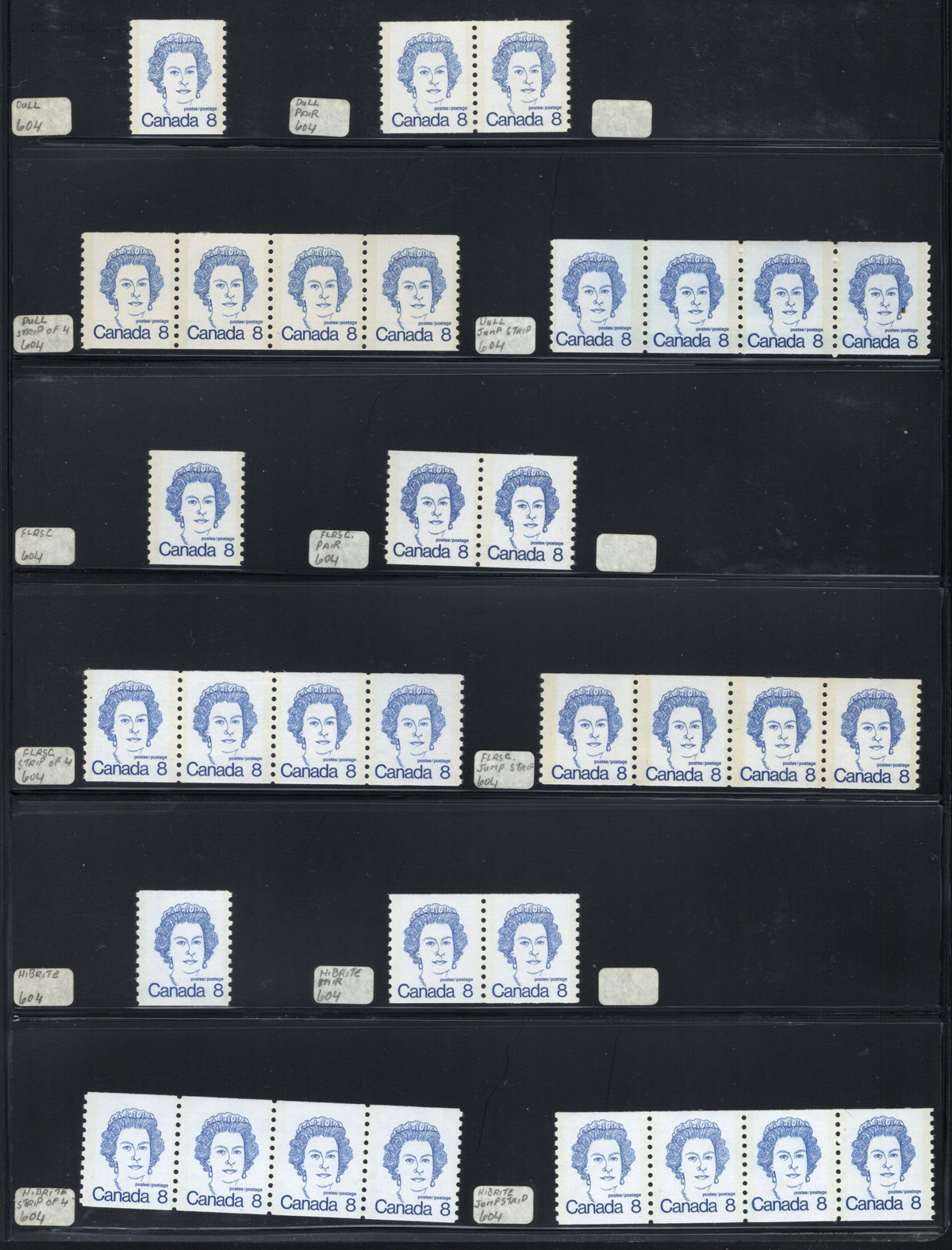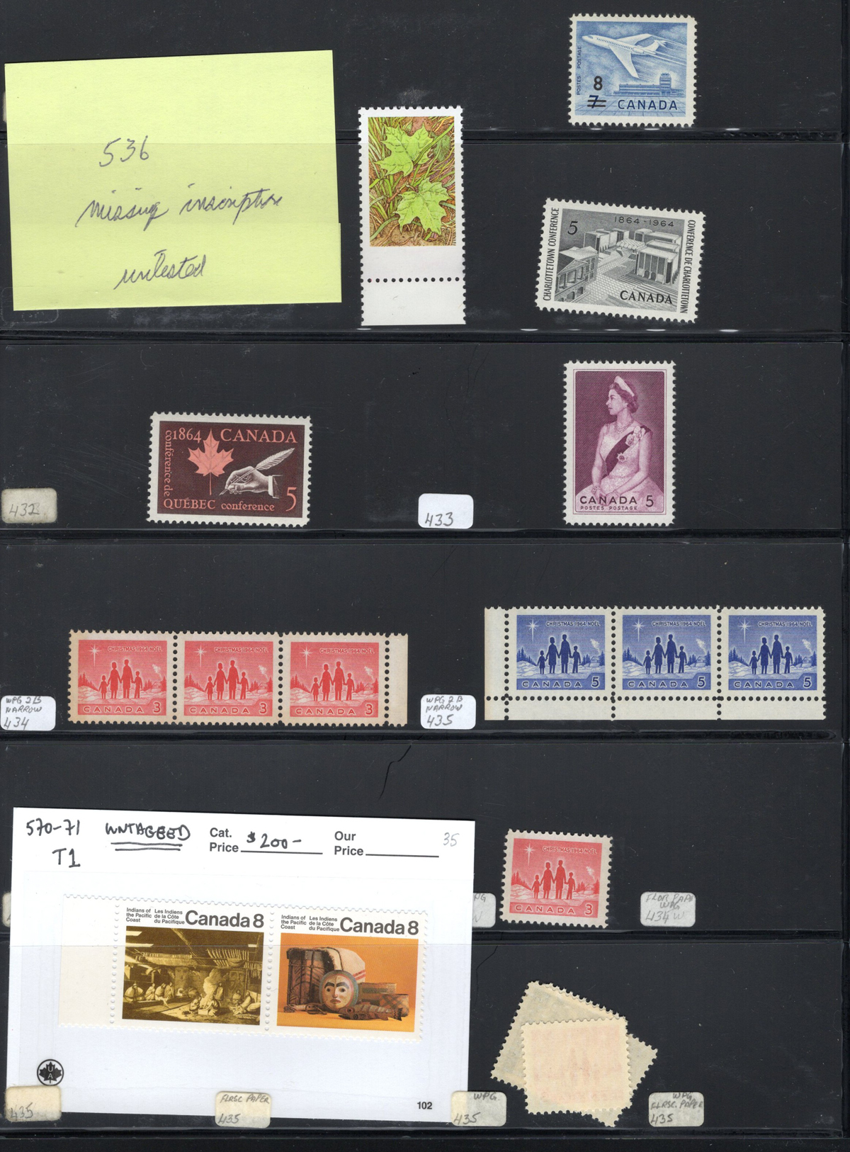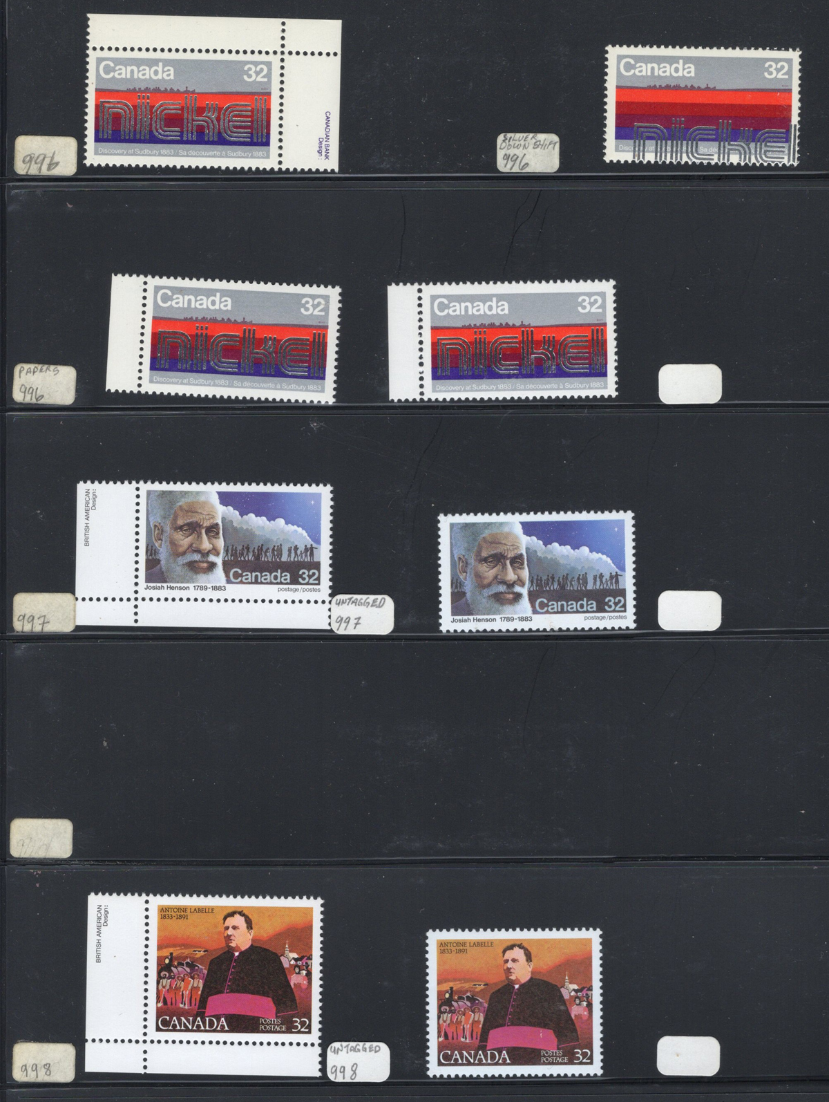 617 nh 347/1172 imageModern Mint Collection, with Many Varieties, 1954-1985, all mounted on 37 double-sided Vario stock sheets. The main collection consists of mint never hinged regular issues, which are complemented by coils, booklets and especially printing varieties. We note many tagging varieties including untagged, bar varieties, etc., as well as many misperforated stamps, some quite drastically-so, plus some misprints, paper varieties, missing ink, etc. Some of the stamps that stood out include #536 with missing inscriptions (sold as is, would require a certificate), a good selection of Caricature issue varieties, many 17c green Parliament varieties, untagged pair of #570-71 (Unitrade $200) and many more. A useful collection that would benefit from being viewed in person, we have selected a number of pages to try and represent the flair of the collection. Should be a useful one for varieties enthusiasts, collectors wishing to add variety to their collection, or online resellers. (Scan 1) (Scan 2) (Scan 3) (Scan 4) (Scan 5) (Scan 6) (Scan 7) (Scan 8) (Scan 9) (Scan 10) (Scan 11) (Scan 12) (Scan 13) (Scan 14) (Scan 15) (Scan 16) (All Scans) (All Images)