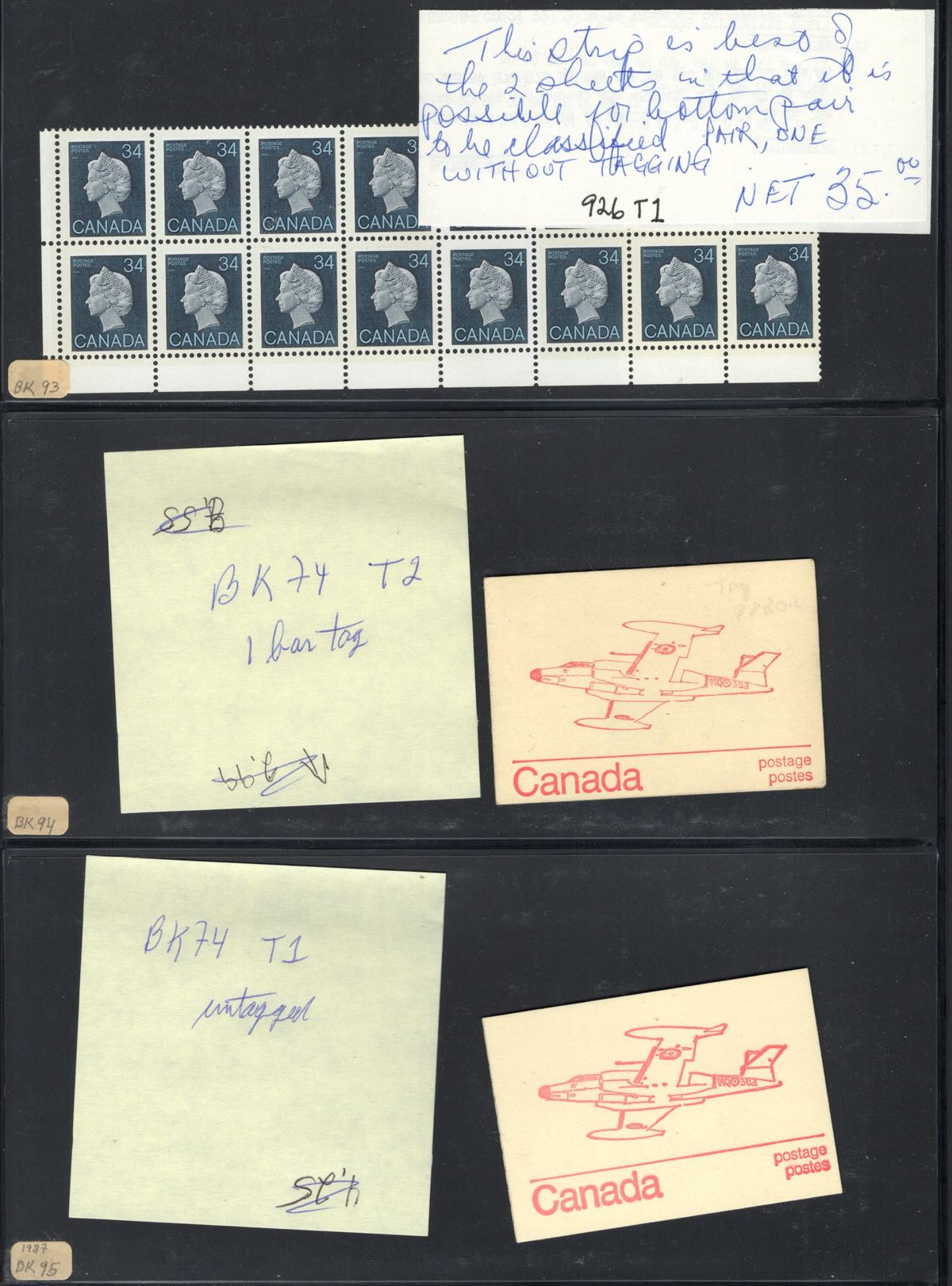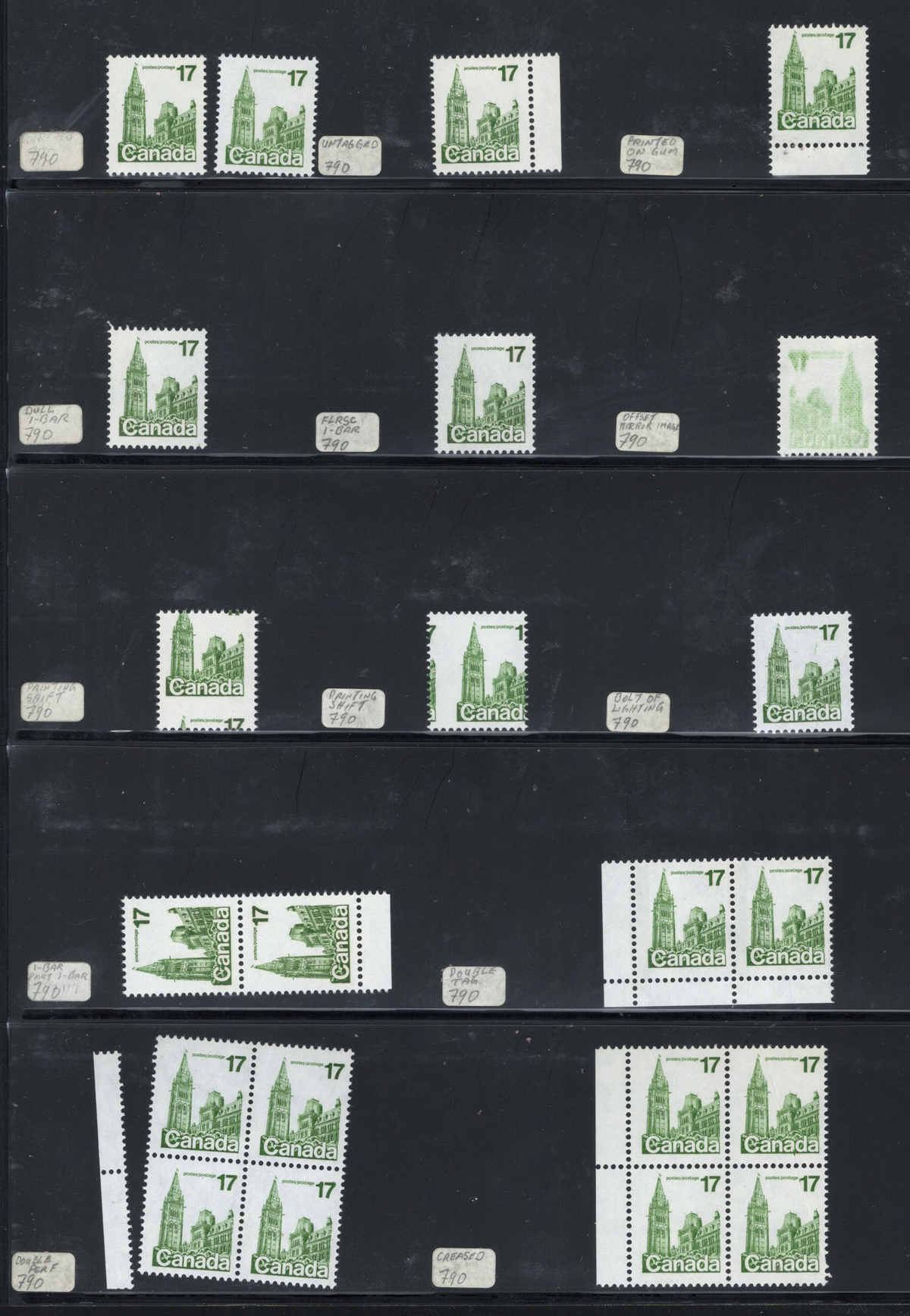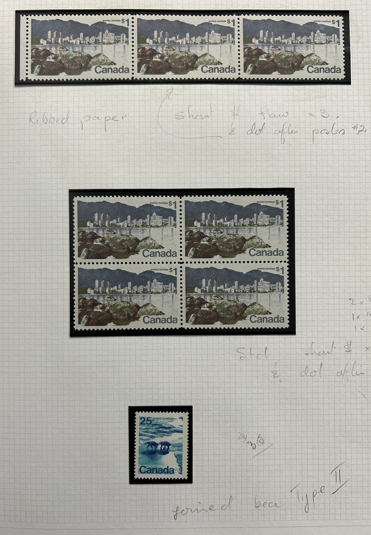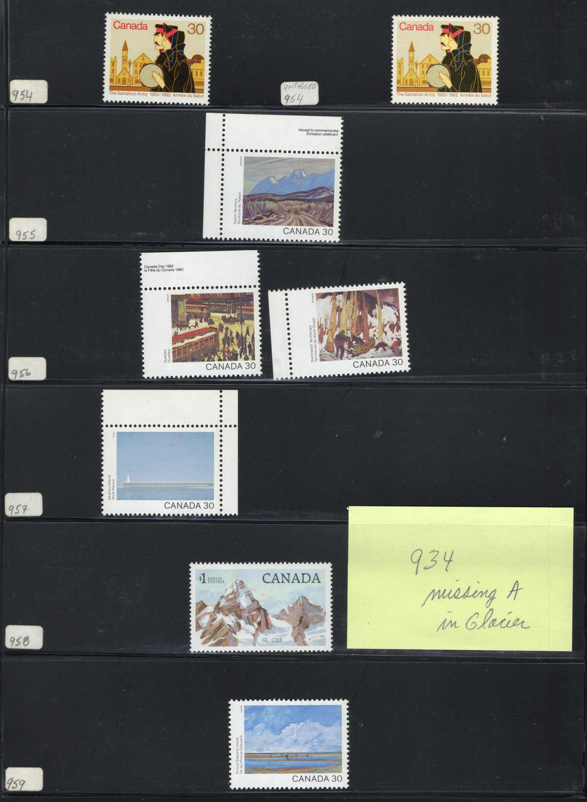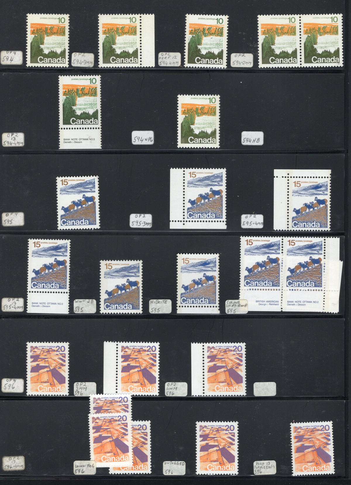617 nh 347/1172 imageModern Mint Collection, with Many Varieties, 1954-1985, all mounted on 37 double-sided Vario stock sheets. The main collection consists of mint never hinged regular issues, which are complemented by coils, booklets and especially printing varieties. We note many tagging varieties including untagged, bar varieties, etc., as well as many misperforated stamps, some quite drastically-so, plus some misprints, paper varieties, missing ink, etc. Some of the stamps that stood out include #536 with missing inscriptions (sold as is, would require a certificate), a good selection of Caricature issue varieties, many 17c green Parliament varieties, untagged pair of #570-71 (Unitrade $200) and many more. A useful collection that would benefit from being viewed in person, we have selected a number of pages to try and represent the flair of the collection. Should be a useful one for varieties enthusiasts, collectors wishing to add variety to their collection, or online resellers. (Scan 1) (Scan 2) (Scan 3) (Scan 4) (Scan 5) (Scan 6) (Scan 7) (Scan 8) (Scan 9) (Scan 10) (Scan 11) (Scan 12) (Scan 13) (Scan 14) (Scan 15) (Scan 16) (All Scans) (All Images)