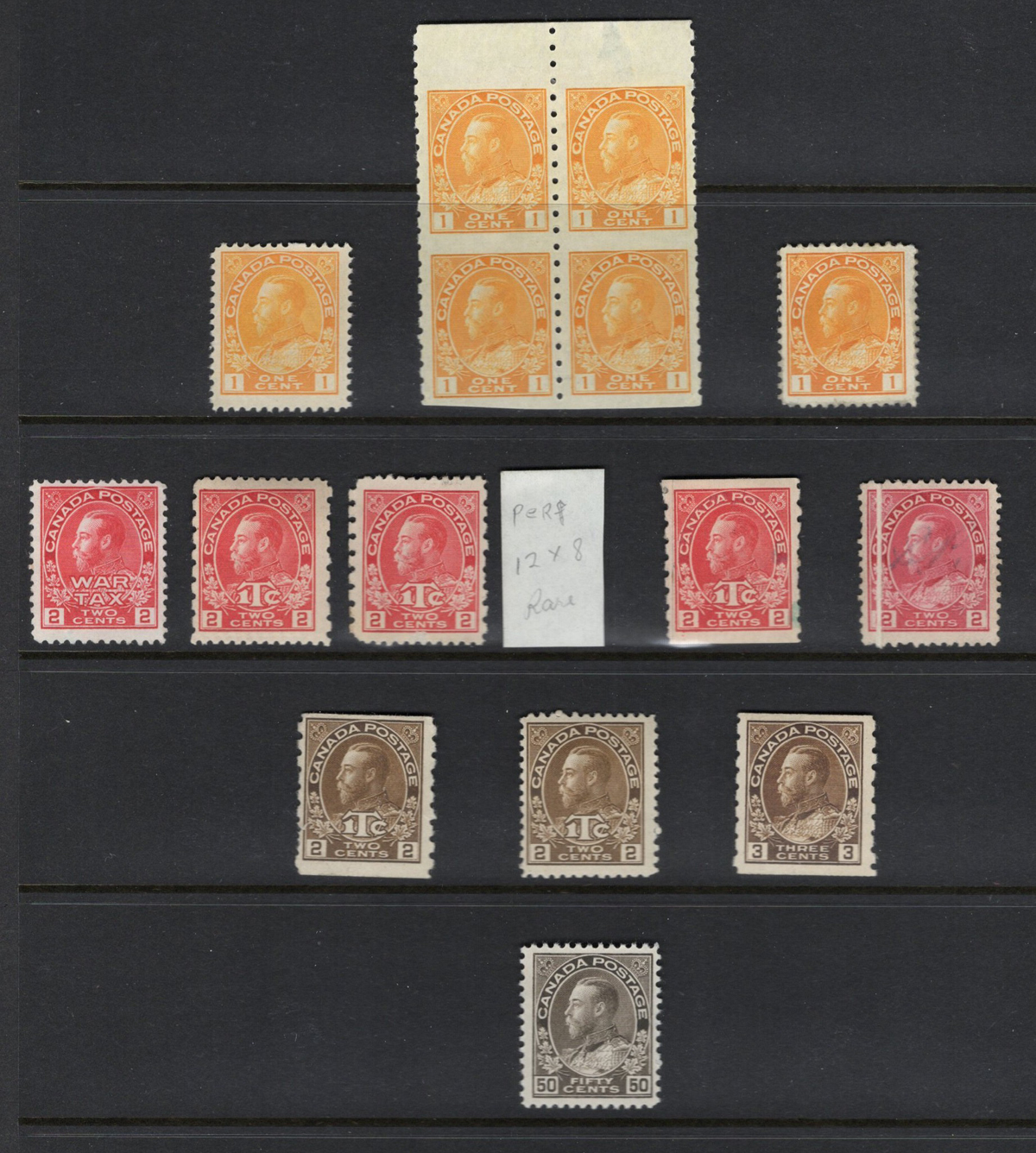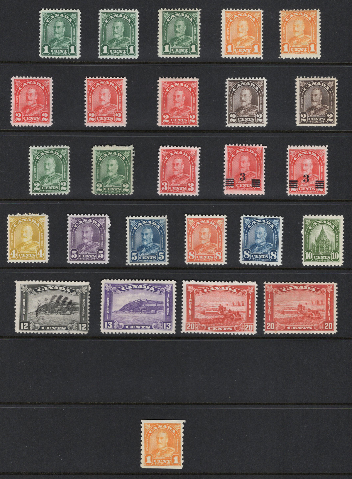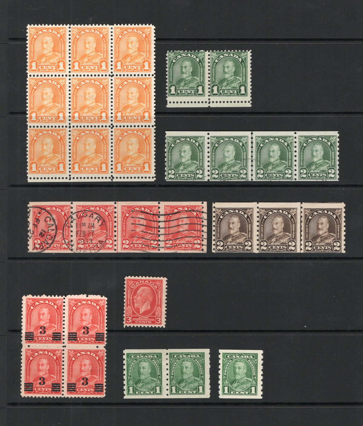 616 O/og/nh 162i/228ii imageGroup of 9 King George V Issue Varieties, with #s 162i (major re-entry in NH block of 9), 163ii (major re-entry in NH pair), 180iii (“Cockeyed King” in a used strip of four), 181iii (Cockeyed King” in a very fine used strip of four),182iii (“Cockeyed King” in a hinged strip of 3), 191i (Extended Moustache” in a NH block of four),192i (hinged "broken E”) and 228ii “Narrow 1” in a hinged pair and single). A fine group except where noted.