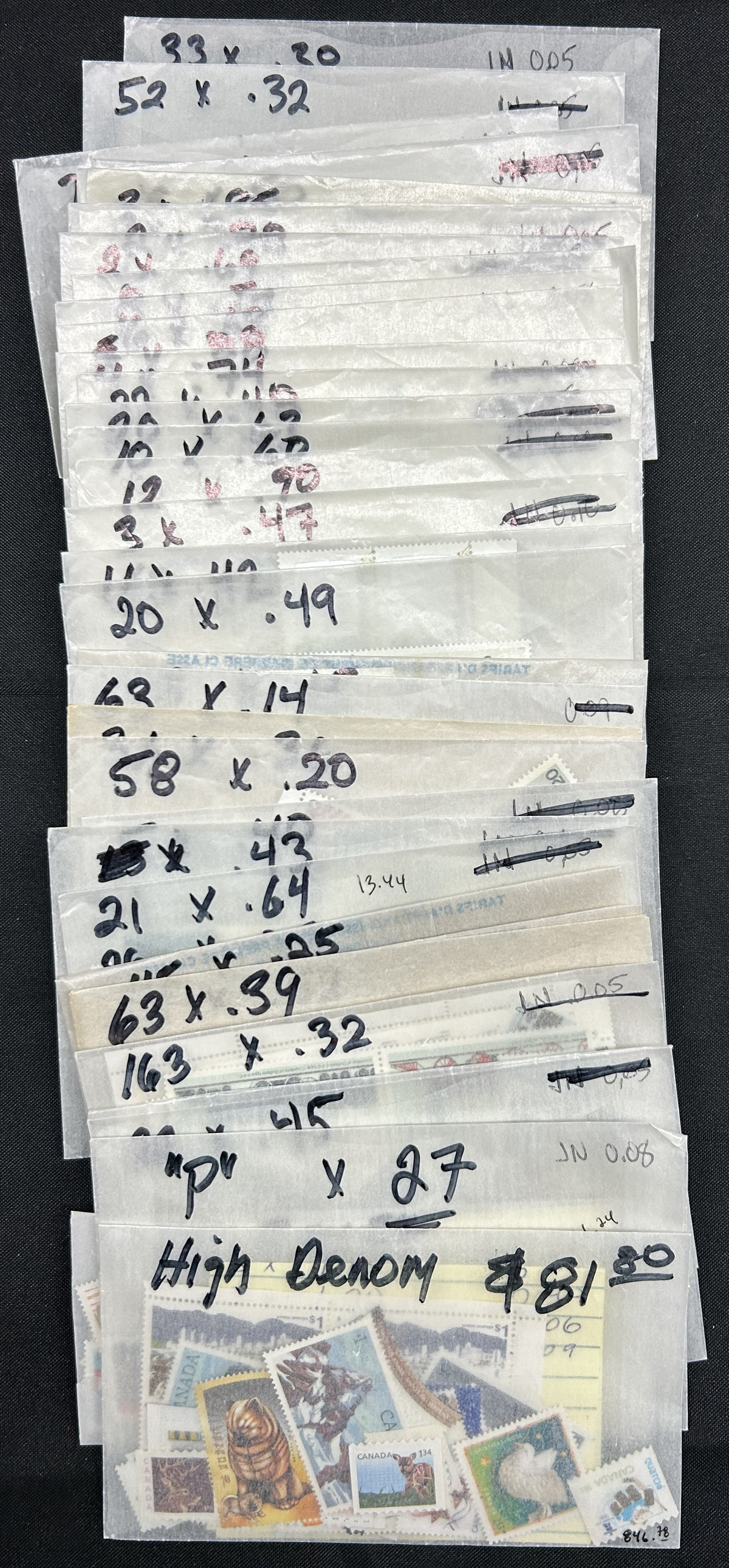 619 nh   imageBox of Mostly Sorted Postage, with a good proportion in glassine envelopes sorted by Scott # (443 to1288) plus a good quantity of 39c to 45c values in blocks of four, and more loose modern items such as souvenir sheets, etc., up to $5 values. We note a few hundred "P" stamps (which were counted at only $1 each) for a total of over $1,350. (Scan 1) (Scan 2) (Scan 3) (All Scans) (All Images)