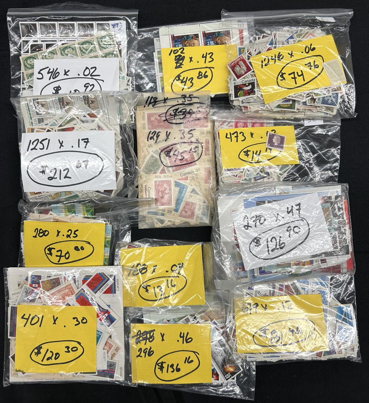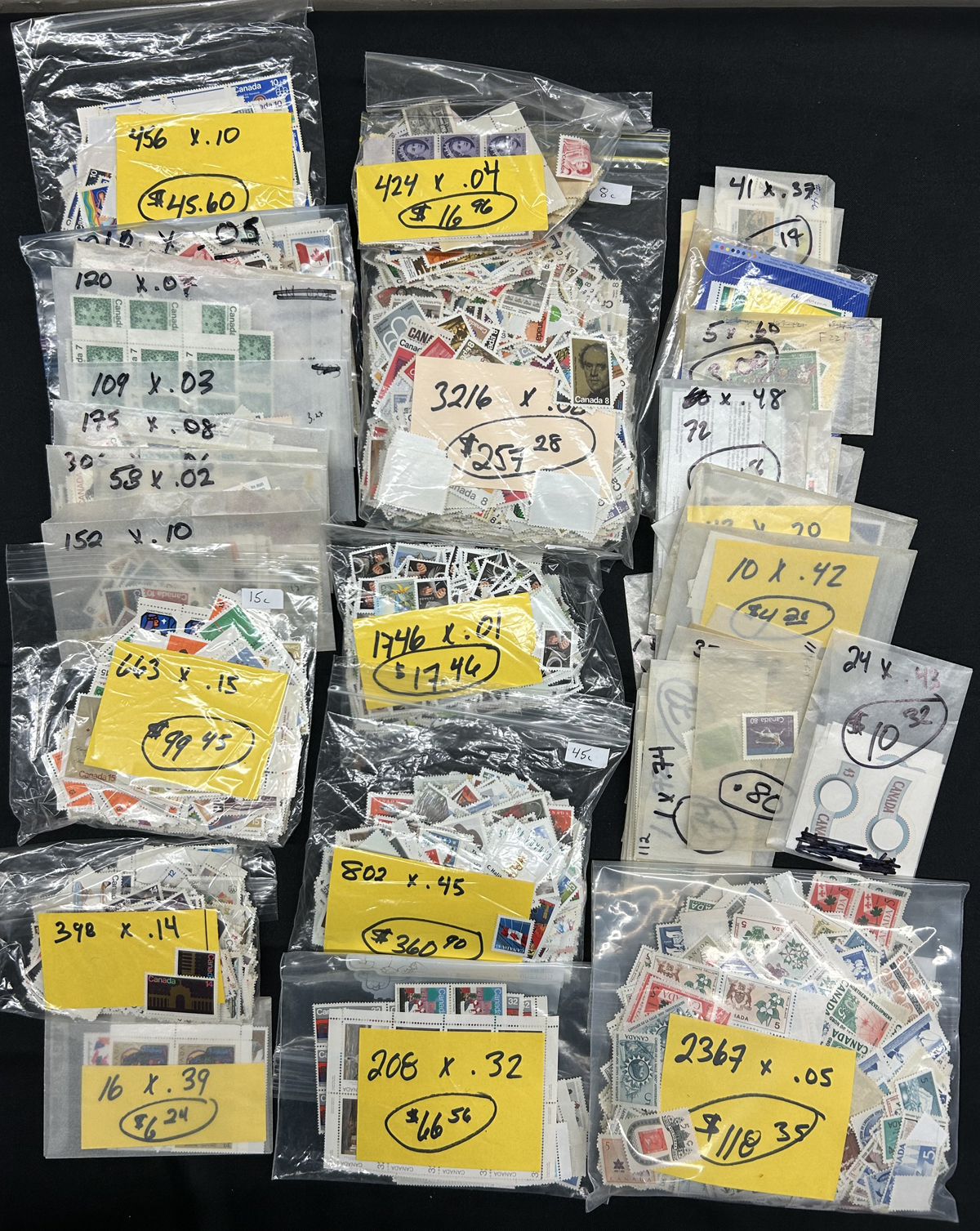 618 nh   imageBox Full of Sorted Postage, with a good variety of denominations between 1c and $1, with the majority of the value being in the 17c to 50c range, with many above and below that range. Most are singles, but there are also many blocks. The attraction to this lot is the fact that every denomination is sorted in a separate glassine or ziplock bag, making its usage very easy. Our photos will give a good idea. (Scan 1) (Scan 2) (Scan 3) (All Scans) (All Images)