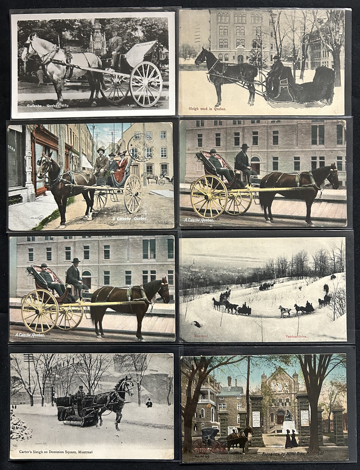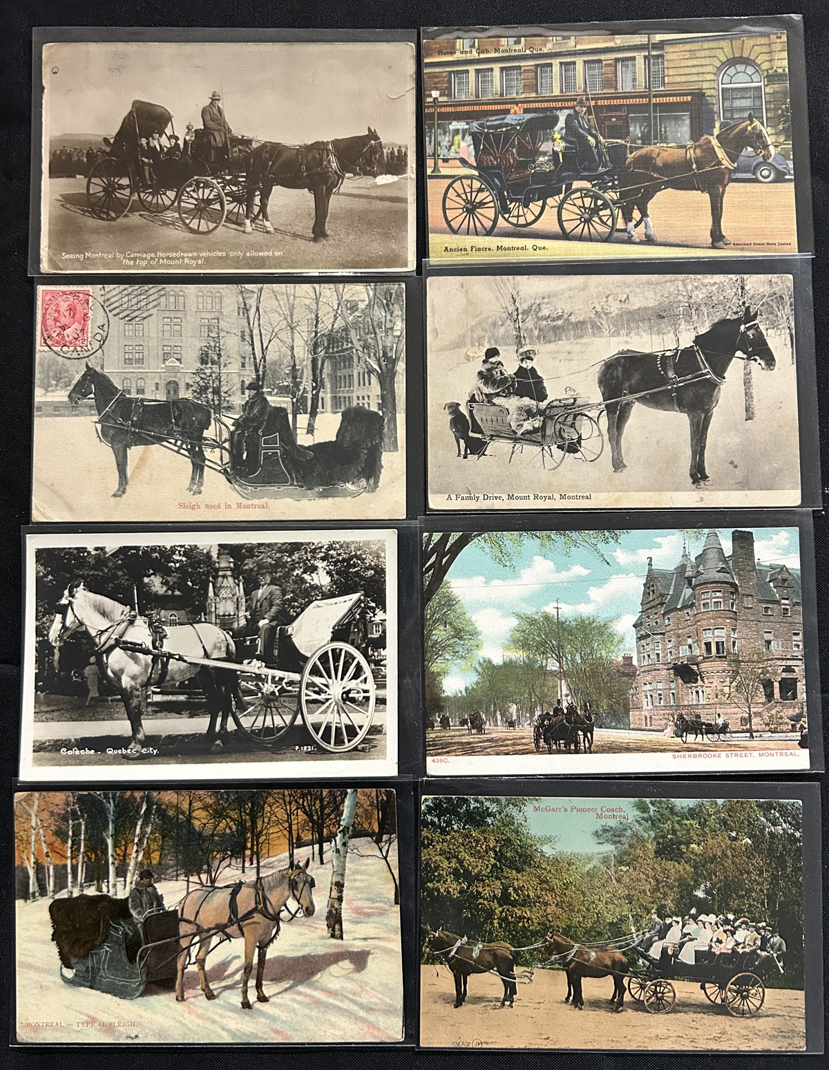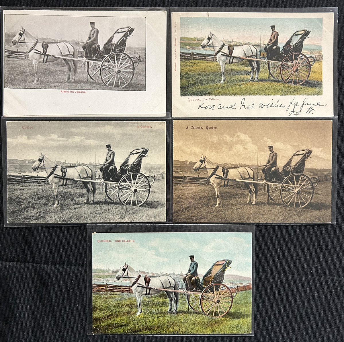 603 PC   imageGroup of About 85 Early Picture Postcards from Montréal and Québec City with Horse Drawn Carriages, or the French term "calèche", with a good variety of depictions, including a little duplication, but sometimes there will be the same picture printed in a different method (see picture for an example). We estimate that about half of the cards were mailed, and the cards all appear to date between the early 1900s and the 1970s. Quality is overall nice, with the usual small faults here and there. (Scan 1) (Scan 2) (Scan 3) (All Scans) (All Images)