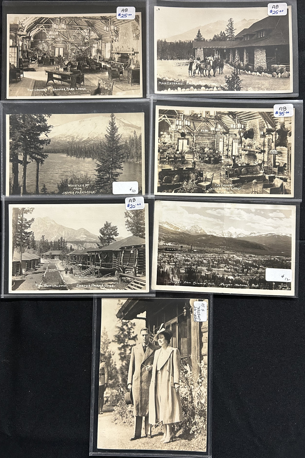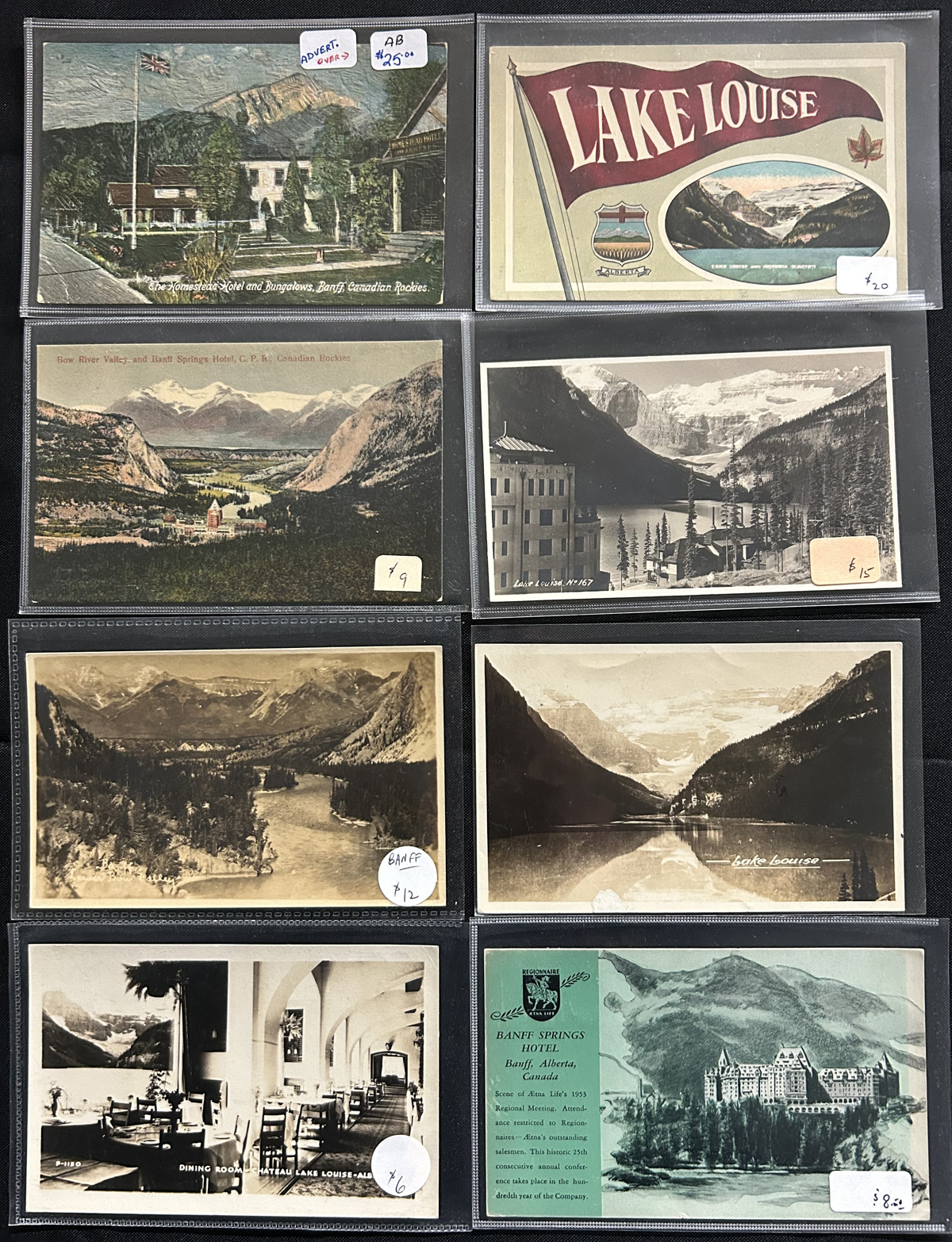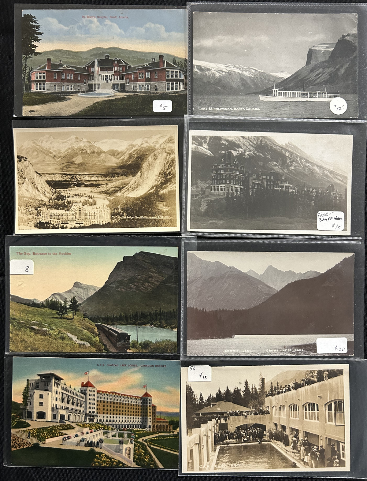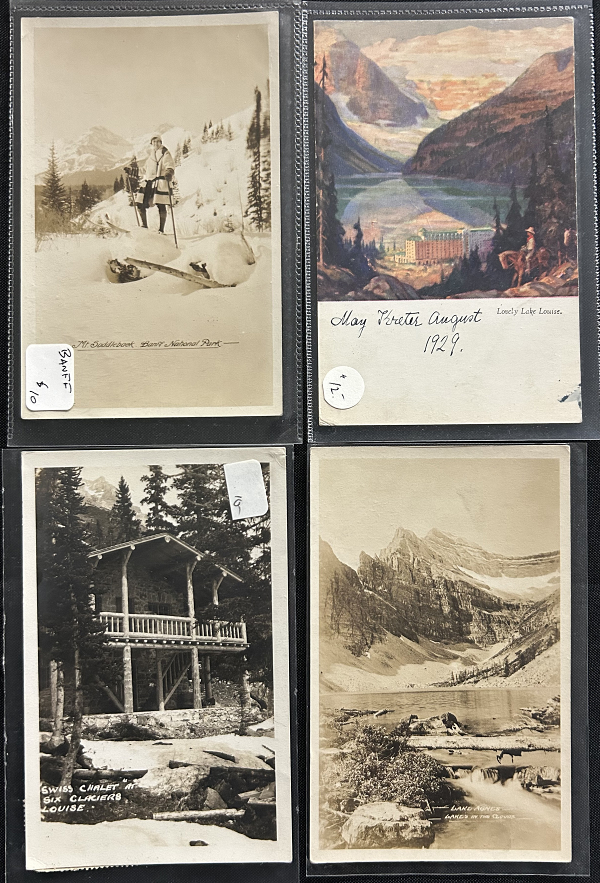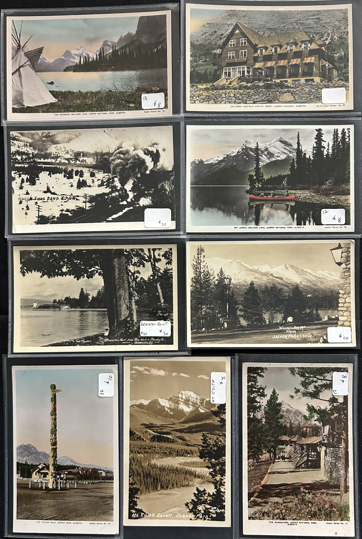 607 PC   imageGroup of About 450 Early Picture Postcards from the Canadian Rockies, with a good variety of mountain and lake scenes, resorts, real photo, and much more. We estimate that only a few dozen of the cards were mailed, and the cards all appear to date between the early 1900s and the 1950s. The cards are separated into the categories of Banff, Rockies, Columbia Icefields, J.B. Series, Jasper-Banff, Jasper-Banff Road, Jasper Park, and Banff-Jasper. Quality is very nice overall, with the cards all sleeved, including several with retail prices ranging from $5 to $35. (Scan 1) (Scan 2) (Scan 3) (Scan 4) (Scan 5) (All Scans) (All Images)