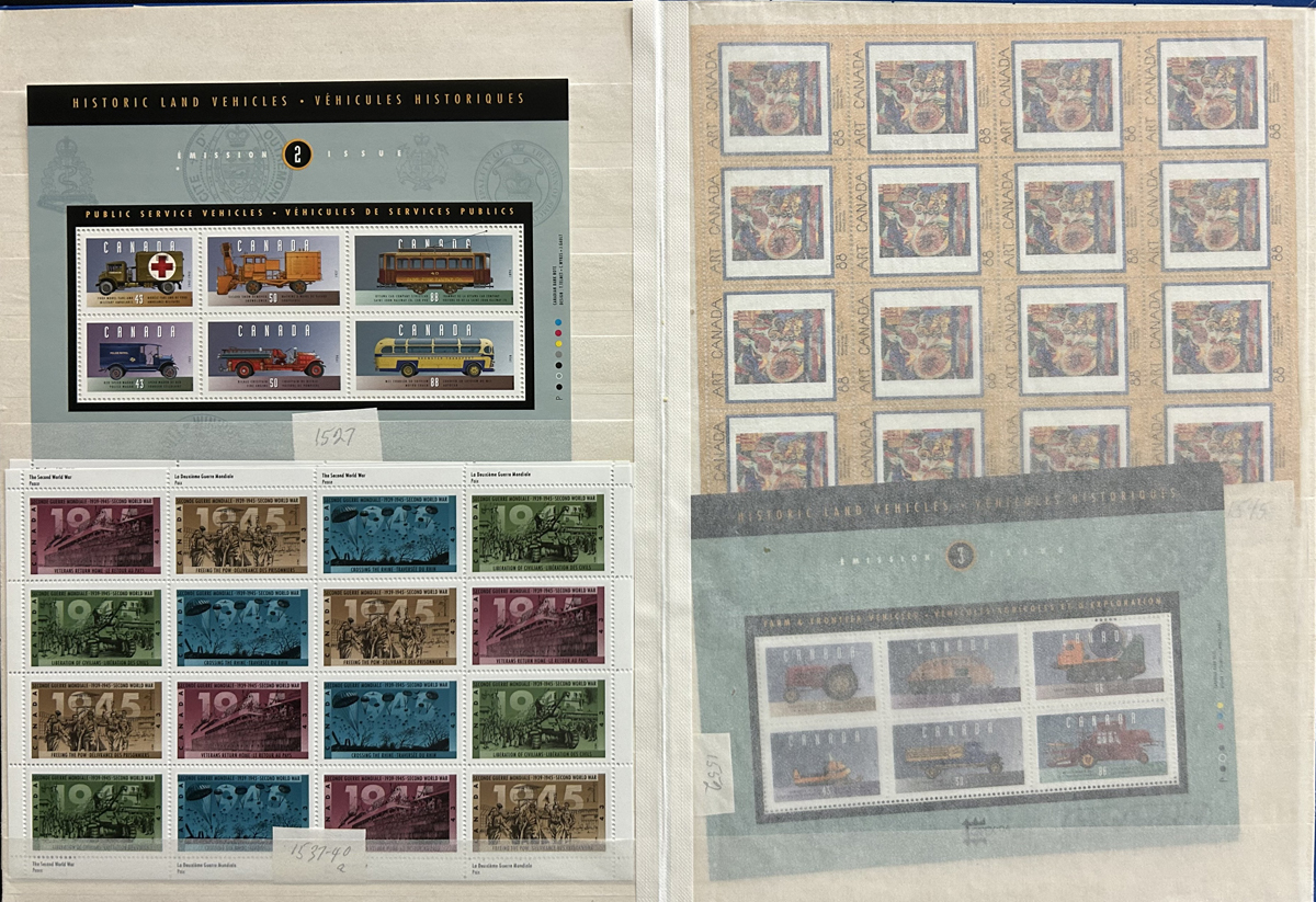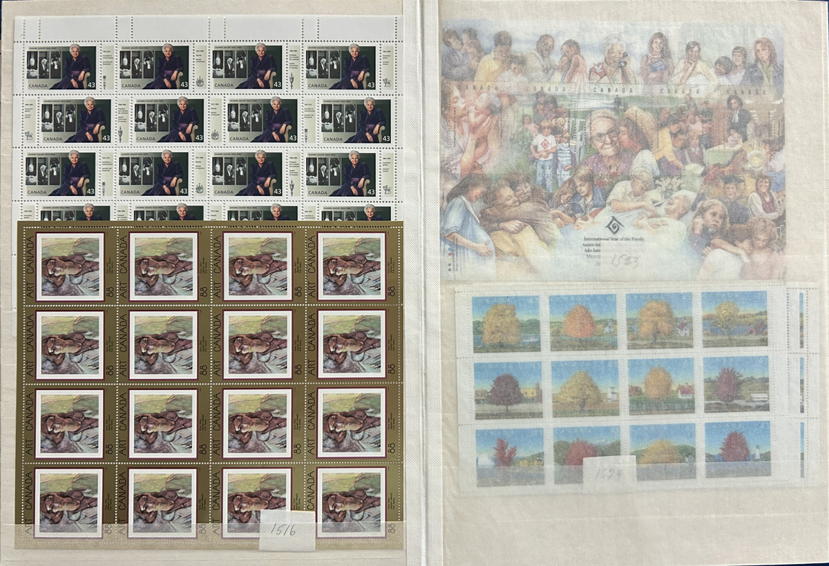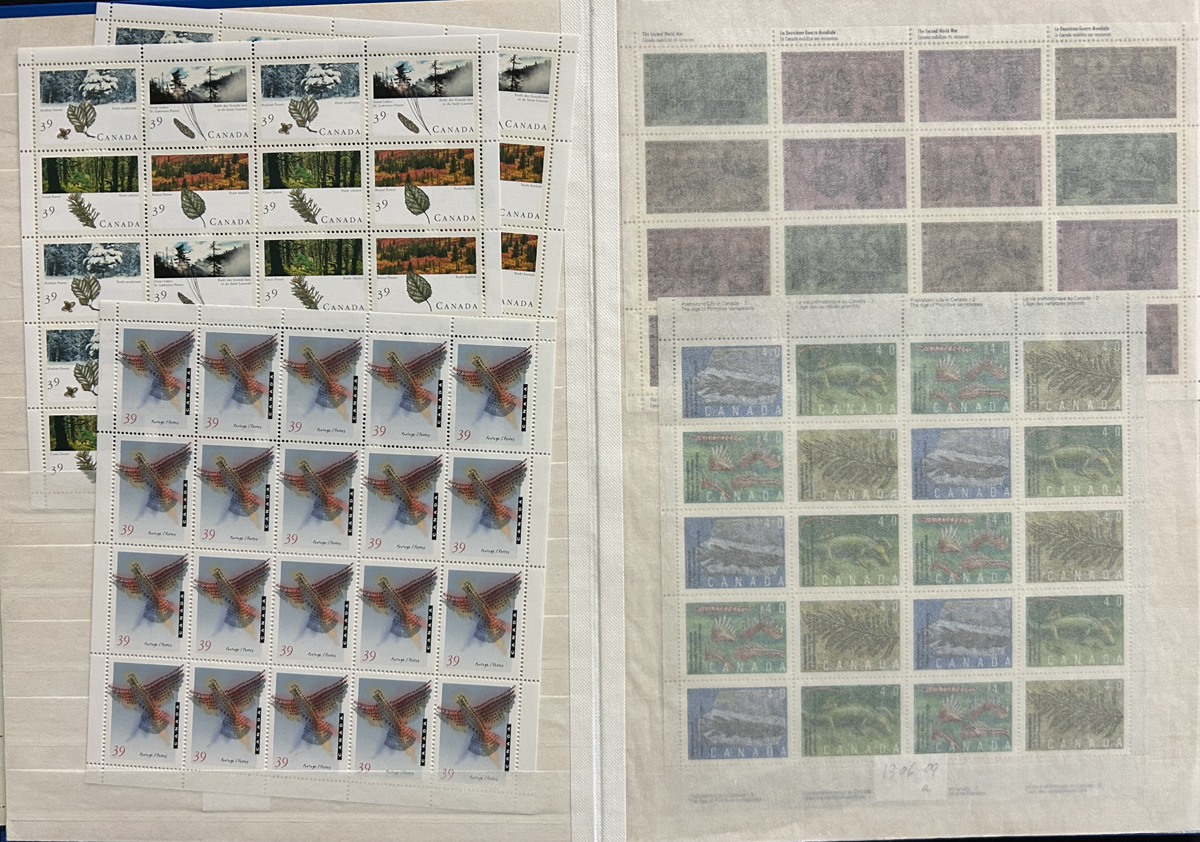 620 nh   imageCollection of Sheets, Mini Sheets and Souvenir Sheets, filling two stockbooks, from roughly the 17c to the 54c era, with good variety and some duplication, for example there are three sheets of 50 of the 38c Royal Regiment issue, etc. All mint never hinged and very fine. (Scan 1) (Scan 2) (Scan 3) (Scan 4) (Scan 5) (All Scans) (All Images)