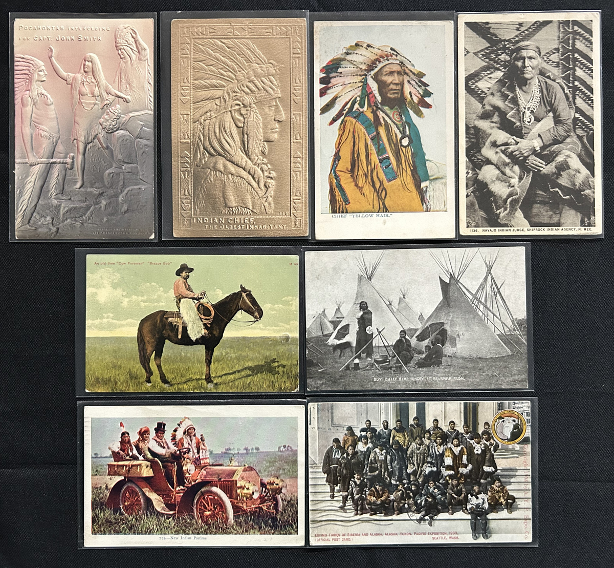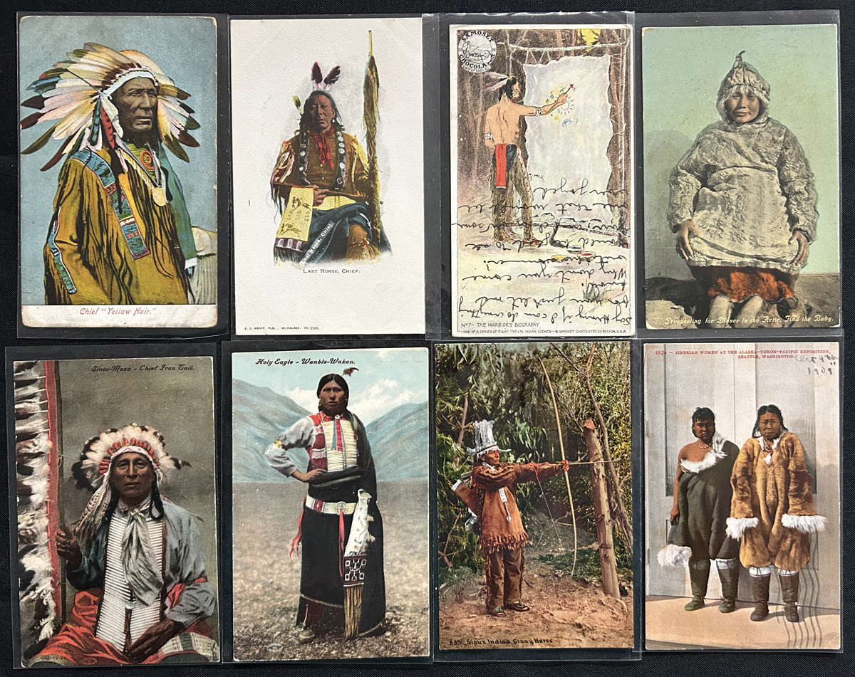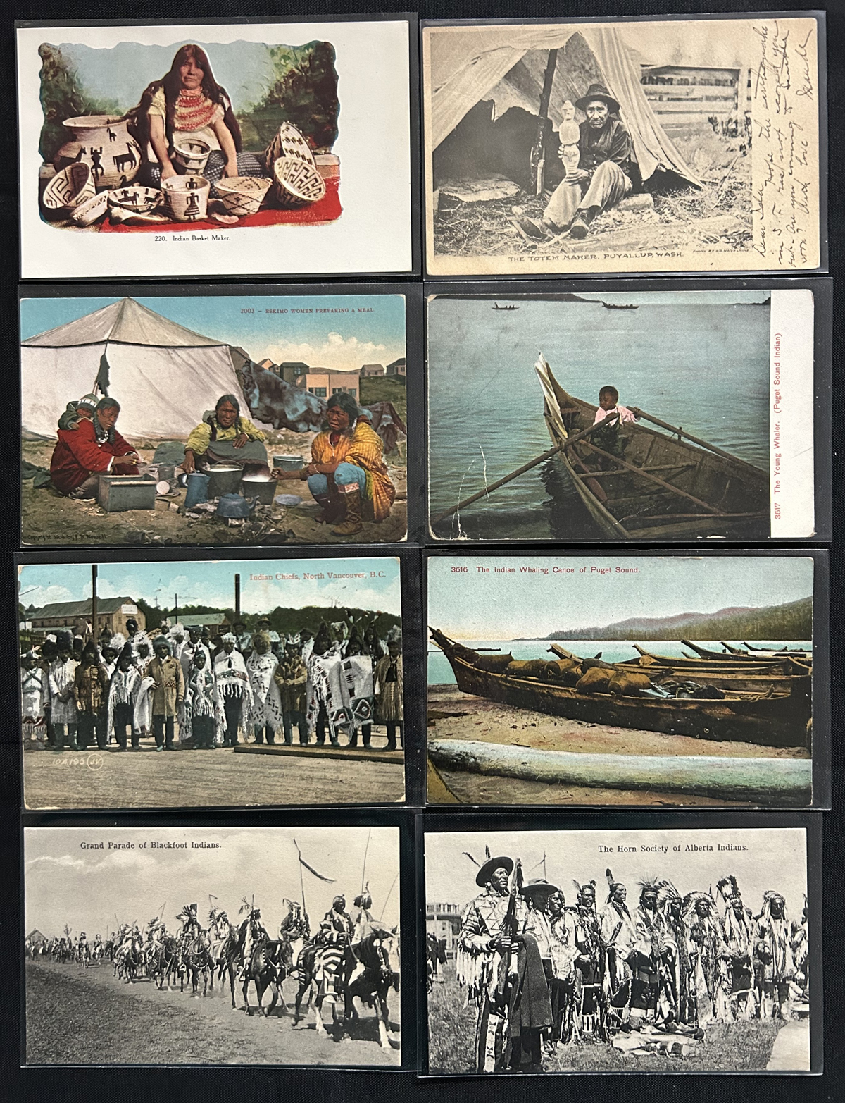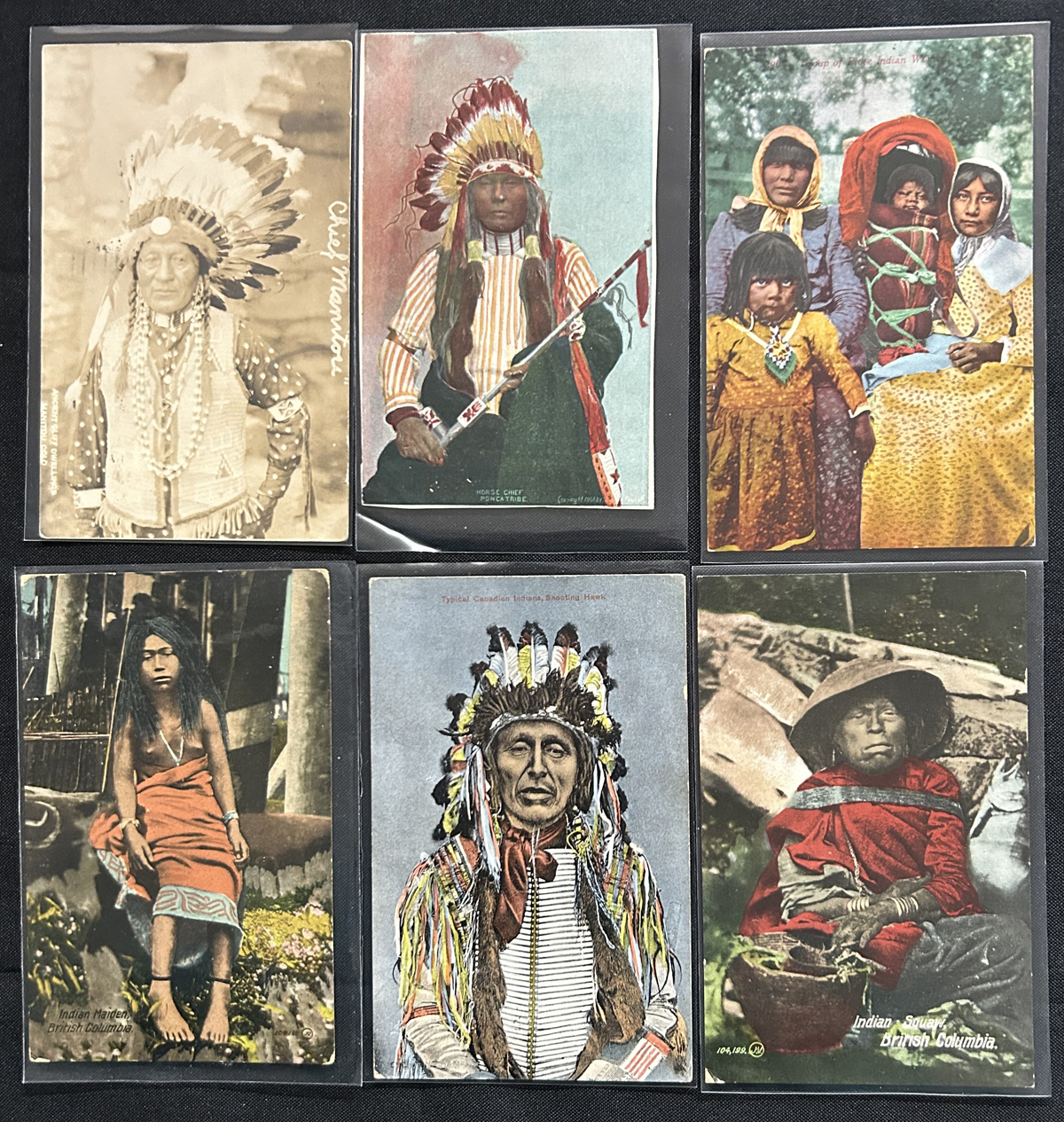 608 PC   imageGroup of 73 North American First Nations Picture Postcards, mostly unused, with over a dozen that were mailed from Canada, United States or England, the pictures cover a range of subjects such as different tribes (several from British Columbia), baskets, families, Inuit, Chiefs, and more. There are also several types of postcards, including real photo, coloured, a few series, embossed, cards with glitter or tinsel, etc. All cards are sleeved and many are priced in the $5 to. $20 range, and a few have faults, else overall fine to very fine overall. Our photos only show a small sampling. (Scan 1) (Scan 2) (Scan 3) (Scan 4) (All Scans) (All Images)