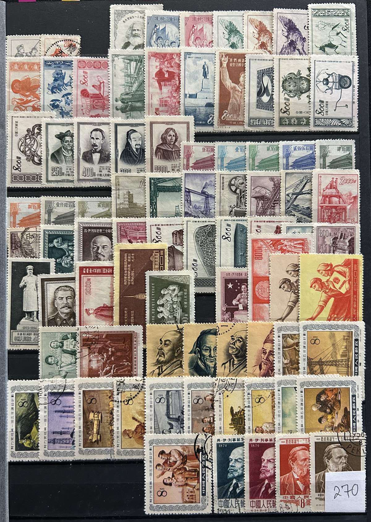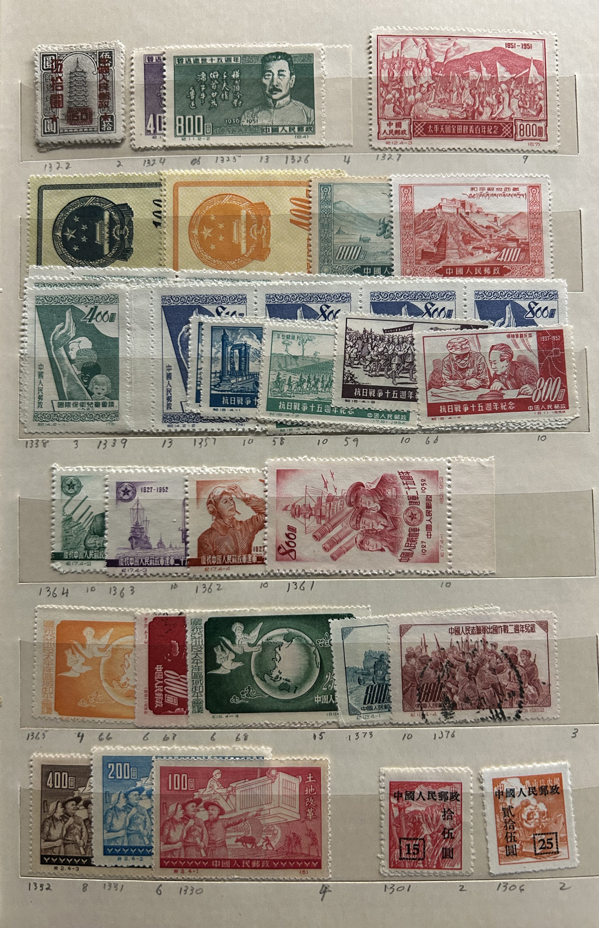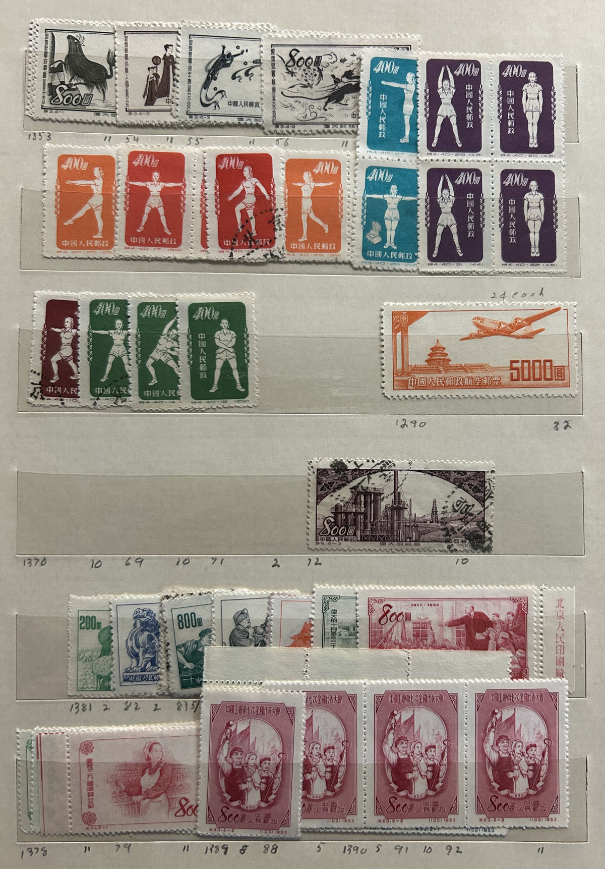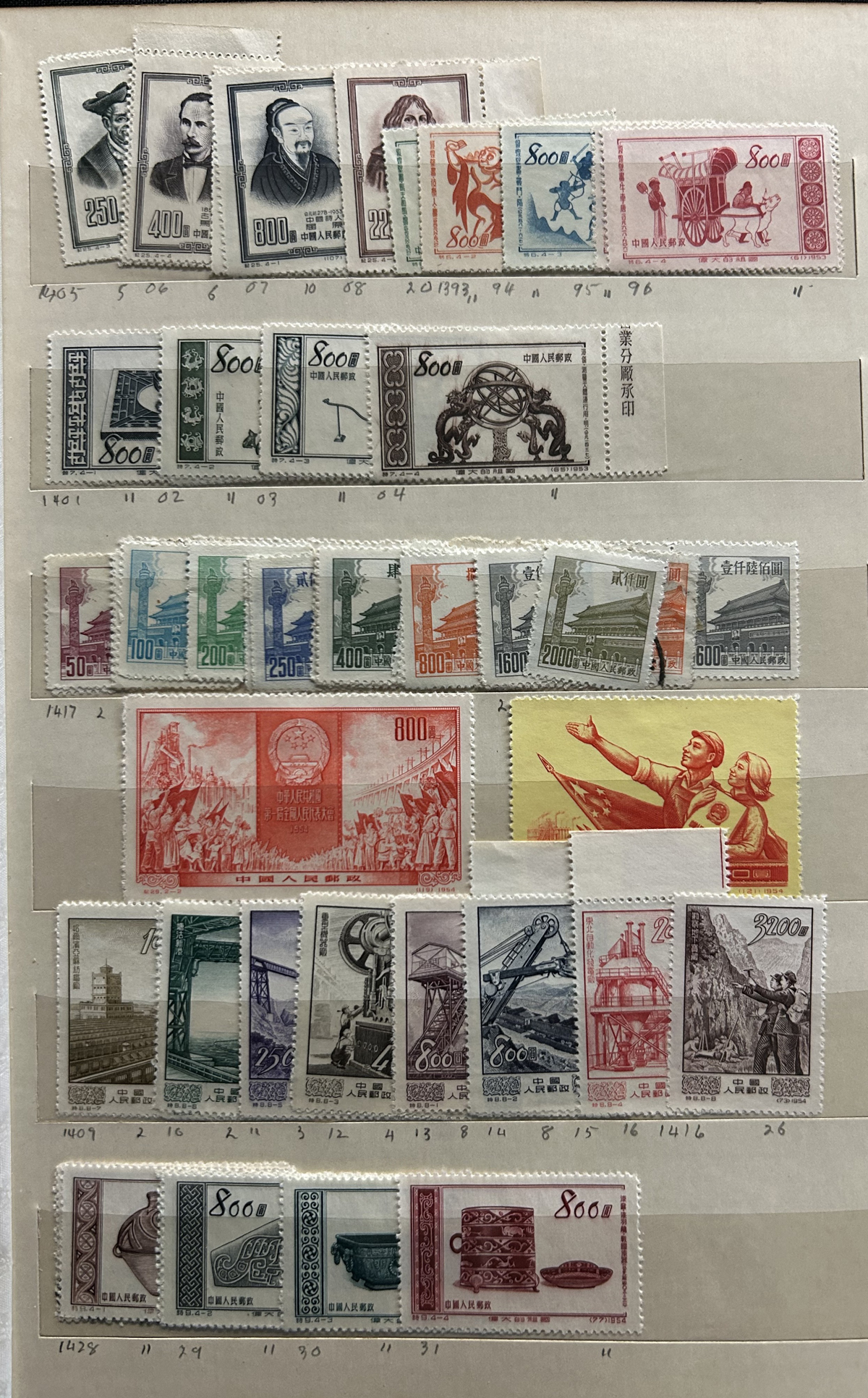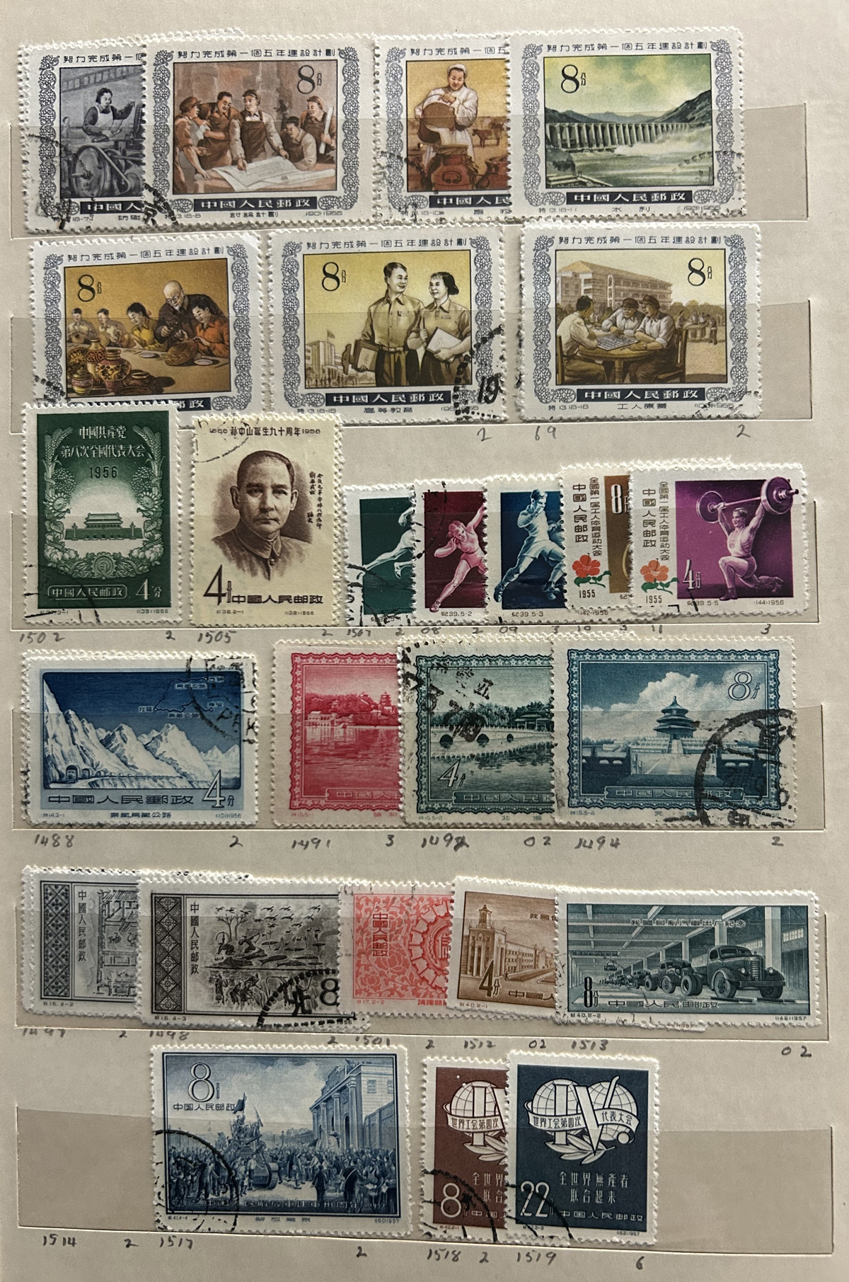 657 O/ng   imageCollection of Early P. R. China Issues in a Stockbook, 1950 to 1966, with over 280 different stamps (plus a little duplication), noting singles, complete and partial sets, with a mix of either used (postally used and C.T.O.), or mint (no gum, as issued). We also noted a mint never hinged set of Scott 1090-94 (U$141), etc. Overall fine or better, al pages are photographed online. (Scan 1) (Scan 2) (Scan 3) (Scan 4) (Scan 5) (Scan 6) (Scan 7) (Scan 8) (Scan 9) (Scan 10) (Scan 11) (All Scans) (All Images)