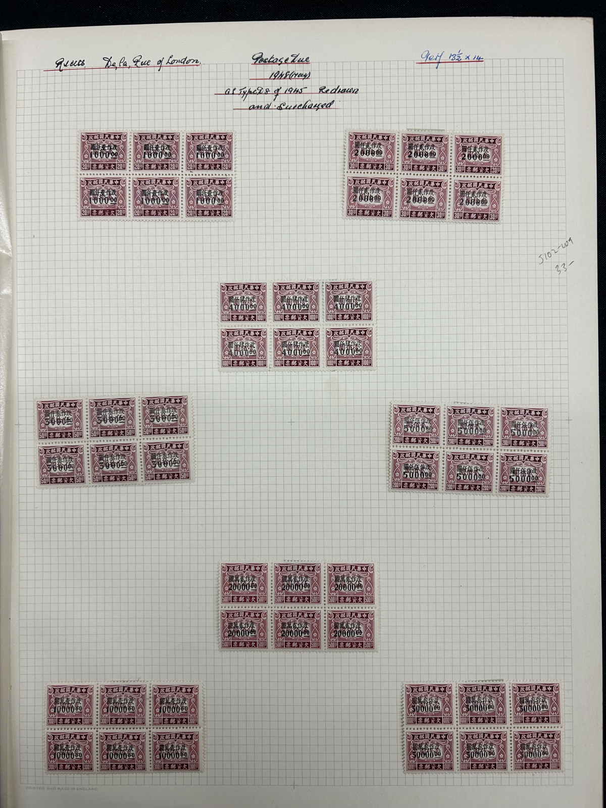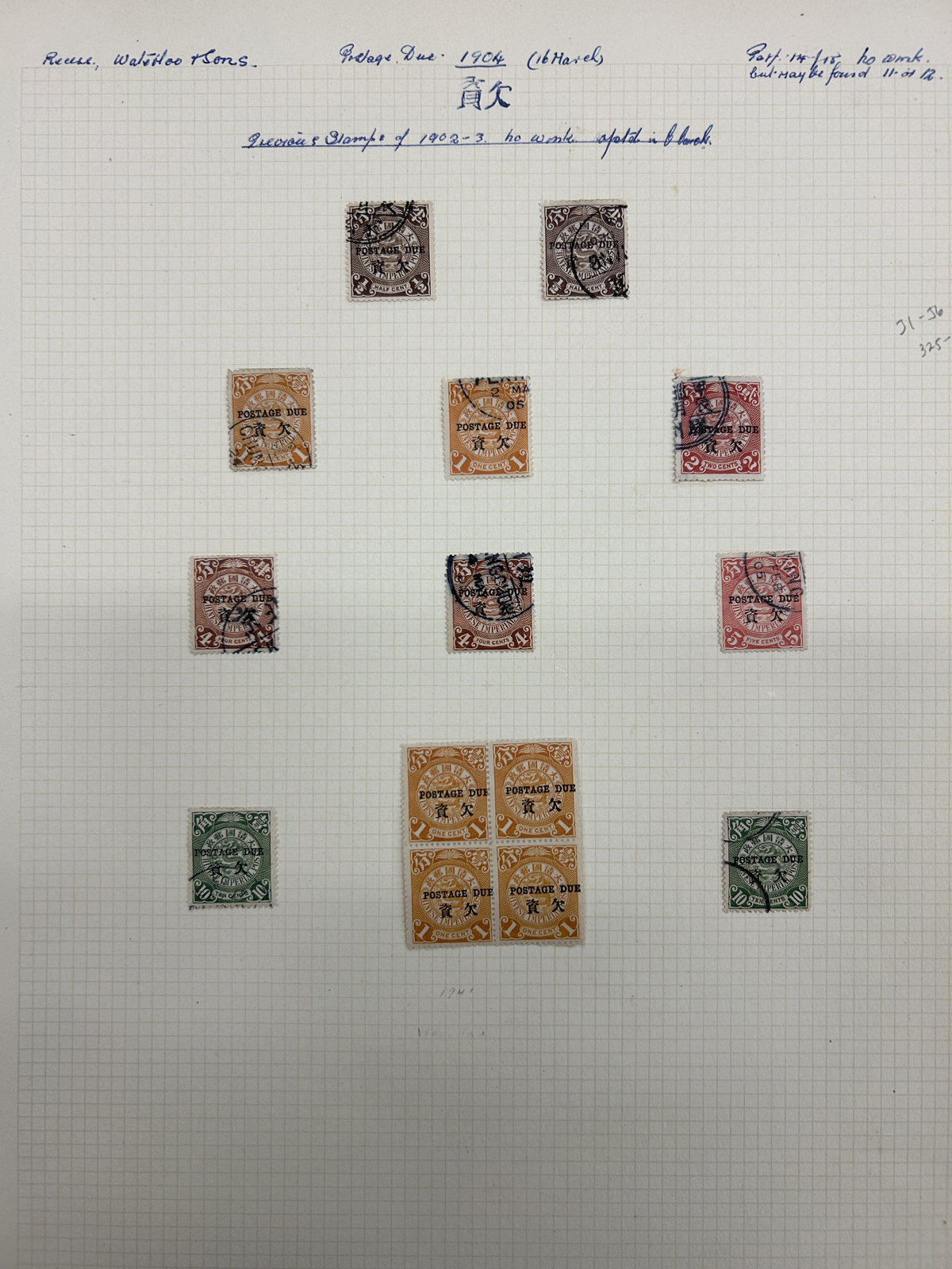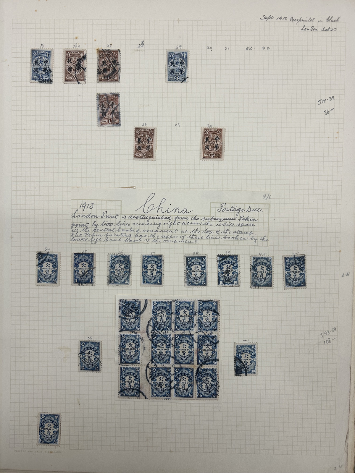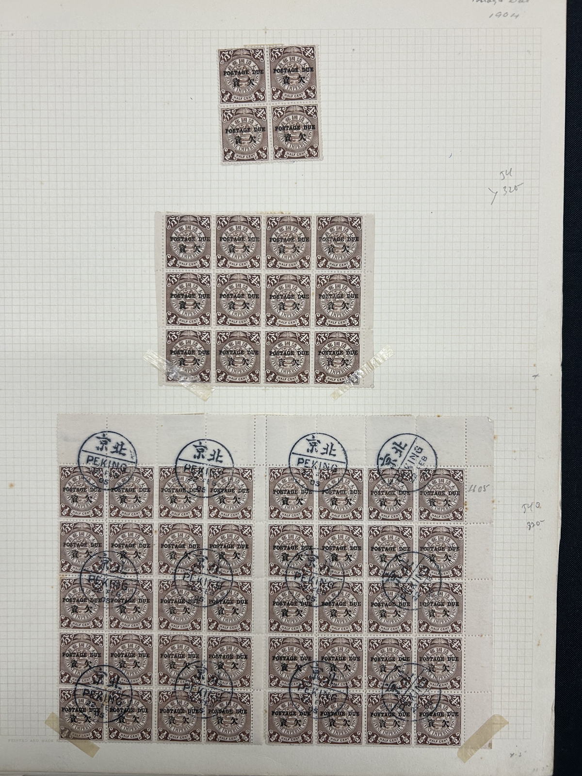 653 O/og J1/J109 imageCollection of Mint and Used Postage Due Stamps of Republic of China, 1904-1948, an old-time collection mounted on 8 large quadrille pages. The collection is near complete, including more valuable items, noting Scott J40 mint blocks of 4 and 12 ($320), J40 used inter-panneau block of 40 ($820), mint J29 ($220) and more. There is a mix of mint and used, often with both, ad we note a little duplication, especially in the used material, but also some useful town postmarks. Overall fine to very fine, the catalogue value does not include some of the lower-value later issues. All 8 pages are pictured online. (Scan 1) (Scan 2) (Scan 3) (Scan 4) (Scan 5) (Scan 6) (Scan 7) (Scan 8) (All Scans) (All Images)