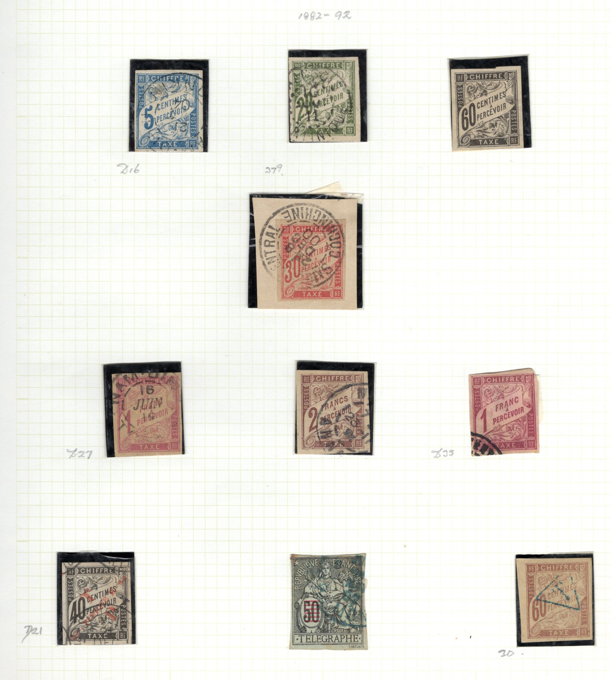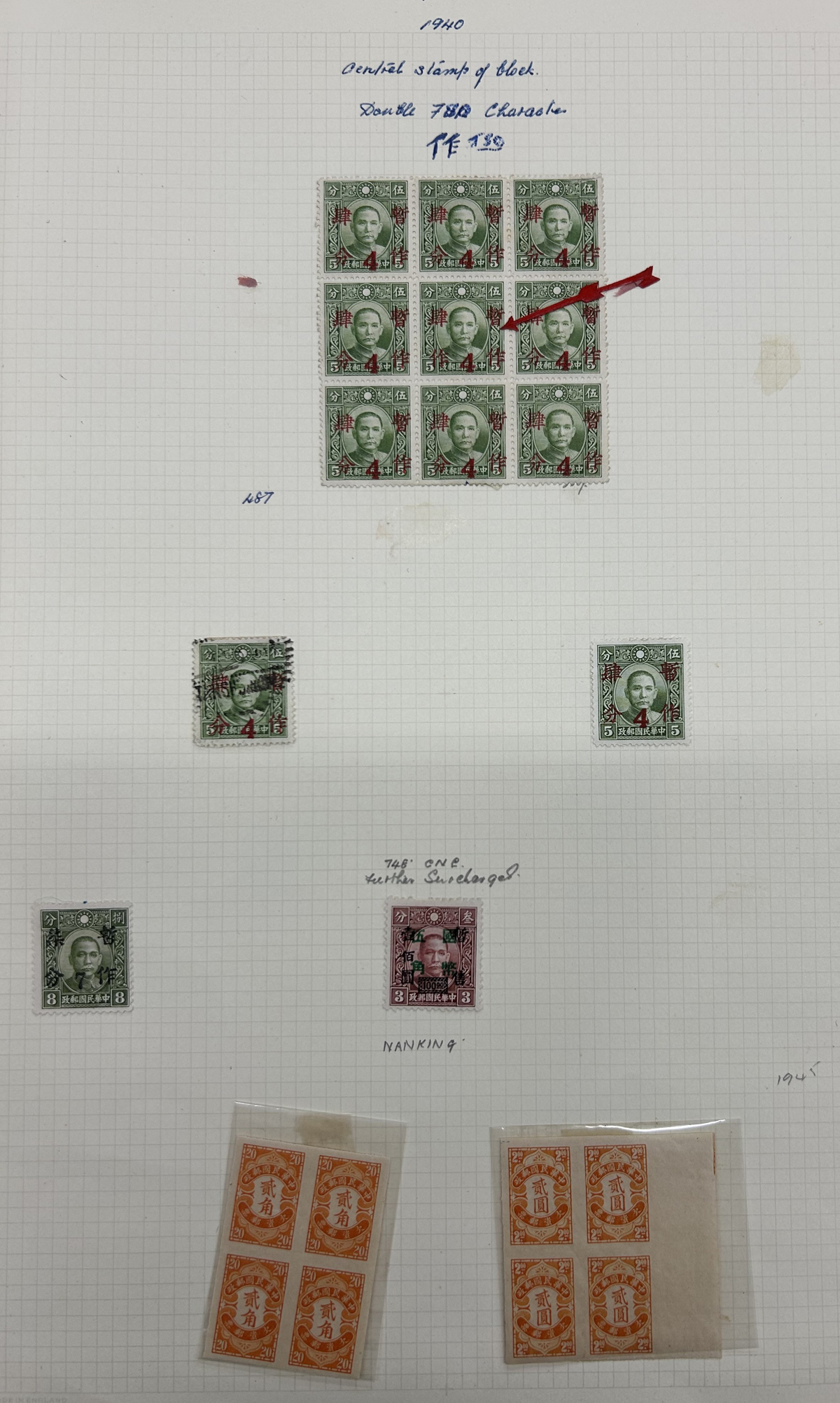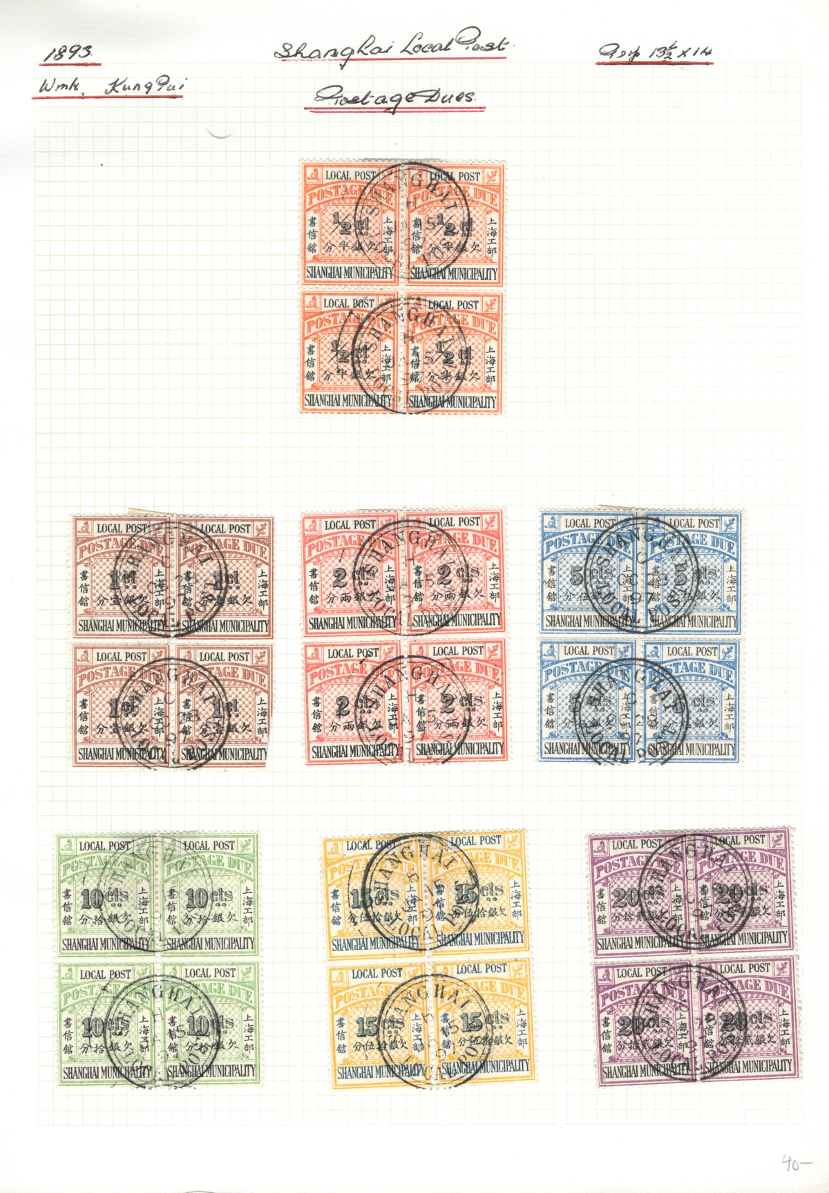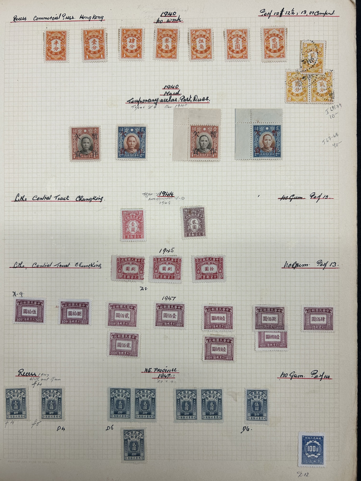 653 O/og J1/J109 imageCollection of Mint and Used Postage Due Stamps of Republic of China, 1904-1948, an old-time collection mounted on 8 large quadrille pages. The collection is near complete, including more valuable items, noting Scott J40 mint blocks of 4 and 12 ($320), J40 used inter-panneau block of 40 ($820), mint J29 ($220) and more. There is a mix of mint and used, often with both, ad we note a little duplication, especially in the used material, but also some useful town postmarks. Overall fine to very fine, the catalogue value does not include some of the lower-value later issues. All 8 pages are pictured online. (Scan 1) (Scan 2) (Scan 3) (Scan 4) (Scan 5) (Scan 6) (Scan 7) (Scan 8) (All Scans) (All Images)