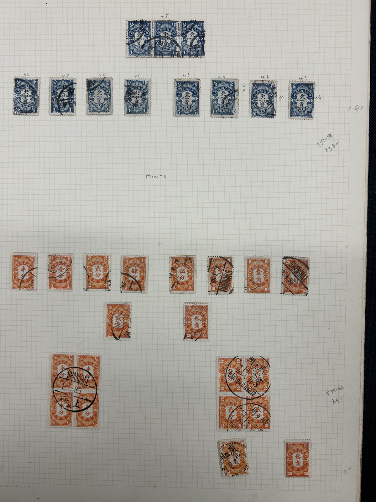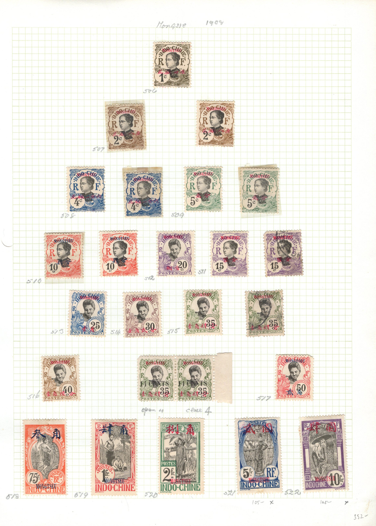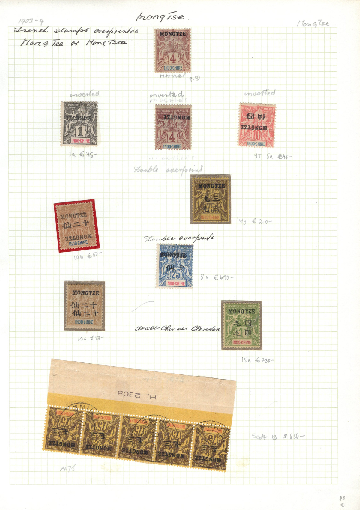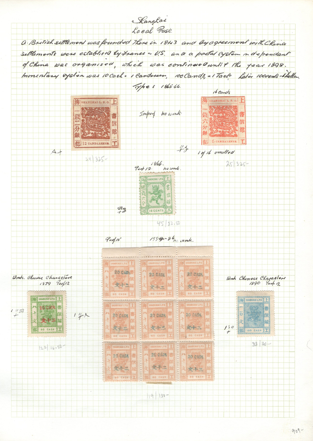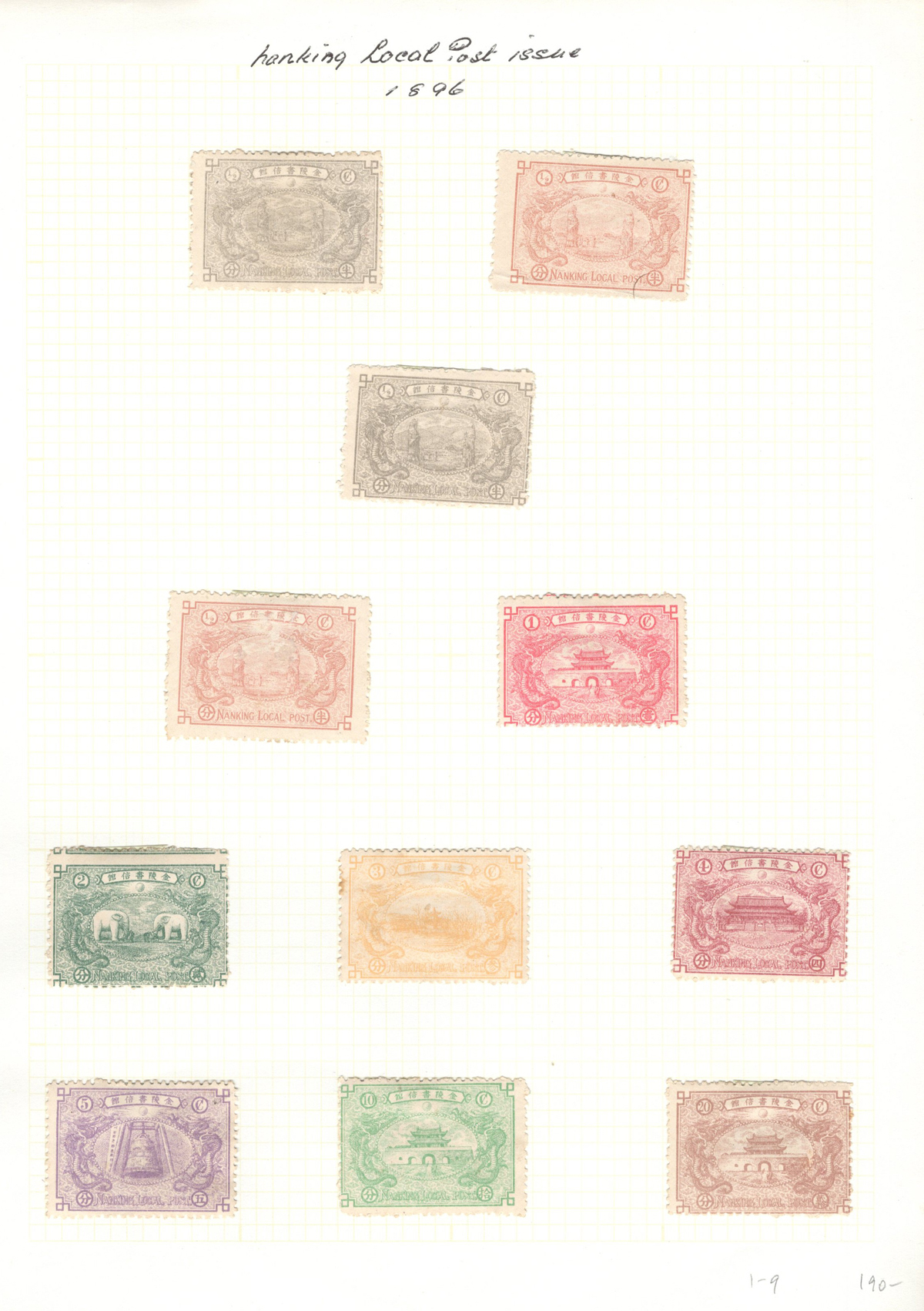 652 O/og/nh   imageValuable Old Time Extensive Collection of Offices in China, Shanghai and Chinese Local Post Office Issues, etc., carefully assembled and displayed on 55 quadrille pages, by a collector who lived in Hong Kong from the 1930s to the 1950s. A tremendously interesting collection, loaded with material not often seen. We noted a page of Italian Offices ($365), page of British Offices ($789), 11 pages of Shanghai Locals ($2,629), page of Yunnan-Fou overprints ($913), many pages of overprinted Indo-China issues including from Mongtseu ($346), Mong-Tseu ($606), a page of Mongtze overprint errors (€1,328 in Yvert Colonies catalogue), Mongtze #13 strip of 5 ($650), another page of Mongtze overprints ($1,559), 2 pages of French Colonies issues for China ($391), page of Hankow Local issues ($652), Nanking Local Post #1-15 ($381), also stamps from Foochow, Chungking, Chefoo ($357), Chinkiang, 2 pages of Amoy issues ($533), 2 pages of German Offices ($485), and more, including a few stationery cards (with staple holes). Very nice quality throughout, with many postmarks which should be of interest. The Scott catalogue value given assumes that all items are genuine, and does not include the pages either not counted, or counted in Euros using the Yvert Colonies catalogue. All pages have been scanned online. A great opportunity to acquire such an interesting and intact collection. (Scan 1) (Scan 2) (Scan 3) (Scan 4) (Scan 5) (Scan 6) (Scan 7) (Scan 8) (Scan 9) (Scan 10) (Scan 11) (Scan 12) (Scan 13) (Scan 14) (Scan 15) (Scan 16) (Scan 17) (Scan 18) (Scan 19) (Scan 20) (Scan 21) (Scan 22) (Scan 23) (Scan 24) (Scan 25) (Scan 26) (Scan 27) (Scan 28) (Scan 29) (Scan 30) (Scan 31) (Scan 32) (Scan 33) (Scan 34) (Scan 35) (Scan 36) (Scan 37) (Scan 38) (Scan 39) (Scan 40) (Scan 41) (Scan 42) (Scan 43) (Scan 44) (Scan 45) (Scan 46) (Scan 47) (Scan 48) (Scan 49) (Scan 50) (Scan 51) (Scan 52) (Scan 53) (Scan 54) (Scan 55) (All Scans) (All Images)