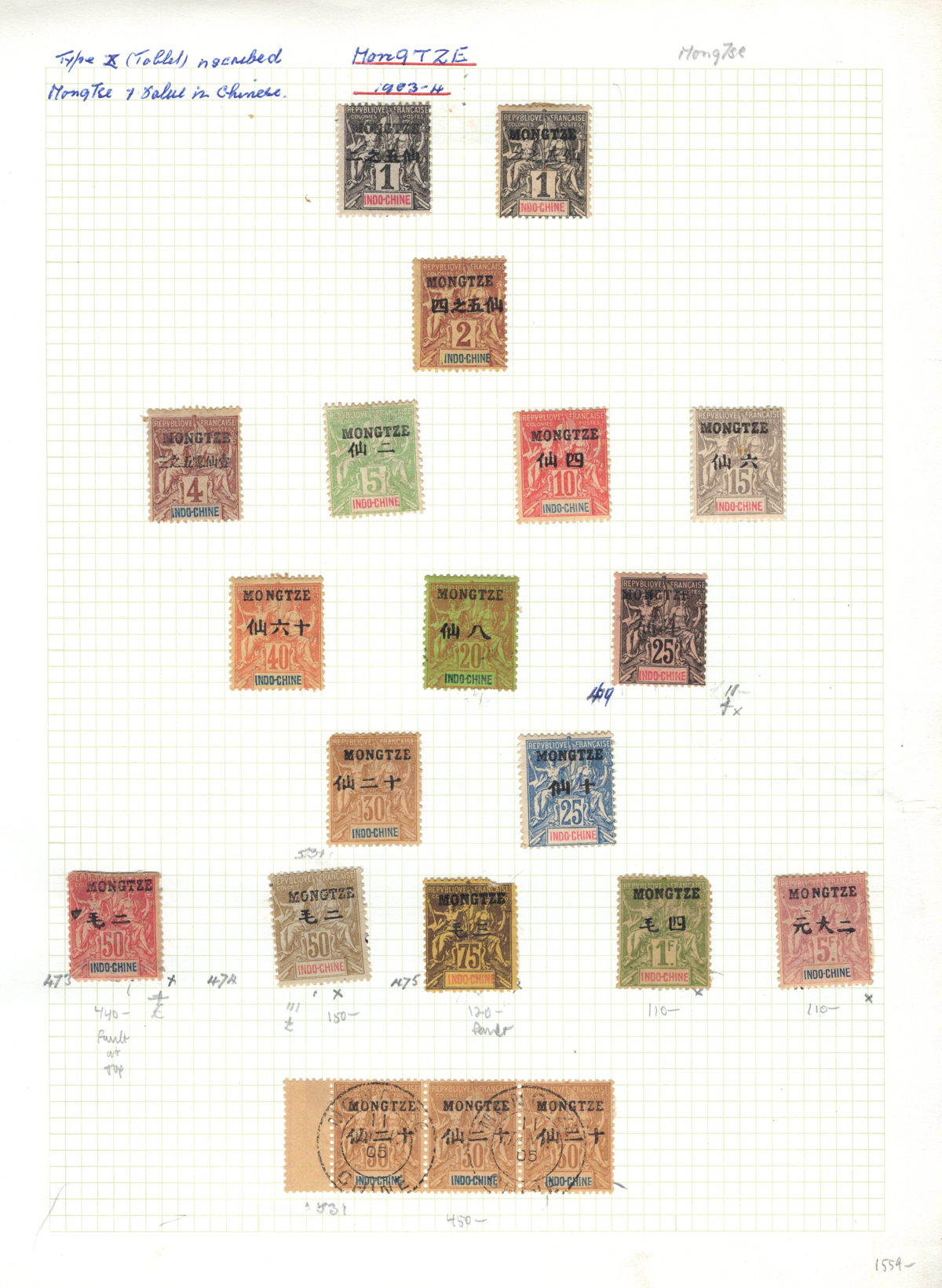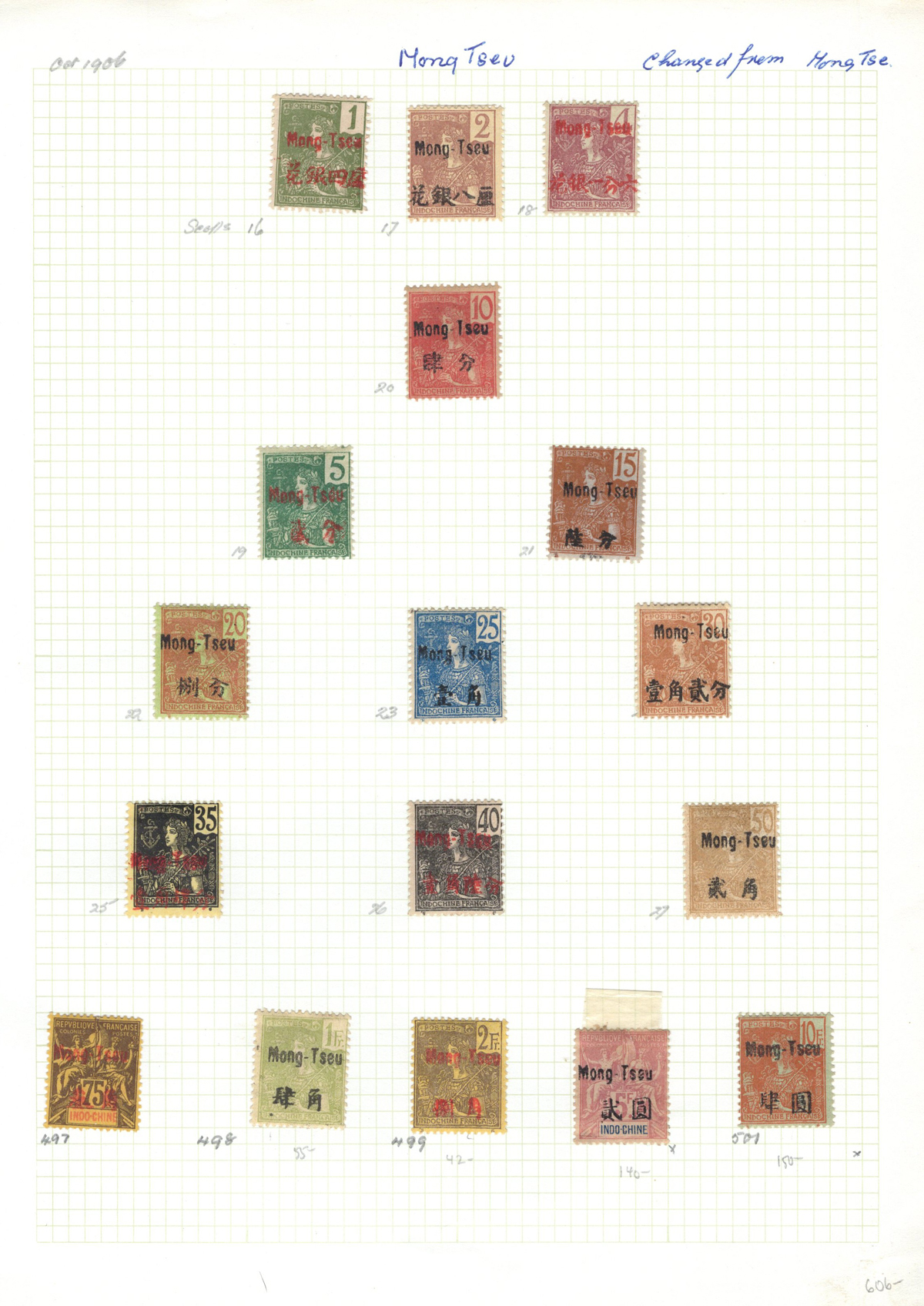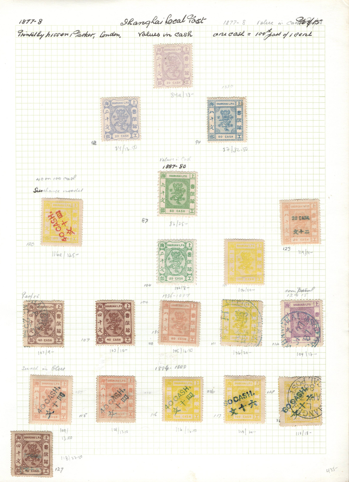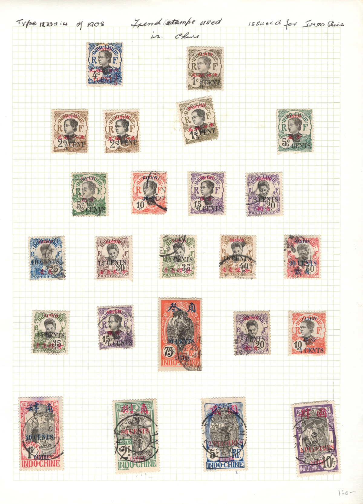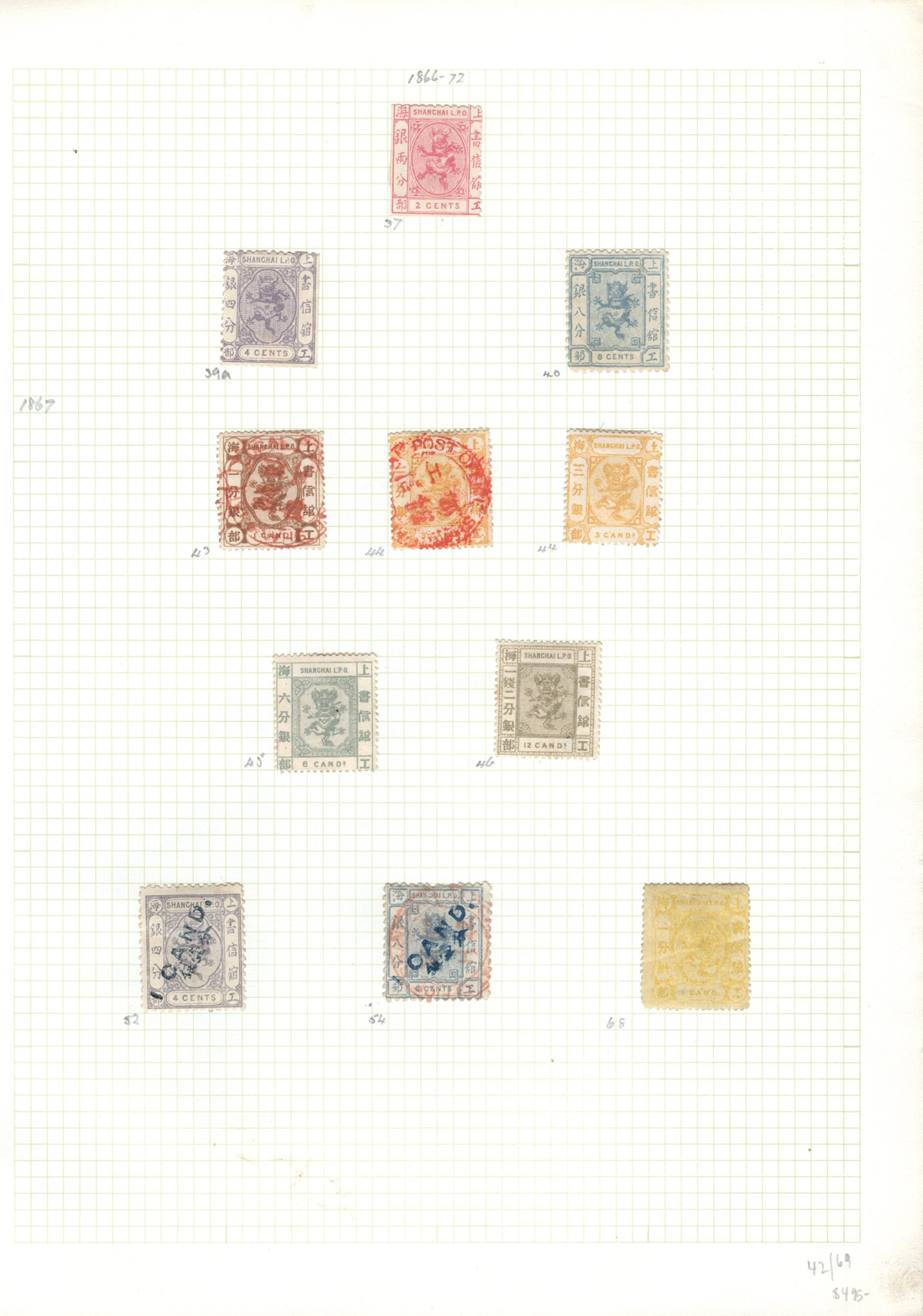 652 O/og/nh   imageValuable Old Time Extensive Collection of Offices in China, Shanghai and Chinese Local Post Office Issues, etc., carefully assembled and displayed on 55 quadrille pages, by a collector who lived in Hong Kong from the 1930s to the 1950s. A tremendously interesting collection, loaded with material not often seen. We noted a page of Italian Offices ($365), page of British Offices ($789), 11 pages of Shanghai Locals ($2,629), page of Yunnan-Fou overprints ($913), many pages of overprinted Indo-China issues including from Mongtseu ($346), Mong-Tseu ($606), a page of Mongtze overprint errors (€1,328 in Yvert Colonies catalogue), Mongtze #13 strip of 5 ($650), another page of Mongtze overprints ($1,559), 2 pages of French Colonies issues for China ($391), page of Hankow Local issues ($652), Nanking Local Post #1-15 ($381), also stamps from Foochow, Chungking, Chefoo ($357), Chinkiang, 2 pages of Amoy issues ($533), 2 pages of German Offices ($485), and more, including a few stationery cards (with staple holes). Very nice quality throughout, with many postmarks which should be of interest. The Scott catalogue value given assumes that all items are genuine, and does not include the pages either not counted, or counted in Euros using the Yvert Colonies catalogue. All pages have been scanned online. A great opportunity to acquire such an interesting and intact collection. (Scan 1) (Scan 2) (Scan 3) (Scan 4) (Scan 5) (Scan 6) (Scan 7) (Scan 8) (Scan 9) (Scan 10) (Scan 11) (Scan 12) (Scan 13) (Scan 14) (Scan 15) (Scan 16) (Scan 17) (Scan 18) (Scan 19) (Scan 20) (Scan 21) (Scan 22) (Scan 23) (Scan 24) (Scan 25) (Scan 26) (Scan 27) (Scan 28) (Scan 29) (Scan 30) (Scan 31) (Scan 32) (Scan 33) (Scan 34) (Scan 35) (Scan 36) (Scan 37) (Scan 38) (Scan 39) (Scan 40) (Scan 41) (Scan 42) (Scan 43) (Scan 44) (Scan 45) (Scan 46) (Scan 47) (Scan 48) (Scan 49) (Scan 50) (Scan 51) (Scan 52) (Scan 53) (Scan 54) (Scan 55) (All Scans) (All Images)