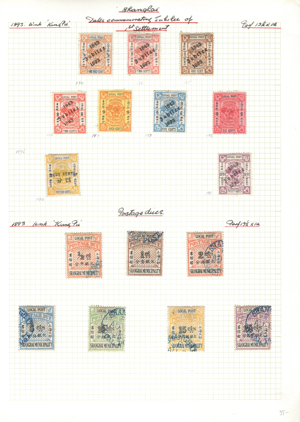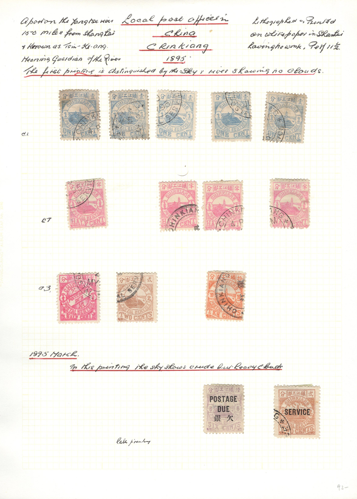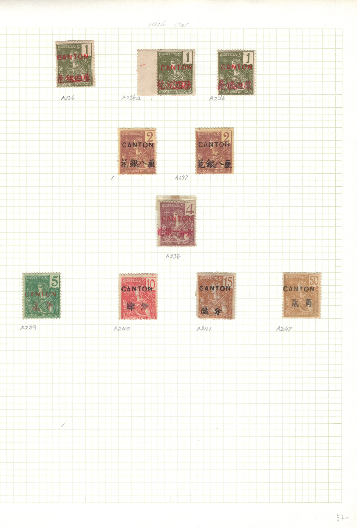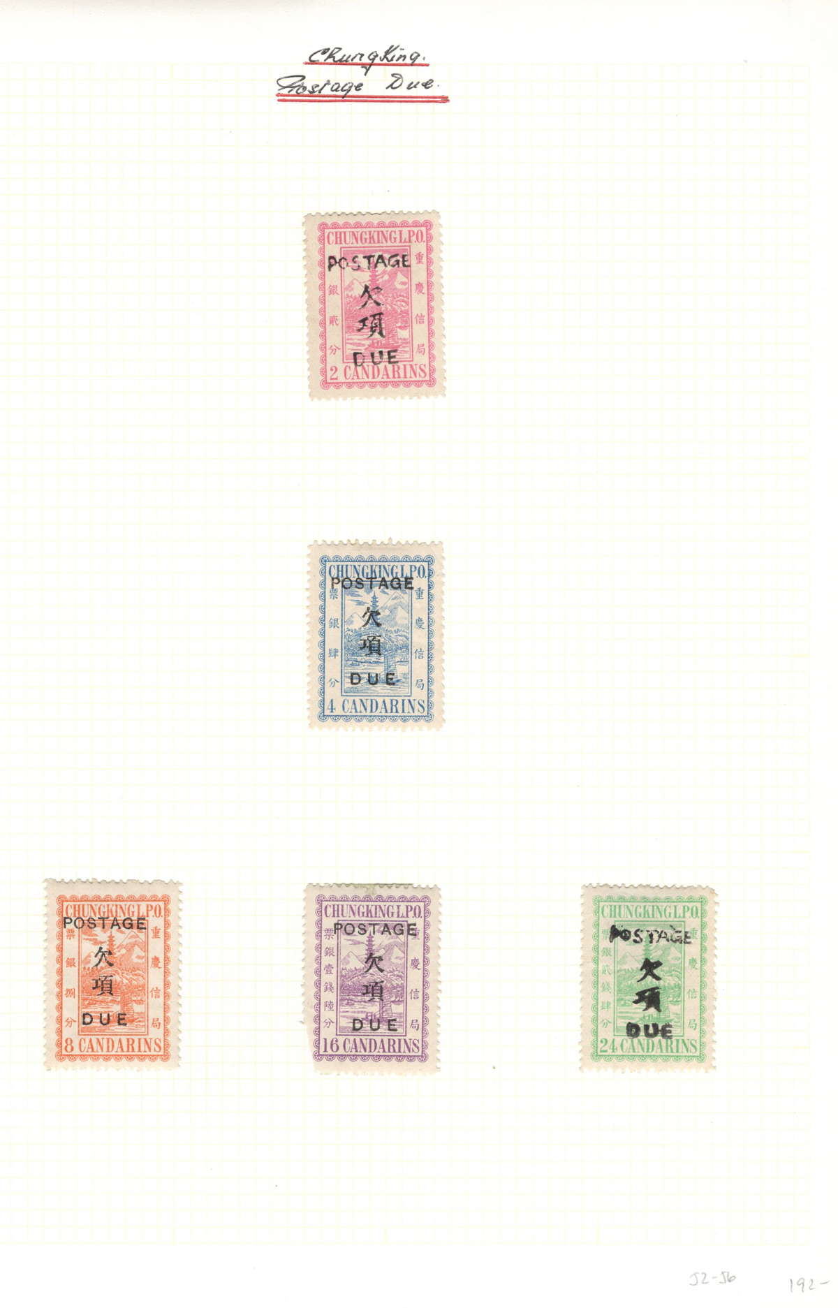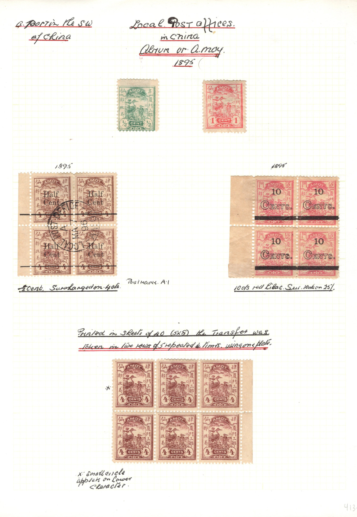 652 O/og/nh   imageValuable Old Time Extensive Collection of Offices in China, Shanghai and Chinese Local Post Office Issues, etc., carefully assembled and displayed on 55 quadrille pages, by a collector who lived in Hong Kong from the 1930s to the 1950s. A tremendously interesting collection, loaded with material not often seen. We noted a page of Italian Offices ($365), page of British Offices ($789), 11 pages of Shanghai Locals ($2,629), page of Yunnan-Fou overprints ($913), many pages of overprinted Indo-China issues including from Mongtseu ($346), Mong-Tseu ($606), a page of Mongtze overprint errors (€1,328 in Yvert Colonies catalogue), Mongtze #13 strip of 5 ($650), another page of Mongtze overprints ($1,559), 2 pages of French Colonies issues for China ($391), page of Hankow Local issues ($652), Nanking Local Post #1-15 ($381), also stamps from Foochow, Chungking, Chefoo ($357), Chinkiang, 2 pages of Amoy issues ($533), 2 pages of German Offices ($485), and more, including a few stationery cards (with staple holes). Very nice quality throughout, with many postmarks which should be of interest. The Scott catalogue value given assumes that all items are genuine, and does not include the pages either not counted, or counted in Euros using the Yvert Colonies catalogue. All pages have been scanned online. A great opportunity to acquire such an interesting and intact collection. (Scan 1) (Scan 2) (Scan 3) (Scan 4) (Scan 5) (Scan 6) (Scan 7) (Scan 8) (Scan 9) (Scan 10) (Scan 11) (Scan 12) (Scan 13) (Scan 14) (Scan 15) (Scan 16) (Scan 17) (Scan 18) (Scan 19) (Scan 20) (Scan 21) (Scan 22) (Scan 23) (Scan 24) (Scan 25) (Scan 26) (Scan 27) (Scan 28) (Scan 29) (Scan 30) (Scan 31) (Scan 32) (Scan 33) (Scan 34) (Scan 35) (Scan 36) (Scan 37) (Scan 38) (Scan 39) (Scan 40) (Scan 41) (Scan 42) (Scan 43) (Scan 44) (Scan 45) (Scan 46) (Scan 47) (Scan 48) (Scan 49) (Scan 50) (Scan 51) (Scan 52) (Scan 53) (Scan 54) (Scan 55) (All Scans) (All Images)