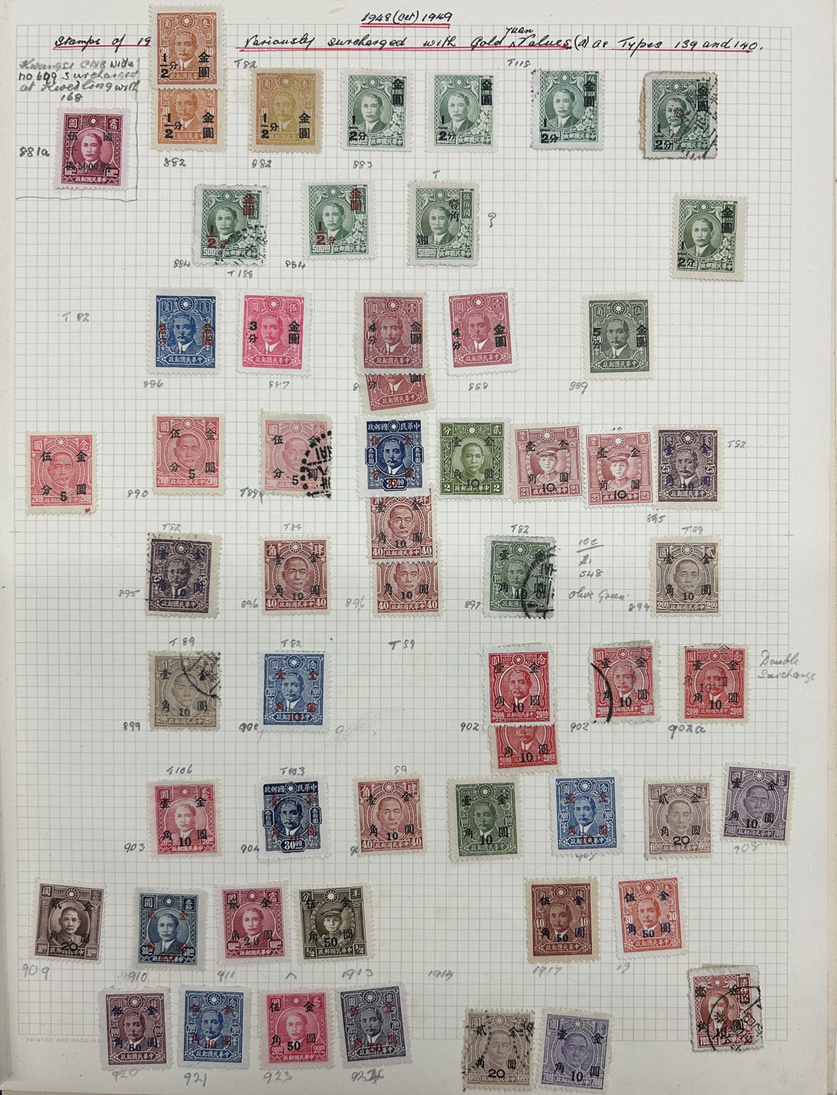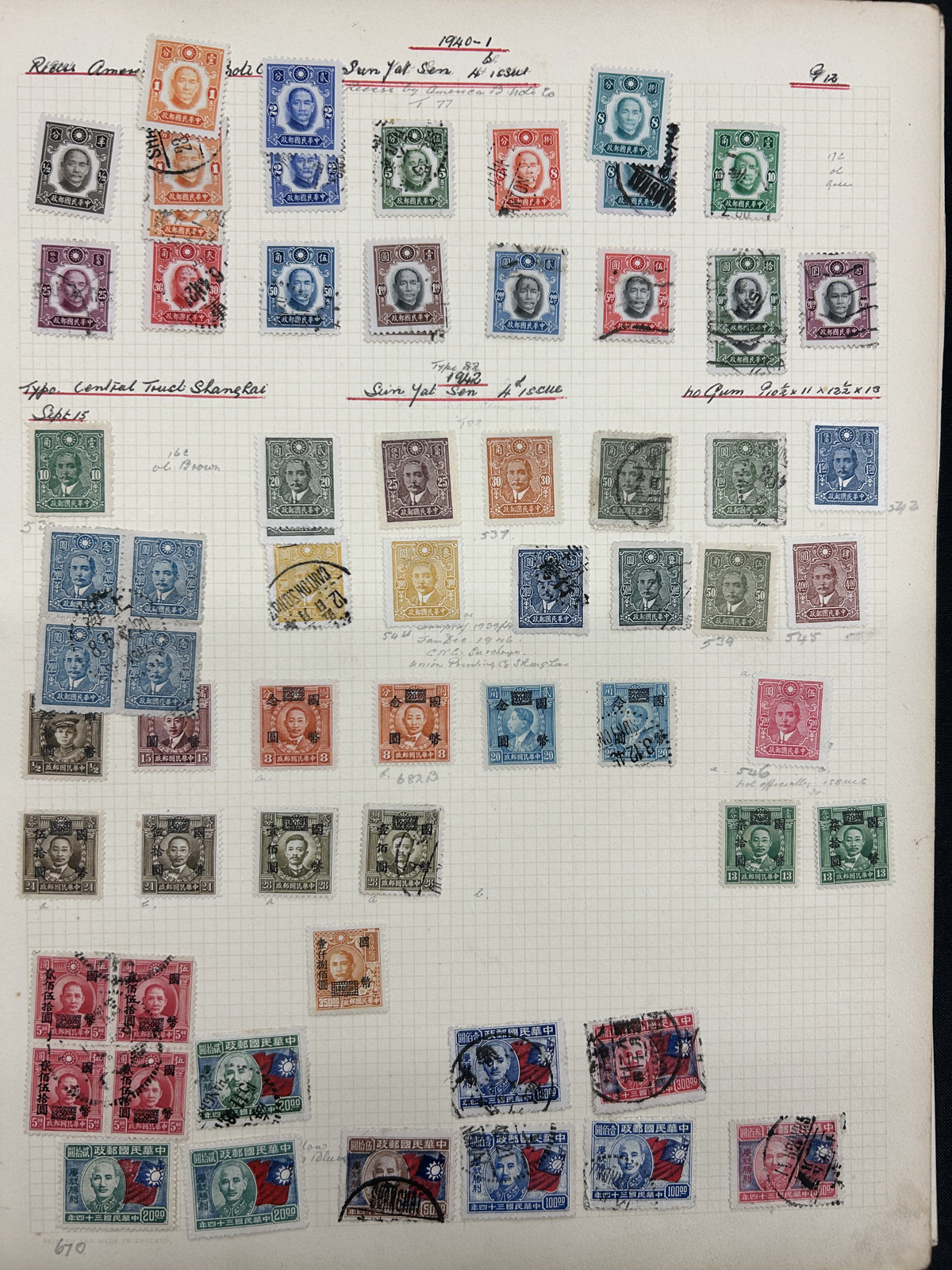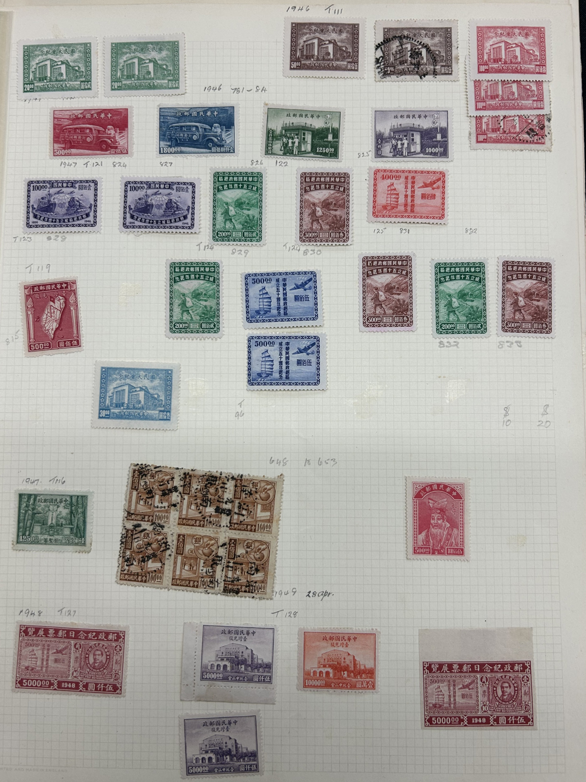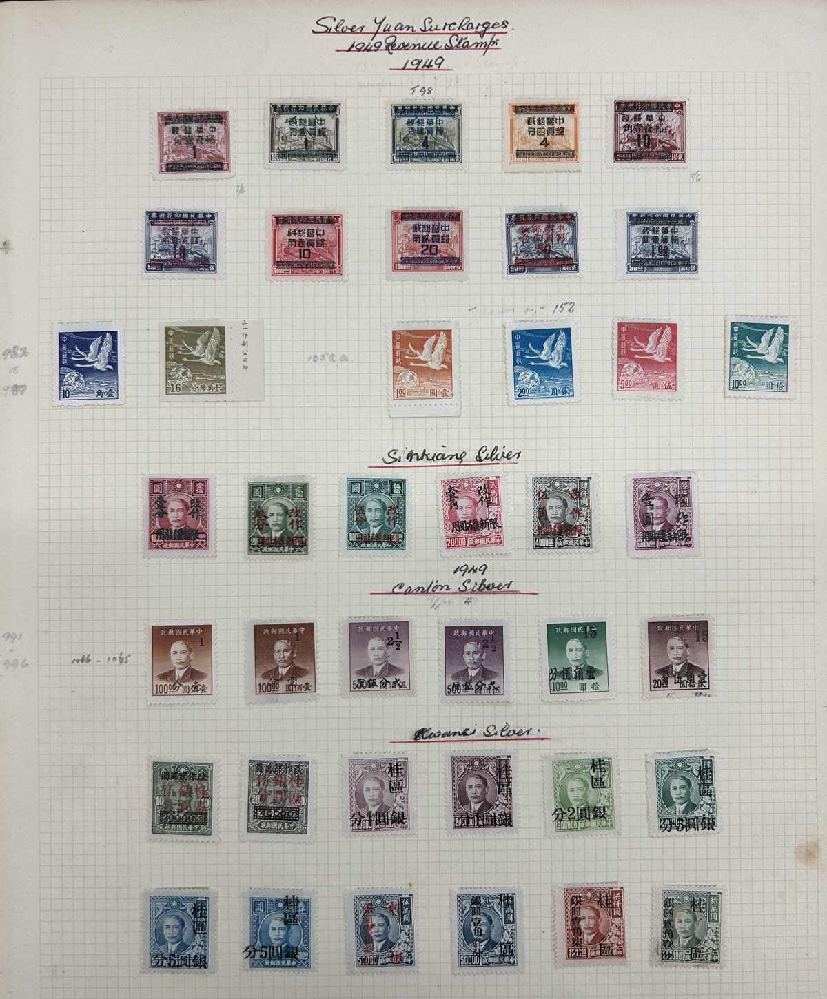 651 O/og   imageOld Time Collection of China, Republic of China and Provinces, 1898 to 1950, with about 1,500 stamps mounted on 37 large plus 23 small pages. The collection contains many complete sets of regular and overprinted stamps, in a mix of mint and used, plus some blocks of four or larger, as well as some back of the book including three Officially Sealed labels and a few pages of Airmail sets. The collector used a variety of hinges, including some old thick ones that tend to remain on the stamps when removed from the pages, else an overall fine collection with fresh colours. A very useful collection for the dedicated collector, should easily be worth our estimate. See photos for a glance of the contents. (Scan 1) (Scan 2) (Scan 3) (Scan 4) (Scan 5) (Scan 6) (Scan 7) (Scan 8) (Scan 9) (Scan 10) (Scan 11) (Scan 12) (Scan 13) (Scan 14) (Scan 15) (Scan 16) (Scan 17) (Scan 18) (Scan 19) (Scan 20) (Scan 21) (Scan 22) (Scan 23) (Scan 24) (Scan 25) (Scan 26) (Scan 27) (All Scans) (All Images)