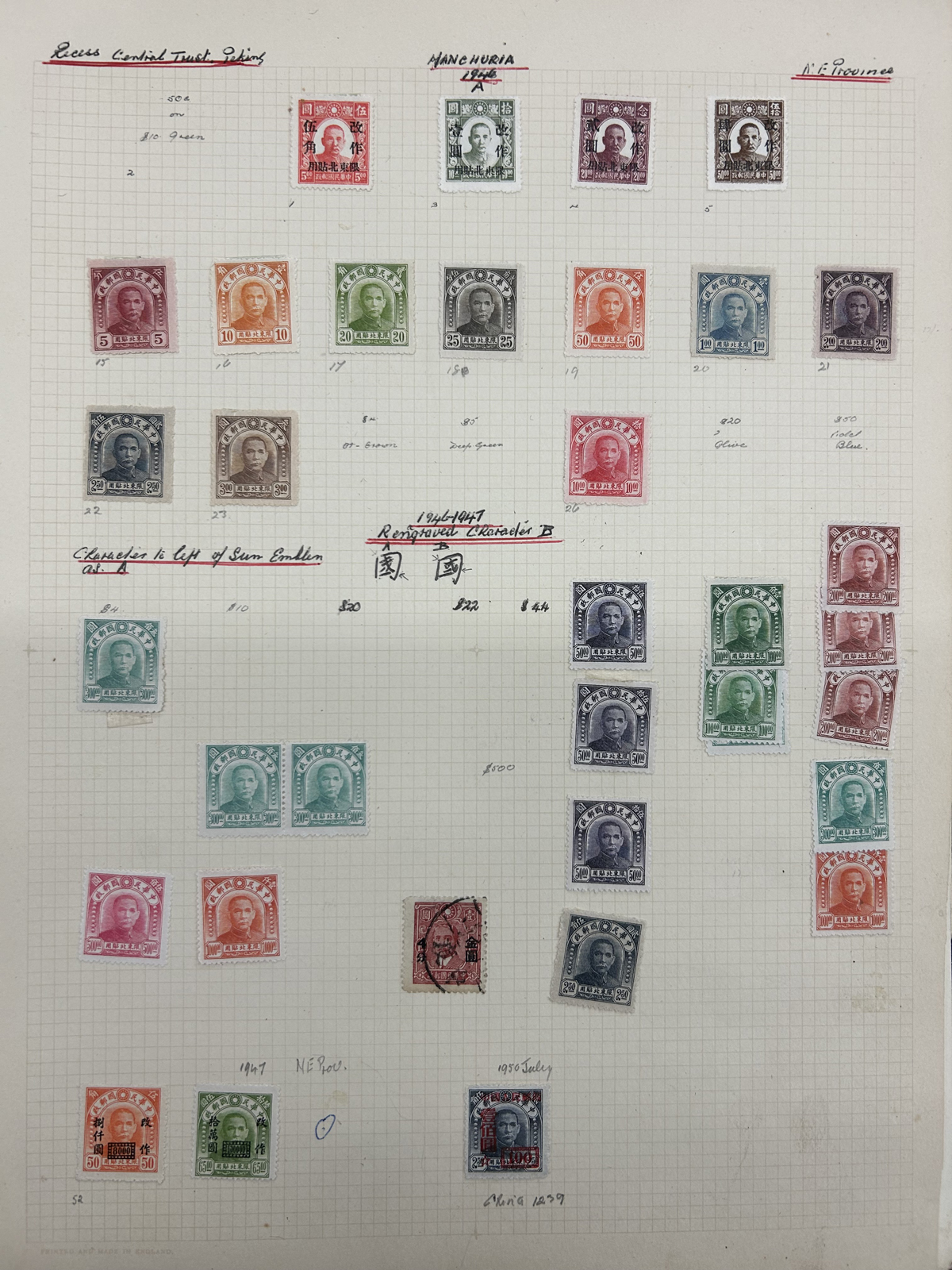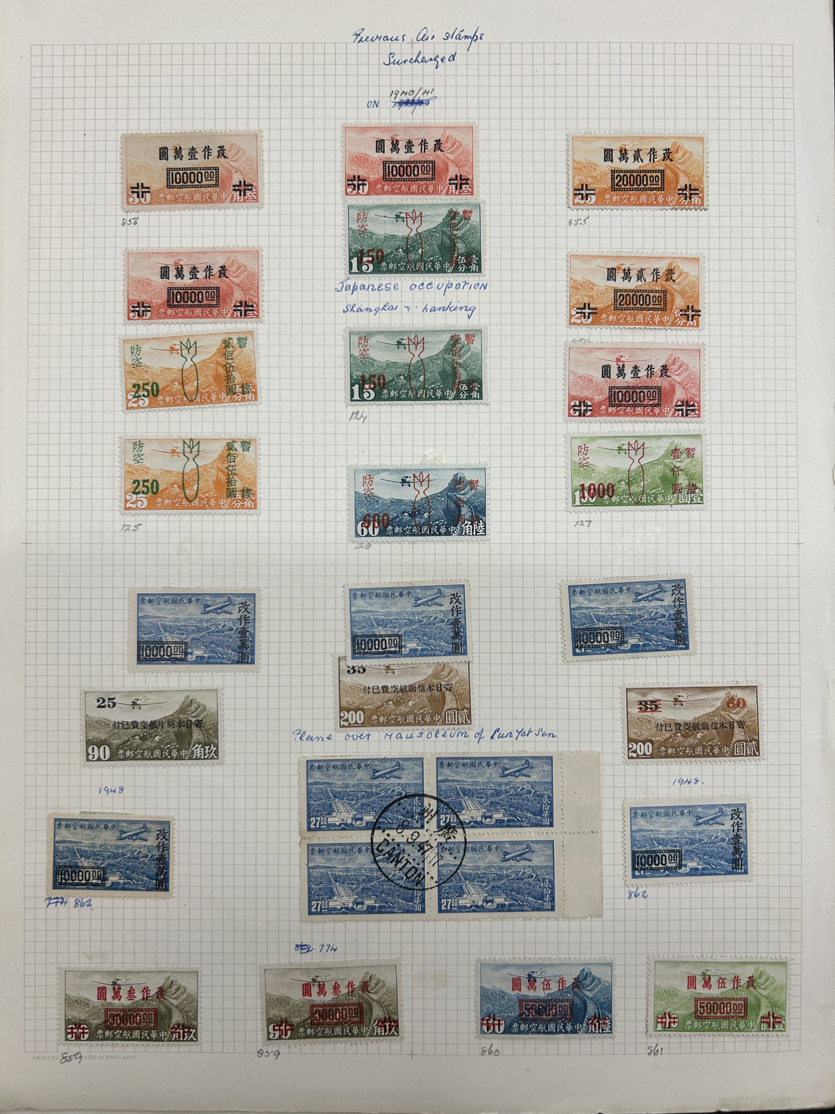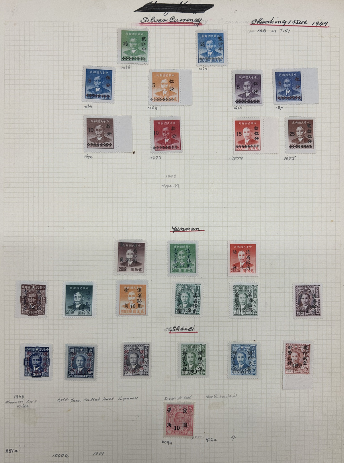 651 O/og   imageOld Time Collection of China, Republic of China and Provinces, 1898 to 1950, with about 1,500 stamps mounted on 37 large plus 23 small pages. The collection contains many complete sets of regular and overprinted stamps, in a mix of mint and used, plus some blocks of four or larger, as well as some back of the book including three Officially Sealed labels and a few pages of Airmail sets. The collector used a variety of hinges, including some old thick ones that tend to remain on the stamps when removed from the pages, else an overall fine collection with fresh colours. A very useful collection for the dedicated collector, should easily be worth our estimate. See photos for a glance of the contents. (Scan 1) (Scan 2) (Scan 3) (Scan 4) (Scan 5) (Scan 6) (Scan 7) (Scan 8) (Scan 9) (Scan 10) (Scan 11) (Scan 12) (Scan 13) (Scan 14) (Scan 15) (Scan 16) (Scan 17) (Scan 18) (Scan 19) (Scan 20) (Scan 21) (Scan 22) (Scan 23) (Scan 24) (Scan 25) (Scan 26) (Scan 27) (All Scans) (All Images)