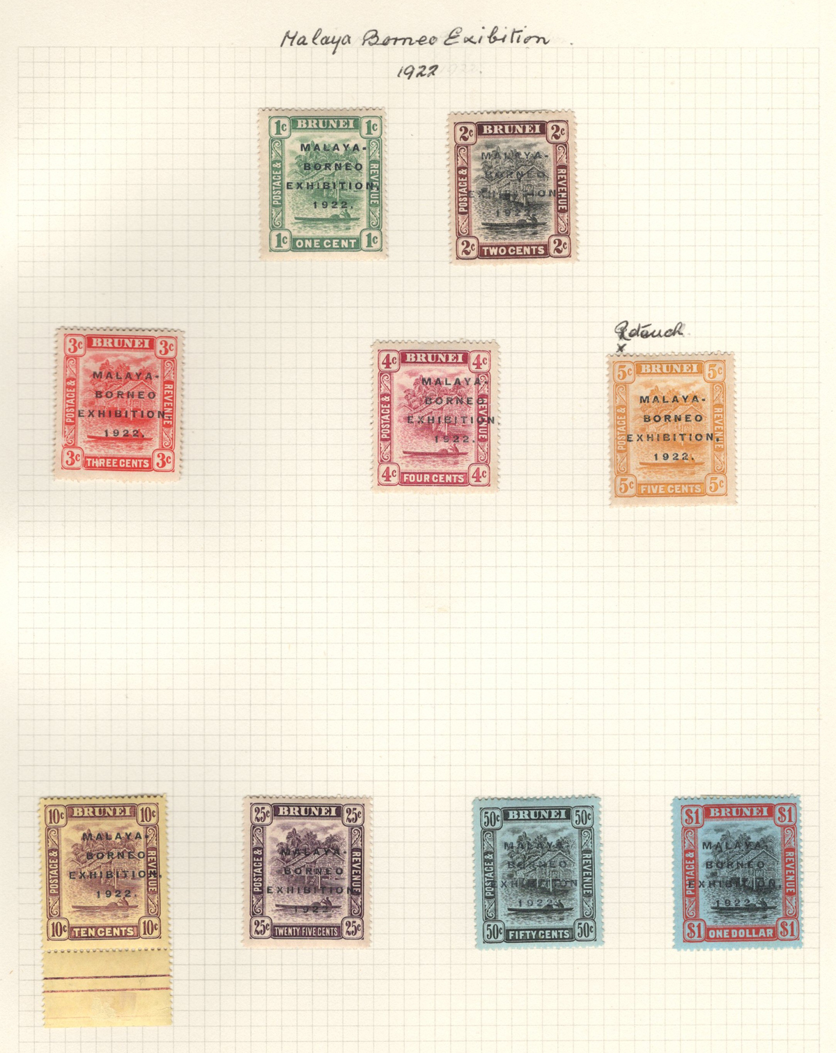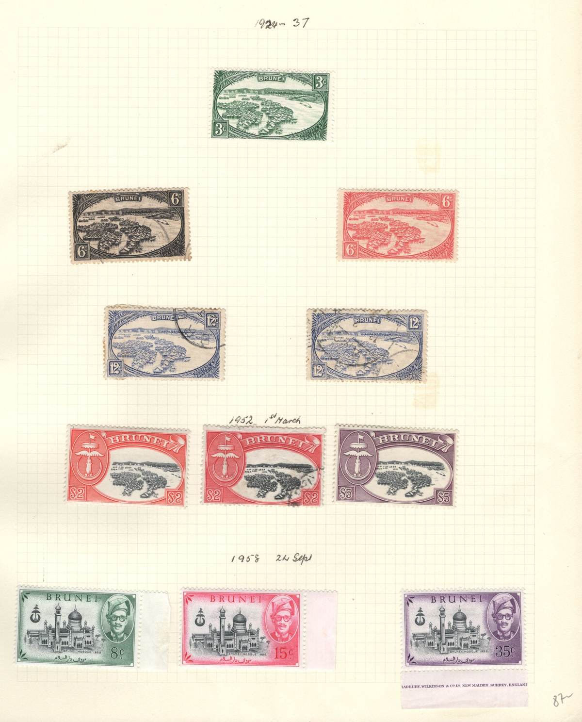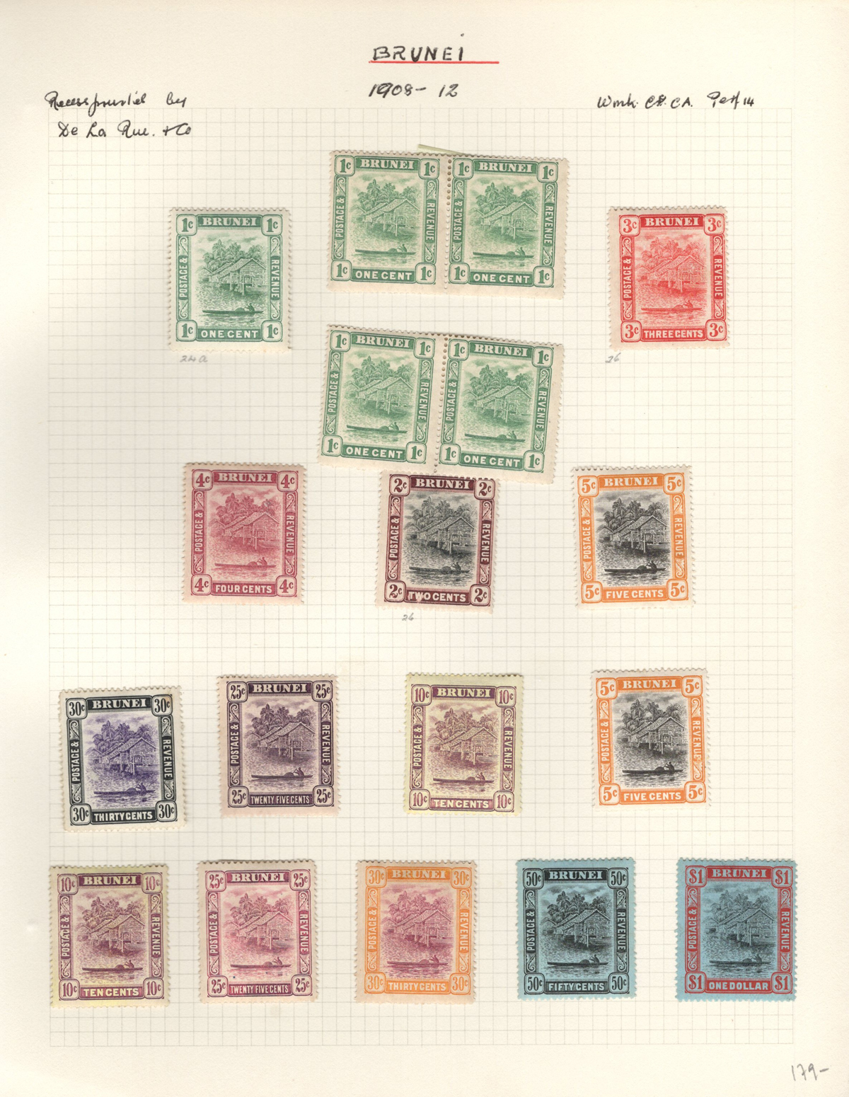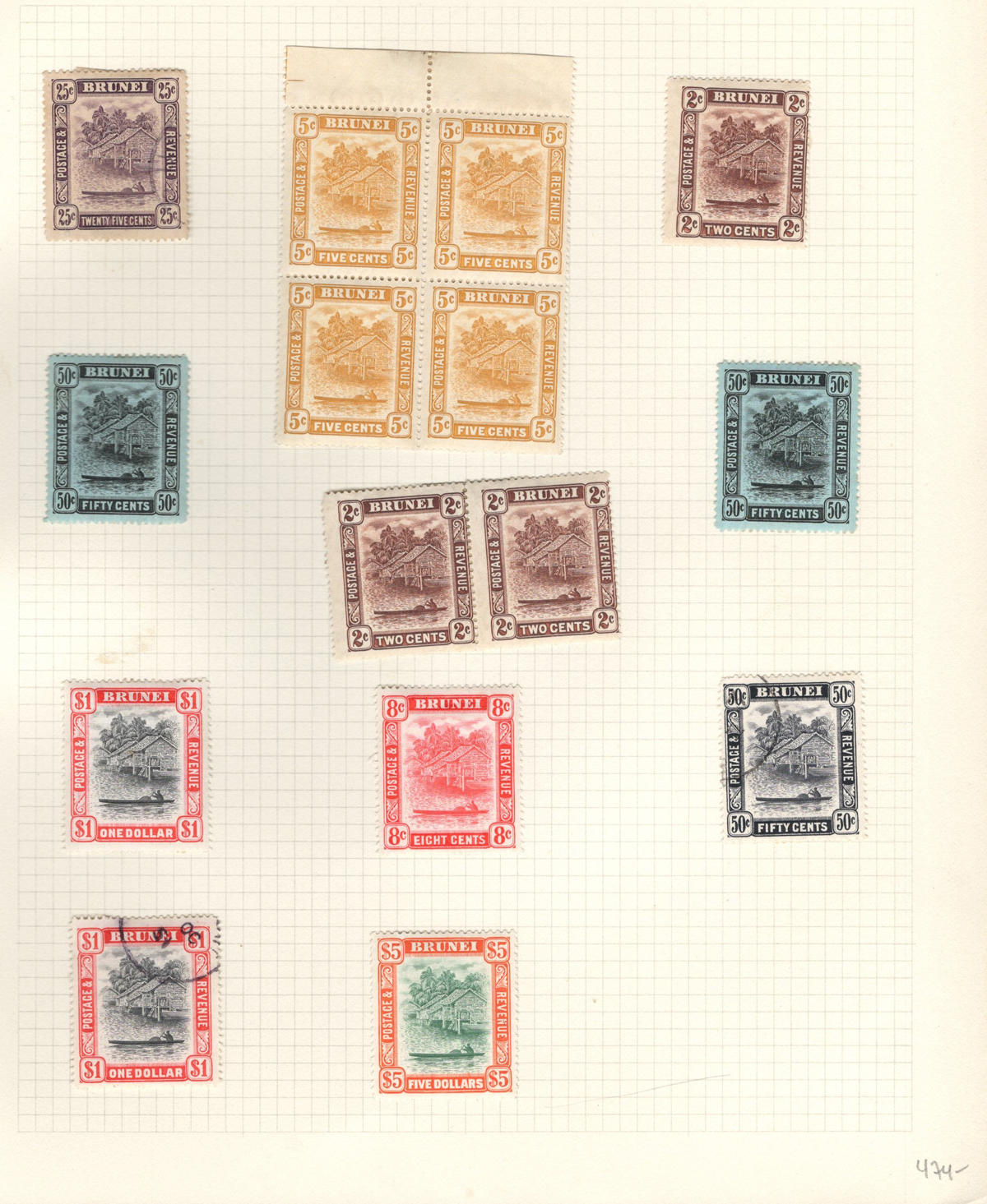 647 O/og   imageOld Time Collection of Mint and Used Brunei, 1906-1958, mounted on 12 quadrille pages, showing most issues in period in mint, with some used added here and there. We note many complete sets, pairs, blocks, extra shades, some duplication, and more, with several high value items throughout, such as #s 14B-37A (two mint sets @ $242 each), and many more. Some of the Scene on Brunei River issues are mixed (some values are mounted on the incorrect pages), still lots of useful material here, generally with bright colours and fine to very fine. All pages scanned online. (Scan 1) (Scan 2) (Scan 3) (Scan 4) (Scan 5) (Scan 6) (Scan 7) (Scan 8) (Scan 9) (Scan 10) (Scan 11) (Scan 12) (All Scans) (All Images)