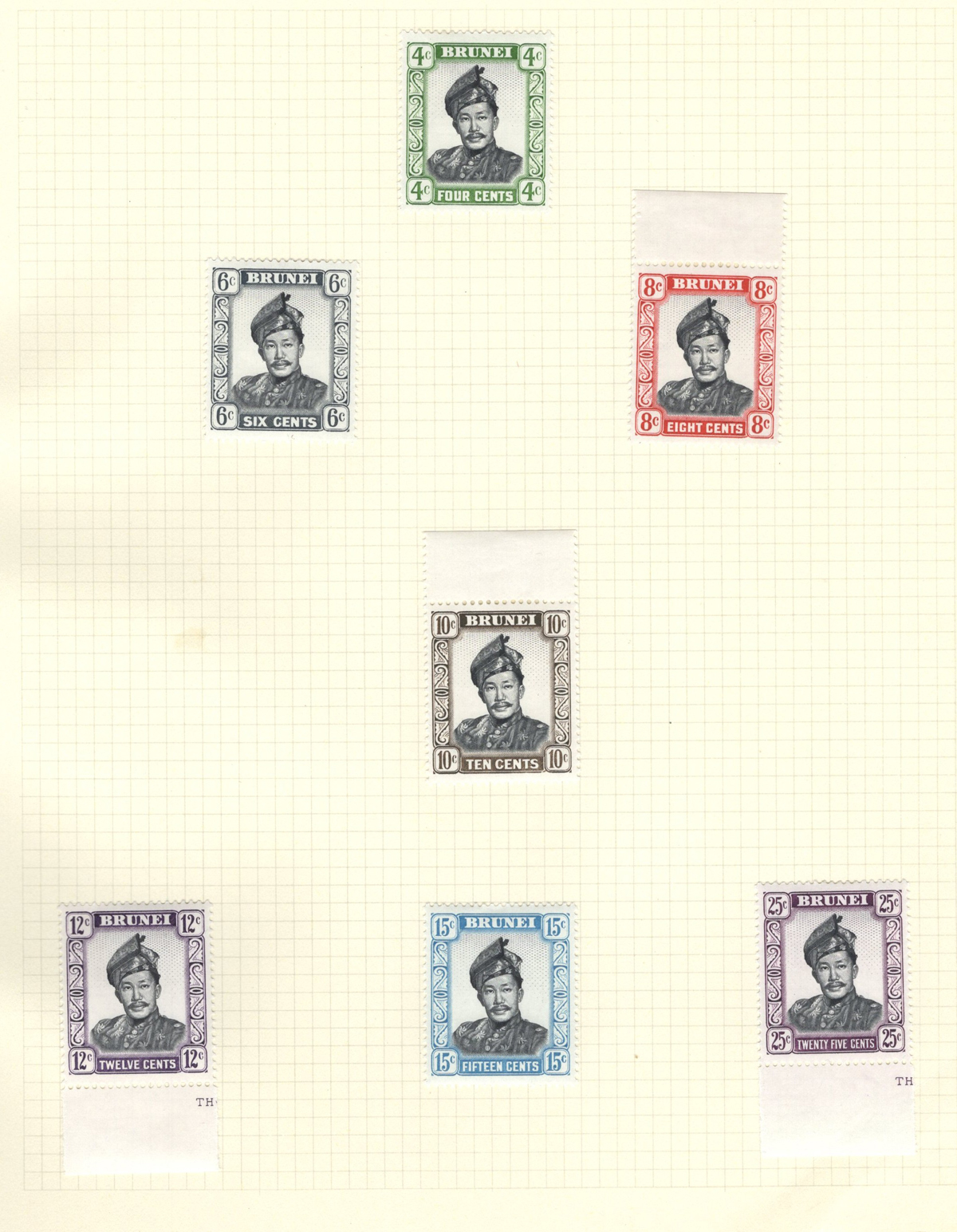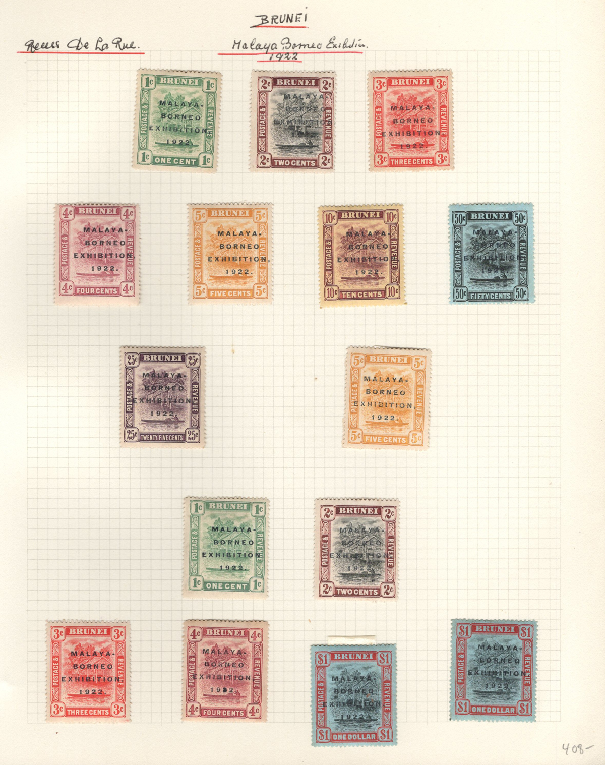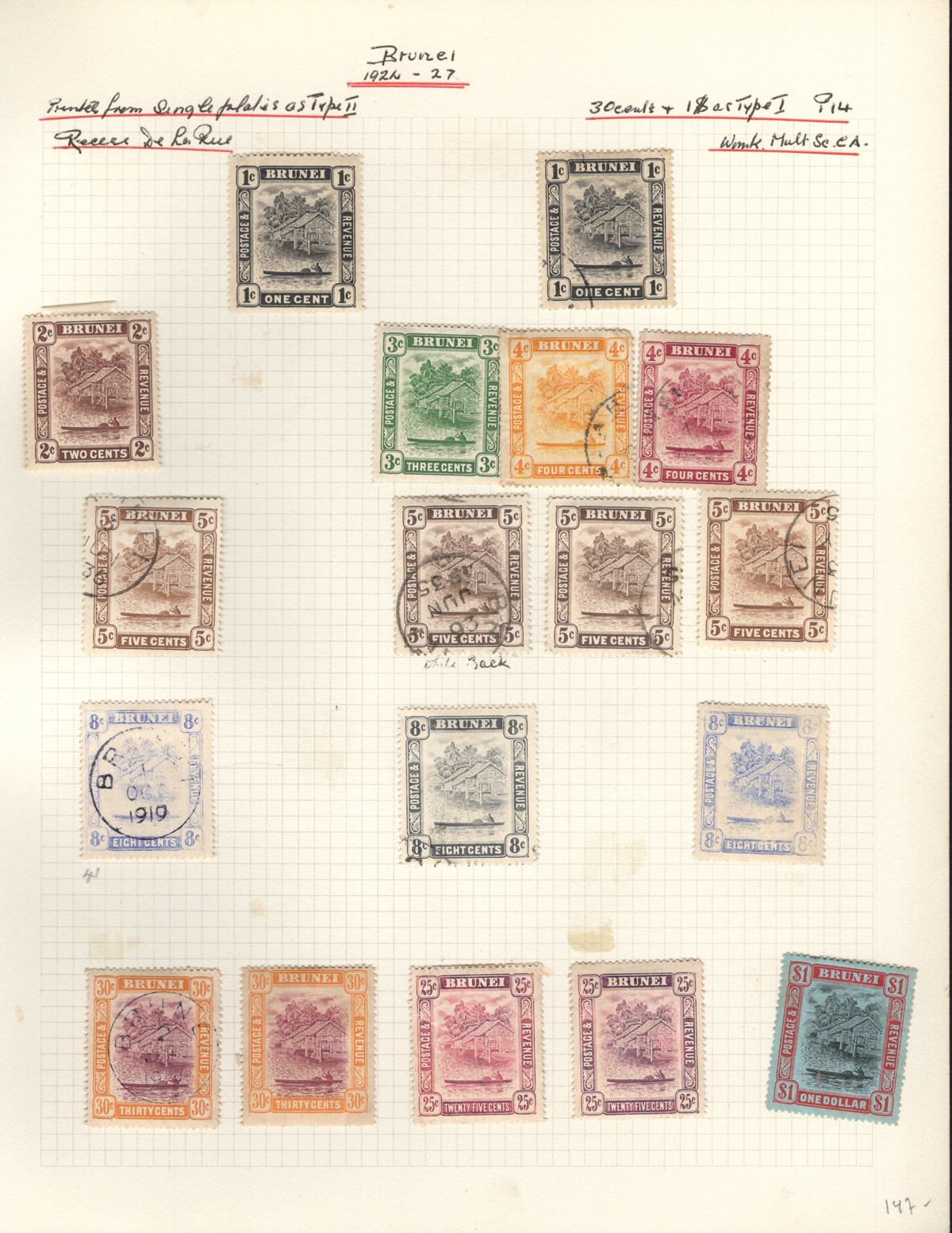 647 O/og   imageOld Time Collection of Mint and Used Brunei, 1906-1958, mounted on 12 quadrille pages, showing most issues in period in mint, with some used added here and there. We note many complete sets, pairs, blocks, extra shades, some duplication, and more, with several high value items throughout, such as #s 14B-37A (two mint sets @ $242 each), and many more. Some of the Scene on Brunei River issues are mixed (some values are mounted on the incorrect pages), still lots of useful material here, generally with bright colours and fine to very fine. All pages scanned online. (Scan 1) (Scan 2) (Scan 3) (Scan 4) (Scan 5) (Scan 6) (Scan 7) (Scan 8) (Scan 9) (Scan 10) (Scan 11) (Scan 12) (All Scans) (All Images)