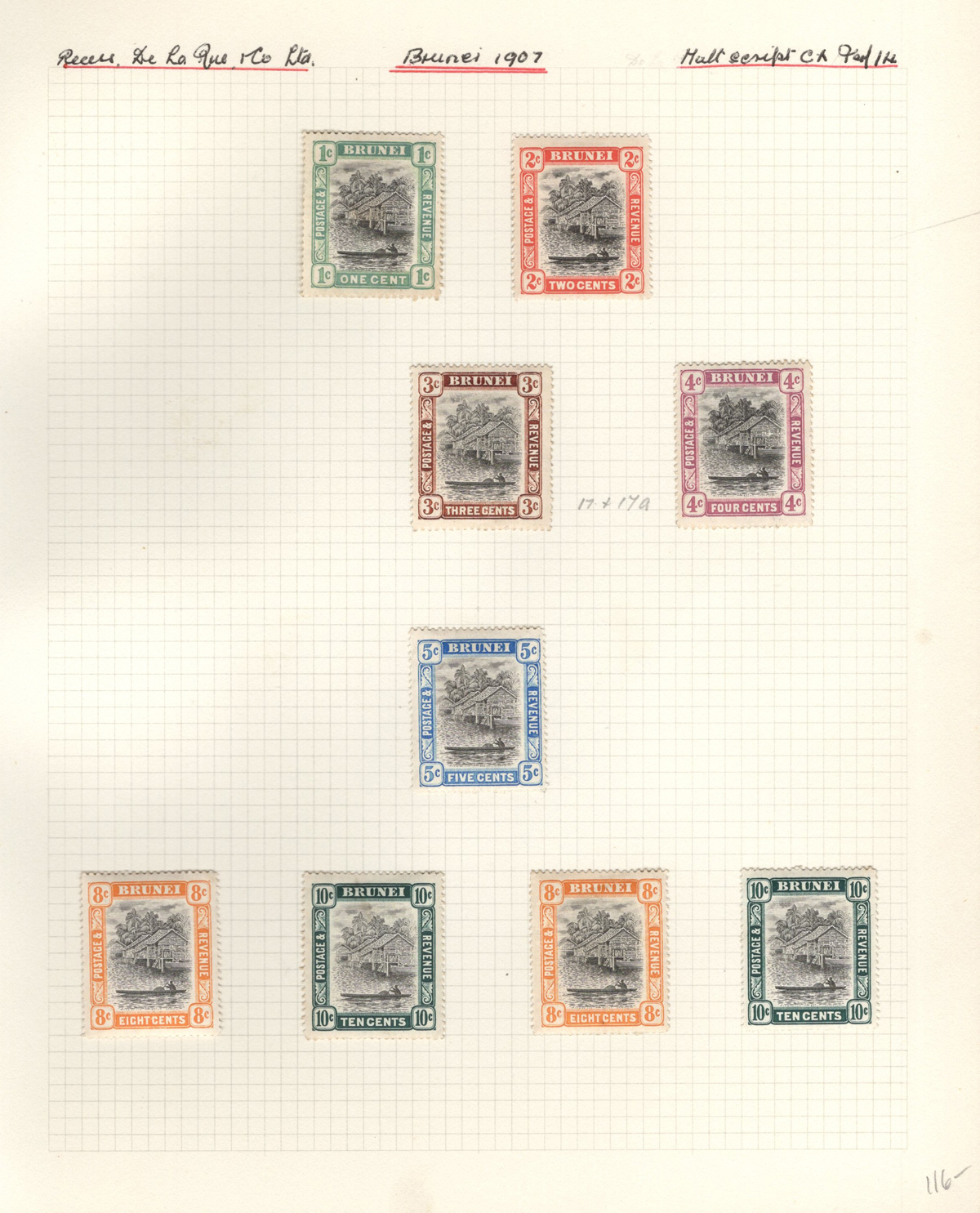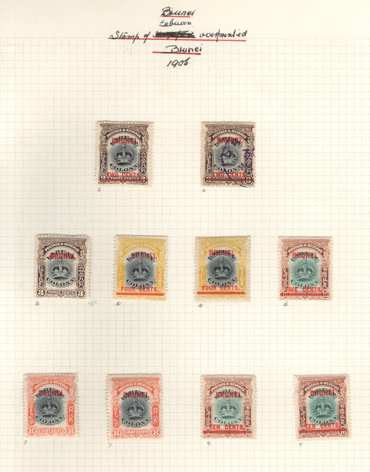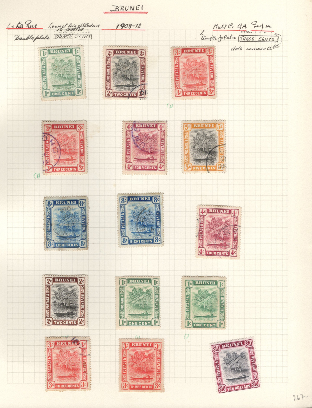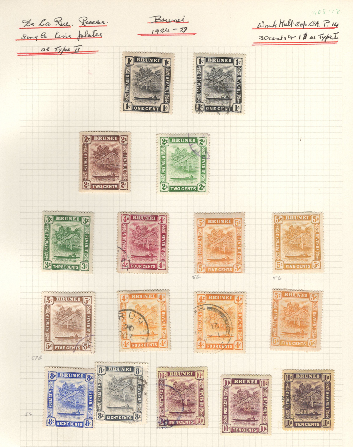647 O/og   imageOld Time Collection of Mint and Used Brunei, 1906-1958, mounted on 12 quadrille pages, showing most issues in period in mint, with some used added here and there. We note many complete sets, pairs, blocks, extra shades, some duplication, and more, with several high value items throughout, such as #s 14B-37A (two mint sets @ $242 each), and many more. Some of the Scene on Brunei River issues are mixed (some values are mounted on the incorrect pages), still lots of useful material here, generally with bright colours and fine to very fine. All pages scanned online. (Scan 1) (Scan 2) (Scan 3) (Scan 4) (Scan 5) (Scan 6) (Scan 7) (Scan 8) (Scan 9) (Scan 10) (Scan 11) (Scan 12) (All Scans) (All Images)