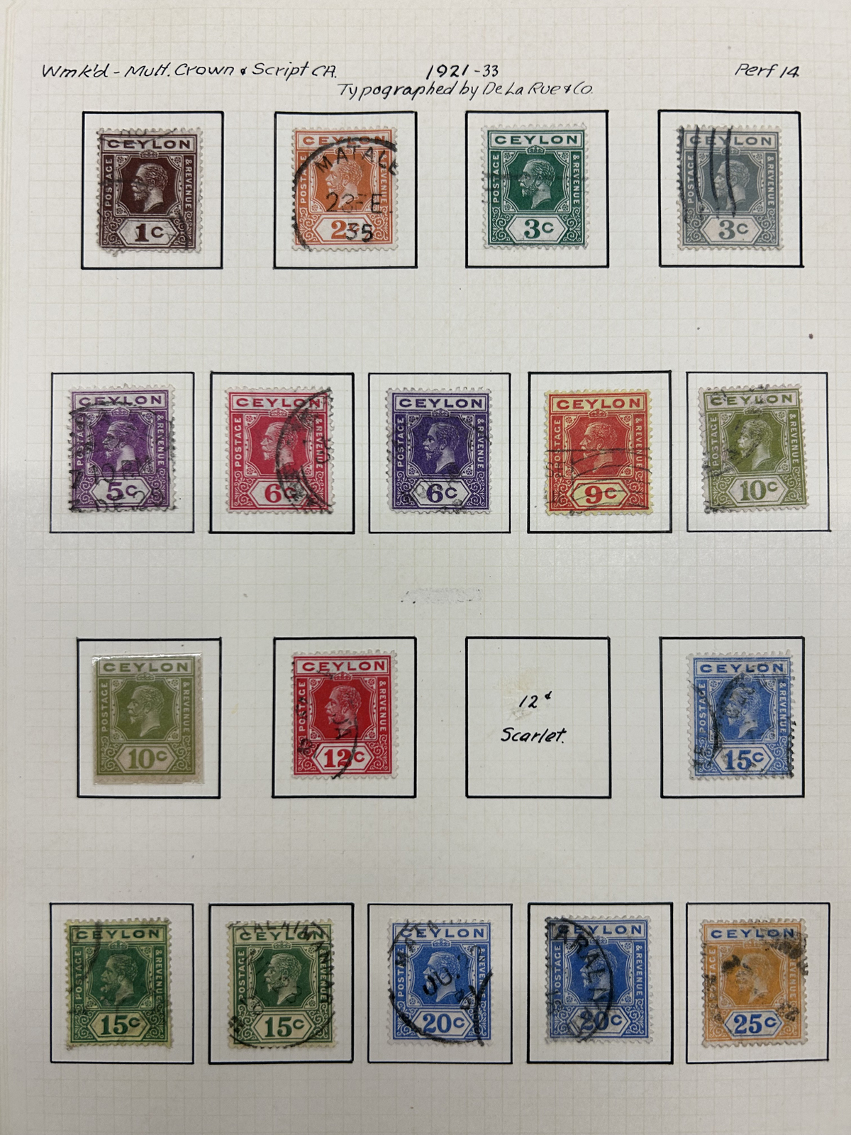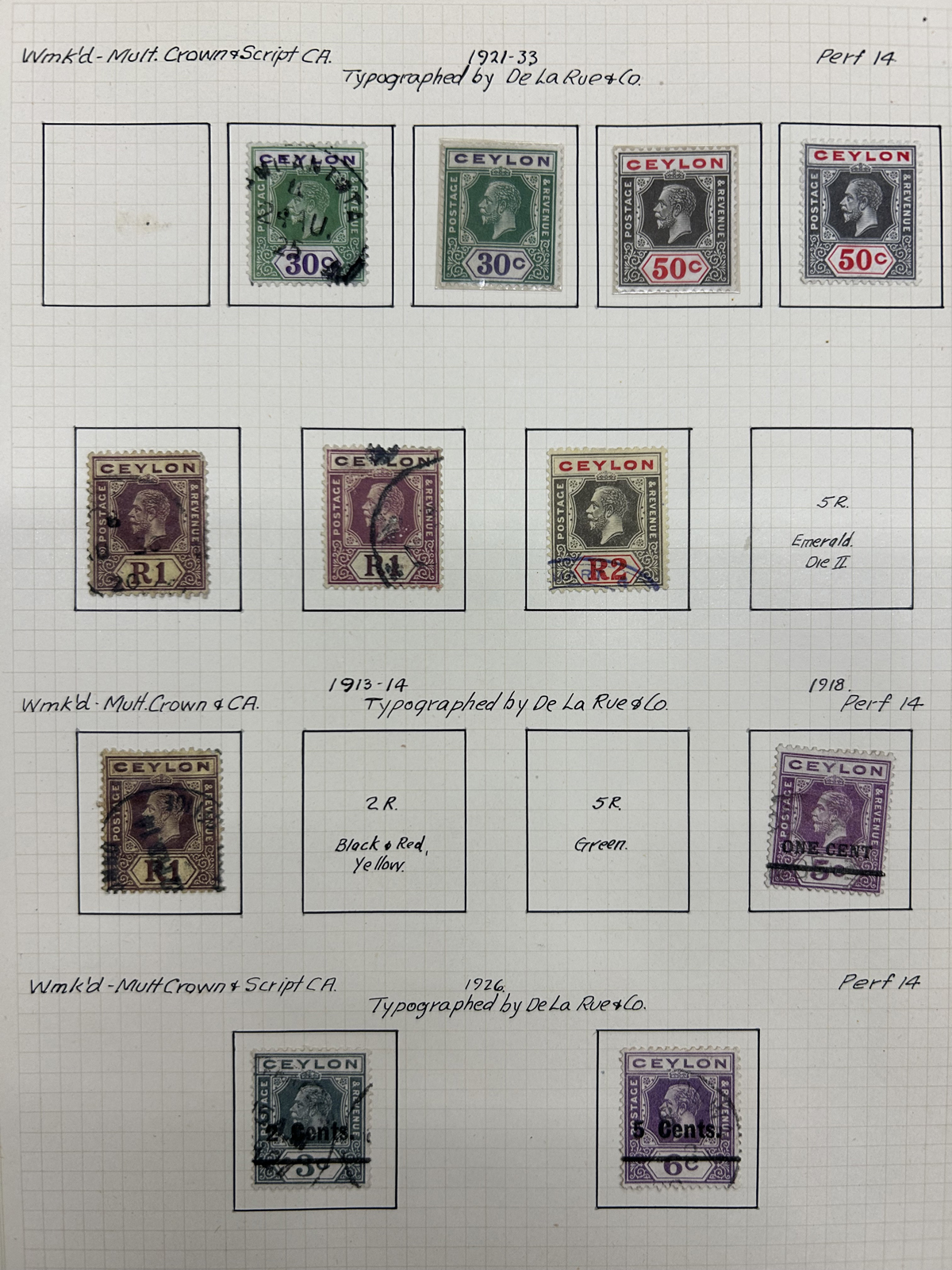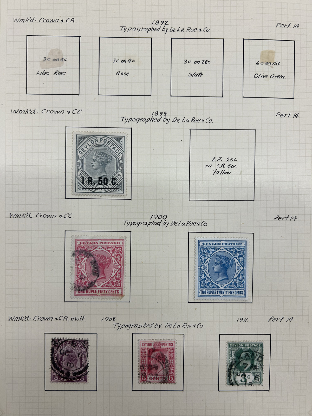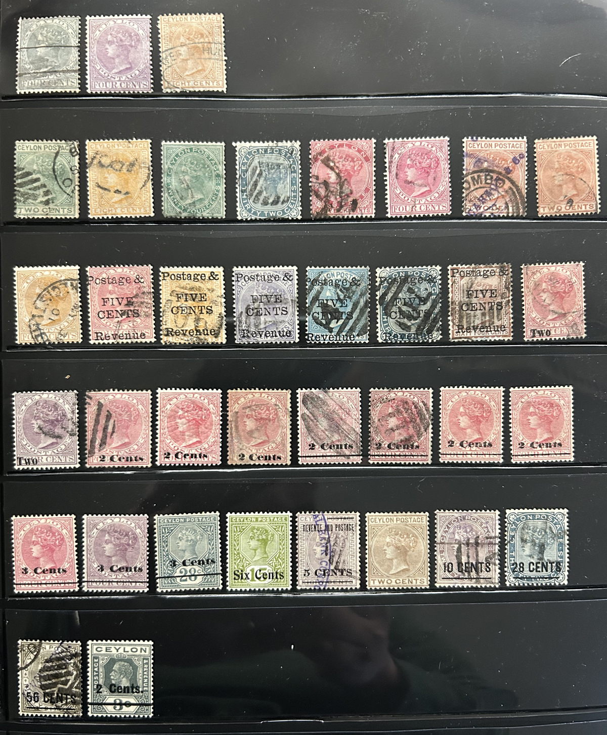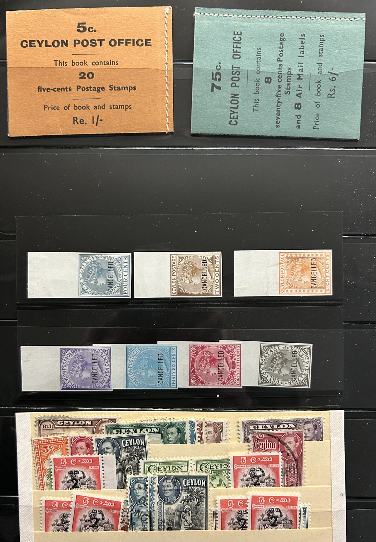 649 O/og/nh   imageCollection of Mint and Used Ceylon, 1872-1969, starts with an old time album of mint and used for the range of 1872-1969, with many better items, complete sets, etc., close to complete after QV era. (c.v. U$821 up to 1954 only). Also includes a page containing 37 QV surcharges and a few regular issues (in no particular order), mostly used and with a few better items, as well as a selection of Officials and War Tax (this page catalogues U$436) plus two stock pages containing 67 used revenue issues (unchecked for better items, etc.) and a few Scott album pages of duplicates (not counted). Rounding off the lot is a card containing what looks like early imperforate QV issue reprints (with CANCELLED overprint) and two complete booklets, one containing twenty 5c stamps (Scott 308) and the other containing eight 75c stamps plus 8 Airmail labels. An overall fine to very fine and useful lot. (Scan 1) (Scan 2) (Scan 3) (Scan 4) (Scan 5) (Scan 6) (Scan 7) (Scan 8) (Scan 9) (Scan 10) (Scan 11) (Scan 12) (Scan 13) (Scan 14) (Scan 15) (Scan 16) (Scan 17) (All Scans) (All Images)
