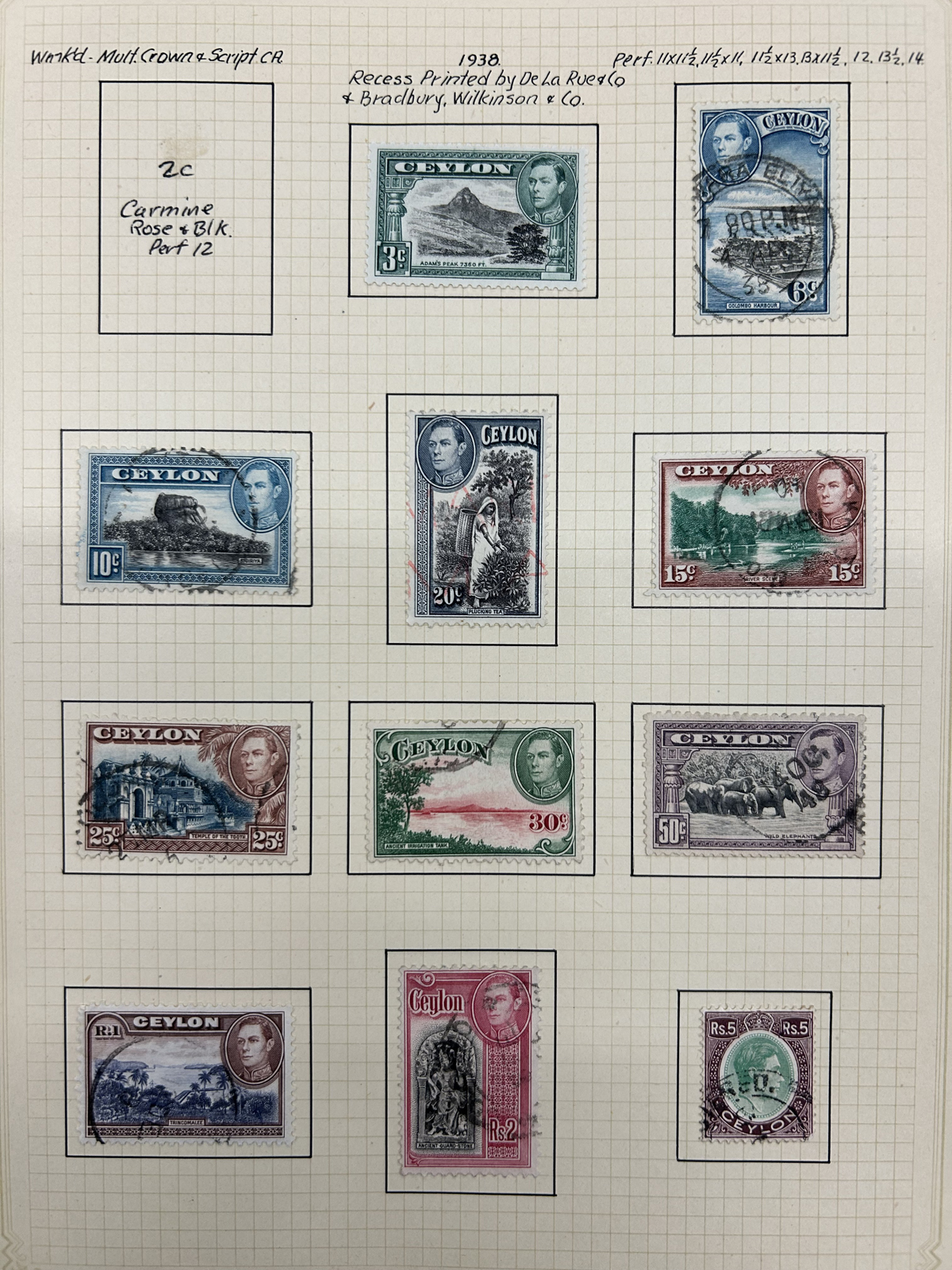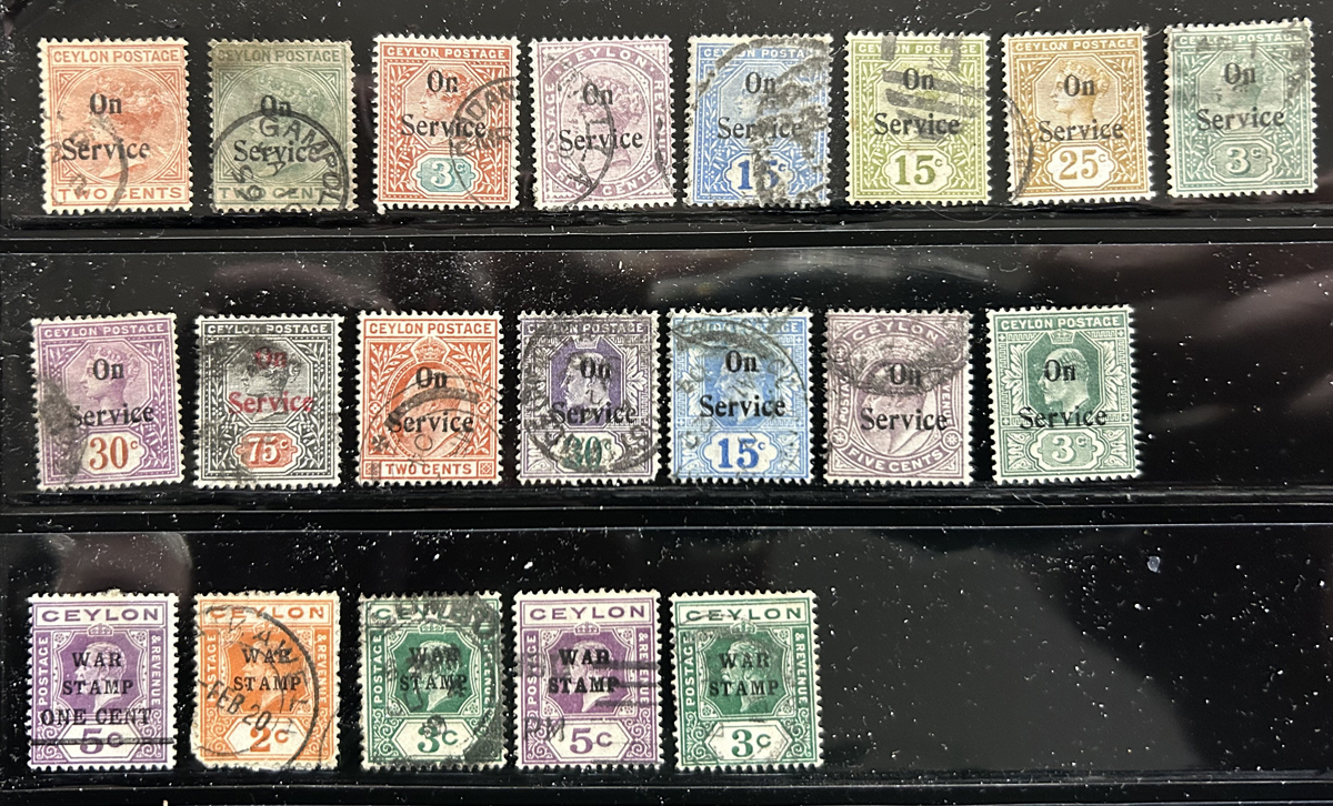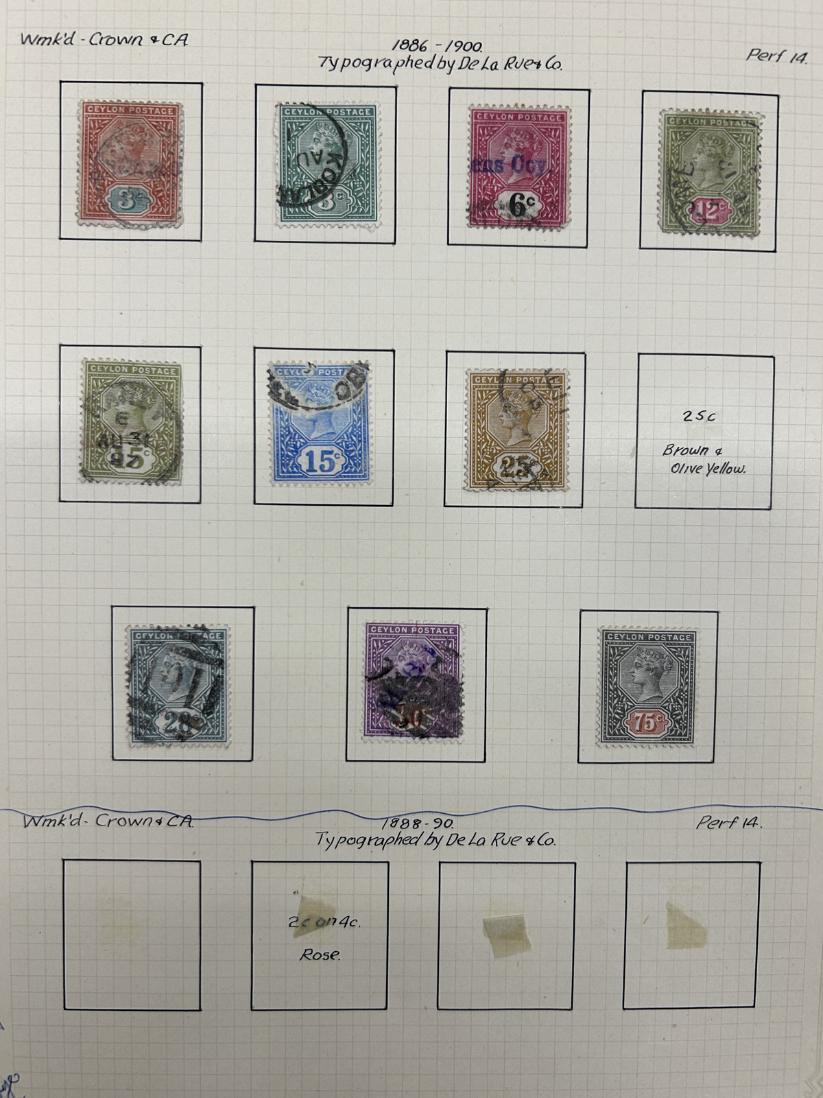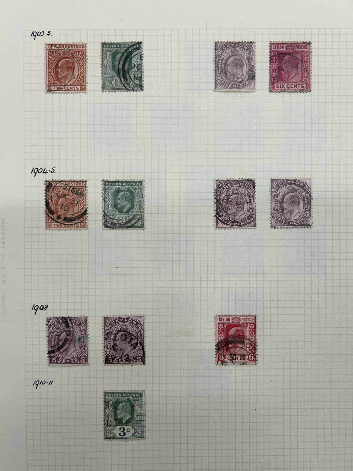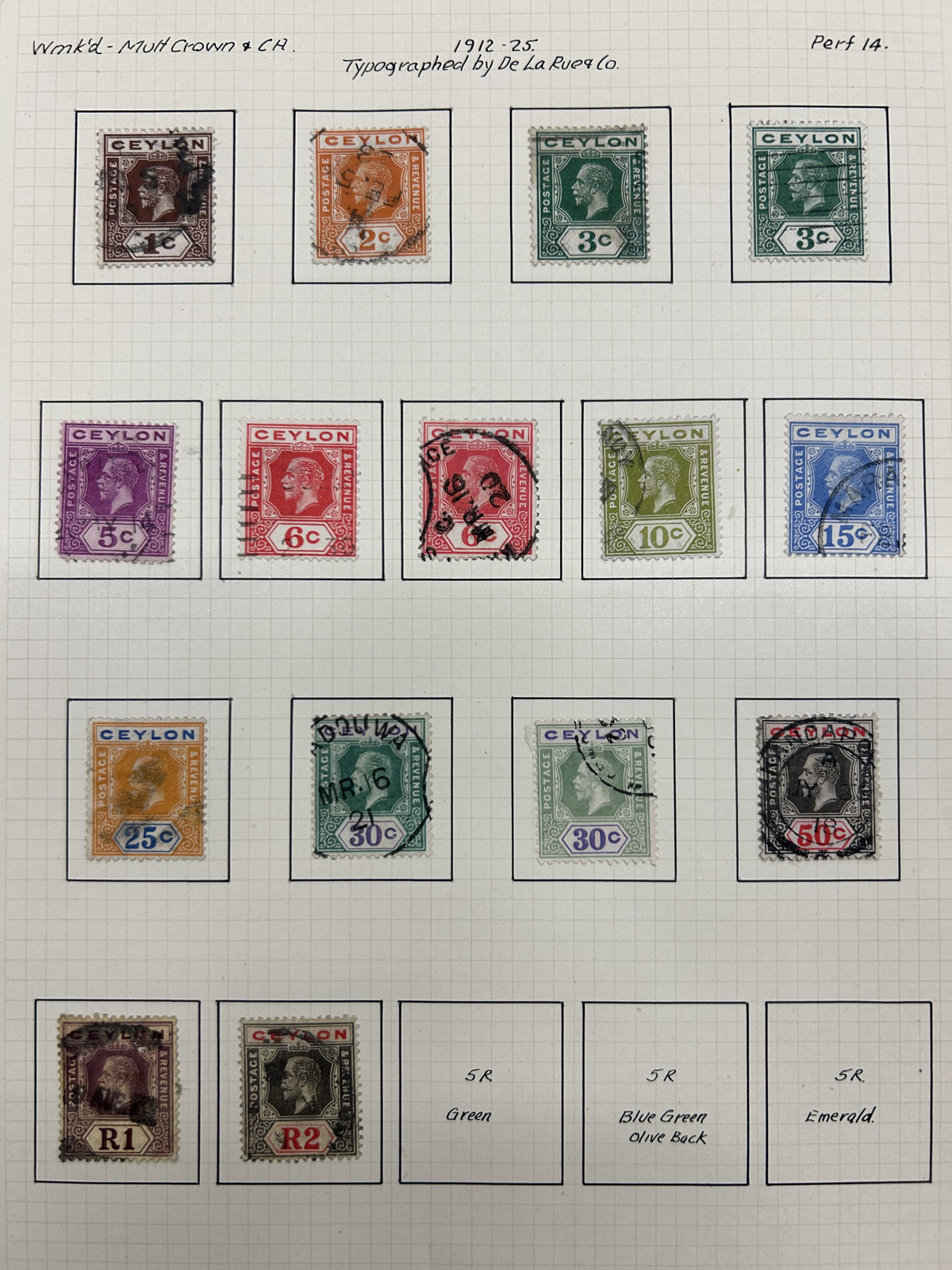 649 O/og/nh   imageCollection of Mint and Used Ceylon, 1872-1969, starts with an old time album of mint and used for the range of 1872-1969, with many better items, complete sets, etc., close to complete after QV era. (c.v. U$821 up to 1954 only). Also includes a page containing 37 QV surcharges and a few regular issues (in no particular order), mostly used and with a few better items, as well as a selection of Officials and War Tax (this page catalogues U$436) plus two stock pages containing 67 used revenue issues (unchecked for better items, etc.) and a few Scott album pages of duplicates (not counted). Rounding off the lot is a card containing what looks like early imperforate QV issue reprints (with CANCELLED overprint) and two complete booklets, one containing twenty 5c stamps (Scott 308) and the other containing eight 75c stamps plus 8 Airmail labels. An overall fine to very fine and useful lot. (Scan 1) (Scan 2) (Scan 3) (Scan 4) (Scan 5) (Scan 6) (Scan 7) (Scan 8) (Scan 9) (Scan 10) (Scan 11) (Scan 12) (Scan 13) (Scan 14) (Scan 15) (Scan 16) (Scan 17) (All Scans) (All Images)