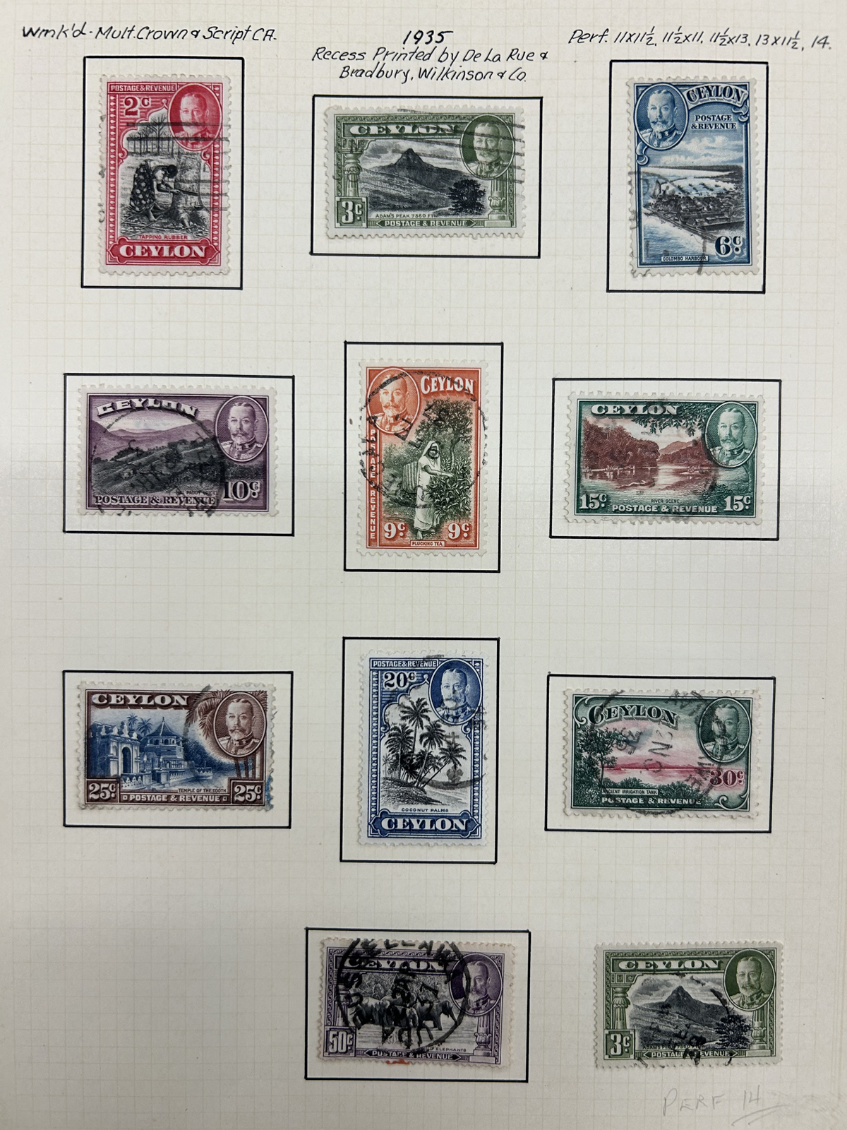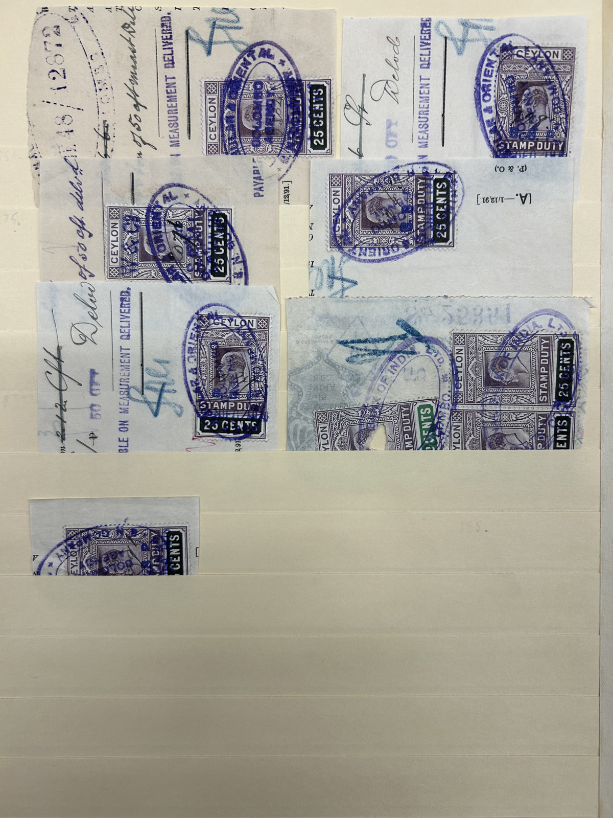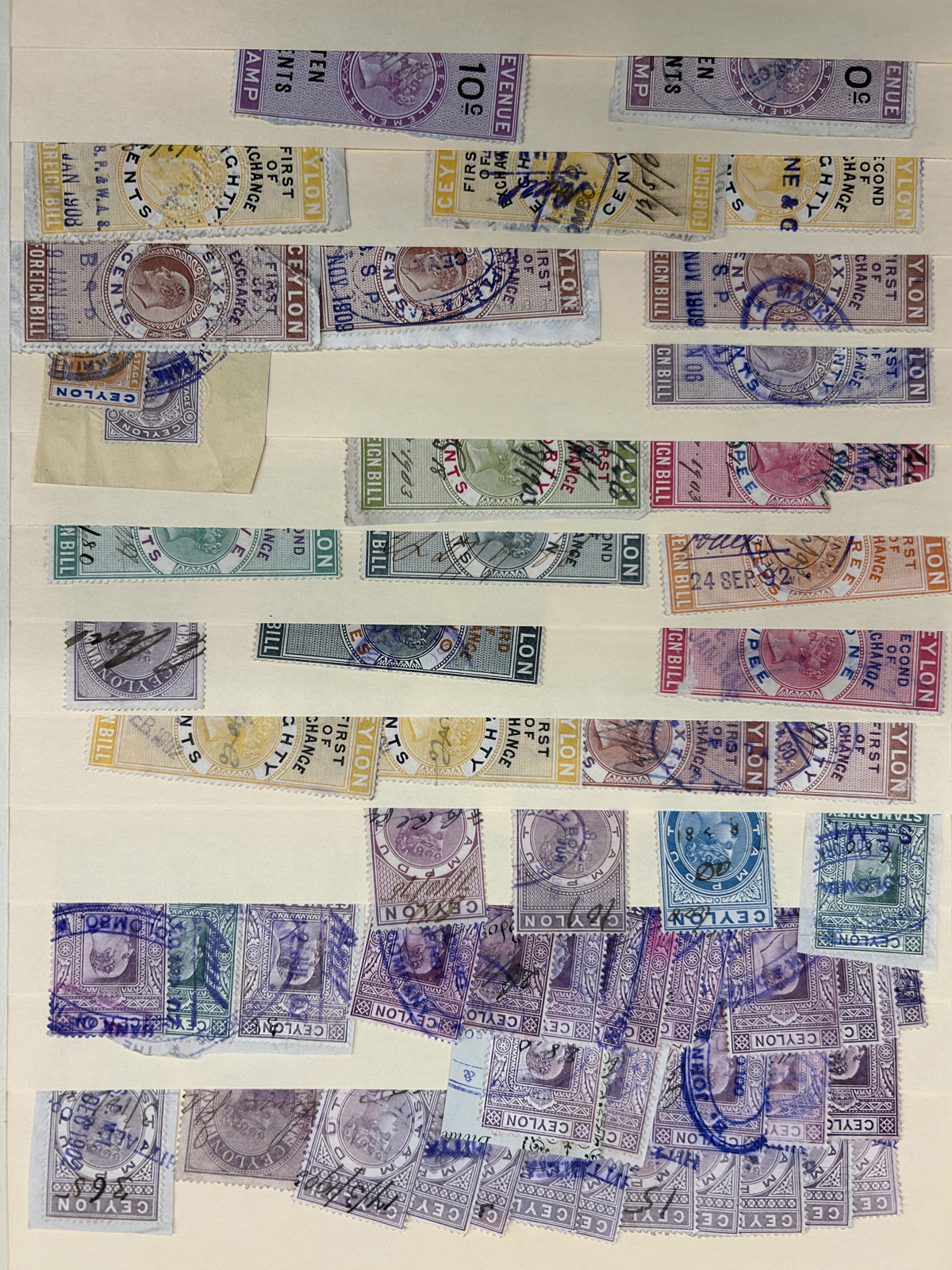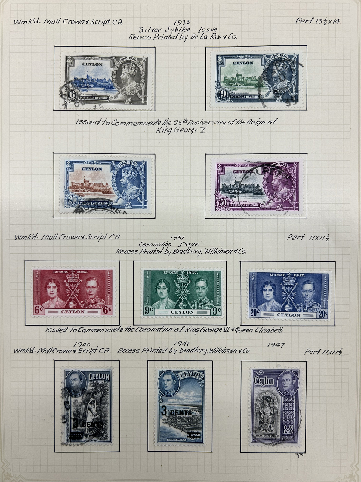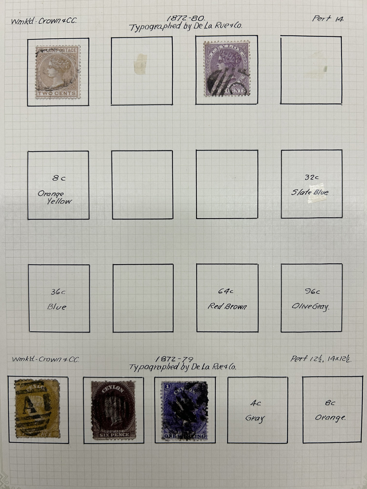 649 O/og/nh   imageCollection of Mint and Used Ceylon, 1872-1969, starts with an old time album of mint and used for the range of 1872-1969, with many better items, complete sets, etc., close to complete after QV era. (c.v. U$821 up to 1954 only). Also includes a page containing 37 QV surcharges and a few regular issues (in no particular order), mostly used and with a few better items, as well as a selection of Officials and War Tax (this page catalogues U$436) plus two stock pages containing 67 used revenue issues (unchecked for better items, etc.) and a few Scott album pages of duplicates (not counted). Rounding off the lot is a card containing what looks like early imperforate QV issue reprints (with CANCELLED overprint) and two complete booklets, one containing twenty 5c stamps (Scott 308) and the other containing eight 75c stamps plus 8 Airmail labels. An overall fine to very fine and useful lot. (Scan 1) (Scan 2) (Scan 3) (Scan 4) (Scan 5) (Scan 6) (Scan 7) (Scan 8) (Scan 9) (Scan 10) (Scan 11) (Scan 12) (Scan 13) (Scan 14) (Scan 15) (Scan 16) (Scan 17) (All Scans) (All Images)