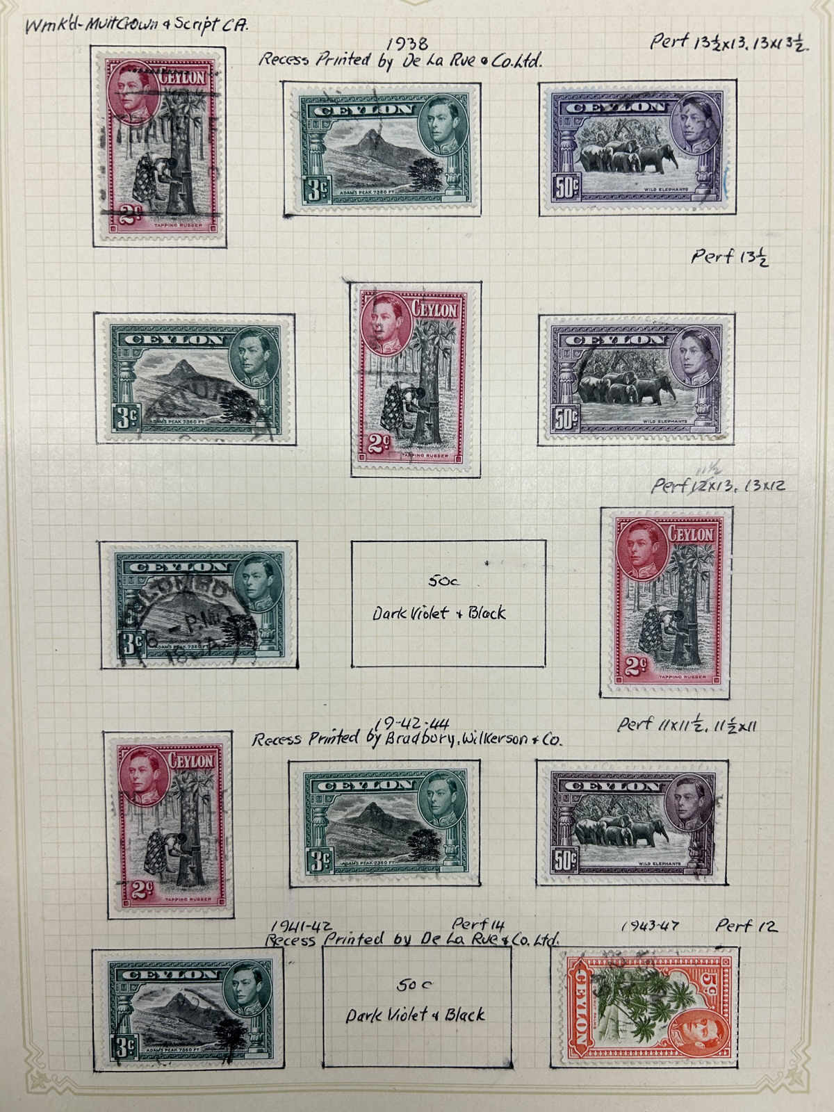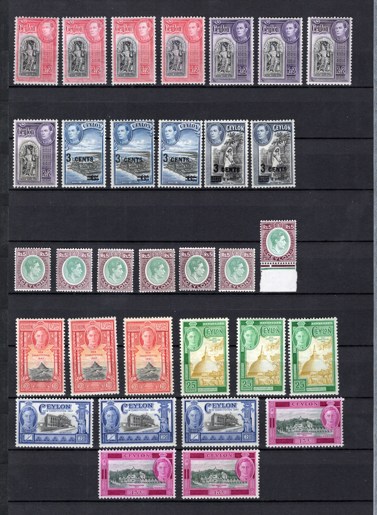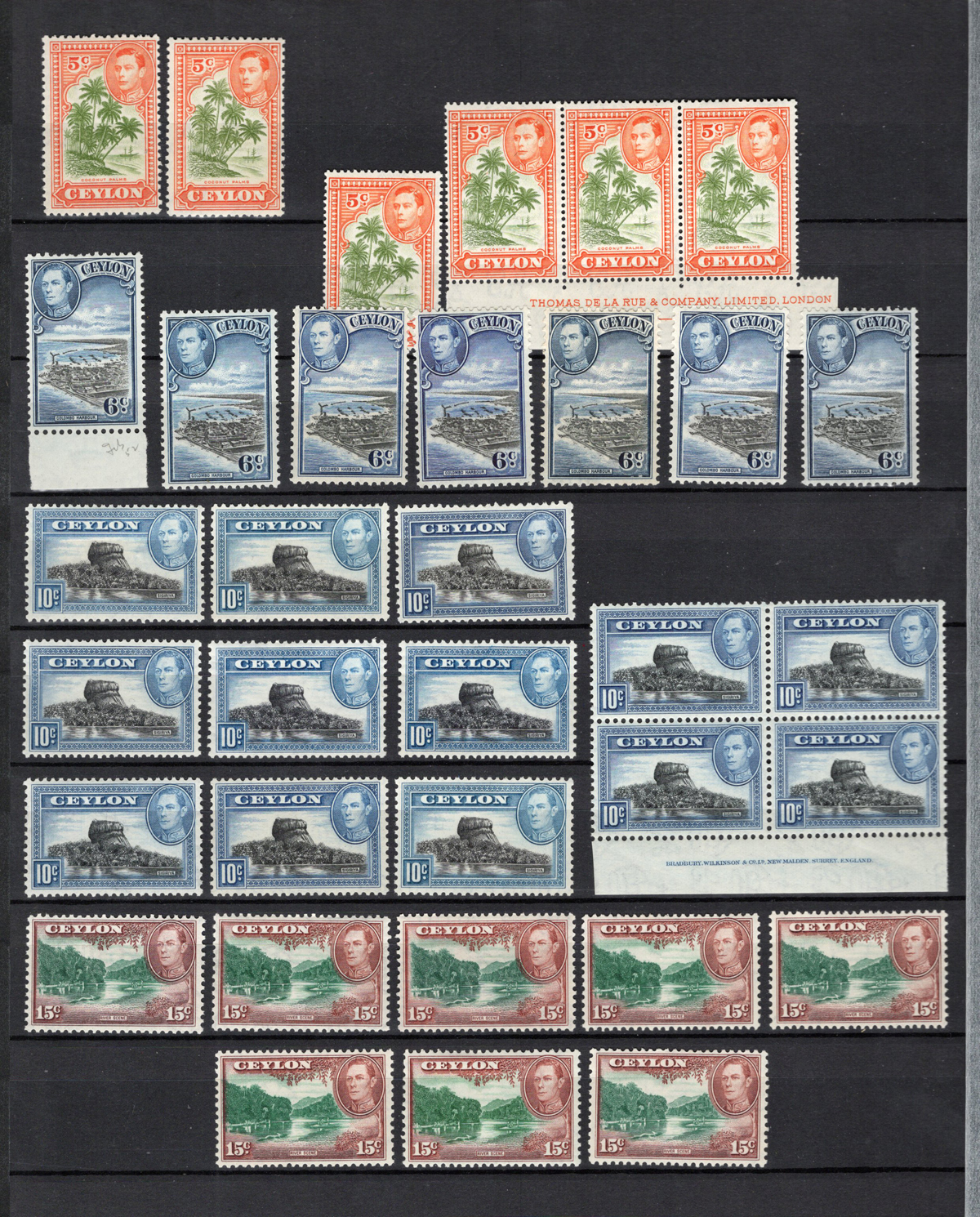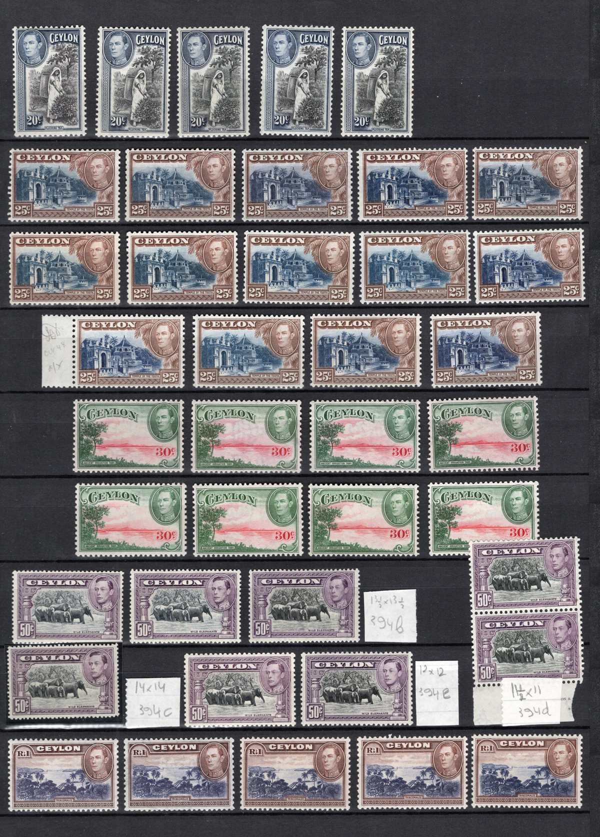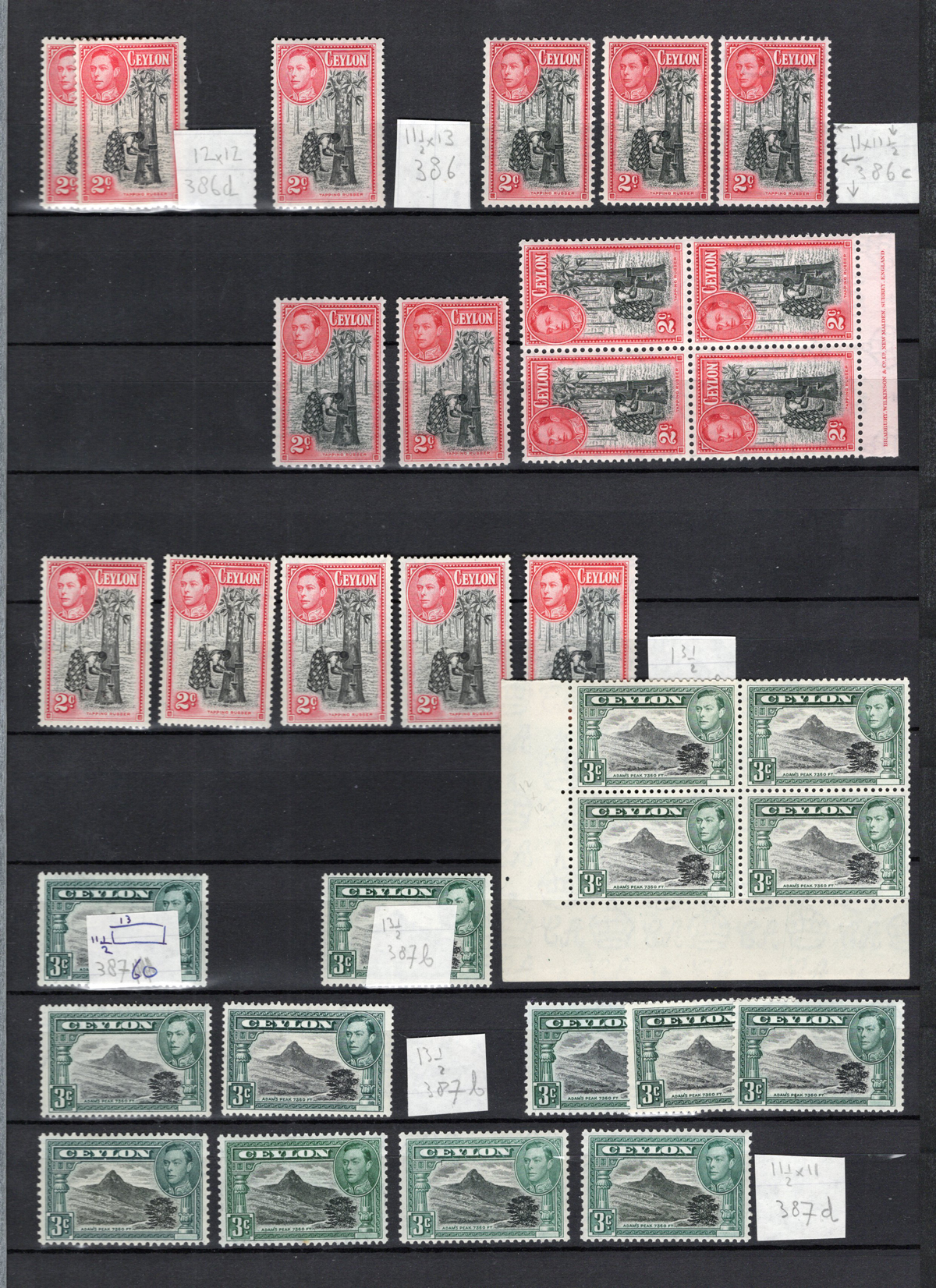 650 og/nh 278/299 imageAccumulation of Mint Ceylon King George VI Issues, includes #s 278 to 292, 296-299 (no #289A). Loaded with perforation varieties, and with quantities ranging between 1 and 14. Includes better such as #286a (U$90), 289 (x 7 = U$192), etc. A spot check of the gum revealed a mix of lightly hinged and never hinged. Also includes a cover mailed with a #286e to England. A fresh and very fine lot. (Scan 1) (Scan 2) (Scan 3) (Scan 4) (Scan 5) (All Scans) (All Images)