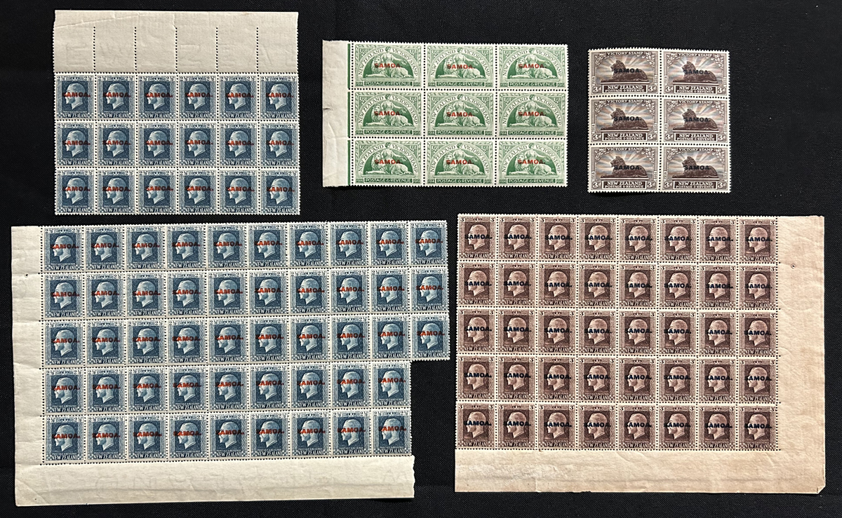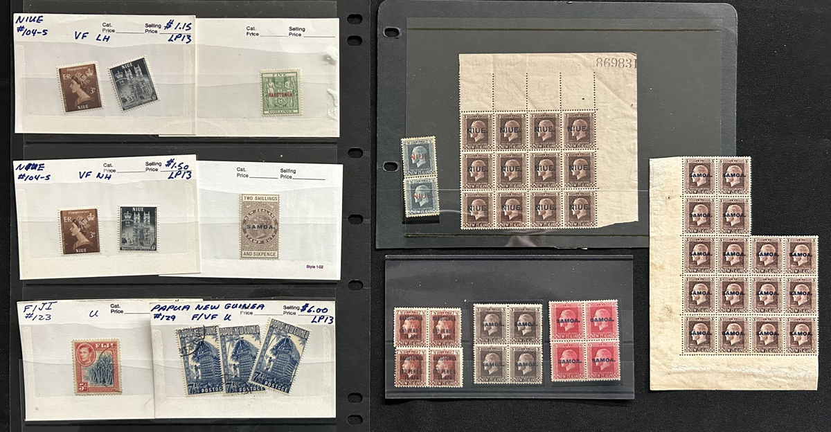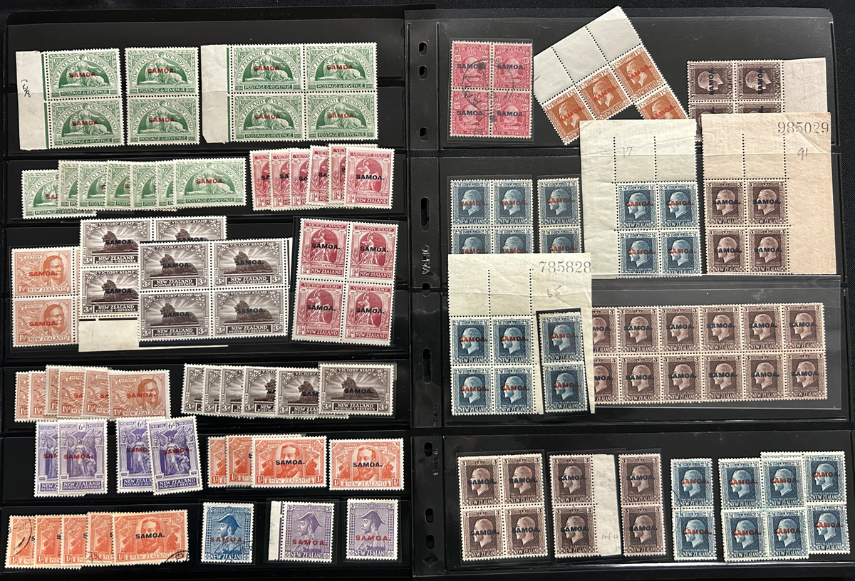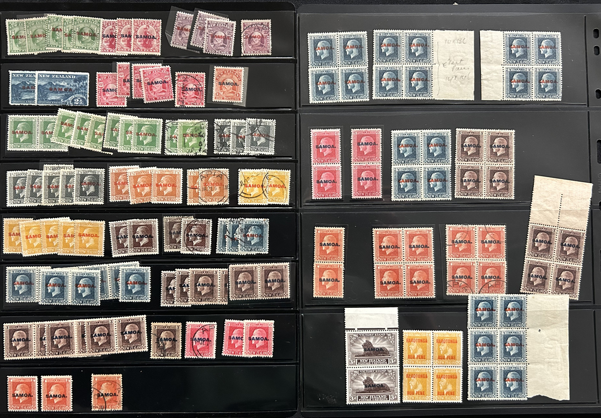 642 O/og/nh   imageNew Zealand Stamps Overprinted for Use in Pacific Islands, in several stock sheets, 102 cards, etc., strongest being Samoa, but saw some Niue and Cook Islands. Includes mint used, two-perf pairs, a plate block and more. The balance of an estate. (Scan 1) (Scan 2) (Scan 3) (Scan 4) (Scan 5) (Scan 6) (All Scans) (All Images)
