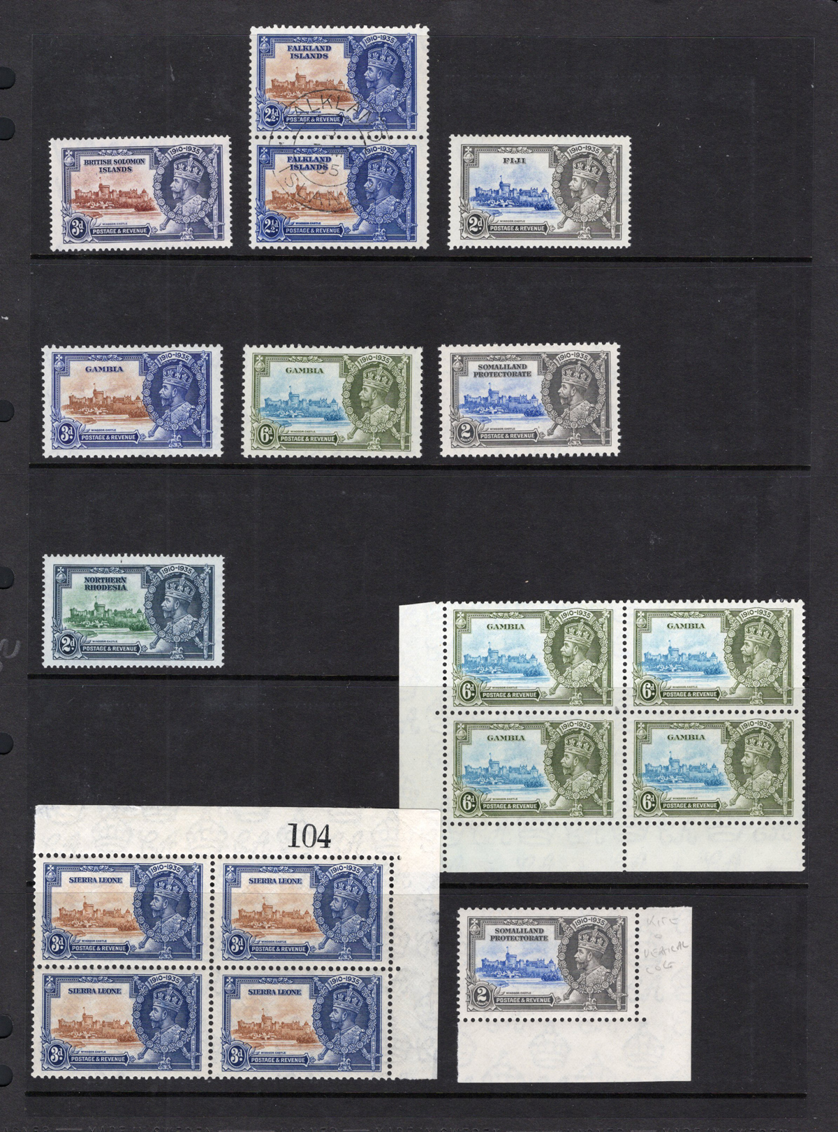 643 O/og/nh   imageGroup of Ten 1935 KGV Silver Jubilee Mint Varieties, with Stanley Gibbons numbers and values, includes British Solomon Islands 54f (NH, £160), Falkland Islands 140l (used vertical pair, £152), Fiji 243f (NH, £120), Gambia 144a (MLH, £200), Gambia 145a (MLH, £190), Gambia 145a (lightly hinged LL block of four, £202), Northern Rhodesia 19f (NH, £180), Sierra Leone 182c (NH UR corner block of four, £172), Somaliland Protectorate 87k (NH, £160) and Somaliland Protectorate 87k (NH lower right corner single, £160).
