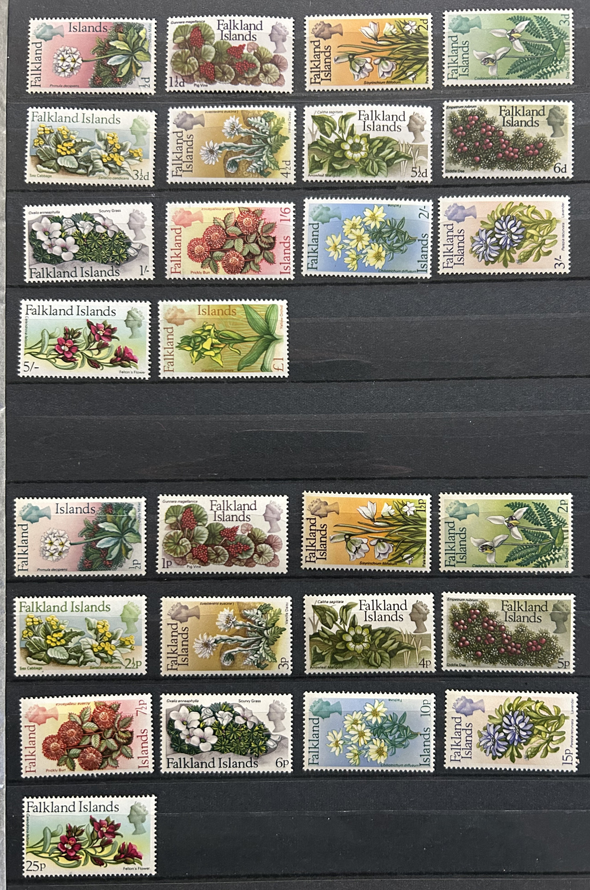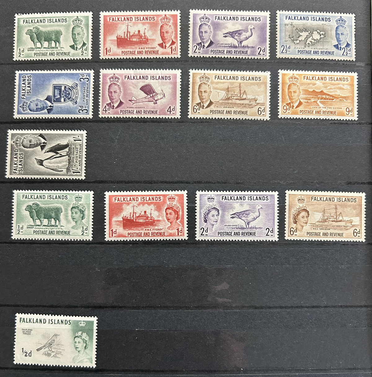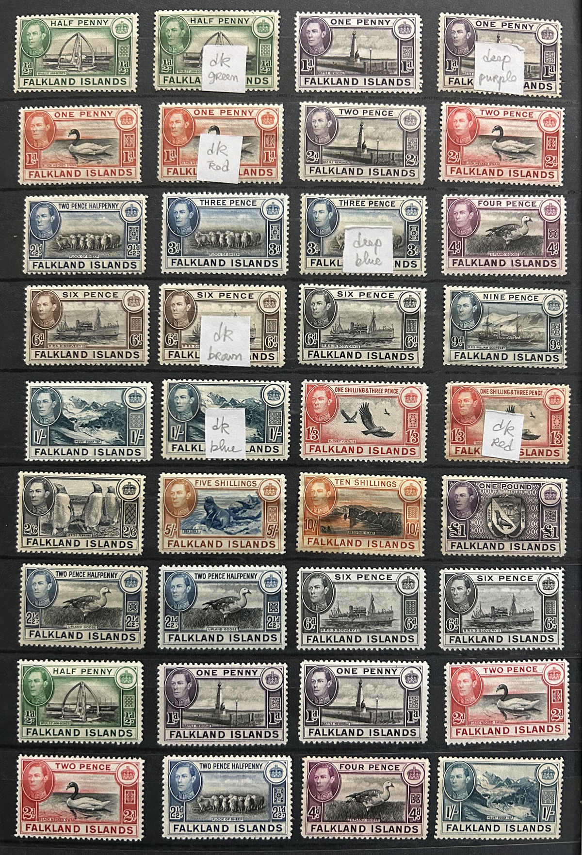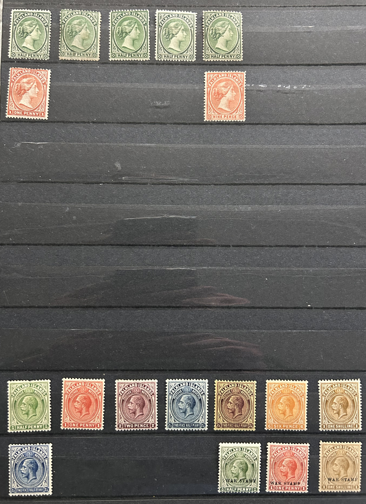 659 og/nh   imageCollection of Mint Falkland Islands, 1890s to 1980s, displayed in 16 pages of a stockbook, starting with a few QV issues, a group of 8 KGV first issues, then with about 26 complete sets, including better, such as #s 77-80 ($55), 99-100 ($112), 84-96 (including extra shades and duplicates, for a total of 36 stamps, $457), 107-120 (one complete set at $200, plus two other part sets), 166-179 (one complete set at $87, plus another set missing the high value), 260-274 (two sets) and many more. Appears lightly hinged up to 1949, then never hinged thereafter, and generally very fine. Pictures show only part of the collection. (Scan 1) (Scan 2) (Scan 3) (Scan 4) (Scan 5) (Scan 6) (Scan 7) (Scan 8) (Scan 9) (Scan 10) (All Scans) (All Images)