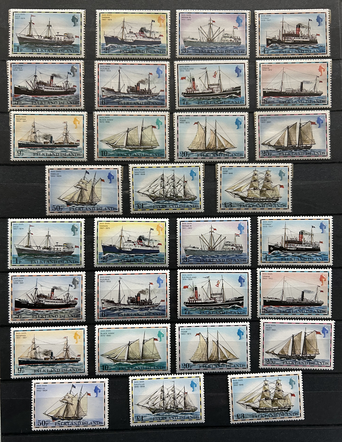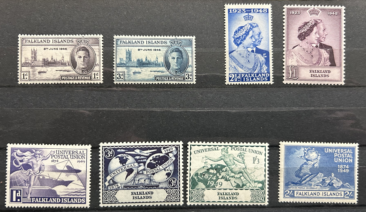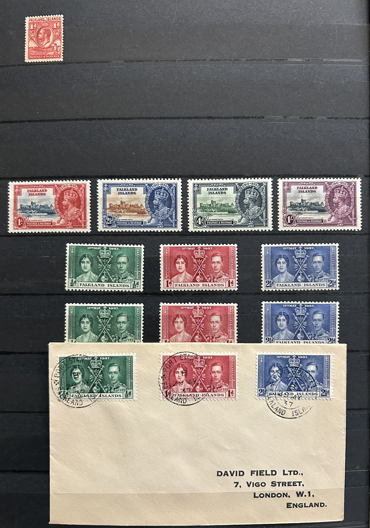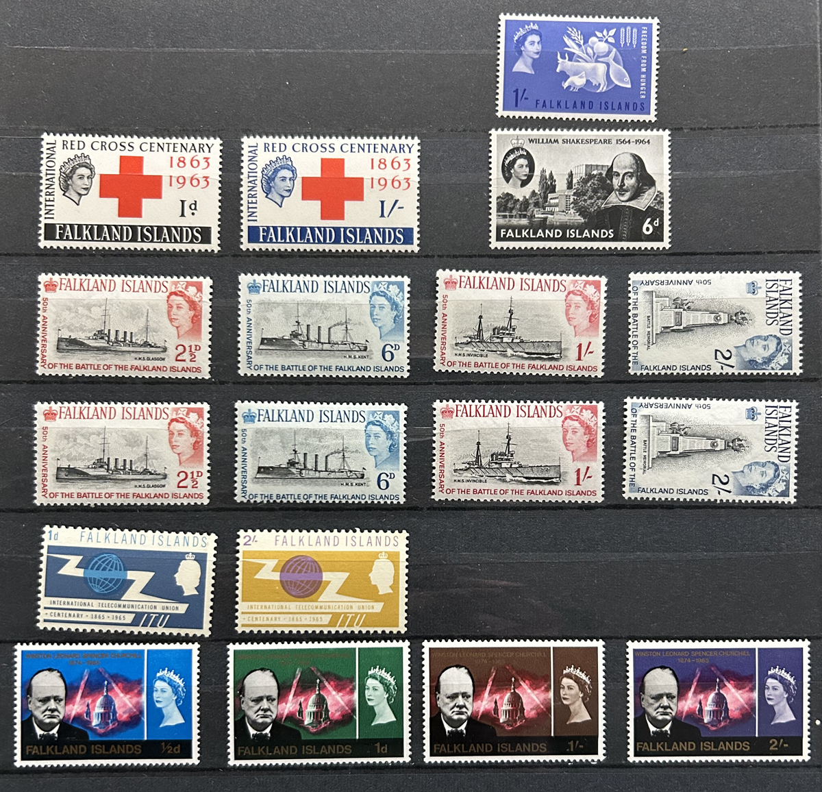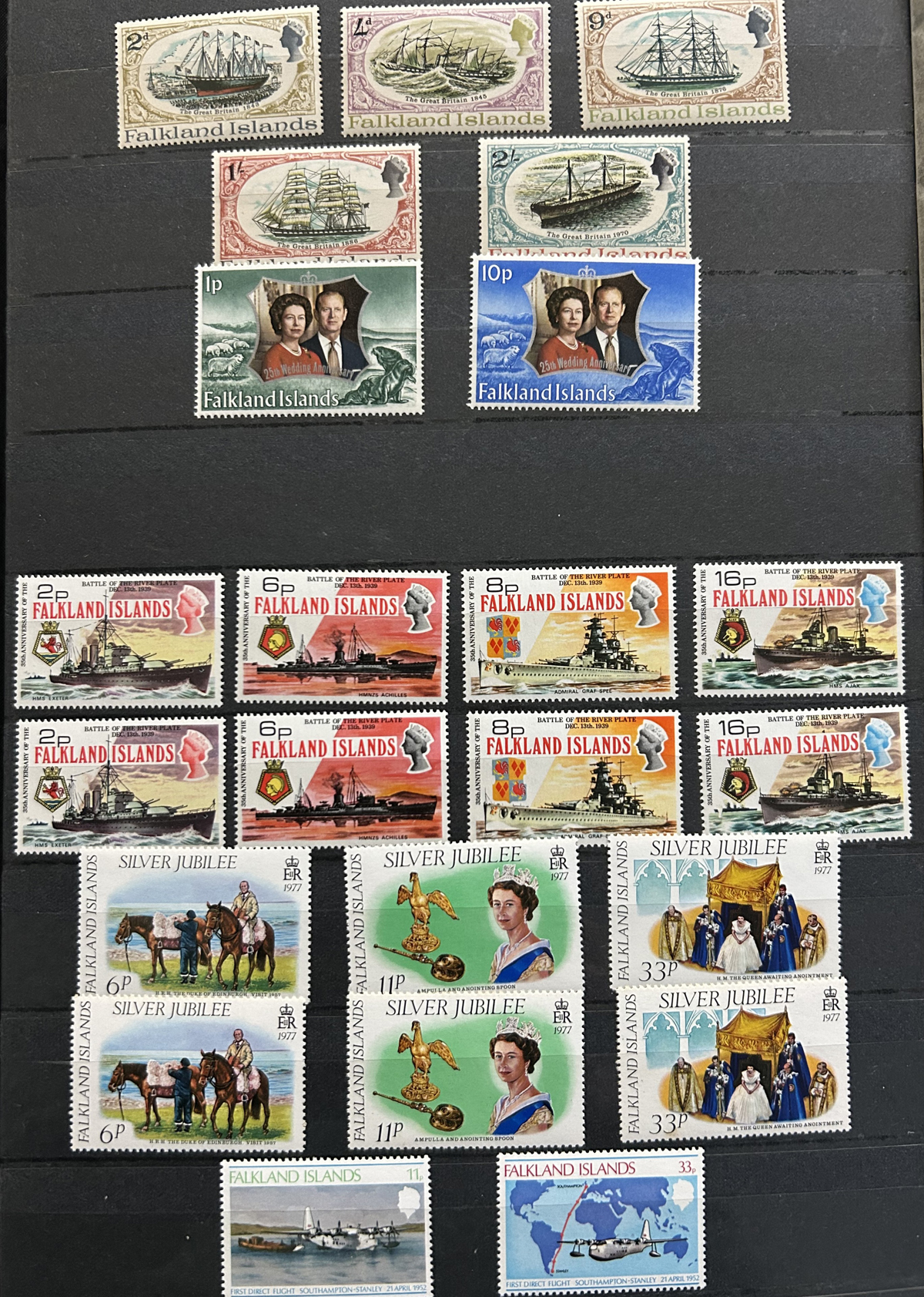 659 og/nh   imageCollection of Mint Falkland Islands, 1890s to 1980s, displayed in 16 pages of a stockbook, starting with a few QV issues, a group of 8 KGV first issues, then with about 26 complete sets, including better, such as #s 77-80 ($55), 99-100 ($112), 84-96 (including extra shades and duplicates, for a total of 36 stamps, $457), 107-120 (one complete set at $200, plus two other part sets), 166-179 (one complete set at $87, plus another set missing the high value), 260-274 (two sets) and many more. Appears lightly hinged up to 1949, then never hinged thereafter, and generally very fine. Pictures show only part of the collection. (Scan 1) (Scan 2) (Scan 3) (Scan 4) (Scan 5) (Scan 6) (Scan 7) (Scan 8) (Scan 9) (Scan 10) (All Scans) (All Images)