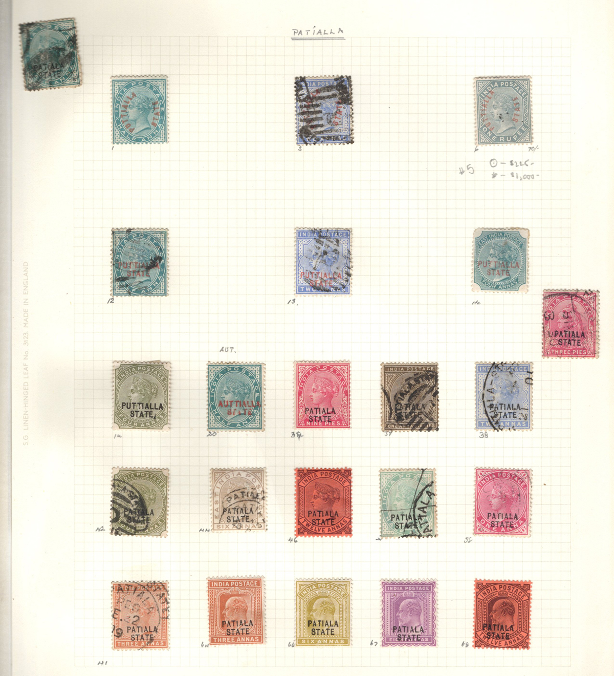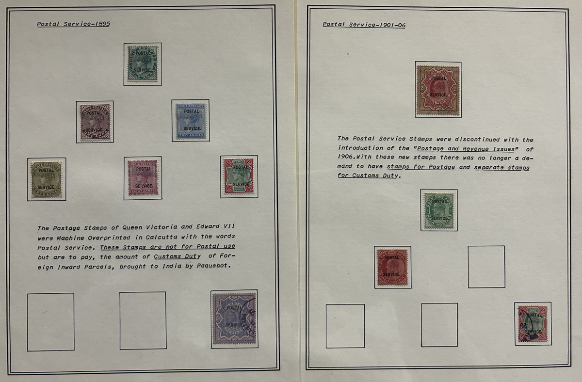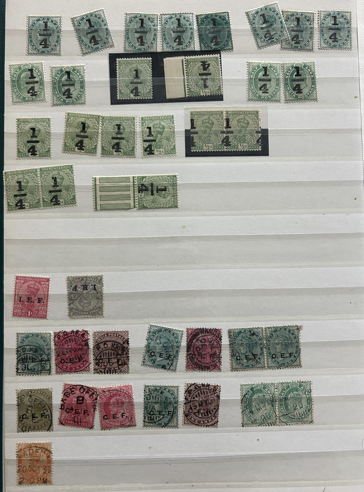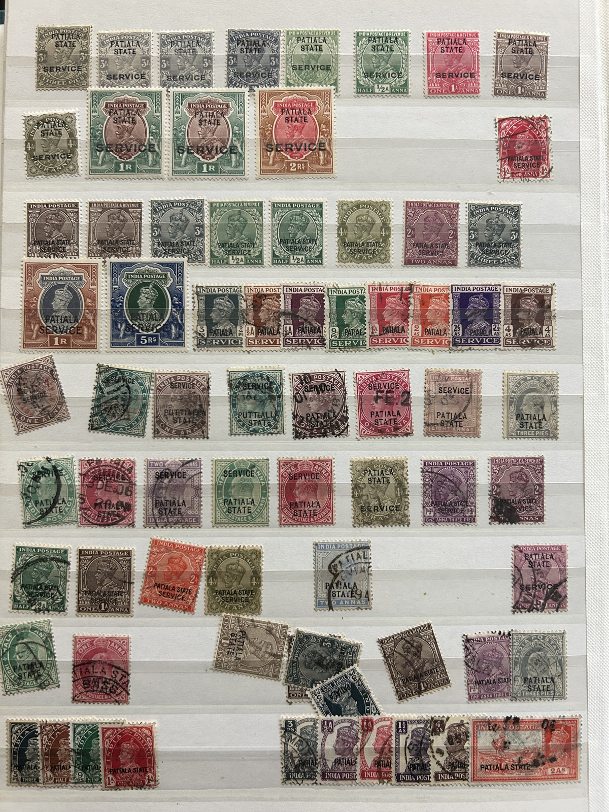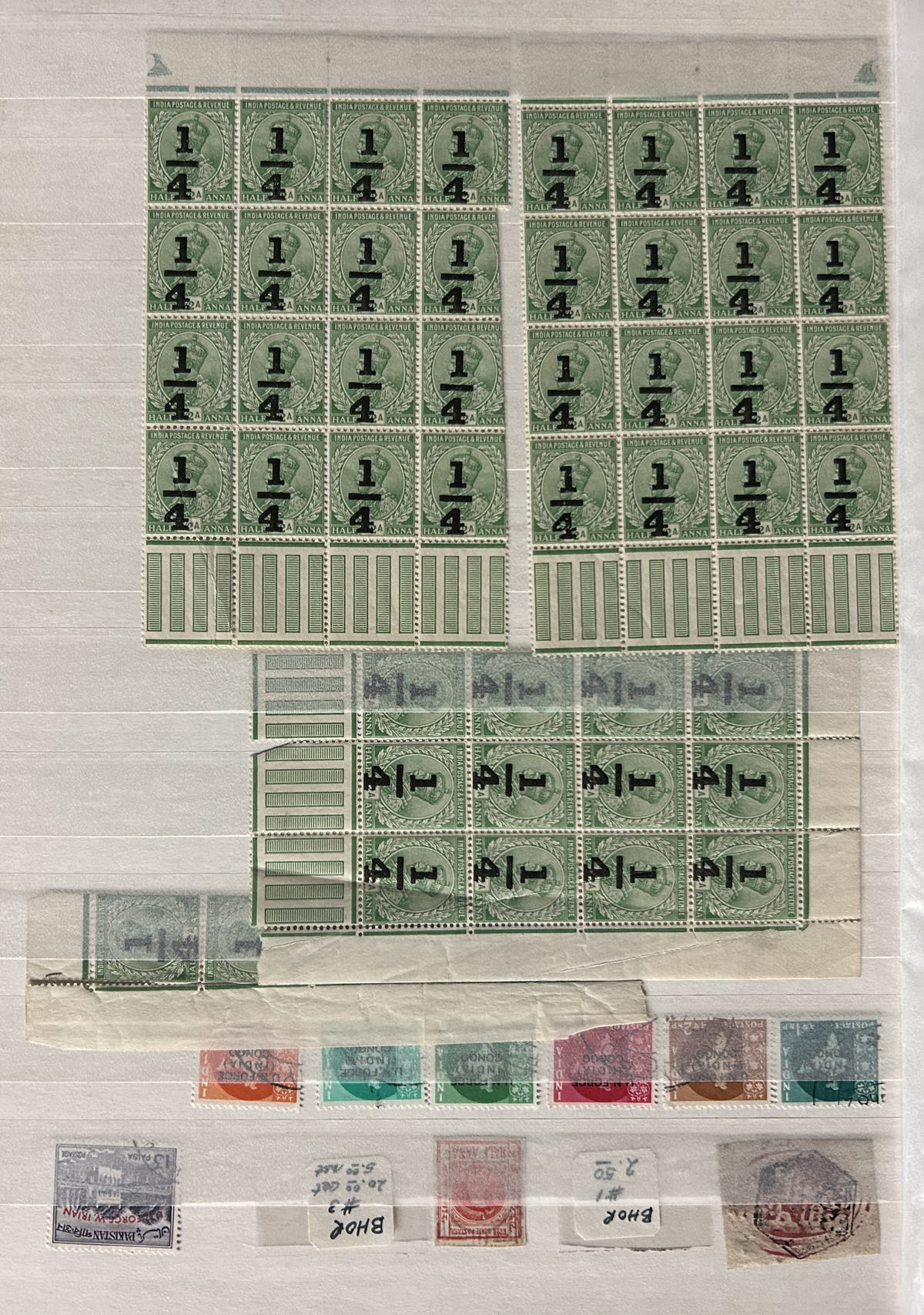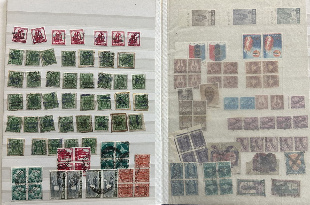 679 O/og/nh   imageStockbook of Interesting India, with 19 pages of mint and used material, noting interesting such as a half page of mint KGV issues with "1/4" surcharges, including a few that are misplaced, second half of the page has C.E.F. overprints on used issues, then a selection of mint "Map of India" coil strips of 4 as well as other early mint India issues, including some inverted watermarks. Next page starts with a group of T.P.O. letters in grid cancels followed by squared circles and other postmarks, plus a group of KGVI mint blocks of four. There are also 6 pages of specialized "Refugee Relief" overprinted issues, with many overprint varieties (inverted, double, different types, colours, etc.). Also saw the three low Gandhi values (NH, $57), 4 pages of mostly mint India issues overprinted for use in Patiala State, including Officials (almost complete, high catalogue value) as well as other various items, including three pages of used Travancore. See pictures for an overview, a useful lot for the enthusiast. (Scan 1) (Scan 2) (Scan 3) (Scan 4) (Scan 5) (Scan 6) (Scan 7) (Scan 8) (Scan 9) (Scan 10) (Scan 11) (Scan 12) (Scan 13) (Scan 14) (All Scans) (All Images)
