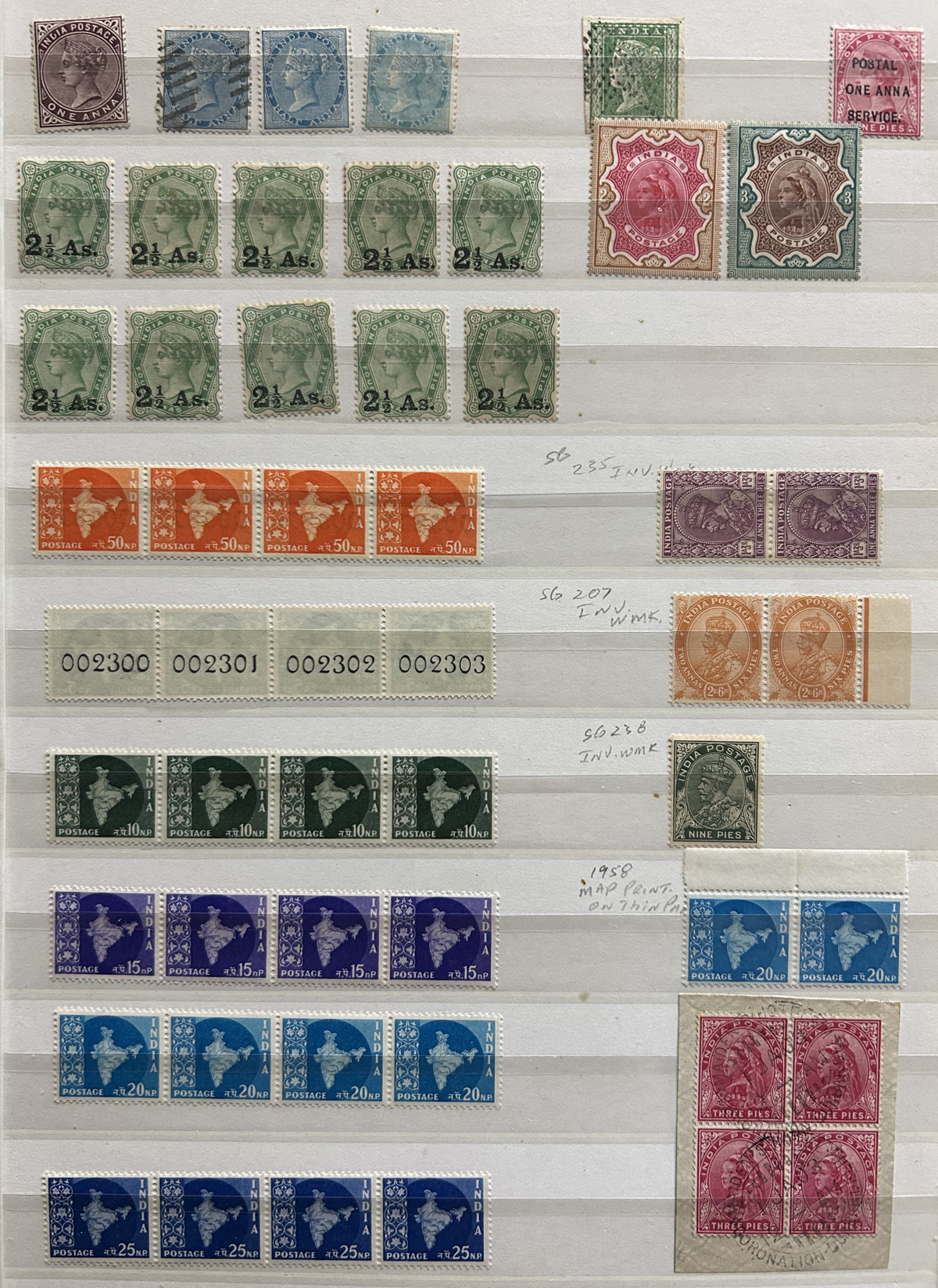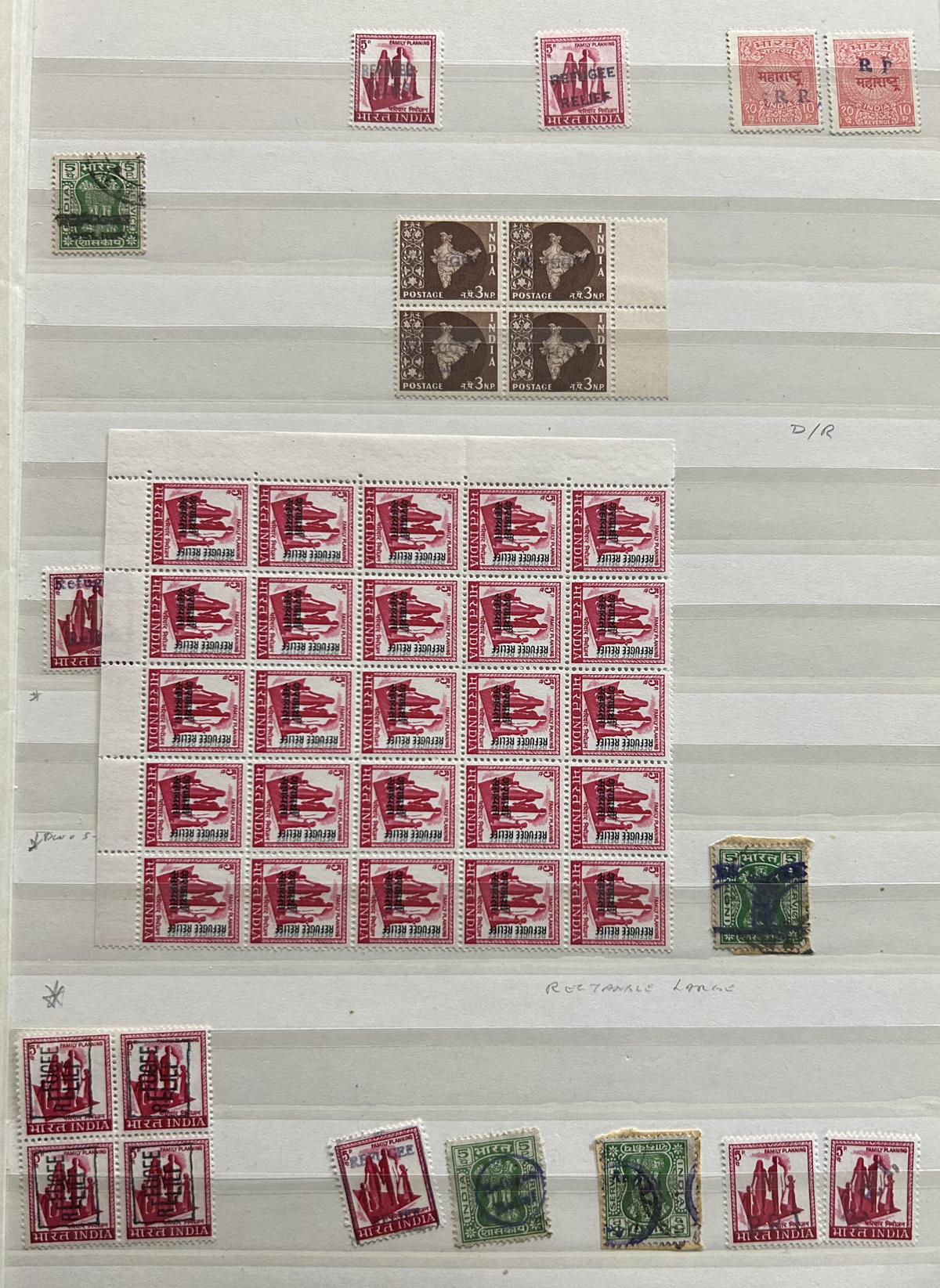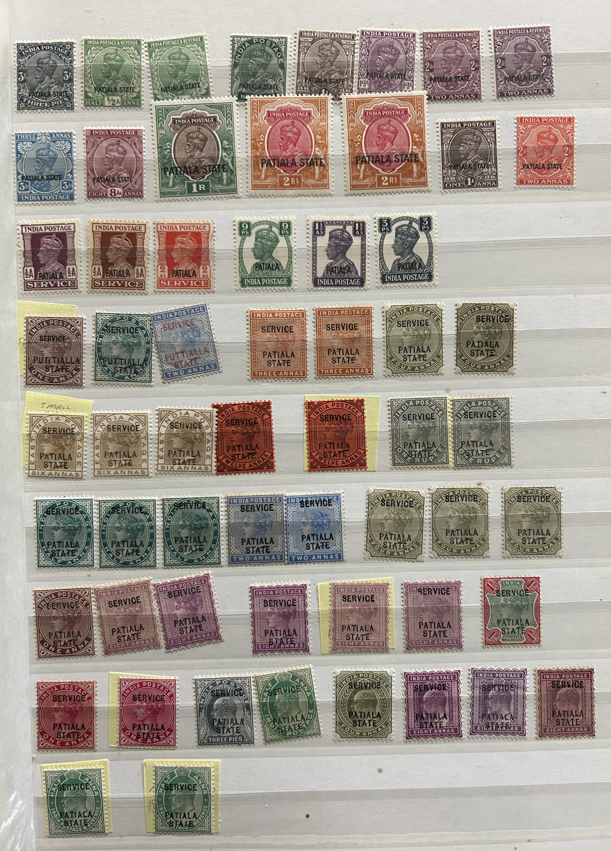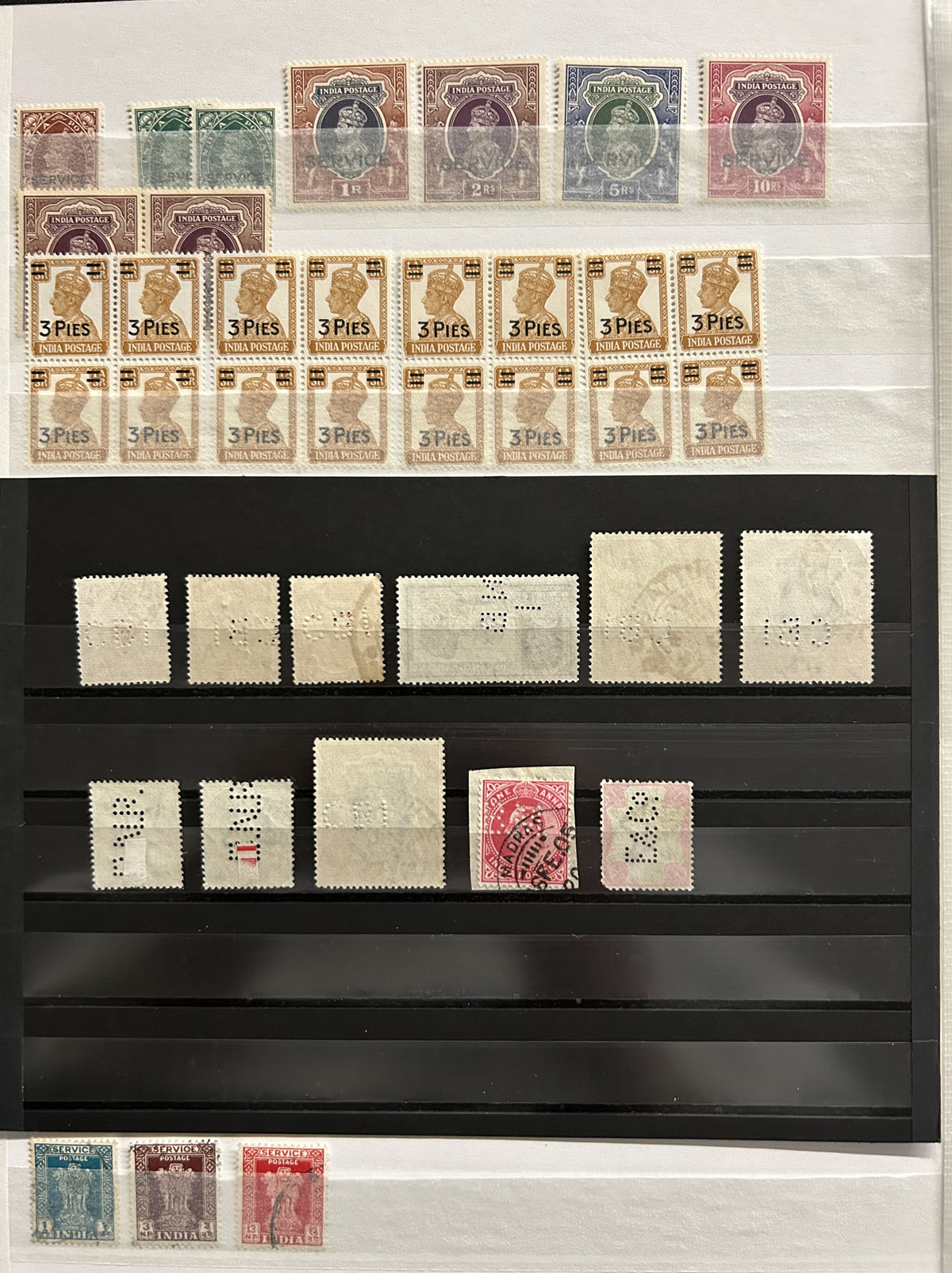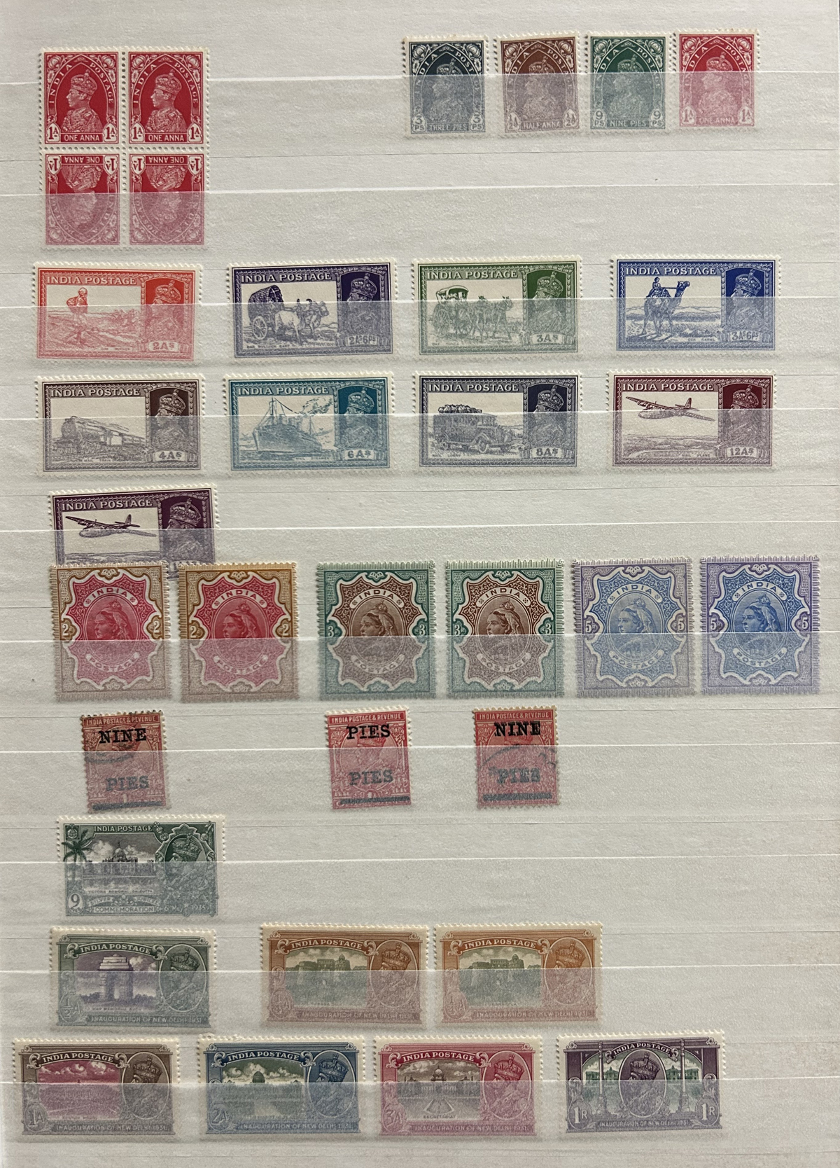 679 O/og/nh   imageStockbook of Interesting India, with 19 pages of mint and used material, noting interesting such as a half page of mint KGV issues with "1/4" surcharges, including a few that are misplaced, second half of the page has C.E.F. overprints on used issues, then a selection of mint "Map of India" coil strips of 4 as well as other early mint India issues, including some inverted watermarks. Next page starts with a group of T.P.O. letters in grid cancels followed by squared circles and other postmarks, plus a group of KGVI mint blocks of four. There are also 6 pages of specialized "Refugee Relief" overprinted issues, with many overprint varieties (inverted, double, different types, colours, etc.). Also saw the three low Gandhi values (NH, $57), 4 pages of mostly mint India issues overprinted for use in Patiala State, including Officials (almost complete, high catalogue value) as well as other various items, including three pages of used Travancore. See pictures for an overview, a useful lot for the enthusiast. (Scan 1) (Scan 2) (Scan 3) (Scan 4) (Scan 5) (Scan 6) (Scan 7) (Scan 8) (Scan 9) (Scan 10) (Scan 11) (Scan 12) (Scan 13) (Scan 14) (All Scans) (All Images)