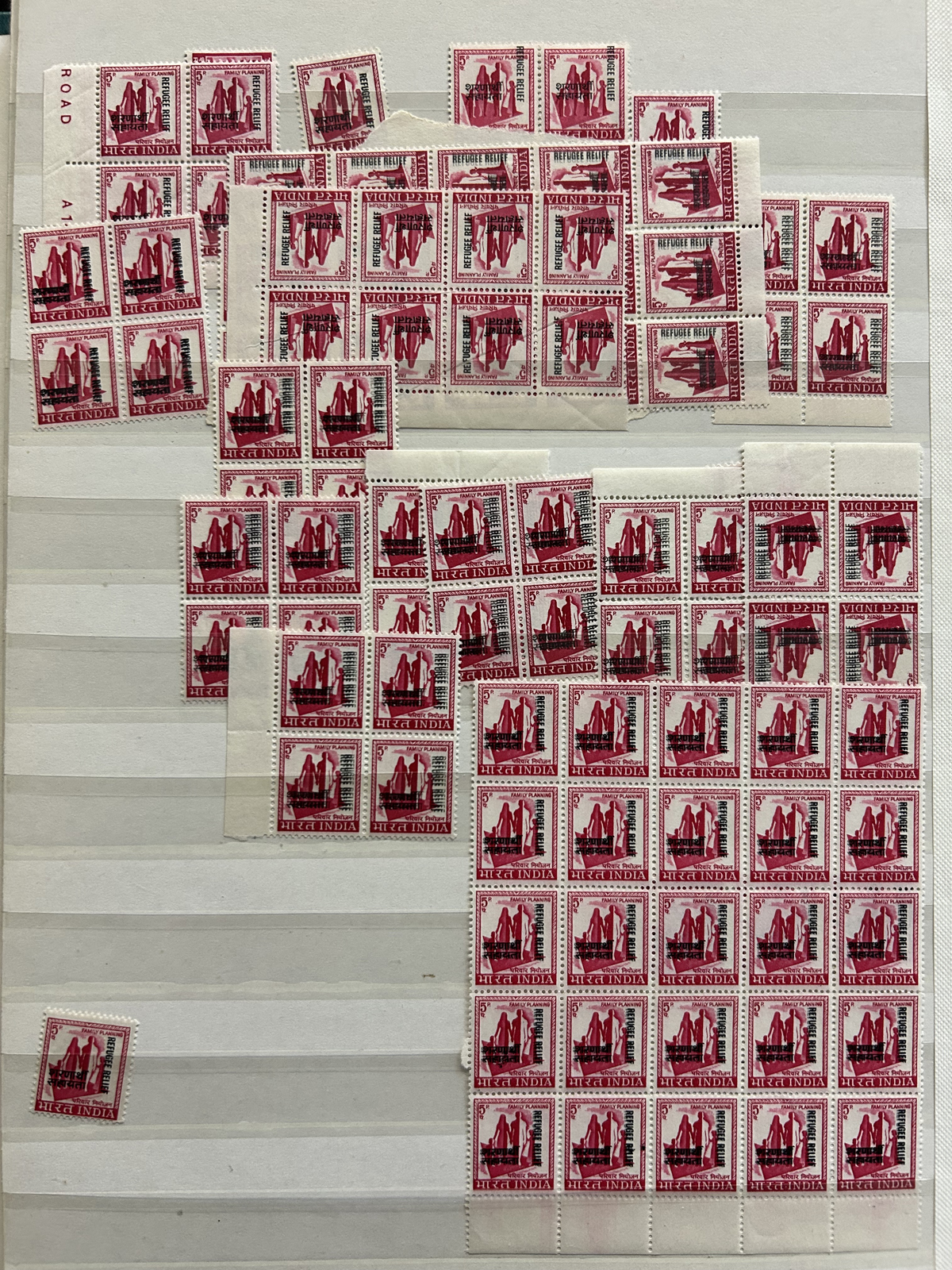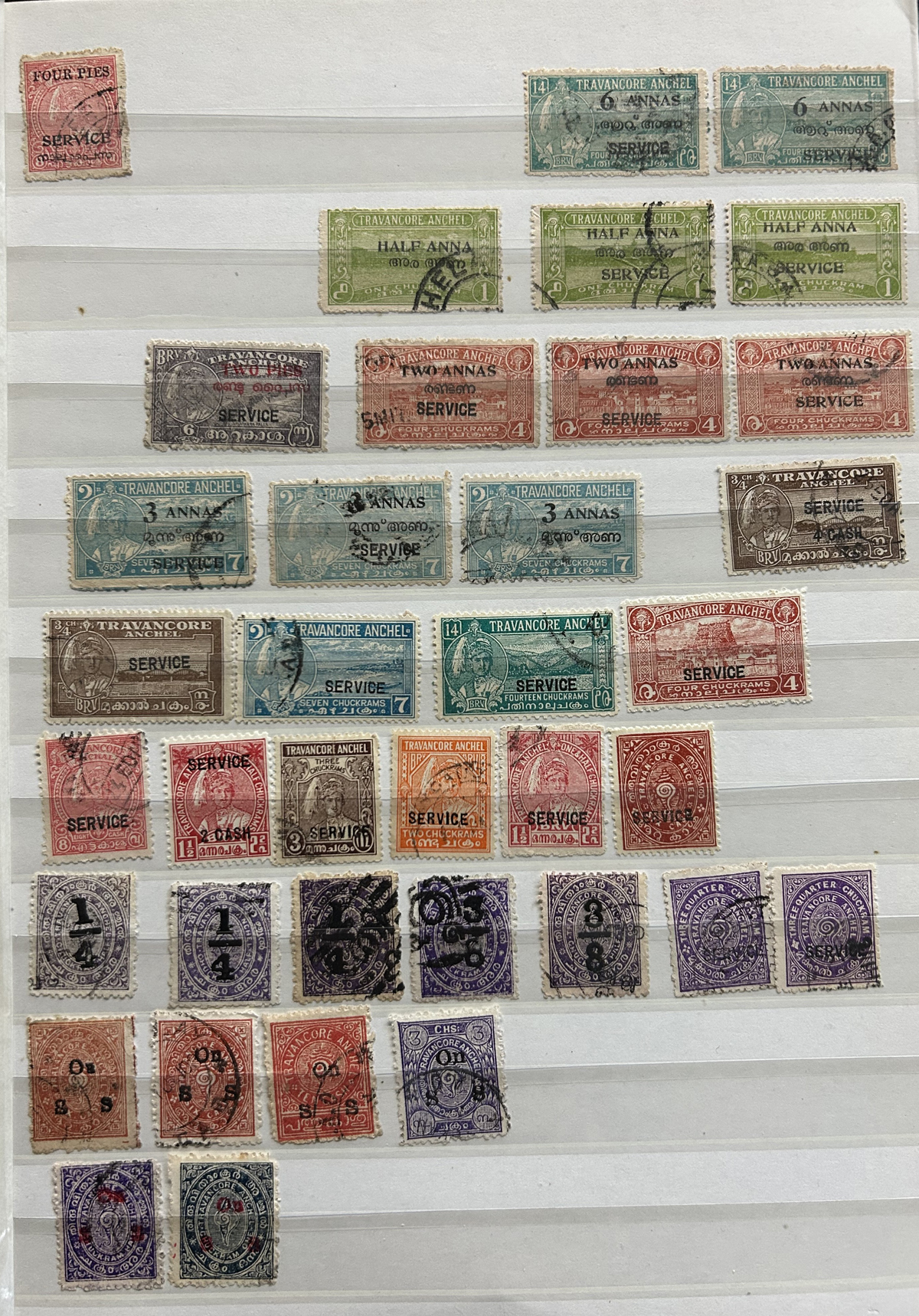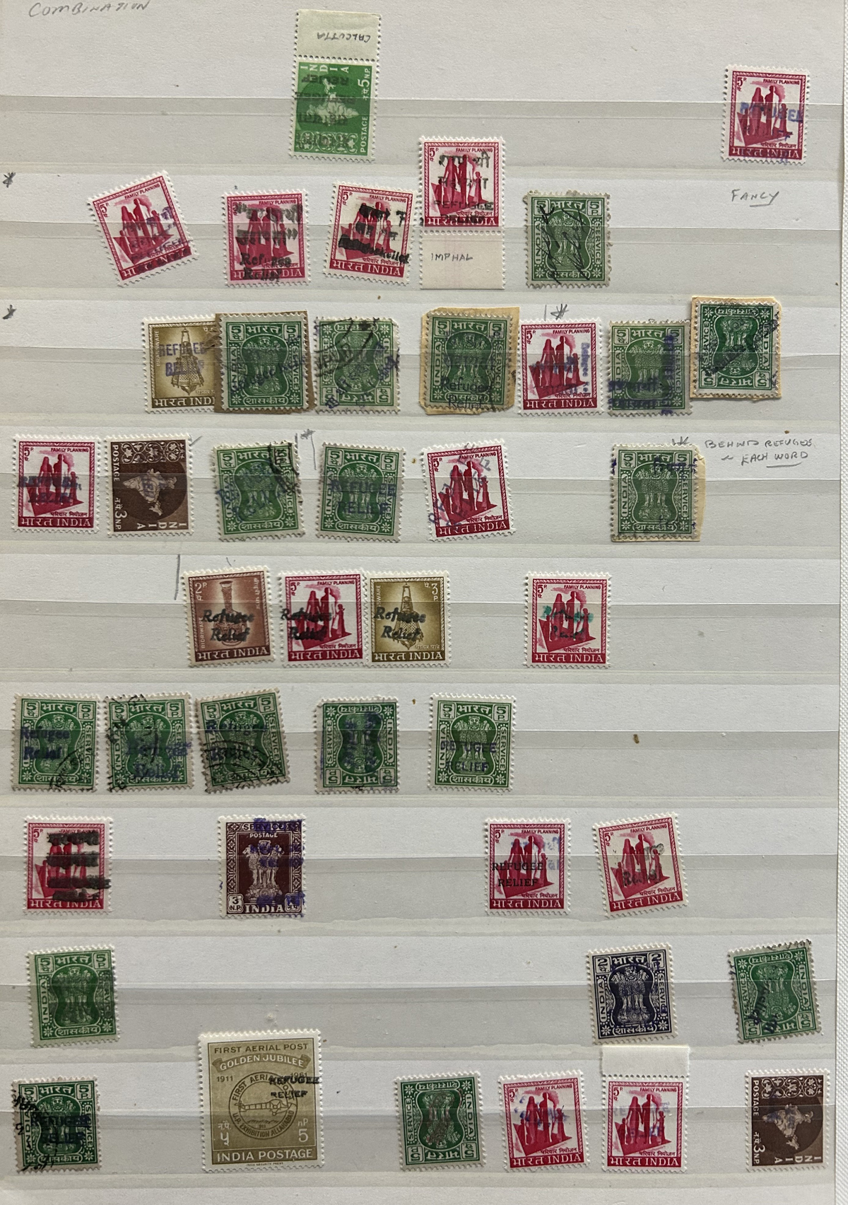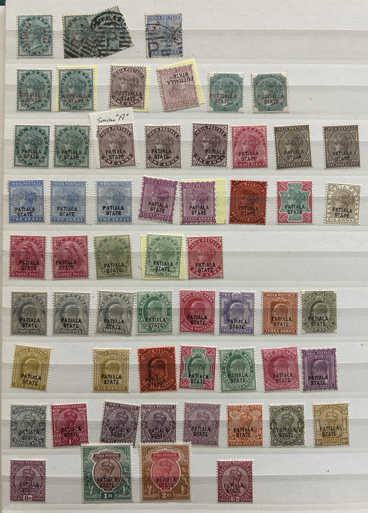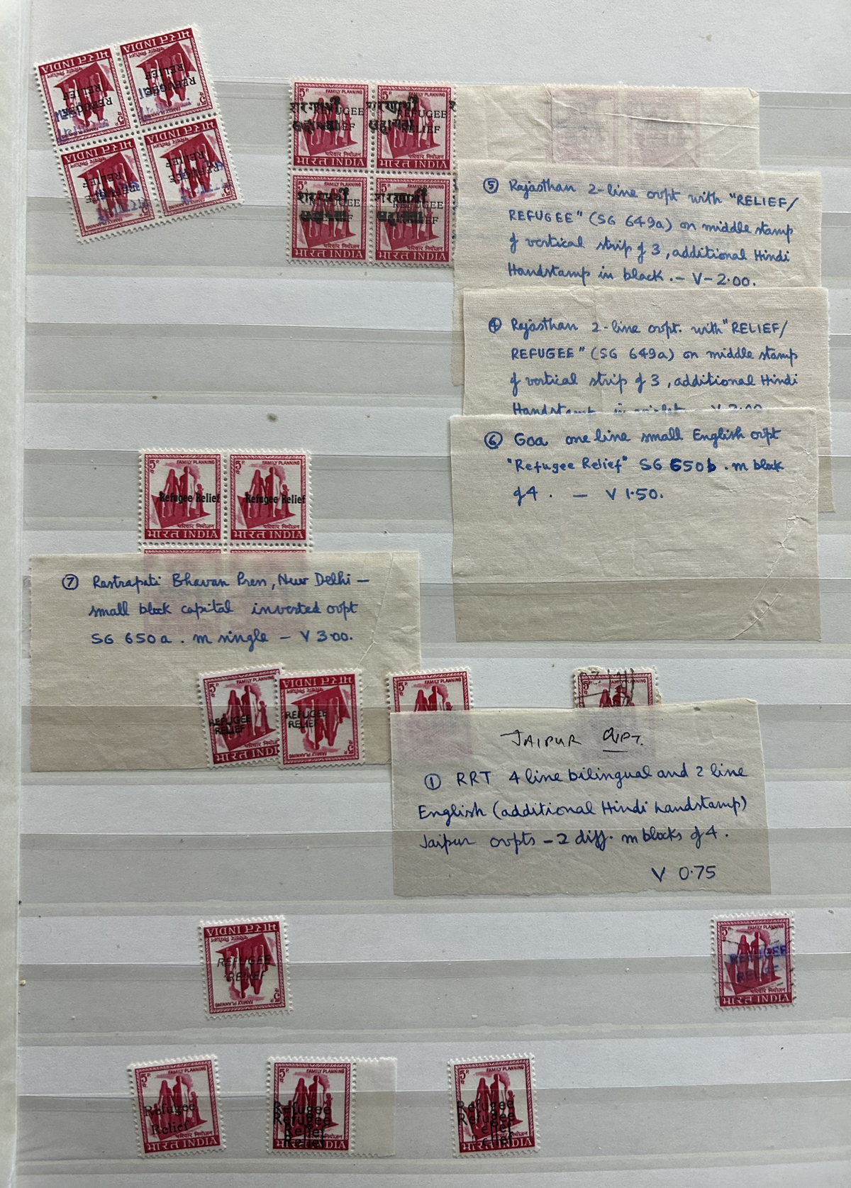 679 O/og/nh   imageStockbook of Interesting India, with 19 pages of mint and used material, noting interesting such as a half page of mint KGV issues with "1/4" surcharges, including a few that are misplaced, second half of the page has C.E.F. overprints on used issues, then a selection of mint "Map of India" coil strips of 4 as well as other early mint India issues, including some inverted watermarks. Next page starts with a group of T.P.O. letters in grid cancels followed by squared circles and other postmarks, plus a group of KGVI mint blocks of four. There are also 6 pages of specialized "Refugee Relief" overprinted issues, with many overprint varieties (inverted, double, different types, colours, etc.). Also saw the three low Gandhi values (NH, $57), 4 pages of mostly mint India issues overprinted for use in Patiala State, including Officials (almost complete, high catalogue value) as well as other various items, including three pages of used Travancore. See pictures for an overview, a useful lot for the enthusiast. (Scan 1) (Scan 2) (Scan 3) (Scan 4) (Scan 5) (Scan 6) (Scan 7) (Scan 8) (Scan 9) (Scan 10) (Scan 11) (Scan 12) (Scan 13) (Scan 14) (All Scans) (All Images)
