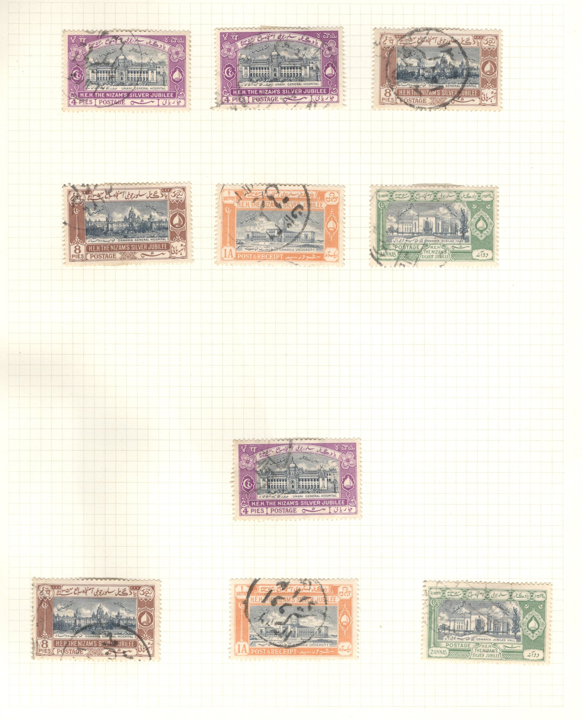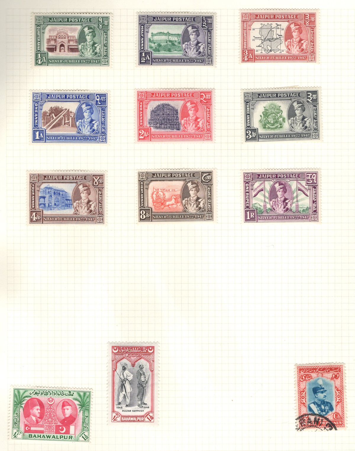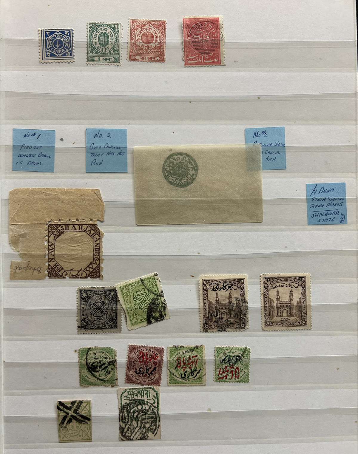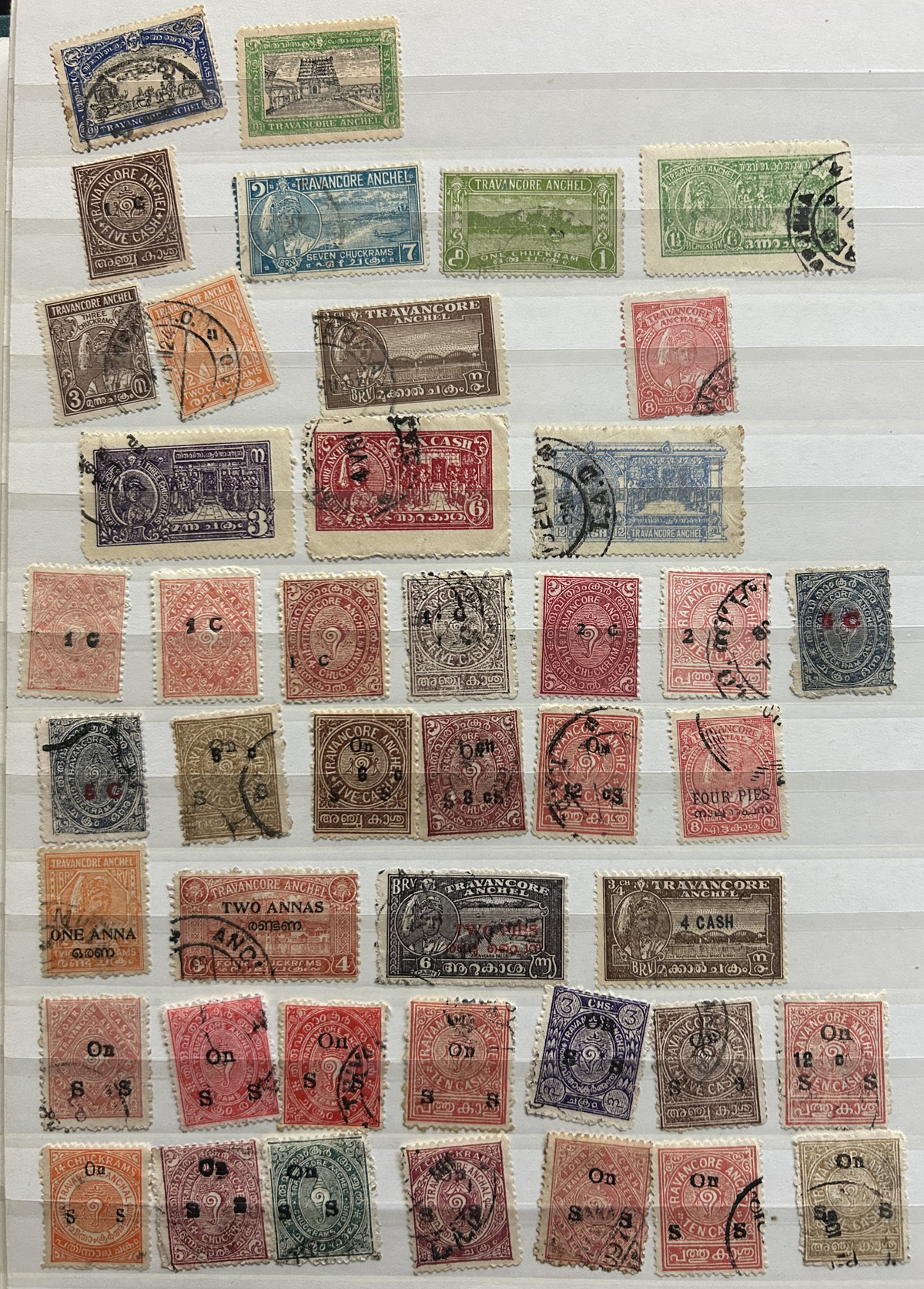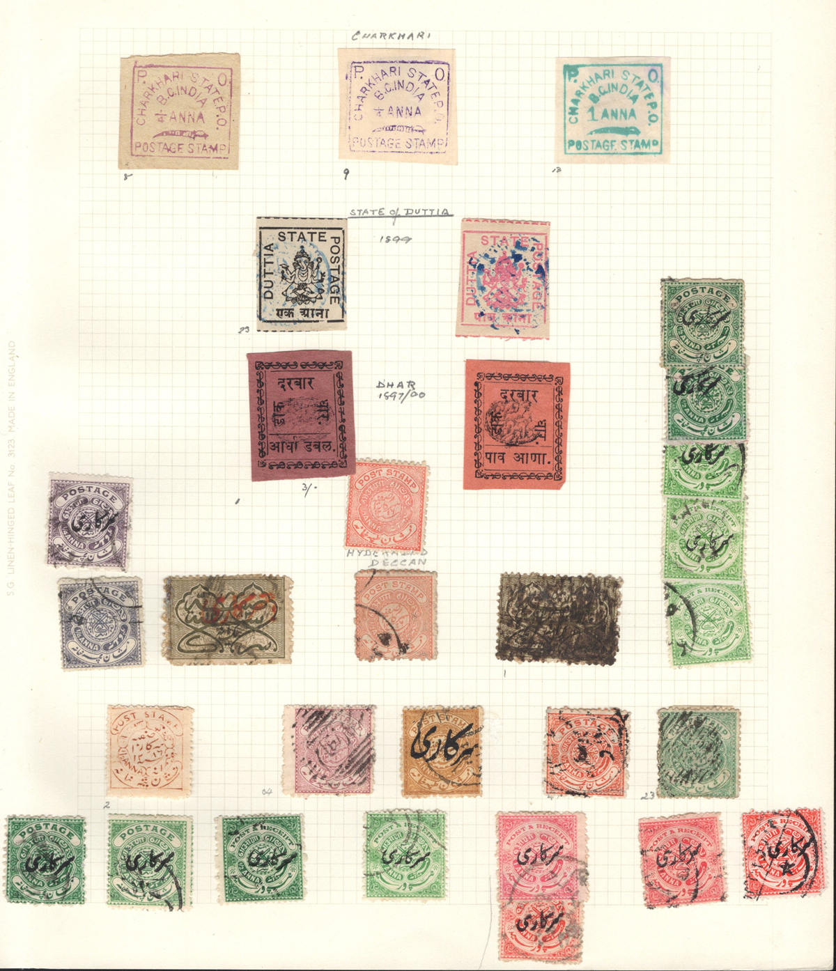 679 O/og/nh   imageStockbook of Interesting India, with 19 pages of mint and used material, noting interesting such as a half page of mint KGV issues with "1/4" surcharges, including a few that are misplaced, second half of the page has C.E.F. overprints on used issues, then a selection of mint "Map of India" coil strips of 4 as well as other early mint India issues, including some inverted watermarks. Next page starts with a group of T.P.O. letters in grid cancels followed by squared circles and other postmarks, plus a group of KGVI mint blocks of four. There are also 6 pages of specialized "Refugee Relief" overprinted issues, with many overprint varieties (inverted, double, different types, colours, etc.). Also saw the three low Gandhi values (NH, $57), 4 pages of mostly mint India issues overprinted for use in Patiala State, including Officials (almost complete, high catalogue value) as well as other various items, including three pages of used Travancore. See pictures for an overview, a useful lot for the enthusiast. (Scan 1) (Scan 2) (Scan 3) (Scan 4) (Scan 5) (Scan 6) (Scan 7) (Scan 8) (Scan 9) (Scan 10) (Scan 11) (Scan 12) (Scan 13) (Scan 14) (All Scans) (All Images)