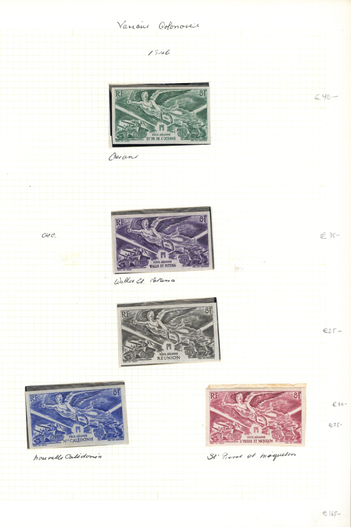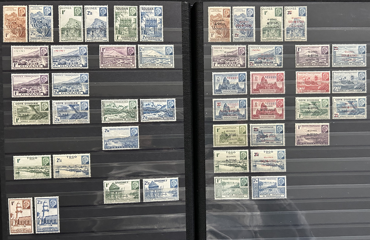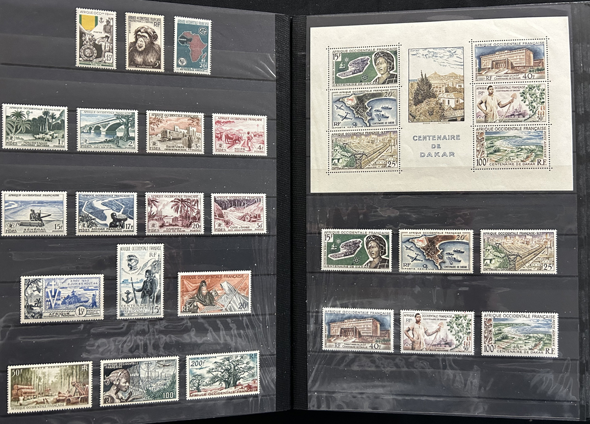 661 O/og/nh   imageExtensive Old Time Collection of Mint French Colonies Airmail Issues, to the 1940s, mounted on 120 quadrille pages, with a great variety of different countries, as well as many hundreds of lovely singles and sets. Many stamps have protective glassine backing, which can easily be peeled off, leaving a light gum glazing. We noted many sets cataloguing in the $50 to $100 range, and we catalogued only the imperforate issues, which came to €1,448 alone (for hinged) in the Yvert & Tellier specialized colonies catalogue. See pictures for a very small sampling of the collection. (Scan 1) (Scan 2) (Scan 3) (Scan 4) (Scan 5) (Scan 6) (Scan 7) (Scan 8) (Scan 9) (Scan 10) (Scan 11) (Scan 12) (Scan 13) (Scan 14) (Scan 15) (Scan 16) (Scan 17) (Scan 18) (Scan 19) (Scan 20) (Scan 21) (Scan 22) (All Scans) (All Images)