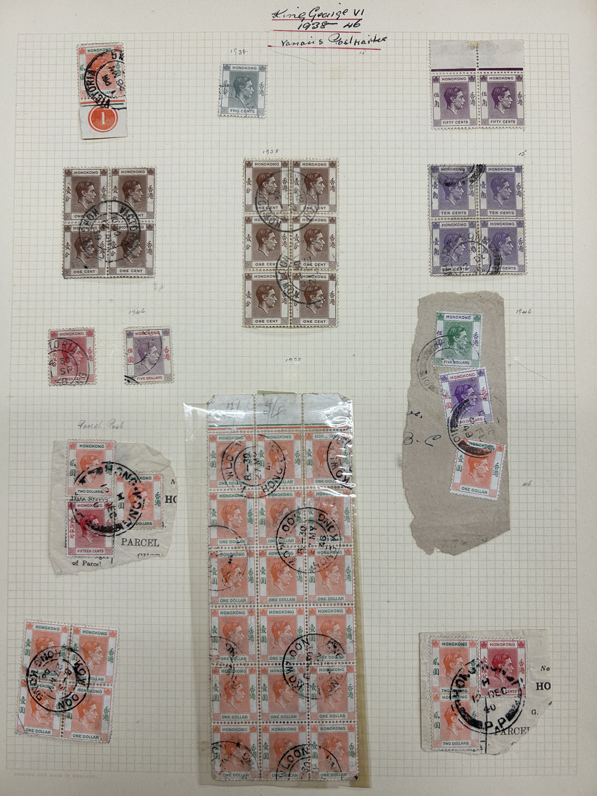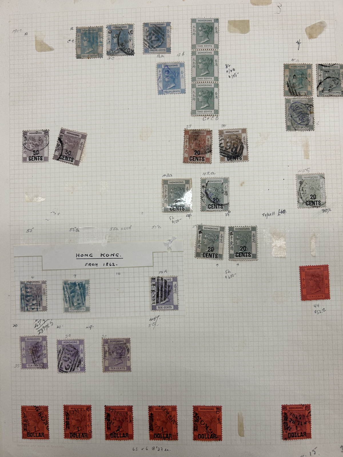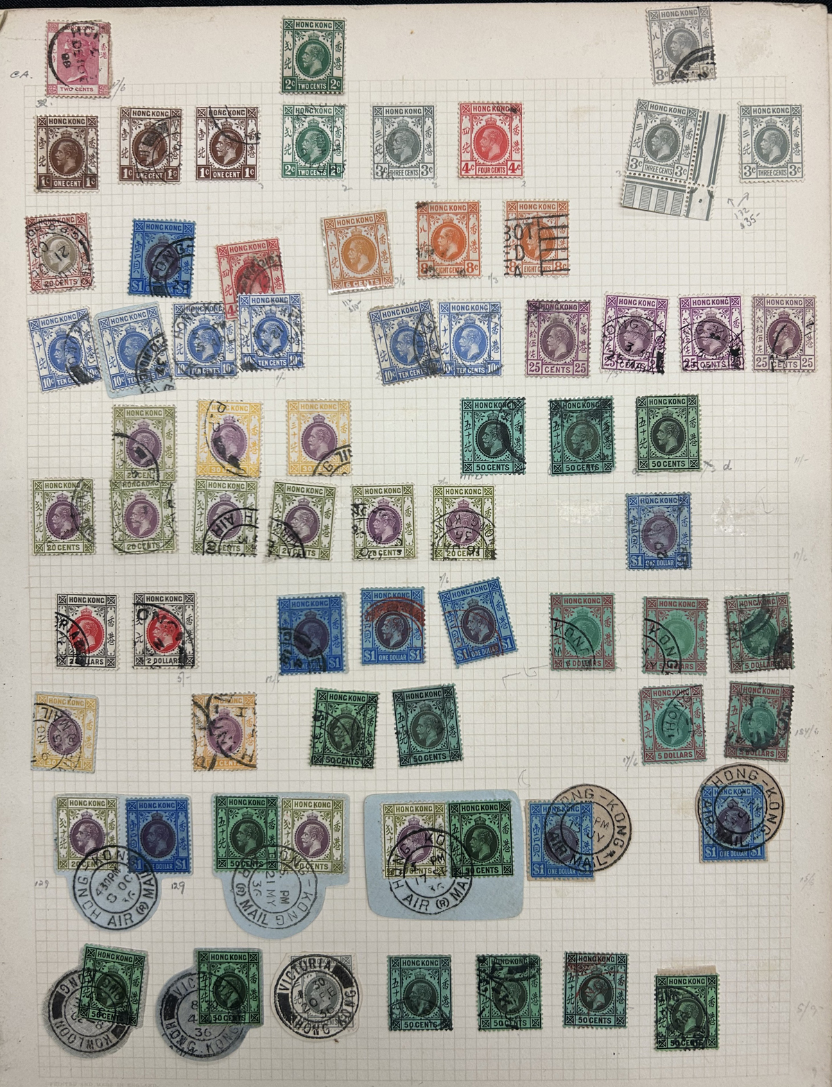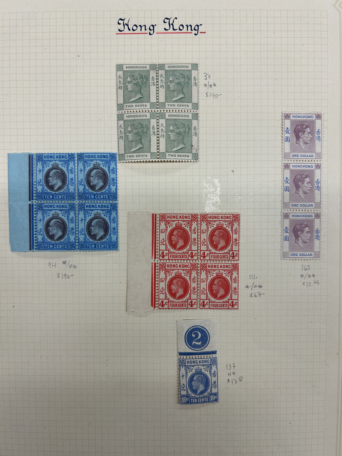 673 O/og   imageCollection / Accumulation of Mint and Used Hong Kong, QV to 1962, on 9 quadrille pages plus 4 filled stock pages. We note a good representation of issues from QV, all three Kings up to early QEII, noting many high denominations (noted KGV and KGVI to the $5) with many nice postmarks, several mint scattered throughout (incl. one page with QV to KGVI mint blocks / multiples), a page with a mint set of #s 203-217 and much more. Also includes 4 stuffed pages of mostly used stamps in the same QV to QEII range, with duplication, but also blocks, multiples, nice postmarks, etc. The entire lot is scanned online, so please have a close look, as there are potentially many high value items in here (a quick glance revealed several $50 to $100 items). Overall fine or better, and well worth our low estimate. (Scan 1) (Scan 2) (Scan 3) (Scan 4) (Scan 5) (Scan 6) (Scan 7) (Scan 8) (Scan 9) (Scan 10) (Scan 11) (Scan 12) (Scan 13) (All Scans) (All Images)