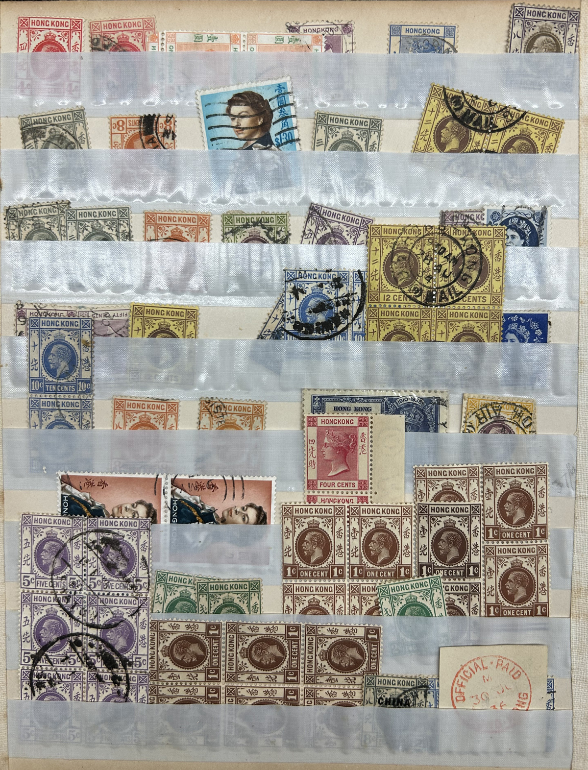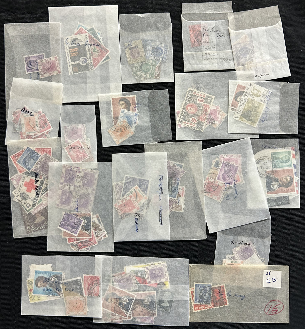 671 O   imageSmall Group of Interesting Used Hong Kong, looks unassuming at first, but the collector has sorted-out 18 glassines for different town postmarks (each containing a half dozen or more QV to QEII stamps), plus one glassine of GB overprinted CHINA and one that contains a 4c KEVII with a notation "Fouchow, rare Type G". There are also three stock cards containing 46 stamps (QV to KGV) some with better town cancels or higher values such as Scott 52, 55, etc. A useful lot for the specialist, with some small faults here and there, still overall fine. (Scan 1) (Scan 2) (All Scans) (All Images)