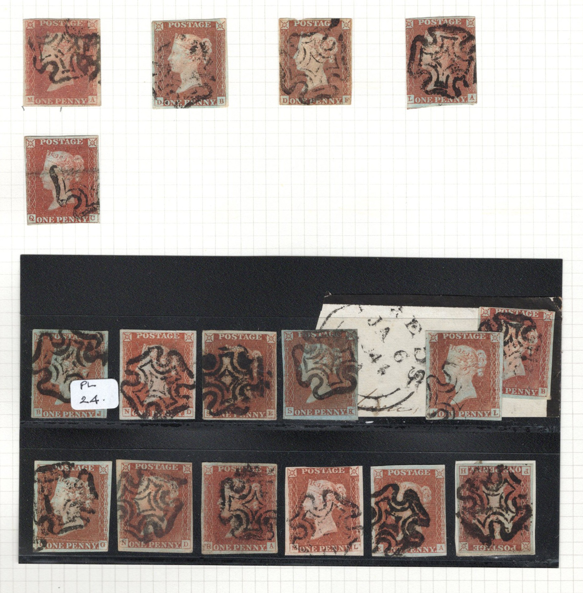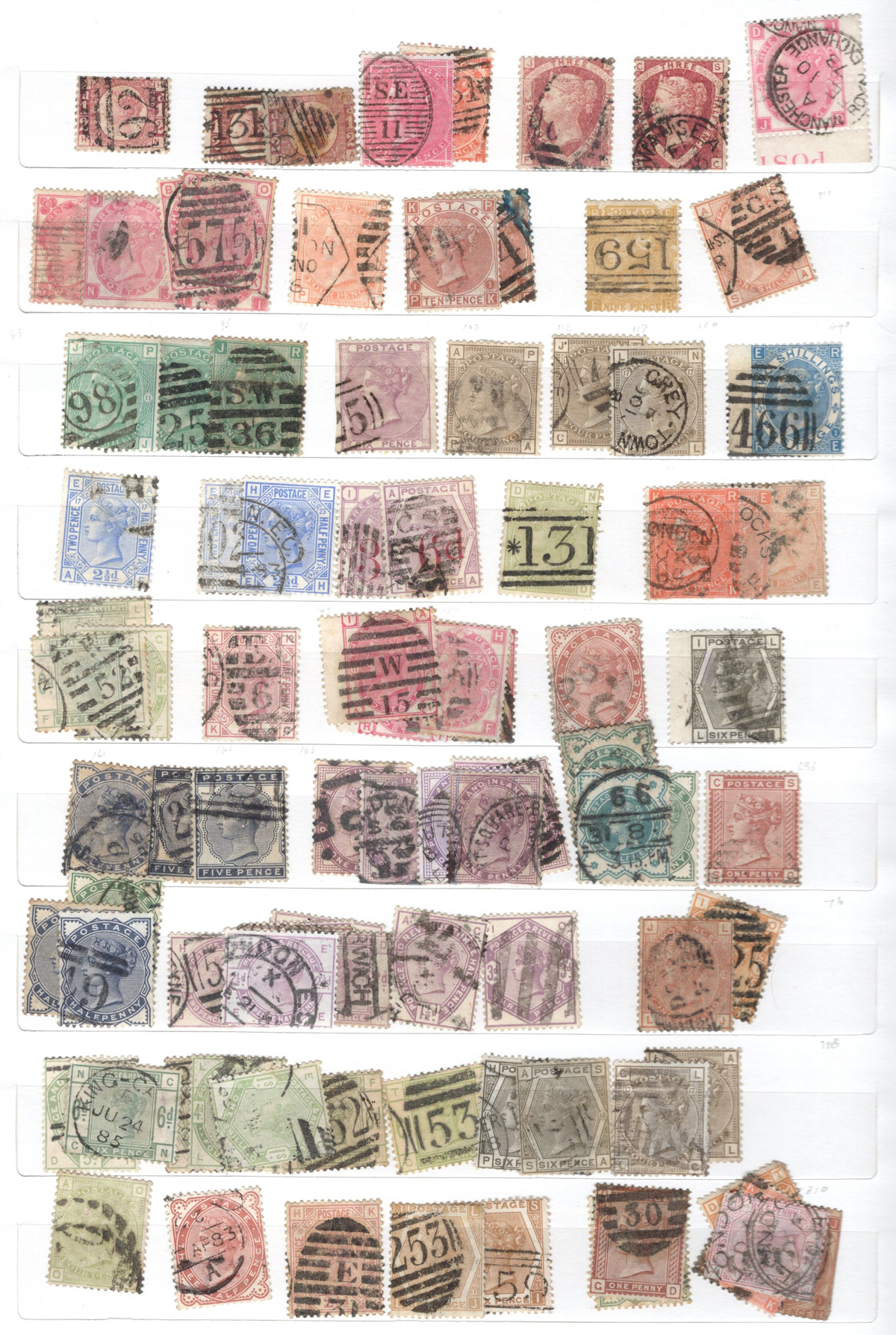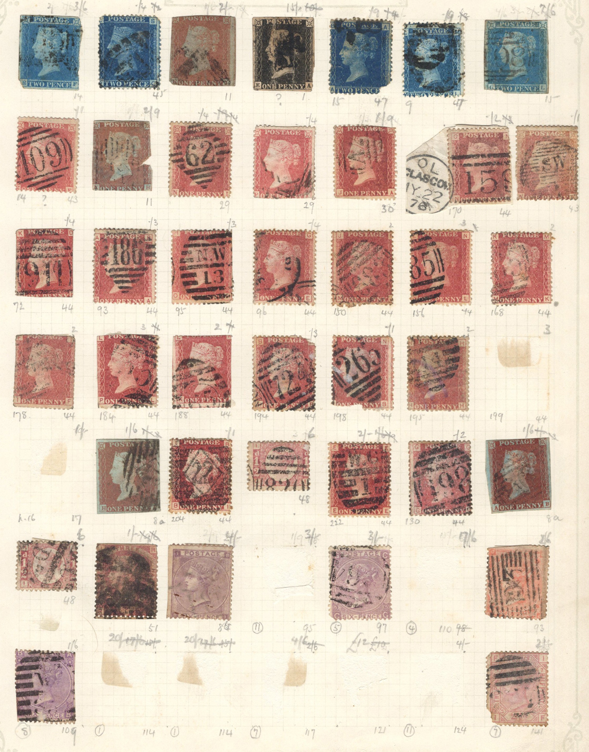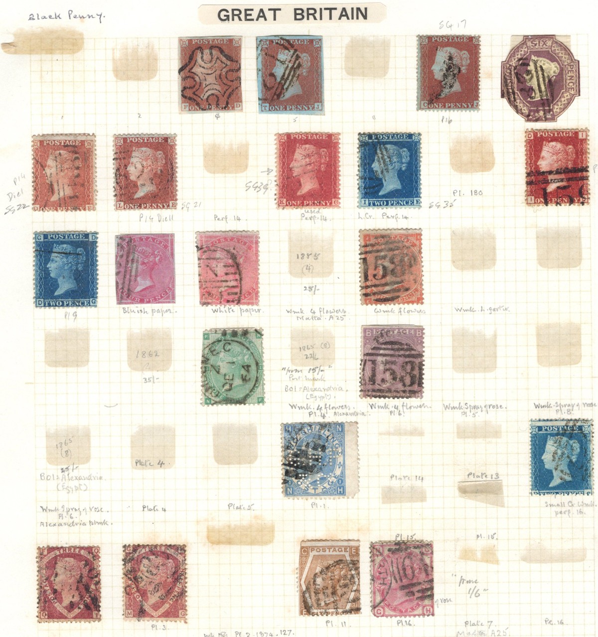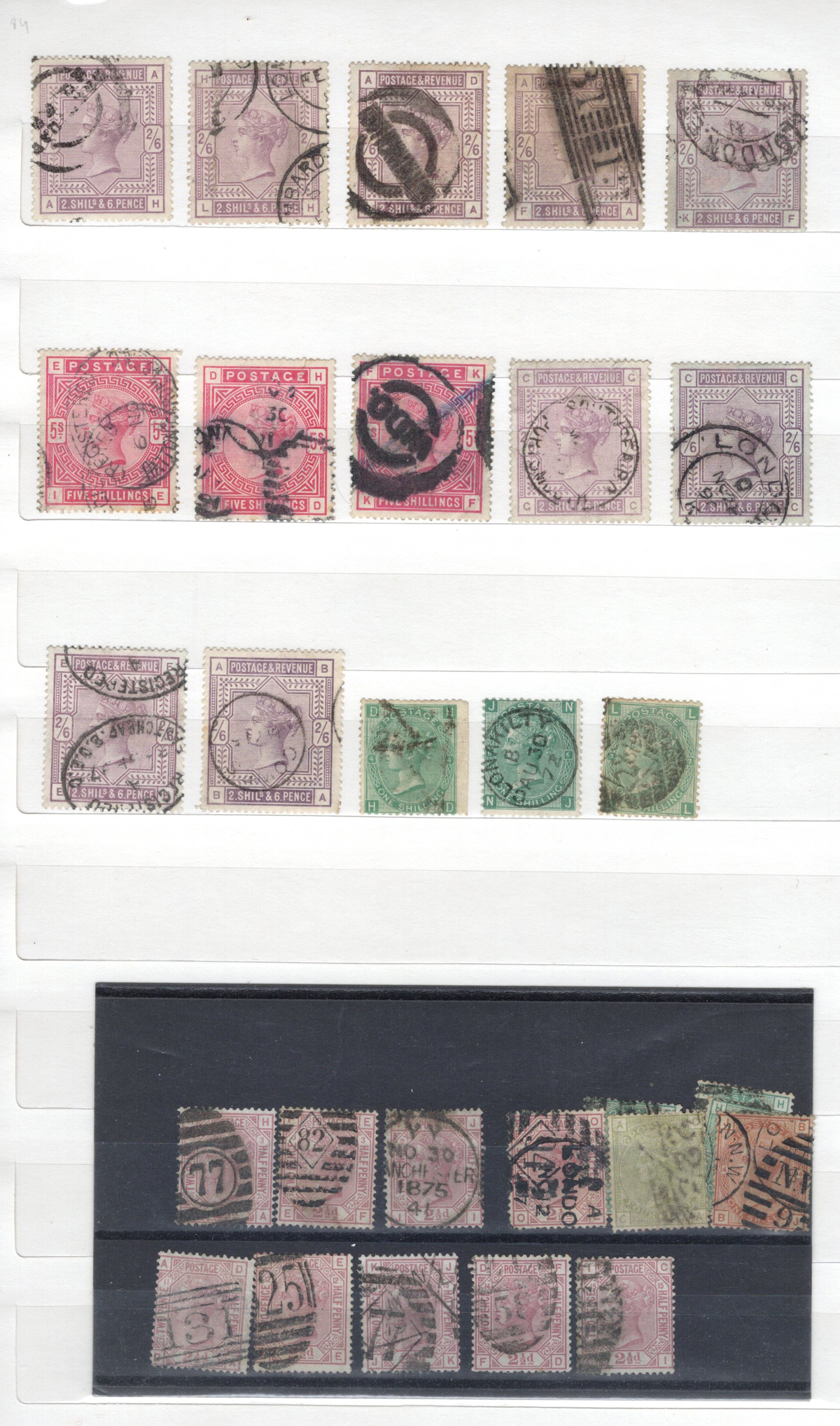 669 O 1/126 imageValuable and Extensive Collection of Queen Victoria Issues, 1840 to 1900, all displayed on 22 quadrille pages. Starts off with 5 Penny Blacks ($375 each), 17 imperforate Penny Reds with Maltese Cross cancels ($977 total), 12 imperforate 2d blue 1841 issues (with varieties, a pair, a strip of three), 9 perforated Penny Reds (incl. 2 pairs, a few perf. 16, etc.), 2 pages (12 stamps) of the perforated 2d blue issues (incl. at least one perf. 16), and the following Scott #s: 22 ($500), 24 ($625), 25 ($600), 26 (x4, $175 each), 27 (x3 shades, $140 each), 28 (x3, $400 each), 32 (x5, chosen for dated town cancels, $80 each), 34 (x3, $150 each), 37 ($375), 39 (x4, $160 each), 40 (x2, $550 each), 42 ($350), 43 (x4, $62 each), 44 ($275), 45 (x3, $160), 46 ($700), 48 (x3, $325 each), 49 (x5, with diff. plate #s, $477 total), 50 (x2, $210 each), 51 (x3, with plates 8 and 9, $430 total), 52 (x2, $350 each), 53 (x2, $475 each), 54 (x4, plates 4 to 7, $285 total), 55 ($260), 57 (x2, $775 each), 58 (x10, with at least 7 diff. plates), 59 (x4, $75 each), 60 (x2, $350 each), 61 (x9, plates 11 to 20, $905 total), 62 (x4, plates 13 to 16, $420 total), 64 (x6, plates 8 to 13, $1,155 total), 65 ($650), 66 (x3, $140 each), 67 (x15, plates 3 to 16, $1,575 total), 68 (x4, plates 17 to 20, $282 total), 69 ($550), 70 (x2, plates 15, 16, $725 total), 71 ($575), 73 (x2, $400 each), 74 ($3,750), 78 (x2), 79, 80, 81 (x2, $140 each), 82 (x5, plates 21 and 22, $262 total), 83 (x2, plates 20 and 21, $290 total), 84 (x2, plates 17 and 18, $180 total), 85 ($200), 86 (x3, plates 17 and 18, $277 total), 87 (x2, plates 13 and 14, $400 total), 88 (x3, $52 each), 89 (x3), 94 (x3, $185 each), 96 ($185), 98, 99 ($52), 100 ($92), 101, 102 (x2, $115 each), 103 (x2, $245 each), 104 ($245), 105 (x2 $280 each), 107 ($380), 108 (x3, $290 each), 109 (x3, $615 each), and 111-122 (set, plus extras, $751 total). A clean collection, with many better cancels (incl. c.d.s.) and better stamps (as noted above), also useful for its shades and different plate numbers, and more. Scott catalogue value approaches the U$40,000 mark, overall fine or better, and generally better quality than is often seen. All pages scanned online. (Scan 1) (Scan 2) (Scan 3) (Scan 4) (Scan 5) (Scan 6) (Scan 7) (Scan 8) (Scan 9) (Scan 10) (Scan 11) (Scan 12) (Scan 13) (Scan 14) (Scan 15) (Scan 16) (Scan 17) (Scan 18) (Scan 19) (Scan 20) (Scan 21) (All Scans) (All Images)