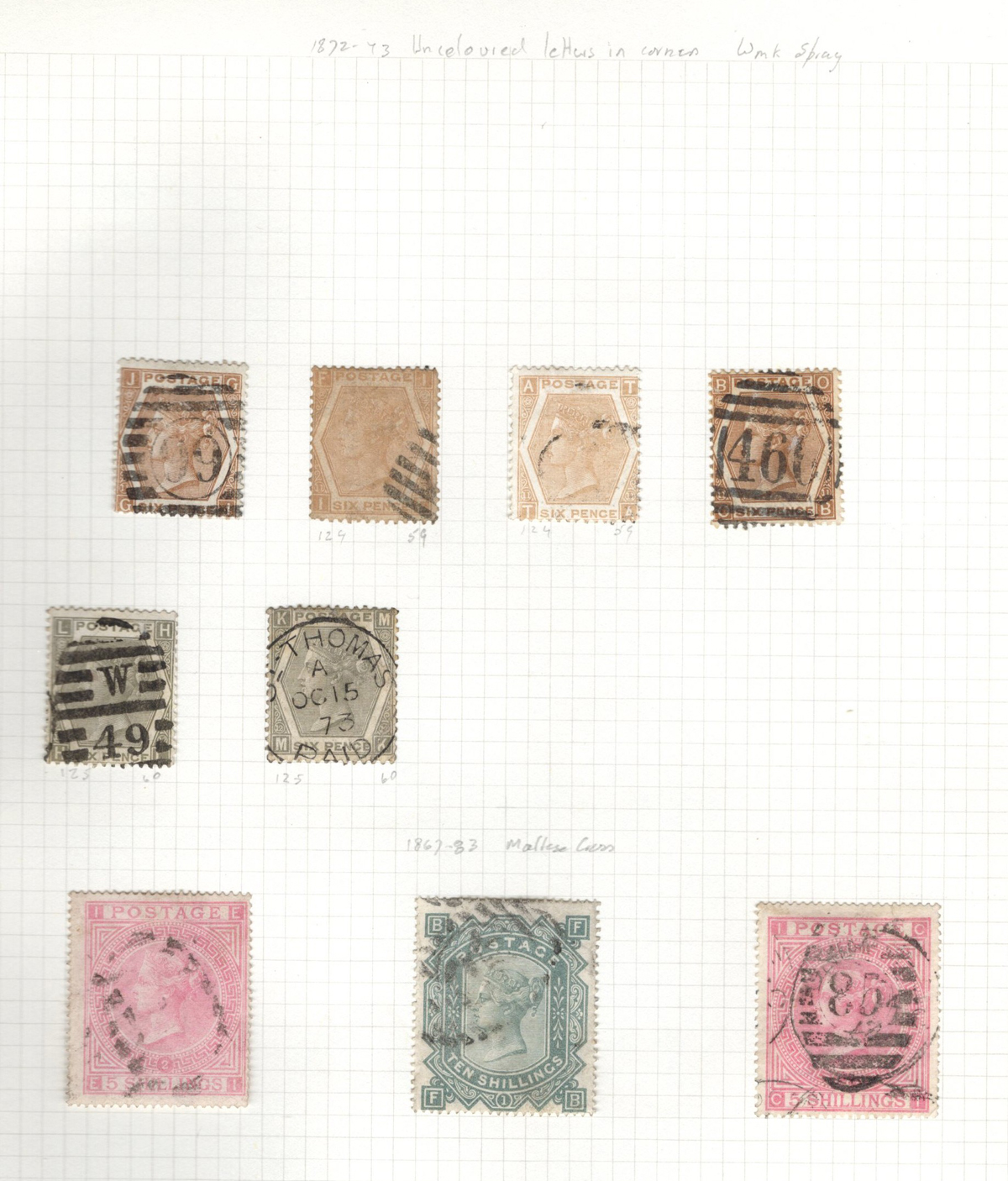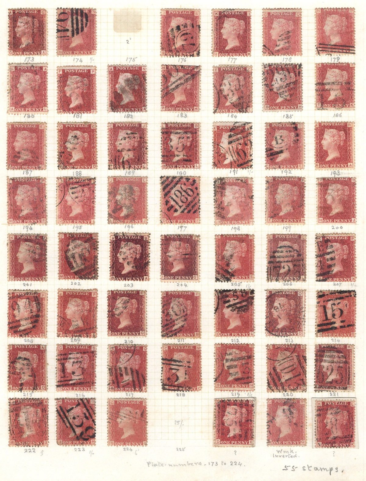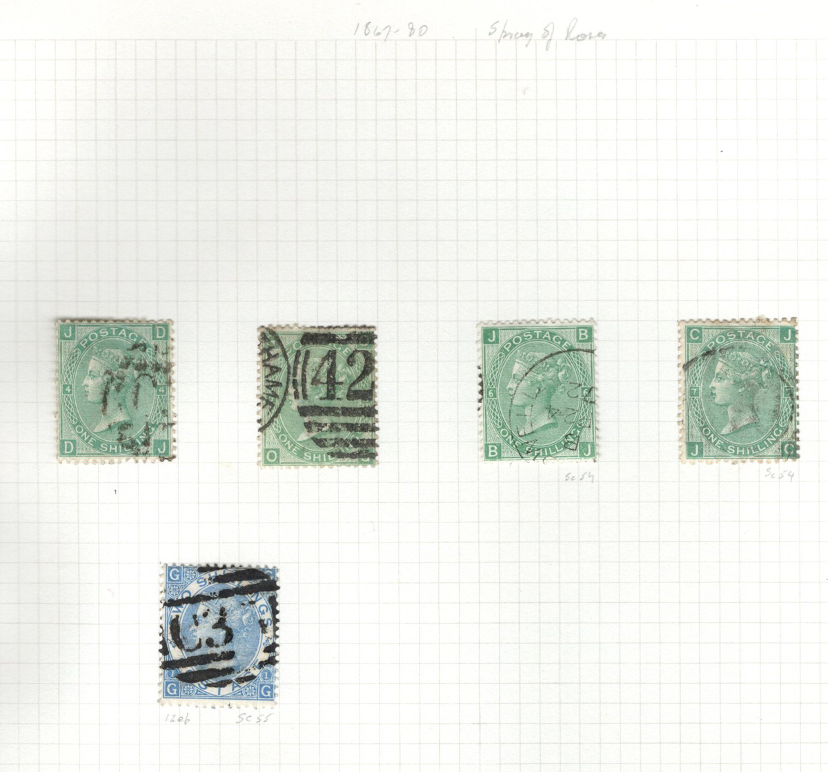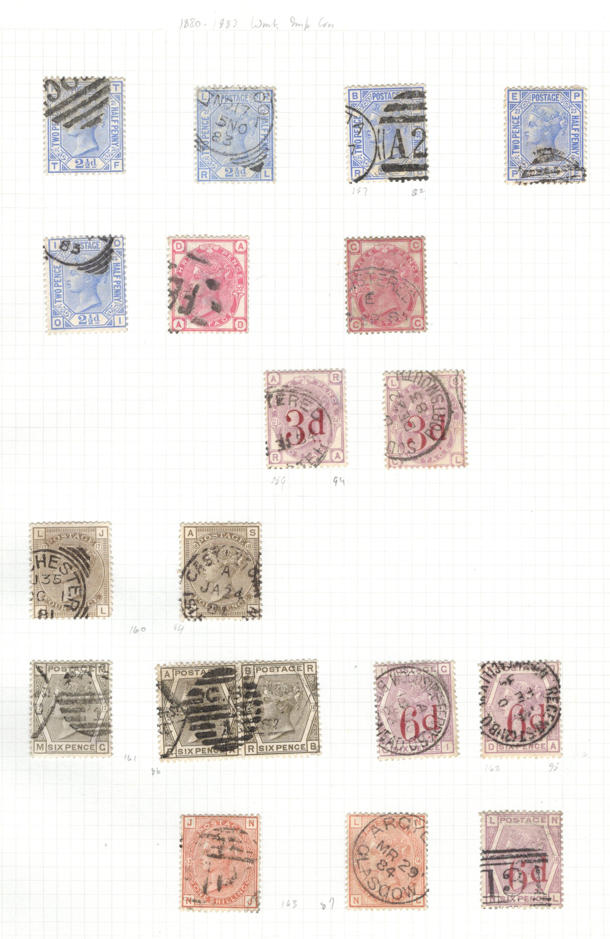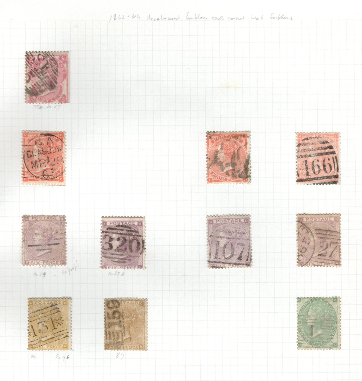 669 O 1/126 imageValuable and Extensive Collection of Queen Victoria Issues, 1840 to 1900, all displayed on 22 quadrille pages. Starts off with 5 Penny Blacks ($375 each), 17 imperforate Penny Reds with Maltese Cross cancels ($977 total), 12 imperforate 2d blue 1841 issues (with varieties, a pair, a strip of three), 9 perforated Penny Reds (incl. 2 pairs, a few perf. 16, etc.), 2 pages (12 stamps) of the perforated 2d blue issues (incl. at least one perf. 16), and the following Scott #s: 22 ($500), 24 ($625), 25 ($600), 26 (x4, $175 each), 27 (x3 shades, $140 each), 28 (x3, $400 each), 32 (x5, chosen for dated town cancels, $80 each), 34 (x3, $150 each), 37 ($375), 39 (x4, $160 each), 40 (x2, $550 each), 42 ($350), 43 (x4, $62 each), 44 ($275), 45 (x3, $160), 46 ($700), 48 (x3, $325 each), 49 (x5, with diff. plate #s, $477 total), 50 (x2, $210 each), 51 (x3, with plates 8 and 9, $430 total), 52 (x2, $350 each), 53 (x2, $475 each), 54 (x4, plates 4 to 7, $285 total), 55 ($260), 57 (x2, $775 each), 58 (x10, with at least 7 diff. plates), 59 (x4, $75 each), 60 (x2, $350 each), 61 (x9, plates 11 to 20, $905 total), 62 (x4, plates 13 to 16, $420 total), 64 (x6, plates 8 to 13, $1,155 total), 65 ($650), 66 (x3, $140 each), 67 (x15, plates 3 to 16, $1,575 total), 68 (x4, plates 17 to 20, $282 total), 69 ($550), 70 (x2, plates 15, 16, $725 total), 71 ($575), 73 (x2, $400 each), 74 ($3,750), 78 (x2), 79, 80, 81 (x2, $140 each), 82 (x5, plates 21 and 22, $262 total), 83 (x2, plates 20 and 21, $290 total), 84 (x2, plates 17 and 18, $180 total), 85 ($200), 86 (x3, plates 17 and 18, $277 total), 87 (x2, plates 13 and 14, $400 total), 88 (x3, $52 each), 89 (x3), 94 (x3, $185 each), 96 ($185), 98, 99 ($52), 100 ($92), 101, 102 (x2, $115 each), 103 (x2, $245 each), 104 ($245), 105 (x2 $280 each), 107 ($380), 108 (x3, $290 each), 109 (x3, $615 each), and 111-122 (set, plus extras, $751 total). A clean collection, with many better cancels (incl. c.d.s.) and better stamps (as noted above), also useful for its shades and different plate numbers, and more. Scott catalogue value approaches the U$40,000 mark, overall fine or better, and generally better quality than is often seen. All pages scanned online. (Scan 1) (Scan 2) (Scan 3) (Scan 4) (Scan 5) (Scan 6) (Scan 7) (Scan 8) (Scan 9) (Scan 10) (Scan 11) (Scan 12) (Scan 13) (Scan 14) (Scan 15) (Scan 16) (Scan 17) (Scan 18) (Scan 19) (Scan 20) (Scan 21) (All Scans) (All Images)