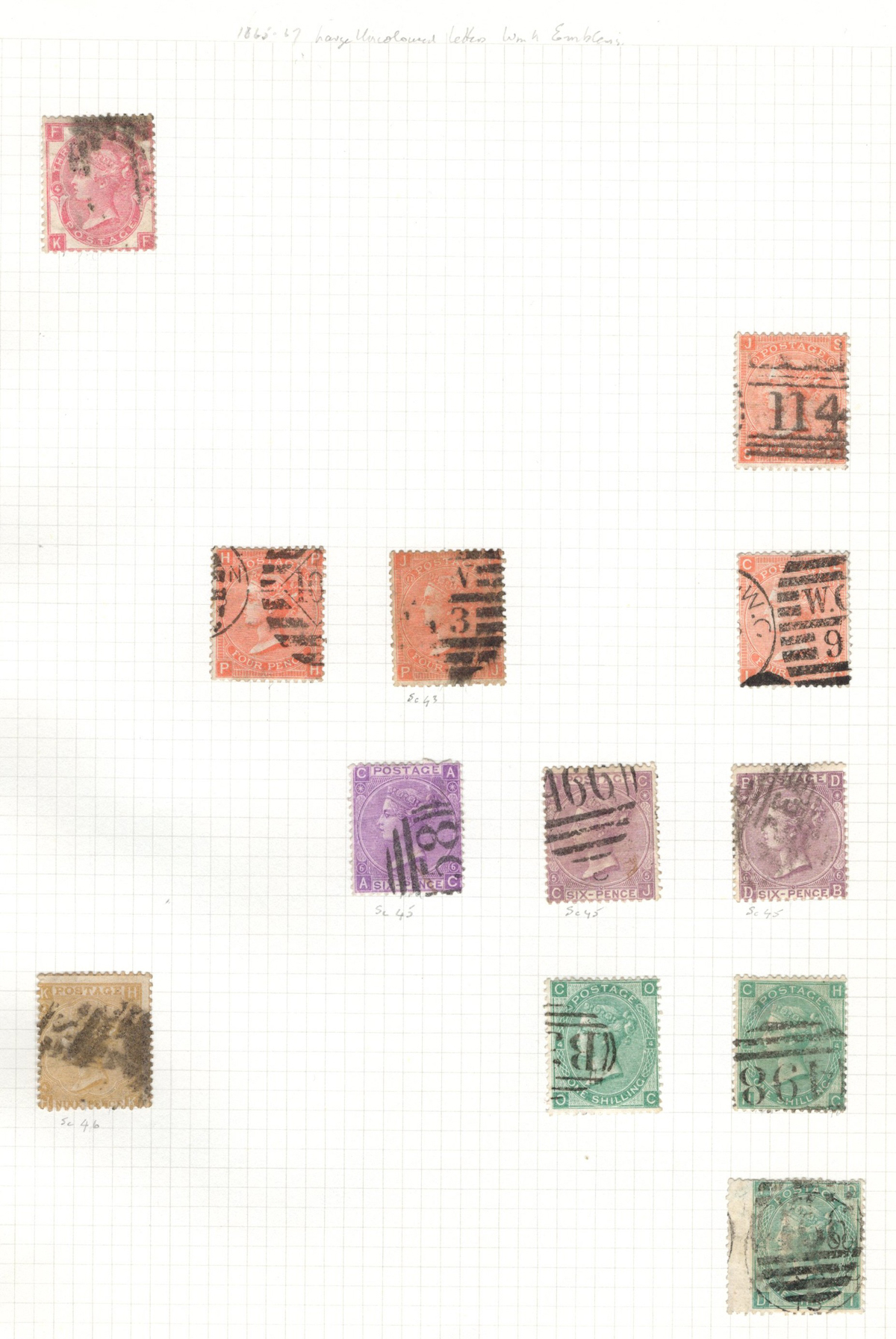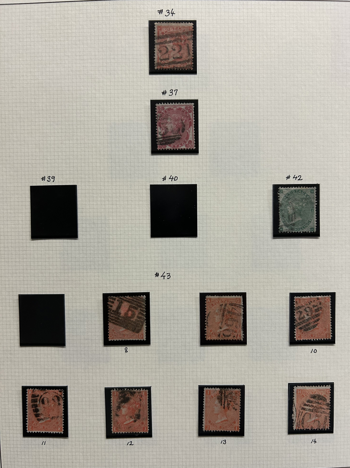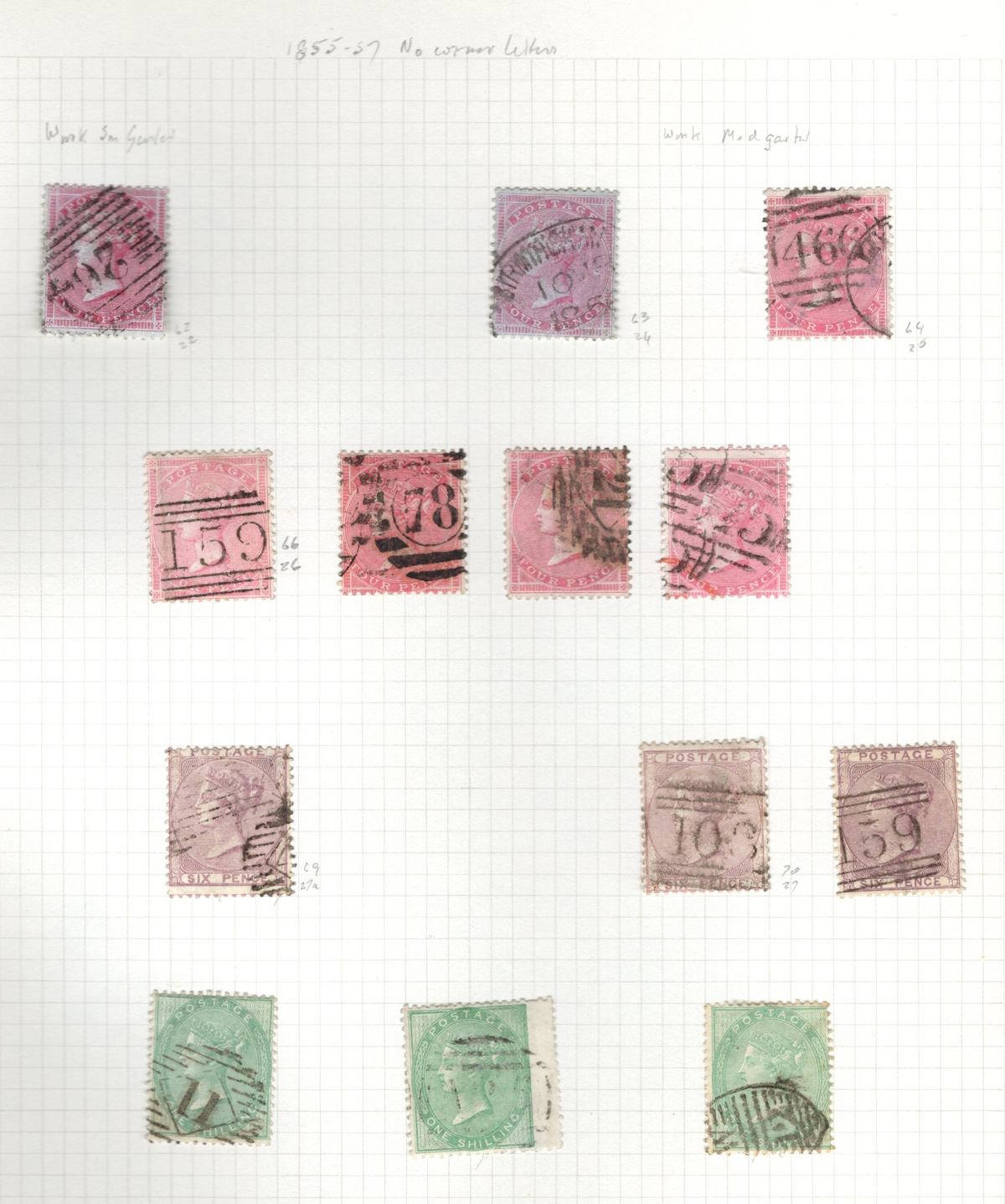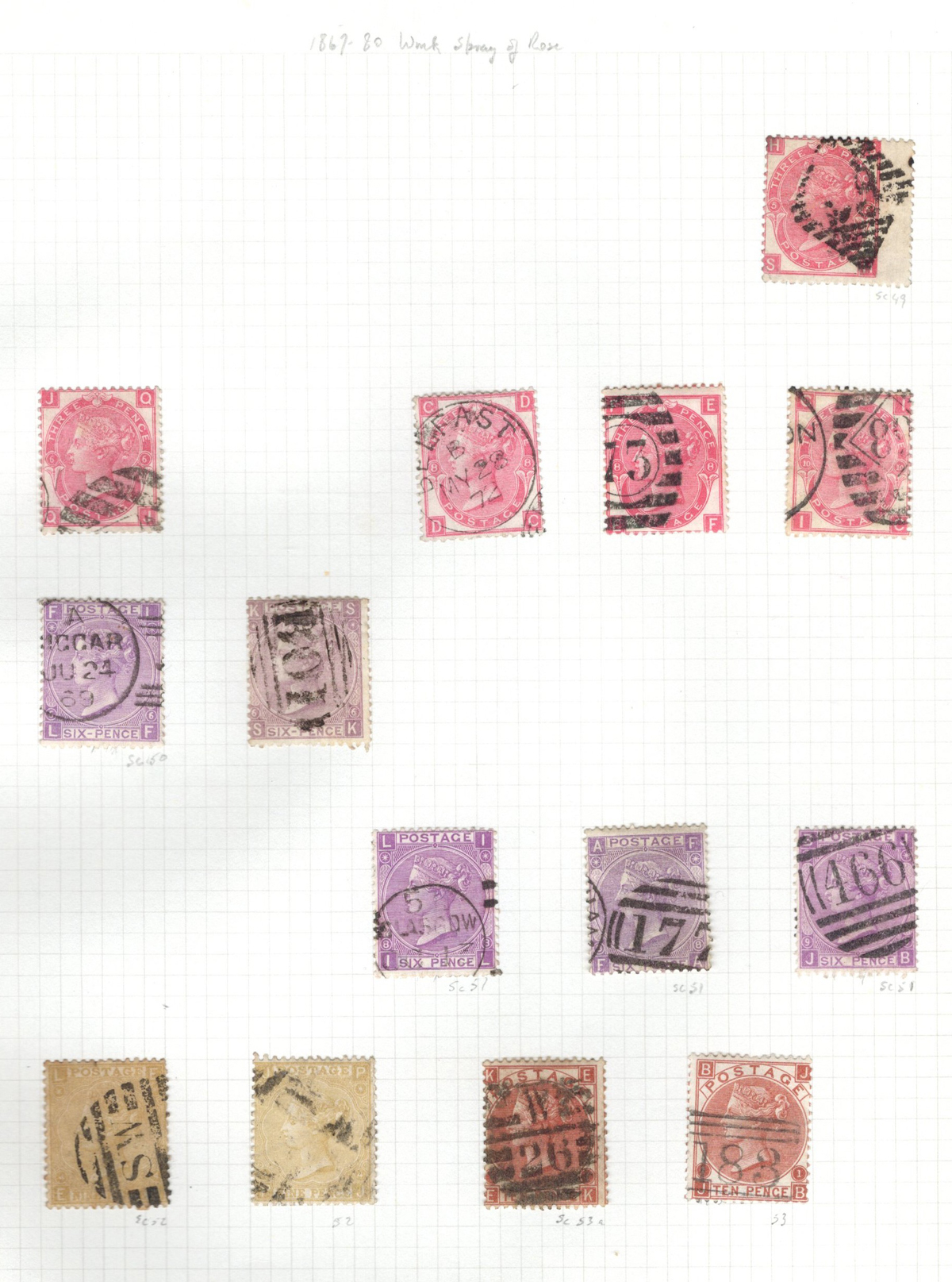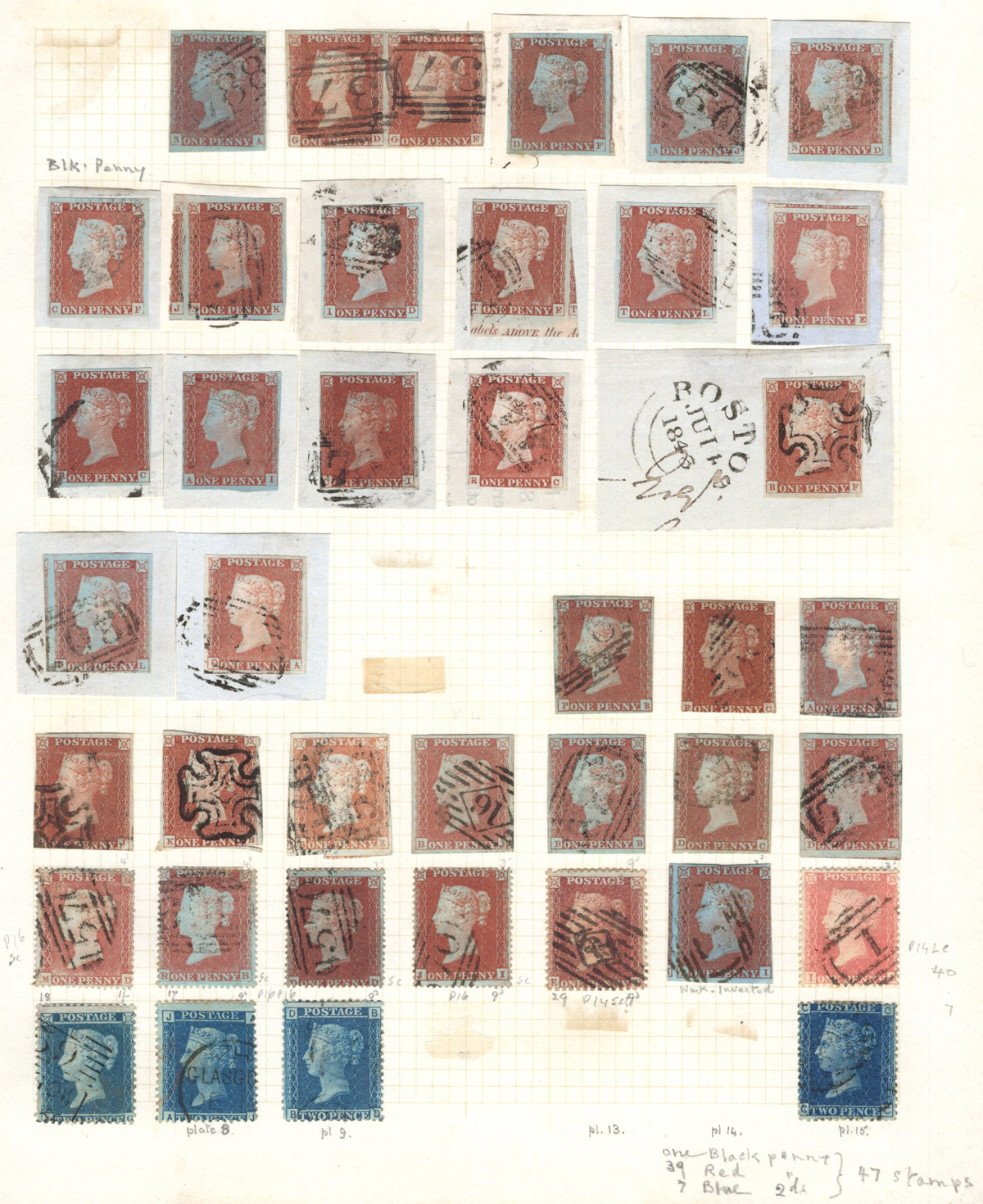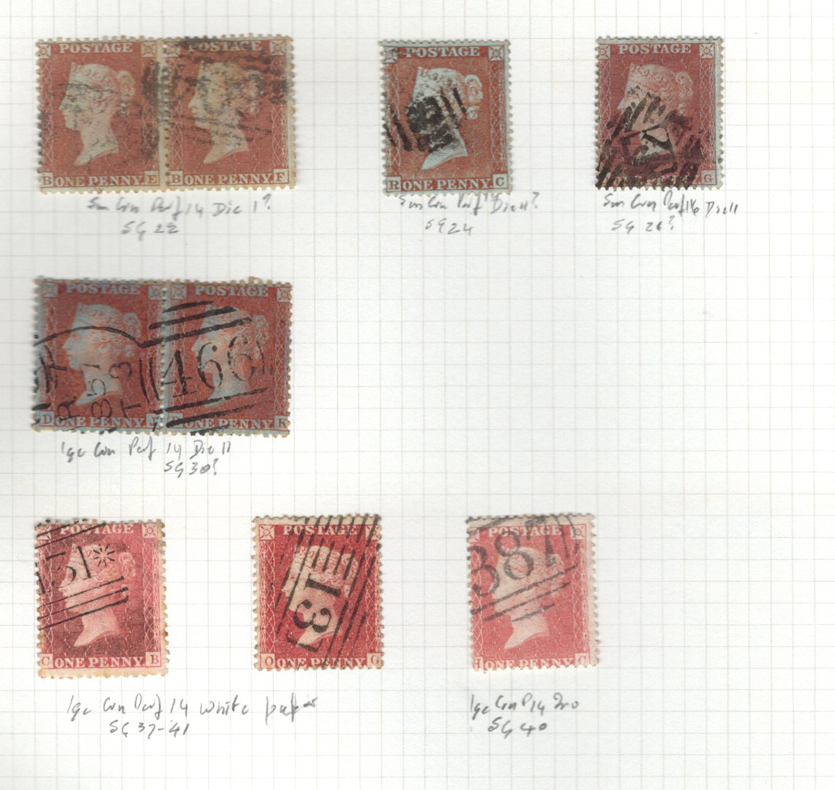 669 O 1/126 imageValuable and Extensive Collection of Queen Victoria Issues, 1840 to 1900, all displayed on 22 quadrille pages. Starts off with 5 Penny Blacks ($375 each), 17 imperforate Penny Reds with Maltese Cross cancels ($977 total), 12 imperforate 2d blue 1841 issues (with varieties, a pair, a strip of three), 9 perforated Penny Reds (incl. 2 pairs, a few perf. 16, etc.), 2 pages (12 stamps) of the perforated 2d blue issues (incl. at least one perf. 16), and the following Scott #s: 22 ($500), 24 ($625), 25 ($600), 26 (x4, $175 each), 27 (x3 shades, $140 each), 28 (x3, $400 each), 32 (x5, chosen for dated town cancels, $80 each), 34 (x3, $150 each), 37 ($375), 39 (x4, $160 each), 40 (x2, $550 each), 42 ($350), 43 (x4, $62 each), 44 ($275), 45 (x3, $160), 46 ($700), 48 (x3, $325 each), 49 (x5, with diff. plate #s, $477 total), 50 (x2, $210 each), 51 (x3, with plates 8 and 9, $430 total), 52 (x2, $350 each), 53 (x2, $475 each), 54 (x4, plates 4 to 7, $285 total), 55 ($260), 57 (x2, $775 each), 58 (x10, with at least 7 diff. plates), 59 (x4, $75 each), 60 (x2, $350 each), 61 (x9, plates 11 to 20, $905 total), 62 (x4, plates 13 to 16, $420 total), 64 (x6, plates 8 to 13, $1,155 total), 65 ($650), 66 (x3, $140 each), 67 (x15, plates 3 to 16, $1,575 total), 68 (x4, plates 17 to 20, $282 total), 69 ($550), 70 (x2, plates 15, 16, $725 total), 71 ($575), 73 (x2, $400 each), 74 ($3,750), 78 (x2), 79, 80, 81 (x2, $140 each), 82 (x5, plates 21 and 22, $262 total), 83 (x2, plates 20 and 21, $290 total), 84 (x2, plates 17 and 18, $180 total), 85 ($200), 86 (x3, plates 17 and 18, $277 total), 87 (x2, plates 13 and 14, $400 total), 88 (x3, $52 each), 89 (x3), 94 (x3, $185 each), 96 ($185), 98, 99 ($52), 100 ($92), 101, 102 (x2, $115 each), 103 (x2, $245 each), 104 ($245), 105 (x2 $280 each), 107 ($380), 108 (x3, $290 each), 109 (x3, $615 each), and 111-122 (set, plus extras, $751 total). A clean collection, with many better cancels (incl. c.d.s.) and better stamps (as noted above), also useful for its shades and different plate numbers, and more. Scott catalogue value approaches the U$40,000 mark, overall fine or better, and generally better quality than is often seen. All pages scanned online. (Scan 1) (Scan 2) (Scan 3) (Scan 4) (Scan 5) (Scan 6) (Scan 7) (Scan 8) (Scan 9) (Scan 10) (Scan 11) (Scan 12) (Scan 13) (Scan 14) (Scan 15) (Scan 16) (Scan 17) (Scan 18) (Scan 19) (Scan 20) (Scan 21) (All Scans) (All Images)
